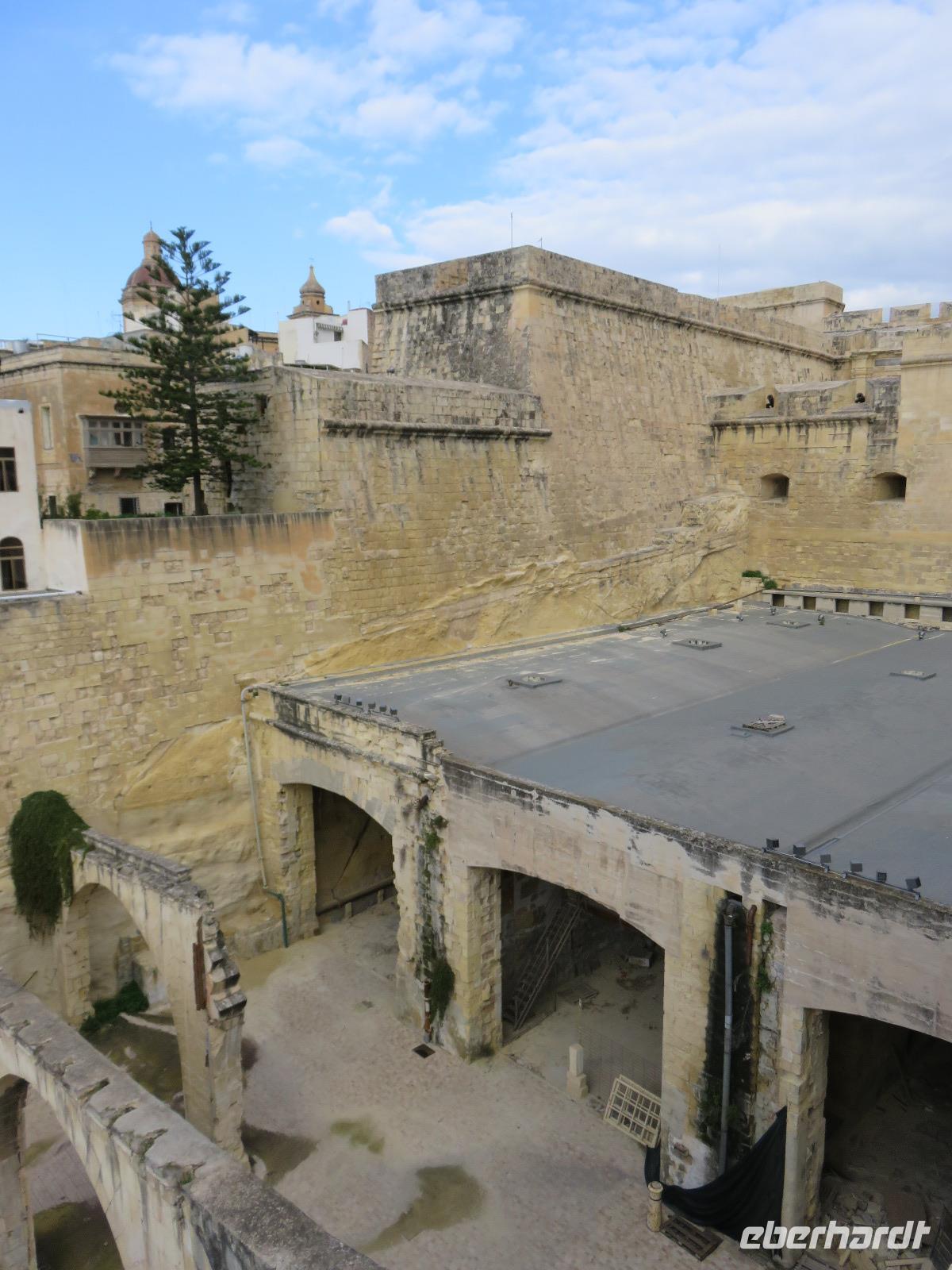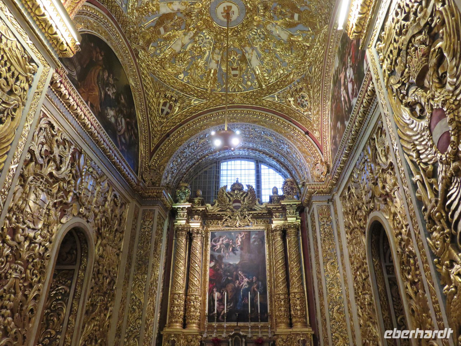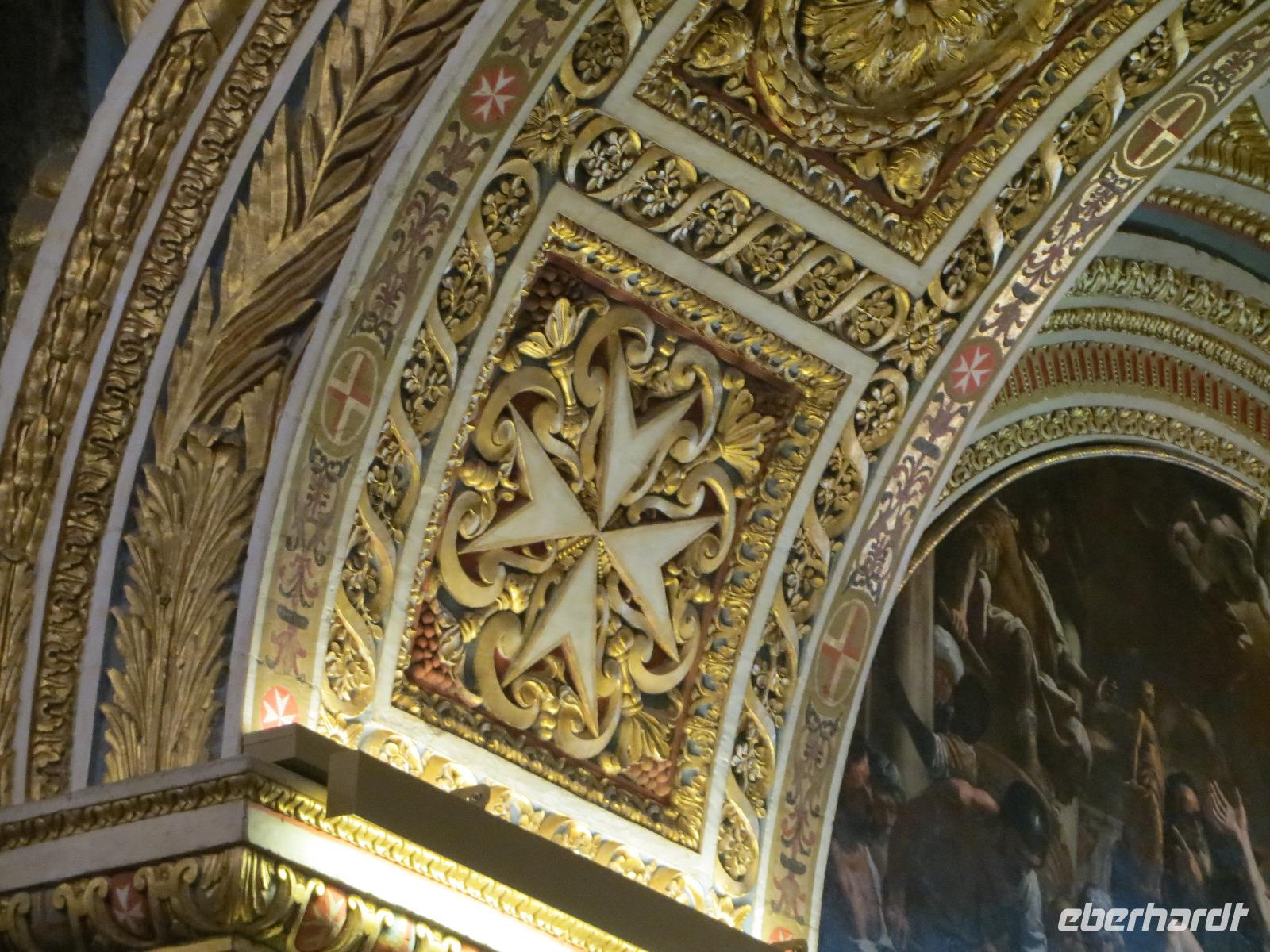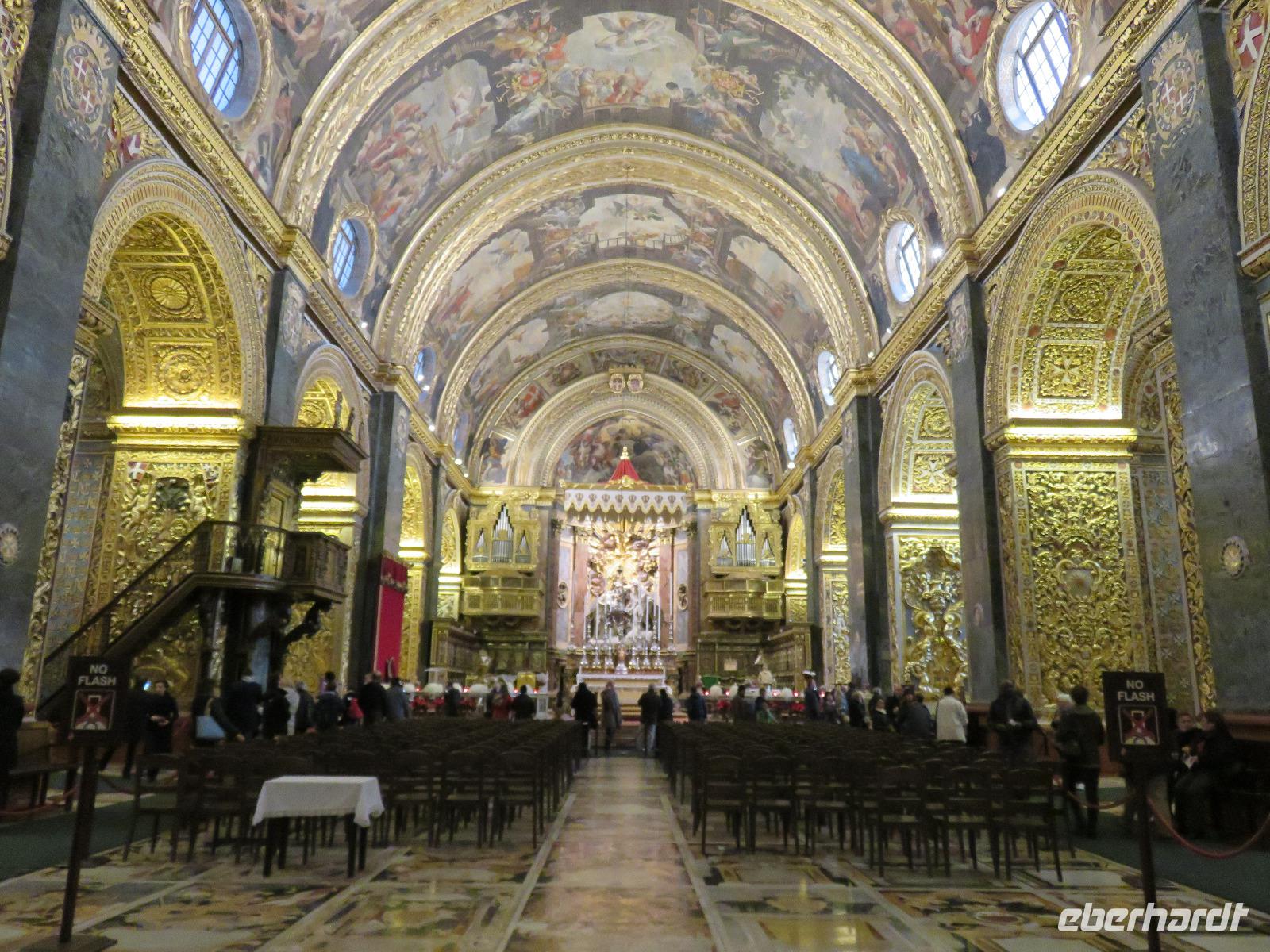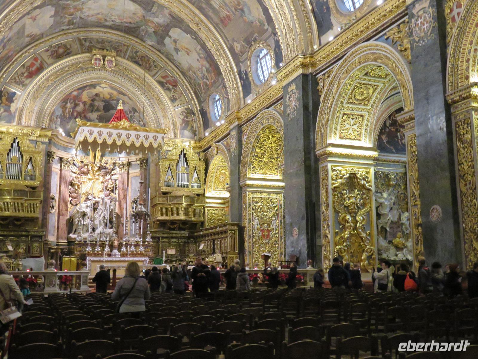 Unser nächstes Ziel ist die heutige Inselhauptstadt Valletta. Zunächst fuhren wir vorbei am Fußballstadion durch eine kleine Ebene in die Vororte und schließlich nach Floriana. An diesem Eingangstor zur Stadt der Ordensritter legten wir eine Pause der Harmonie ein. Nun stand unserem Erlebnis Valletta bei schönstem Wetter nichts mehr im Weg. Durch das City-Tor betraten wir die Stadt, die in nur fünf Jahren (!) errichtet wurde und auch heute durch gewaltige Mauern geschützt, einen äußerst wehrhaften Charakter besitzt. Schnell ein Blick in den gewaltigen Festungsgraben. Unsere Schritte lenkten wir zuerst zum neuen Parlamentsgebäude Maltas mit der wundervollen Fassade aus gelben Muschelkalk und zu den Ruinen des Royal Opera House, völlig ausgebombt 1942. Gerlinde führte uns mit eiligen Schritten über die Republic-Street zur St. Johns Co-Kathedrale. Mit dieser fast schlichten Fassade könnte man einen Palast vermuten, aber keine Kirche dieser Bedeutung. Wie heißt es doch: Auf Malta offenbart sich das Reizvolle erst auf den zweiten Blick. Der französisches Großmeister Jean l'Evêque de la Cassière hatte diesen Sakralbau den Johannitern gestiftet. Geweiht wurde sie dem Schutzpatron des Ordens, Johannes dem Täufer. Nach dem Betreten des Inneren stockte uns der Atem, unsere Augen mussten sich erst an die prunkvolle und äußerst üppige Ausstattung gewöhnen. Die Großmeister und die einzelnen Landsmannschaften haben die Ordenskirche mit kostbaren Kunstwerken ausgestattet. Gerlinde berichtete, dass ca. 4.000 Quadratmeter Blattgold verarbeitet wurden. Auch die 375 mit Marmorintarsien versehenen Grabplatten der Ritter des Johanniter- und des Malteserordens sind einmalig. Wir besichtigten die Sakristei und die Kapelle von Deutschland, flanierten an vielen weiteren Gästen vorbei durch das Kirchenschiff zum Chorraum mit dem prächtigen Hochaltar und der weißen Marmorgruppe der Taufe Christi. Abschließender Höhepunkt war der Besuch des Oratoriums der Kathedrale mit zwei Gemälden von Caravaggio: Hl. Hieronymus und Die Enthauptung Johannes des Täufers, sein Hauptwerk auf Malta. Caravaggio, sein bürgerlicher Name: Michelangelo da Merisi, war in Italien ein gefragter Altarmaler, aber auch oft mit dem Gesetz in Konflikt gekommen und auf die Insel Malta geflüchtet. Er beherrschte die Kunst des Licht- und Dunkelmalens im besonderen Maß. Schnell bekam er Aufträge der Ordensritter. So wurde er für ein Porträt des Großmeisters Alof de Wignacourt berühmt und wurde selbst zum Ritter geschlagen. Leider überwarf er sich mit den Rittern, kam erneut mit dem Gesetzt in Konflikt und floh schließlich auch von Malta. Mit nur 38 Jahren starb der Künstler in Italien.