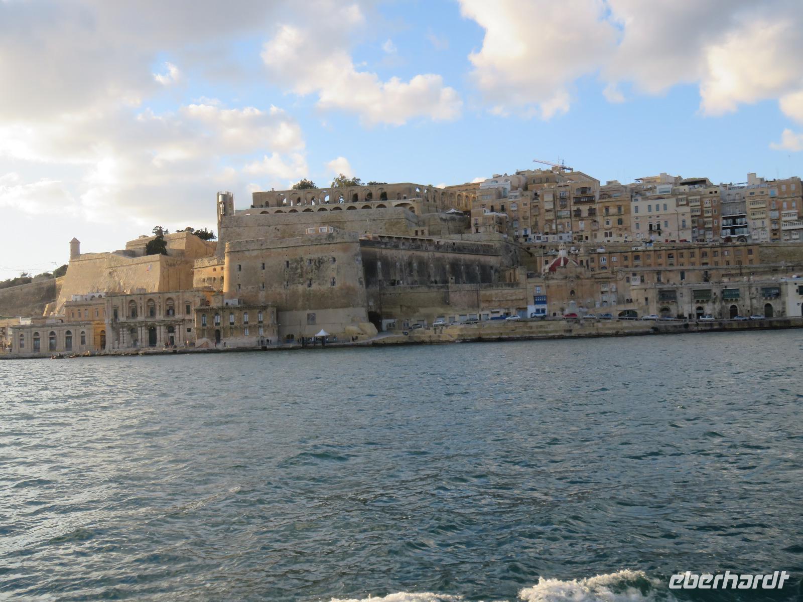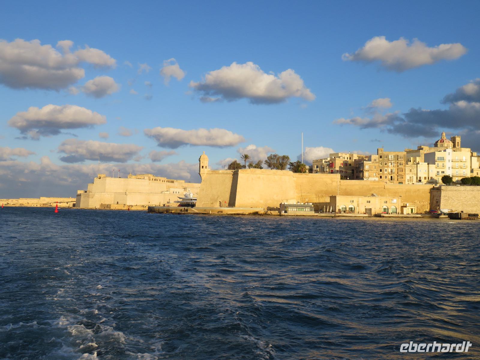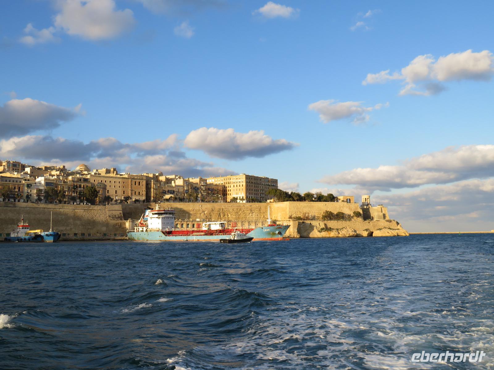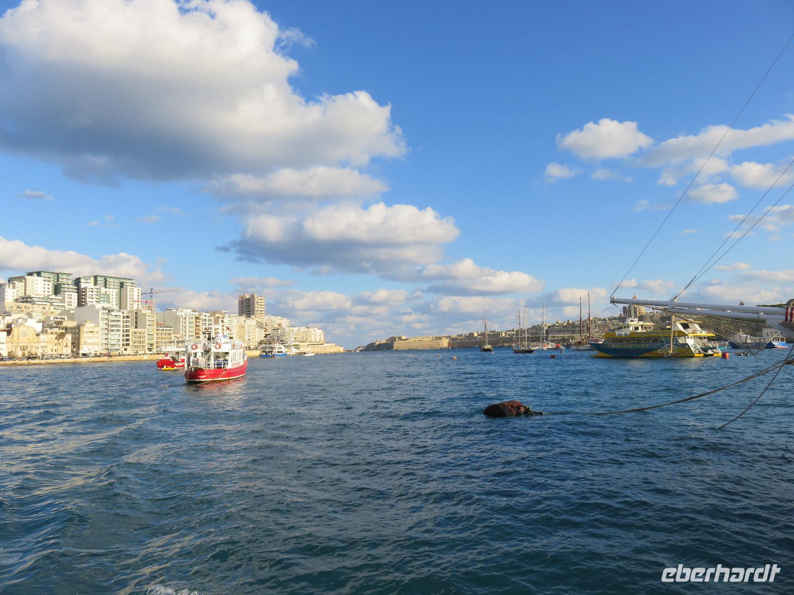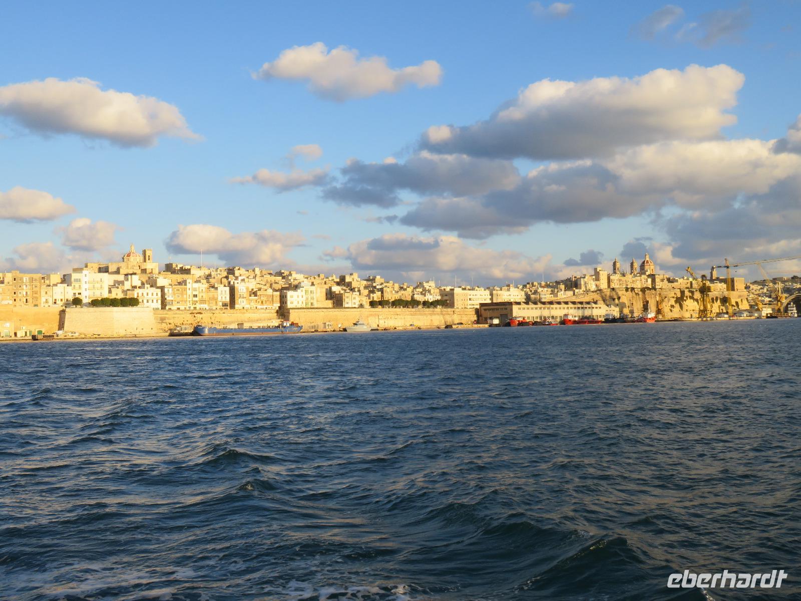 Anschließend fuhren wir mit dem Bus nach Sliema, wo für uns ein Boot zu einer großen Hafenrundfahrt gebucht war. Gerlinde hatte berichtet, dass es an den Tagen zuvor sehr stürmisch war. Und so mussten wir wegen der hohen Dünung ganz vorsichtig an Bord gehen. Ganz langsam schaukelten wir im Glanz der warmen, goldenen Nachmittagssonne aus dem Hafen von Sliema hinaus. Ein Stück weiter in Höhe des kleinen, gedrungenen Tigne Forts mussten wir etwas aufs offene Meer hinaus, schließlich mussten wir die Landzunge, auf der Valletta erbaut ist, umschiffen. Unser Boot legte sich mächtig in die Wellen und so wurde es etwas unangenehm. Wir erwiesen uns aber alle als seetüchtig. Im Grand Harbour und in den Hafenbecken der Three Cities wurde es angenehm und wir konnten den Erläuterungen in deutscher Sprache gut folgen. Wir bekamen interessante Einblicke in das Leben der Orden, genossen neue, andere Blicke auf Valletta und sahen beeindruckende Docks, Yachthäfen und das Kreuzfahrt-Terminal, der Valletta-Waterfront, mit den restaurierten alten Speichern. Jährlich sollen bis zu 600.000 Kreuzfahrer Malta besuchen ... Mit diesem Erlebnis verabschiedeten wir uns von der Hauptstadt Maltas und fuhren mit dem Bus auf der Salzstraße nach Norden zurück zum Hotel.