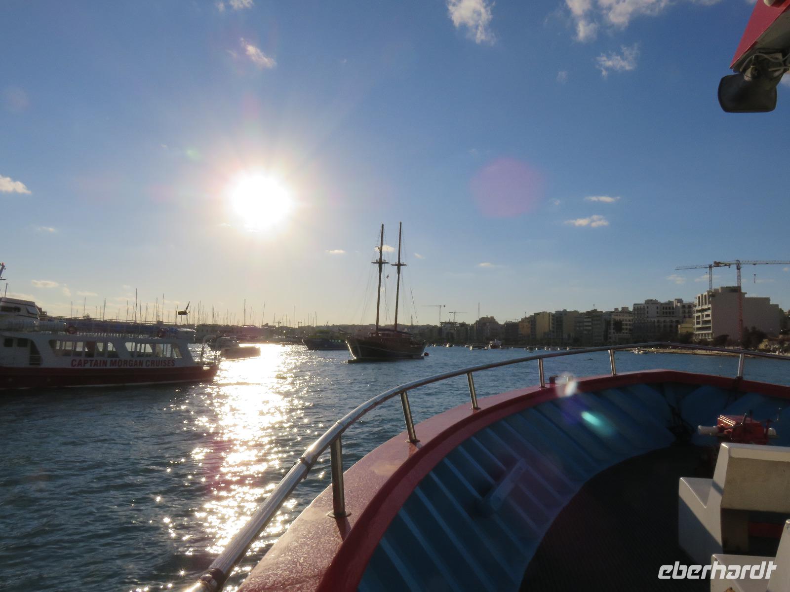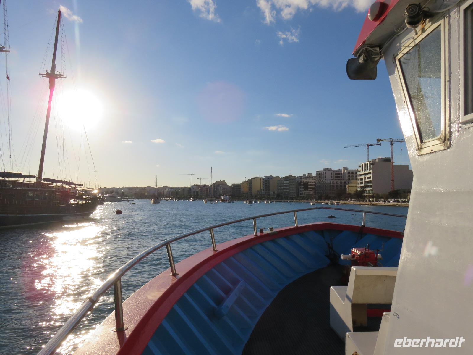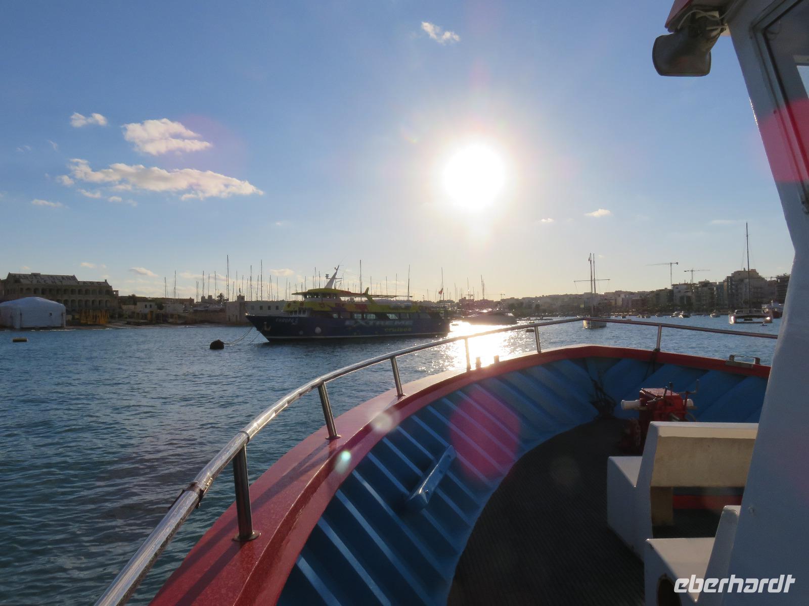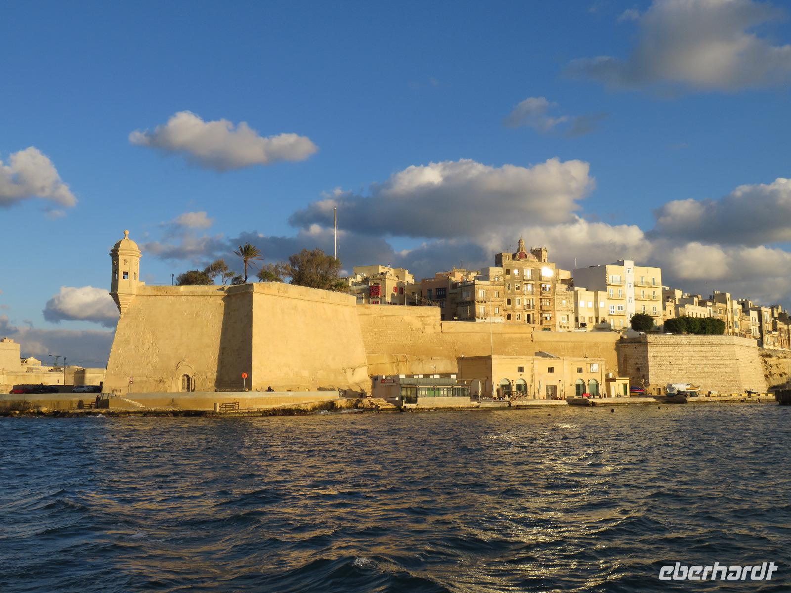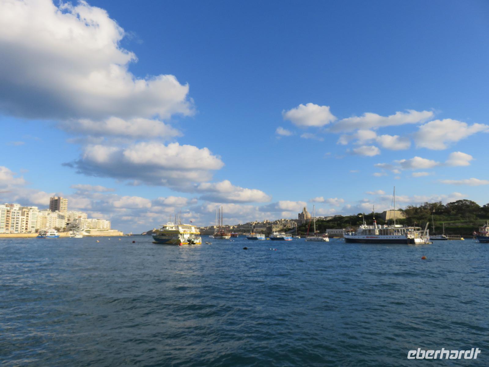 Anschließend fuhren wir mit dem Bus nach Sliema, wo für uns ein Boot zu einer großen Hafenrundfahrt gebucht war. Gerlinde hatte berichtet, dass es an den Tagen zuvor sehr stürmisch war. Und so mussten wir wegen der hohen Dünung ganz vorsichtig an Bord gehen. Ganz langsam schaukelten wir im Glanz der warmen, goldenen Nachmittagssonne aus dem Hafen von Sliema hinaus. Ein Stück weiter in Höhe des kleinen, gedrungenen Tigne Forts mussten wir etwas aufs offene Meer hinaus, schließlich mussten wir die Landzunge, auf der Valletta erbaut ist, umschiffen. Unser Boot legte sich mächtig in die Wellen und so wurde es etwas unangenehm. Wir erwiesen uns aber alle als seetüchtig. Im Grand Harbour und in den Hafenbecken der Three Cities wurde es angenehm und wir konnten den Erläuterungen in deutscher Sprache gut folgen. Wir bekamen interessante Einblicke in das Leben der Orden, genossen neue, andere Blicke auf Valletta und sahen beeindruckende Docks, Yachthäfen und das Kreuzfahrt-Terminal, der Valletta-Waterfront, mit den restaurierten alten Speichern. Jährlich sollen bis zu 600.000 Kreuzfahrer Malta besuchen ... Mit diesem Erlebnis verabschiedeten wir uns von der Hauptstadt Maltas und fuhren mit dem Bus auf der Salzstraße nach Norden zurück zum Hotel.