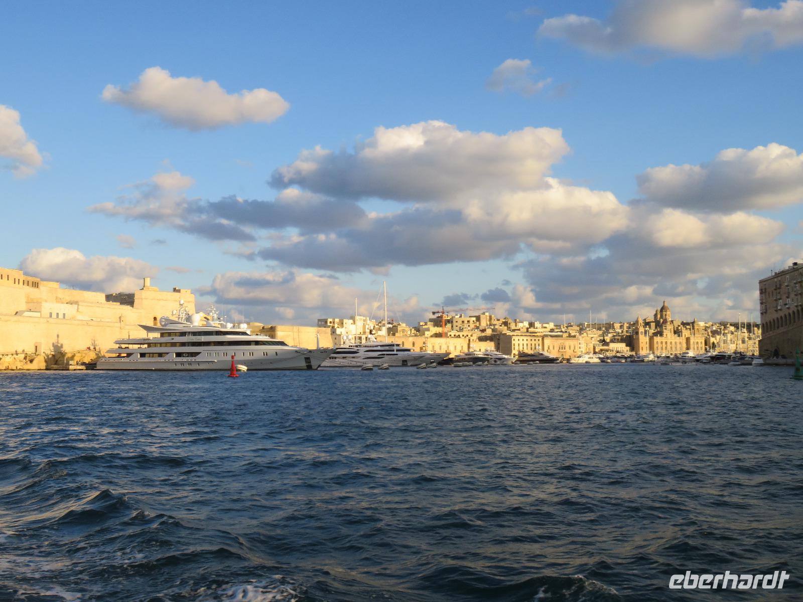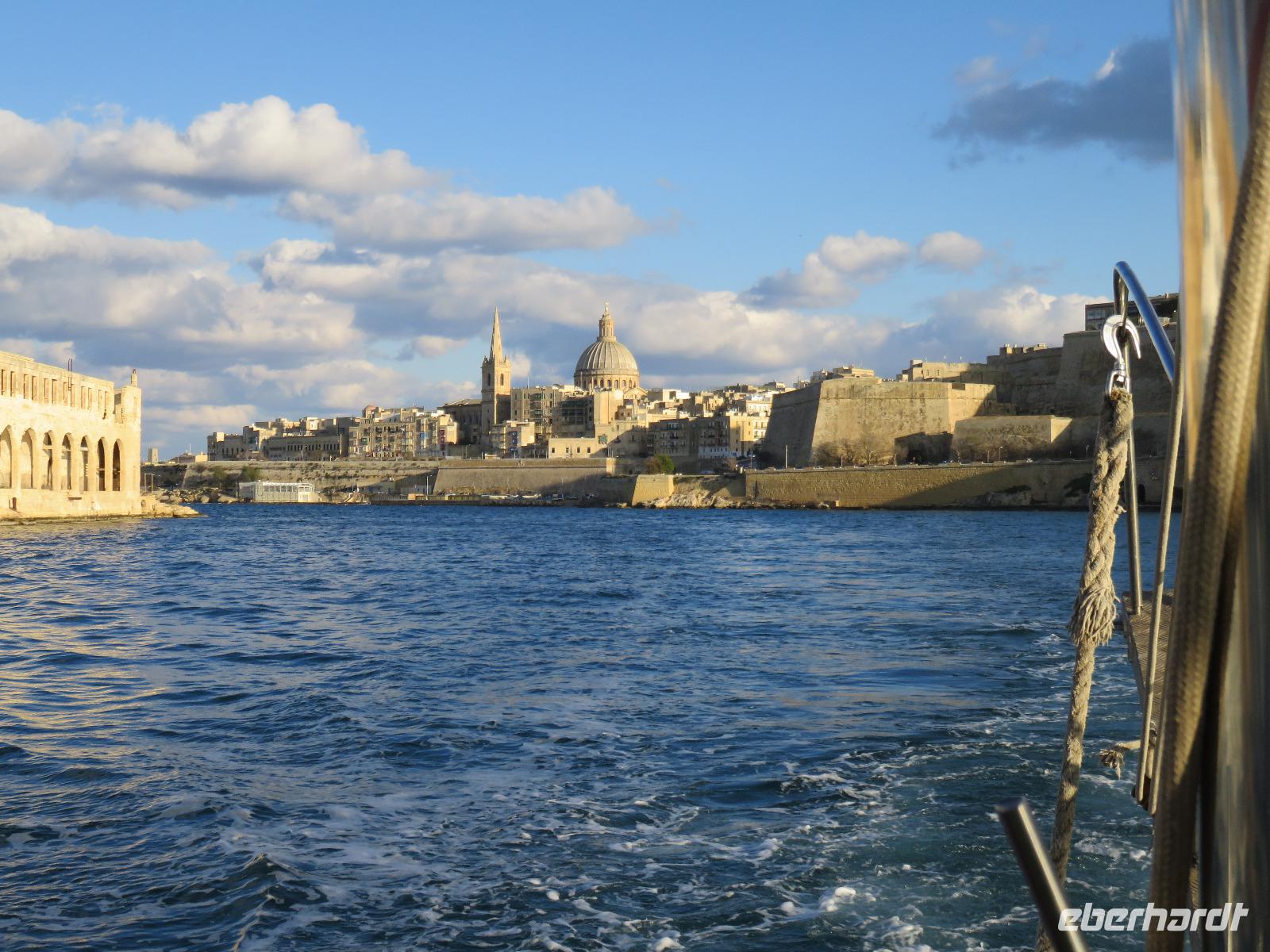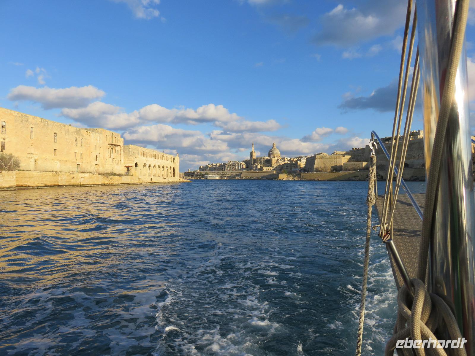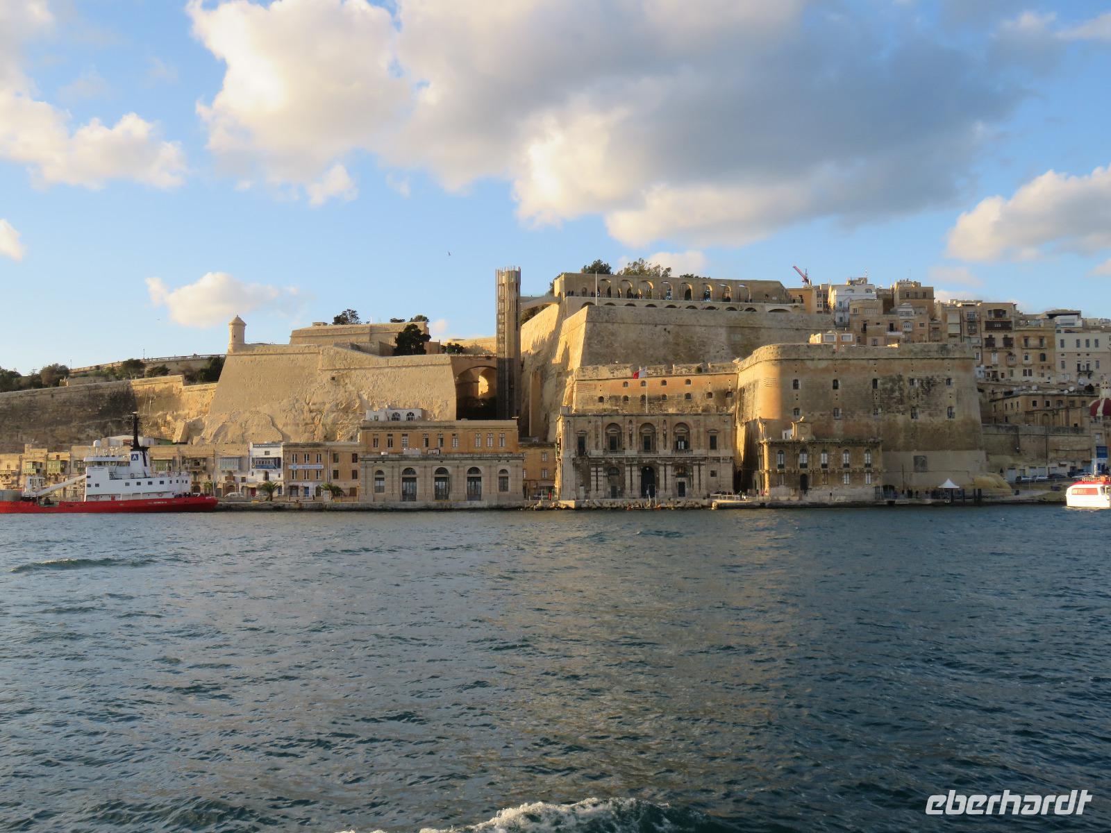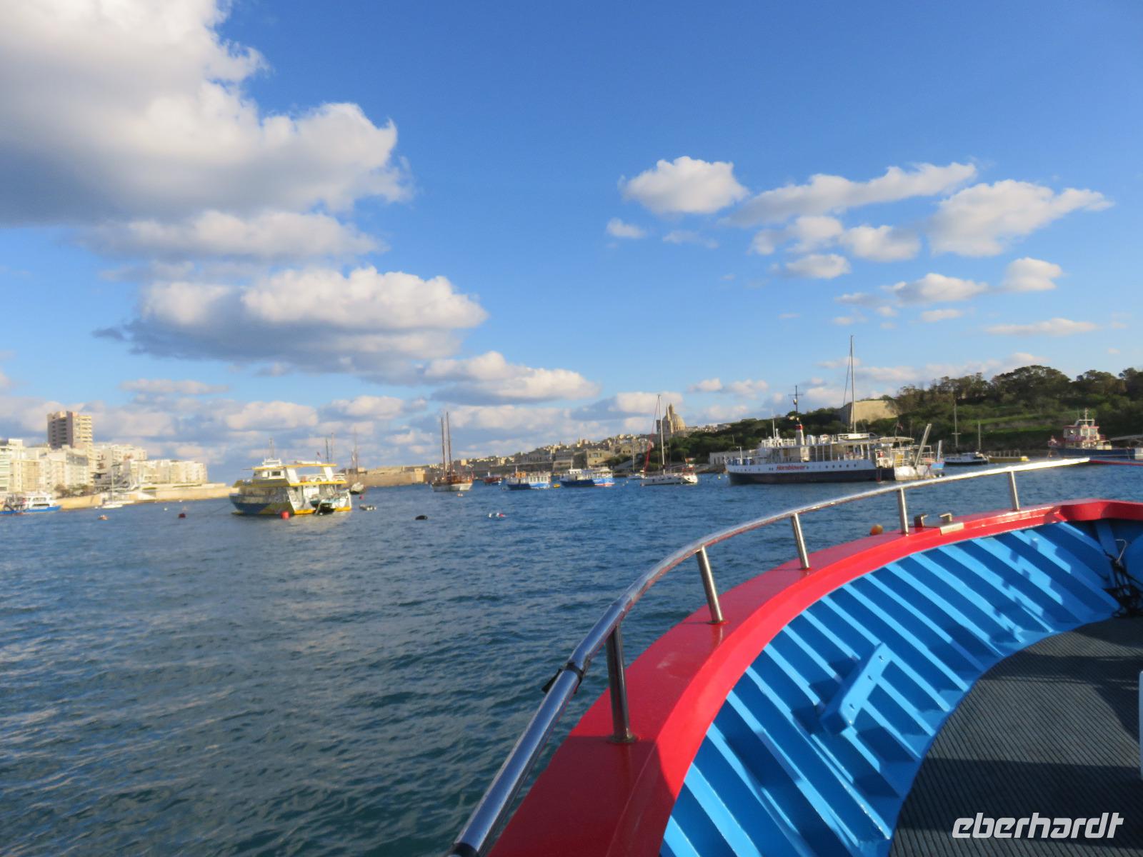 Anschließend fuhren wir mit dem Bus nach Sliema, wo für uns ein Boot zu einer großen Hafenrundfahrt gebucht war. Gerlinde hatte berichtet, dass es an den Tagen zuvor sehr stürmisch war. Und so mussten wir wegen der hohen Dünung ganz vorsichtig an Bord gehen. Ganz langsam schaukelten wir im Glanz der warmen, goldenen Nachmittagssonne aus dem Hafen von Sliema hinaus. Ein Stück weiter in Höhe des kleinen, gedrungenen Tigne Forts mussten wir etwas aufs offene Meer hinaus, schließlich mussten wir die Landzunge, auf der Valletta erbaut ist, umschiffen. Unser Boot legte sich mächtig in die Wellen und so wurde es etwas unangenehm. Wir erwiesen uns aber alle als seetüchtig. Im Grand Harbour und in den Hafenbecken der Three Cities wurde es angenehm und wir konnten den Erläuterungen in deutscher Sprache gut folgen. Wir bekamen interessante Einblicke in das Leben der Orden, genossen neue, andere Blicke auf Valletta und sahen beeindruckende Docks, Yachthäfen und das Kreuzfahrt-Terminal, der Valletta-Waterfront, mit den restaurierten alten Speichern. Jährlich sollen bis zu 600.000 Kreuzfahrer Malta besuchen ... Mit diesem Erlebnis verabschiedeten wir uns von der Hauptstadt Maltas und fuhren mit dem Bus auf der Salzstraße nach Norden zurück zum Hotel.
