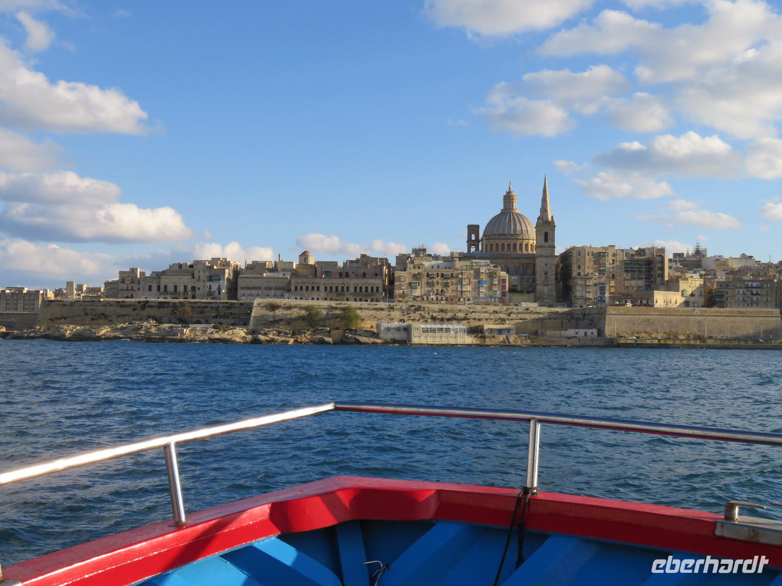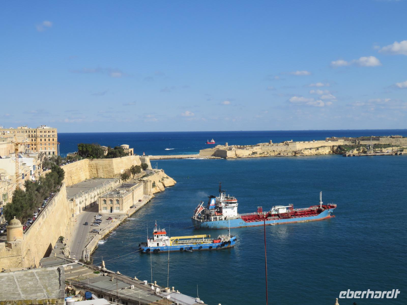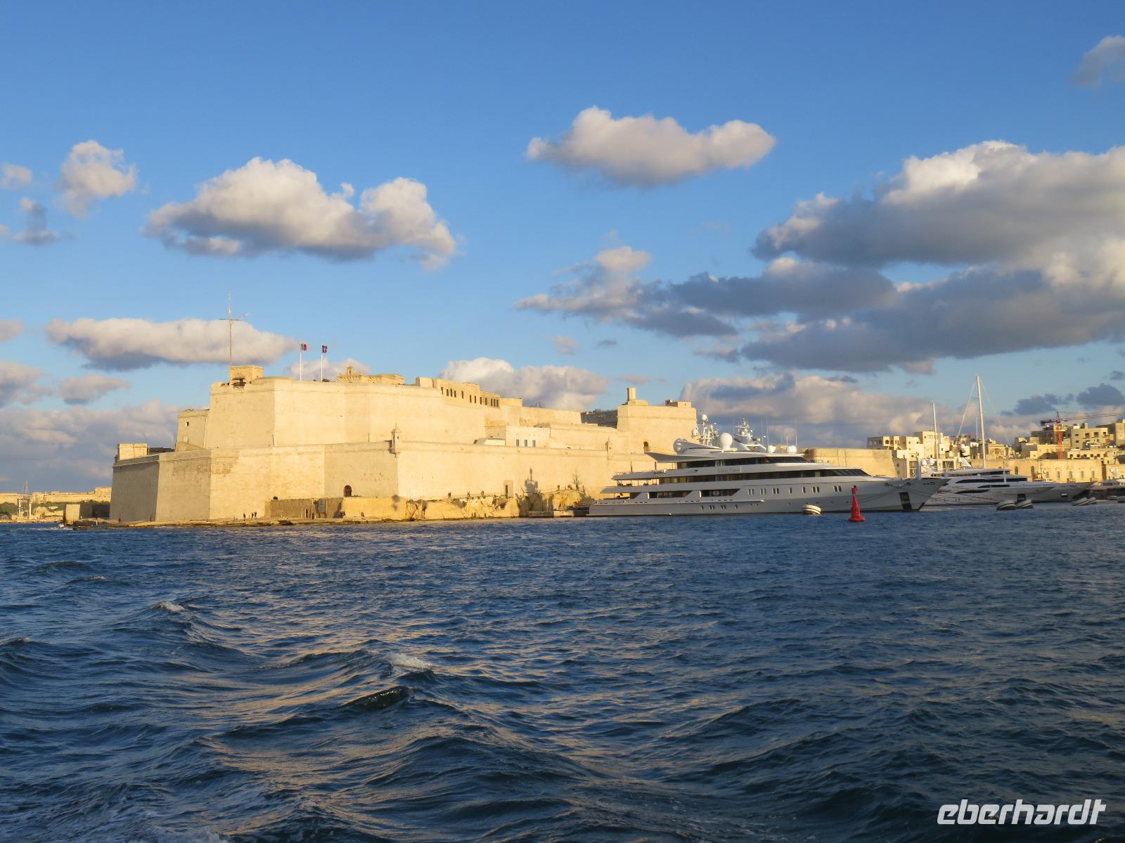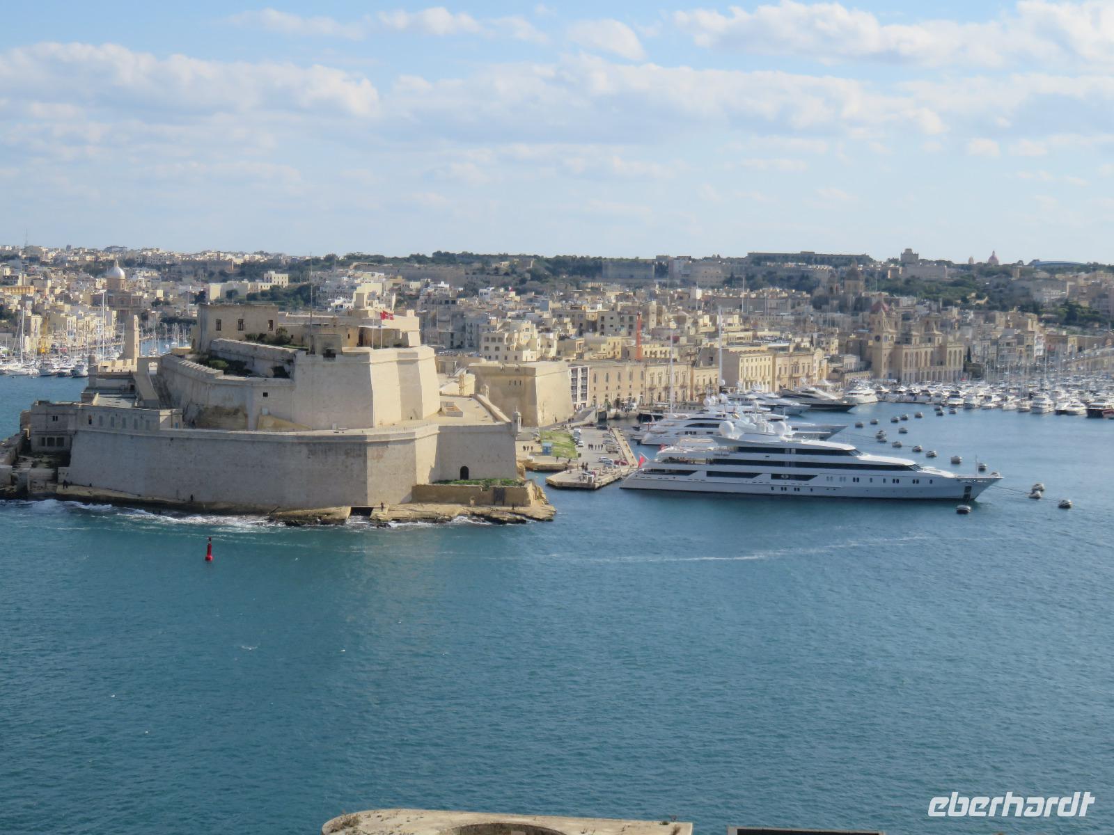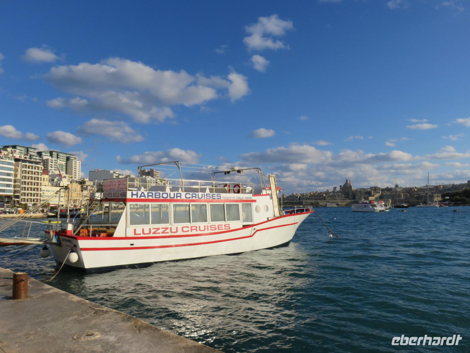 Anschließend fuhren wir mit dem Bus nach Sliema, wo für uns ein Boot zu einer großen Hafenrundfahrt gebucht war. Gerlinde hatte berichtet, dass es an den Tagen zuvor sehr stürmisch war. Und so mussten wir wegen der hohen Dünung ganz vorsichtig an Bord gehen. Ganz langsam schaukelten wir im Glanz der warmen, goldenen Nachmittagssonne aus dem Hafen von Sliema hinaus. Ein Stück weiter in Höhe des kleinen, gedrungenen Tigne Forts mussten wir etwas aufs offene Meer hinaus, schließlich mussten wir die Landzunge, auf der Valletta erbaut ist, umschiffen. Unser Boot legte sich mächtig in die Wellen und so wurde es etwas unangenehm. Wir erwiesen uns aber alle als seetüchtig. Im Grand Harbour und in den Hafenbecken der Three Cities wurde es angenehm und wir konnten den Erläuterungen in deutscher Sprache gut folgen. Wir bekamen interessante Einblicke in das Leben der Orden, genossen neue, andere Blicke auf Valletta und sahen beeindruckende Docks, Yachthäfen und das Kreuzfahrt-Terminal, der Valletta-Waterfront, mit den restaurierten alten Speichern. Jährlich sollen bis zu 600.000 Kreuzfahrer Malta besuchen ... Mit diesem Erlebnis verabschiedeten wir uns von der Hauptstadt Maltas und fuhren mit dem Bus auf der Salzstraße nach Norden zurück zum Hotel.