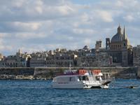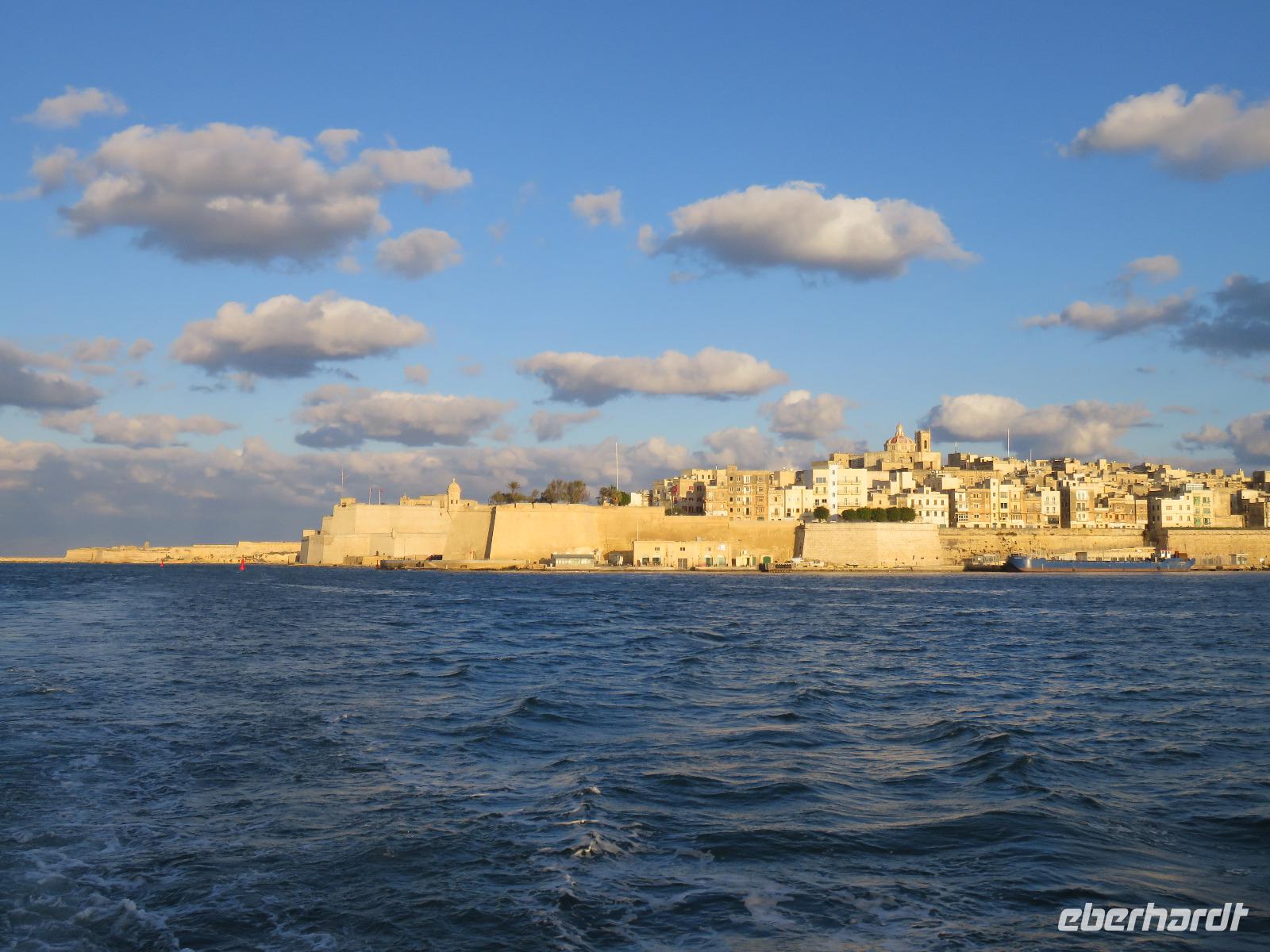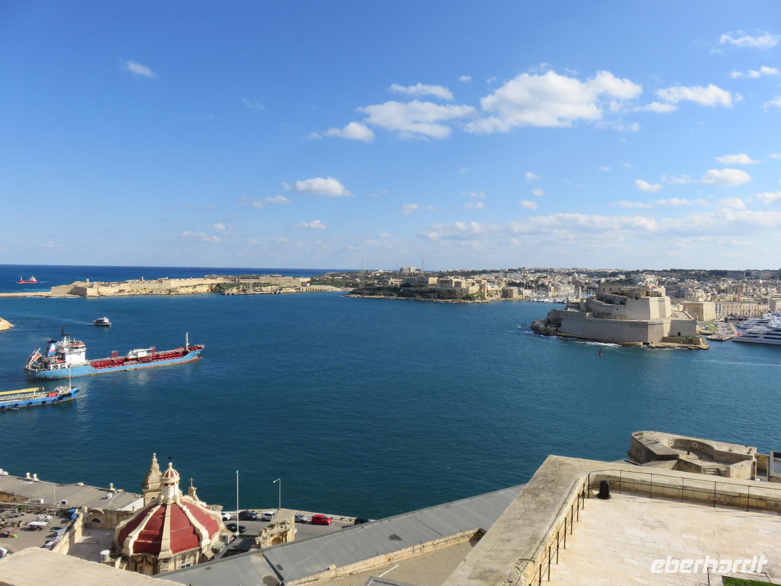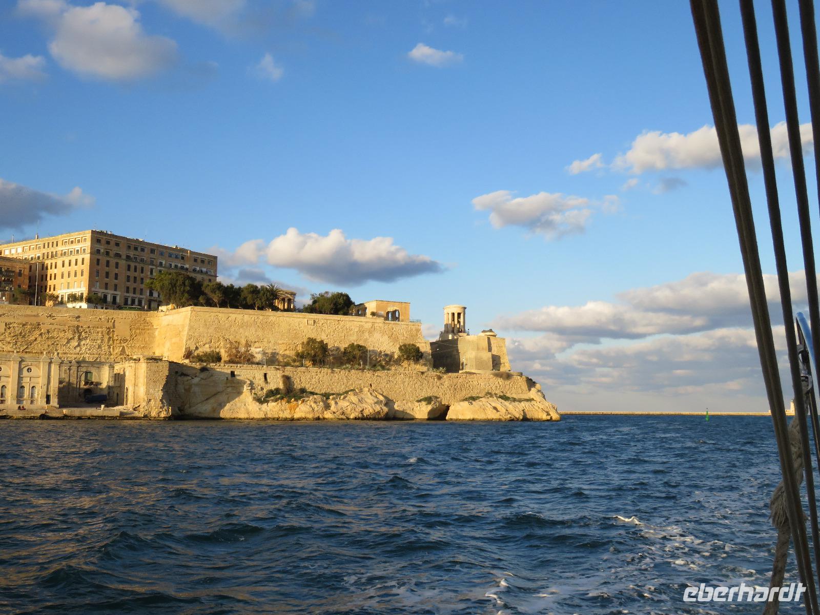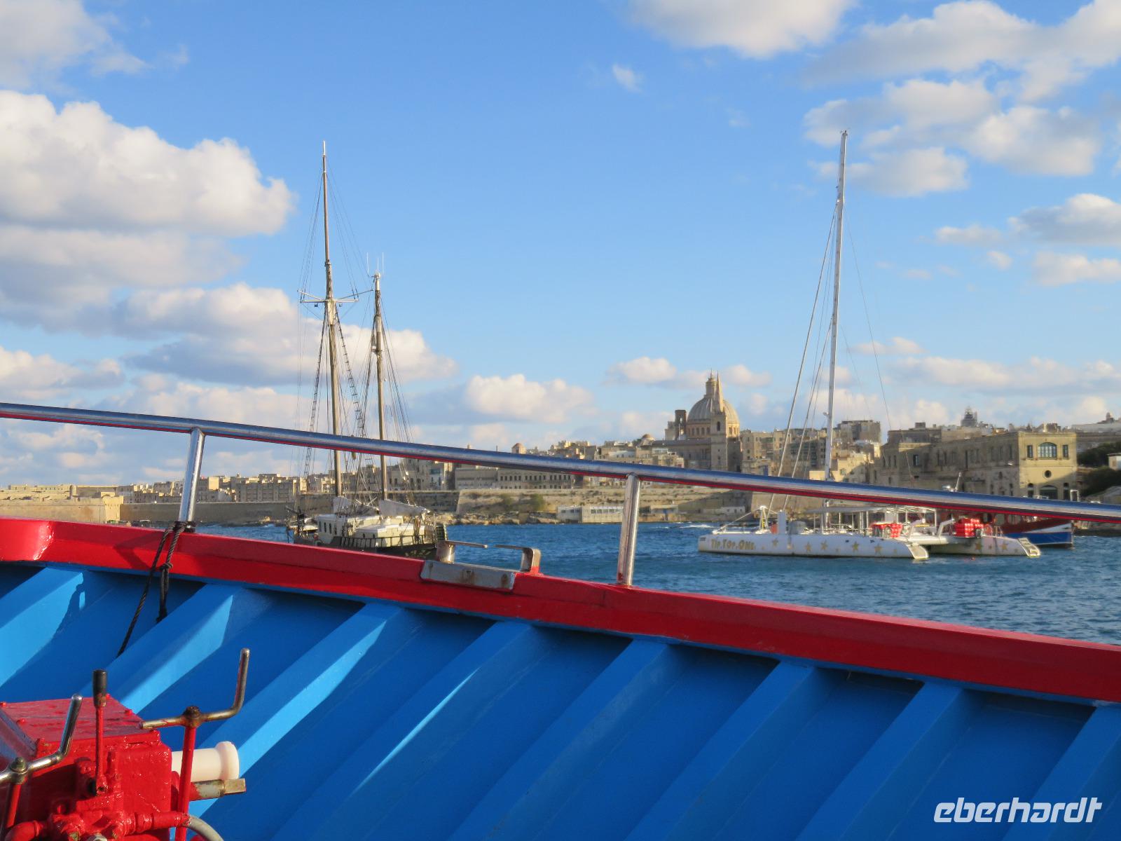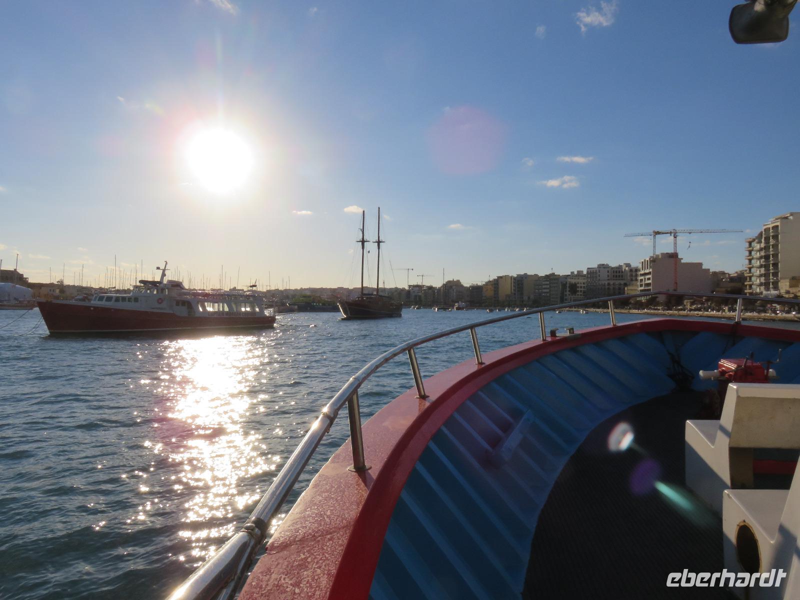 Anschließend fuhren wir mit dem Bus nach Sliema, wo für uns ein Boot zu einer großen Hafenrundfahrt gebucht war. Gerlinde hatte berichtet, dass es an den Tagen zuvor sehr stürmisch war. Und so mussten wir wegen der hohen Dünung ganz vorsichtig an Bord gehen. Ganz langsam schaukelten wir im Glanz der warmen, goldenen Nachmittagssonne aus dem Hafen von Sliema hinaus. Ein Stück weiter in Höhe des kleinen, gedrungenen Tigne Forts mussten wir etwas aufs offene Meer hinaus, schließlich mussten wir die Landzunge, auf der Valletta erbaut ist, umschiffen. Unser Boot legte sich mächtig in die Wellen und so wurde es etwas unangenehm. Wir erwiesen uns aber alle als seetüchtig. Im Grand Harbour und in den Hafenbecken der Three Cities wurde es angenehm und wir konnten den Erläuterungen in deutscher Sprache gut folgen. Wir bekamen interessante Einblicke in das Leben der Orden, genossen neue, andere Blicke auf Valletta und sahen beeindruckende Docks, Yachthäfen und das Kreuzfahrt-Terminal, der Valletta-Waterfront, mit den restaurierten alten Speichern. Jährlich sollen bis zu 600.000 Kreuzfahrer Malta besuchen ... Mit diesem Erlebnis verabschiedeten wir uns von der Hauptstadt Maltas und fuhren mit dem Bus auf der Salzstraße nach Norden zurück zum Hotel.