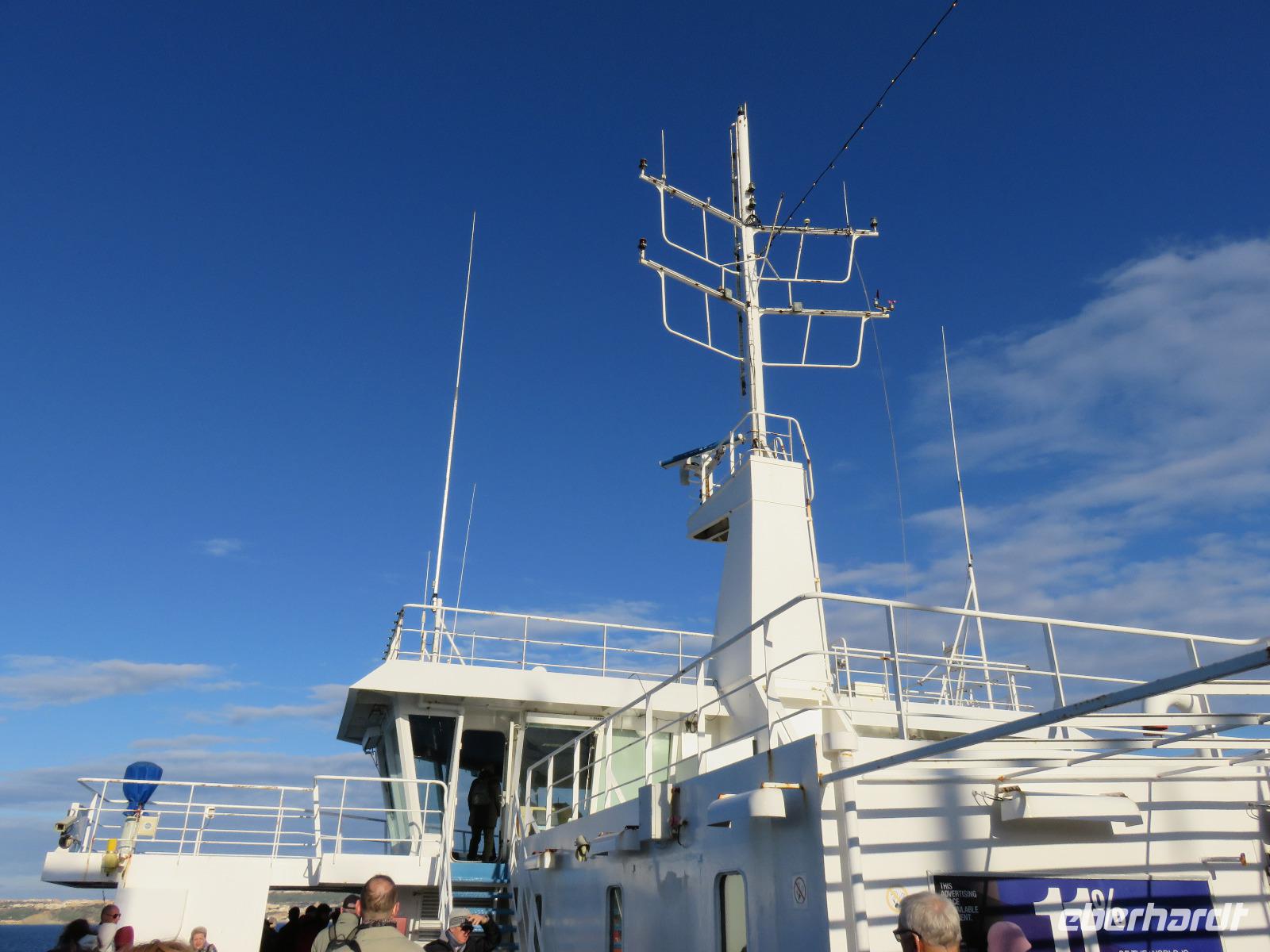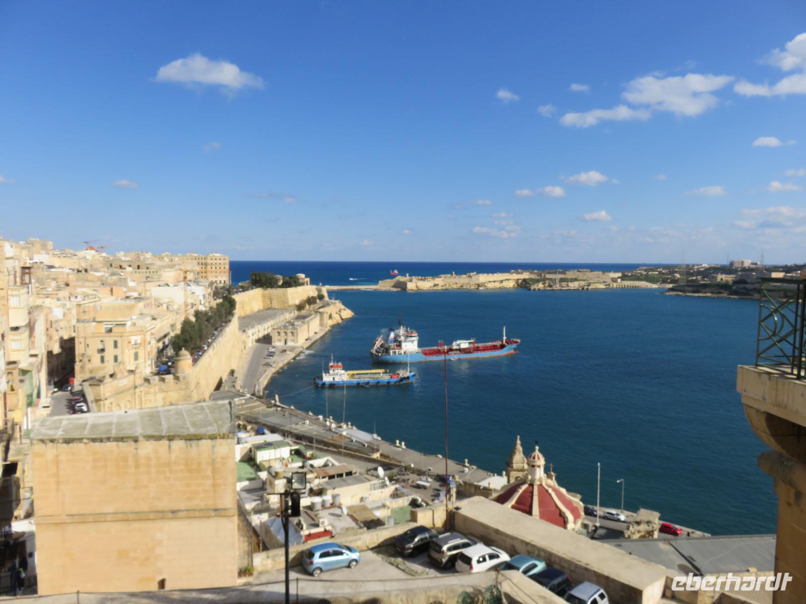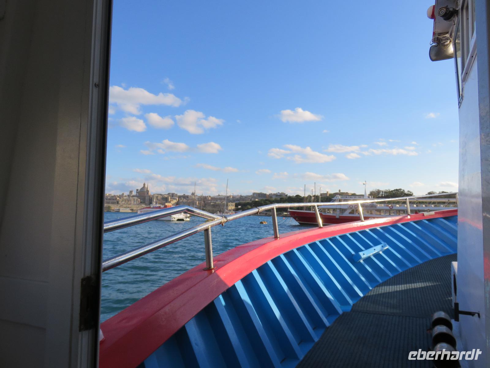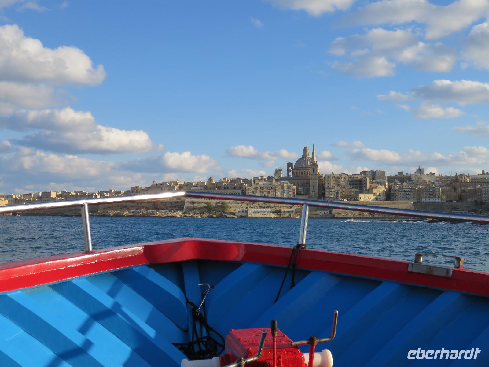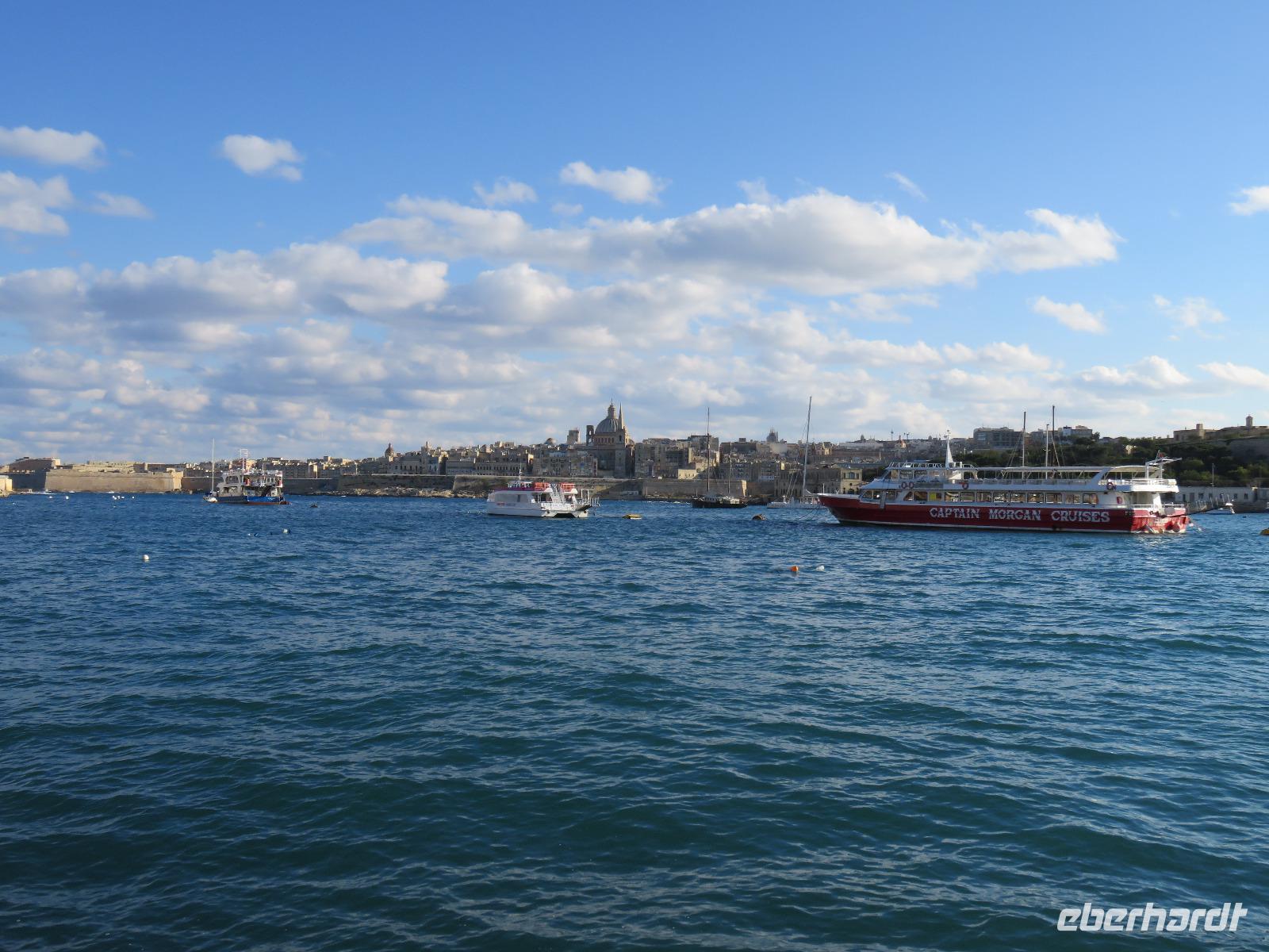 Anschließend fuhren wir mit dem Bus nach Sliema, wo für uns ein Boot zu einer großen Hafenrundfahrt gebucht war. Gerlinde hatte berichtet, dass es an den Tagen zuvor sehr stürmisch war. Und so mussten wir wegen der hohen Dünung ganz vorsichtig an Bord gehen. Ganz langsam schaukelten wir im Glanz der warmen, goldenen Nachmittagssonne aus dem Hafen von Sliema hinaus. Ein Stück weiter in Höhe des kleinen, gedrungenen Tigne Forts mussten wir etwas aufs offene Meer hinaus, schließlich mussten wir die Landzunge, auf der Valletta erbaut ist, umschiffen. Unser Boot legte sich mächtig in die Wellen und so wurde es etwas unangenehm. Wir erwiesen uns aber alle als seetüchtig. Im Grand Harbour und in den Hafenbecken der Three Cities wurde es angenehm und wir konnten den Erläuterungen in deutscher Sprache gut folgen. Wir bekamen interessante Einblicke in das Leben der Orden, genossen neue, andere Blicke auf Valletta und sahen beeindruckende Docks, Yachthäfen und das Kreuzfahrt-Terminal, der Valletta-Waterfront, mit den restaurierten alten Speichern. Jährlich sollen bis zu 600.000 Kreuzfahrer Malta besuchen ... Mit diesem Erlebnis verabschiedeten wir uns von der Hauptstadt Maltas und fuhren mit dem Bus auf der Salzstraße nach Norden zurück zum Hotel.