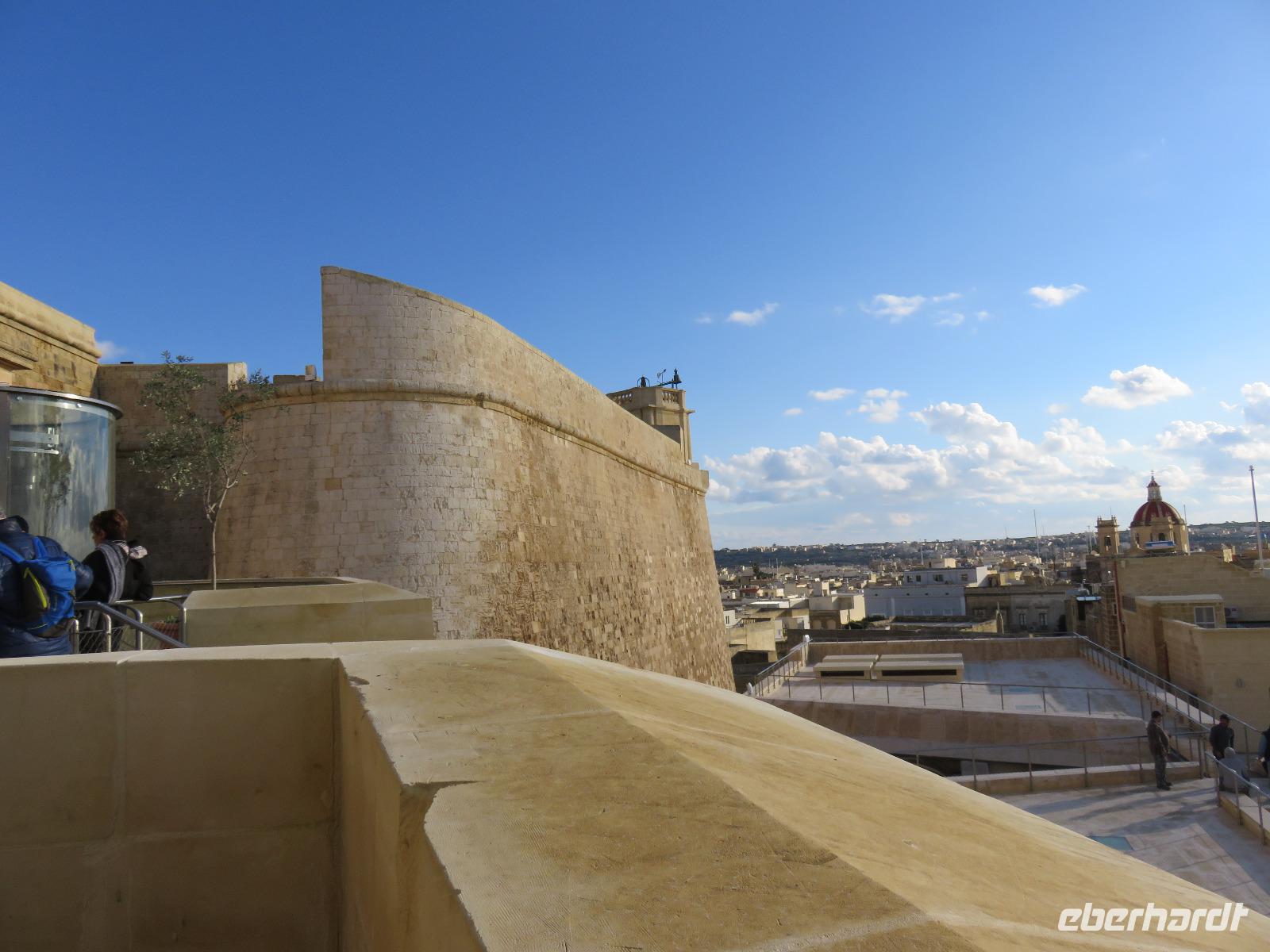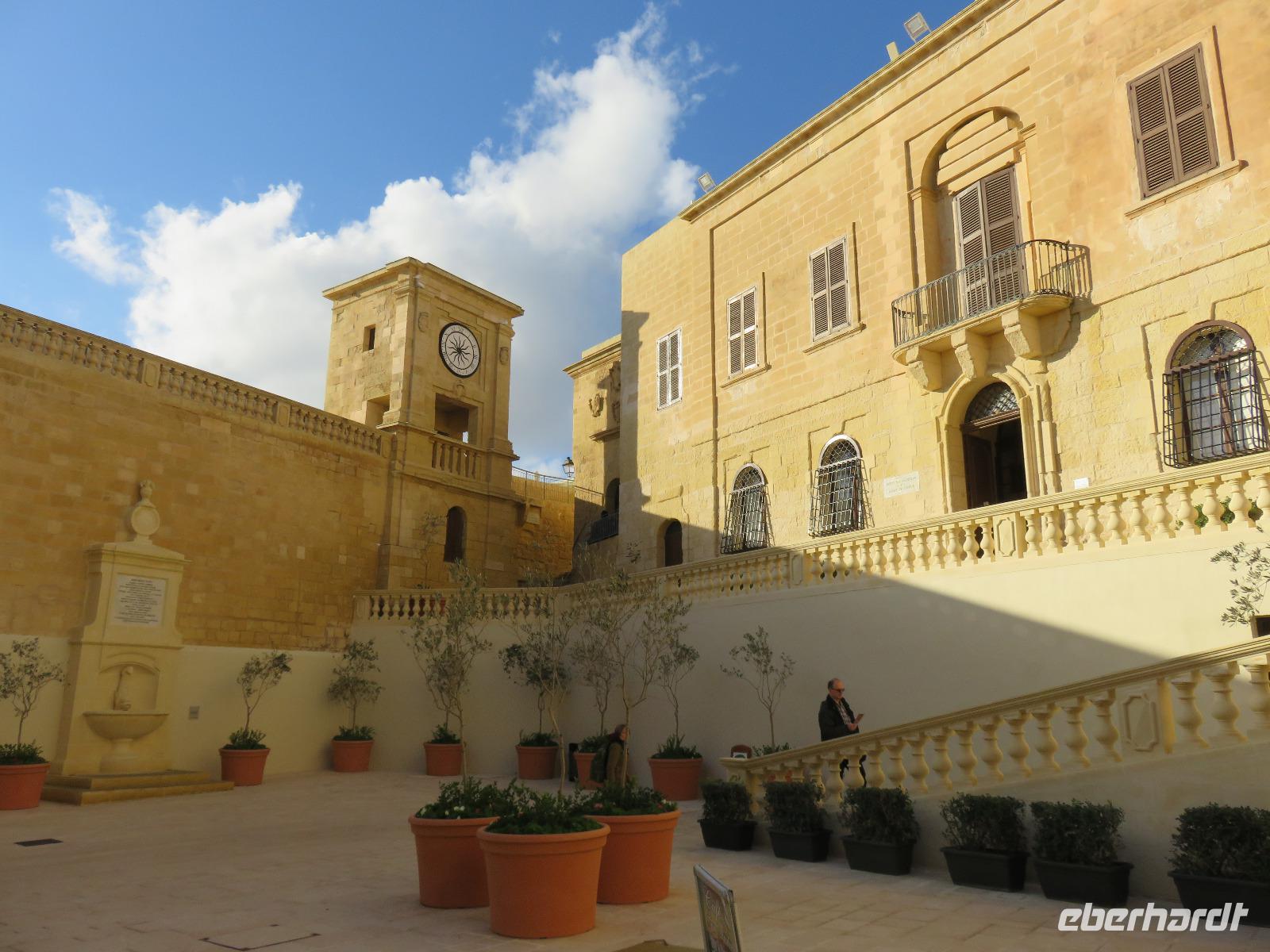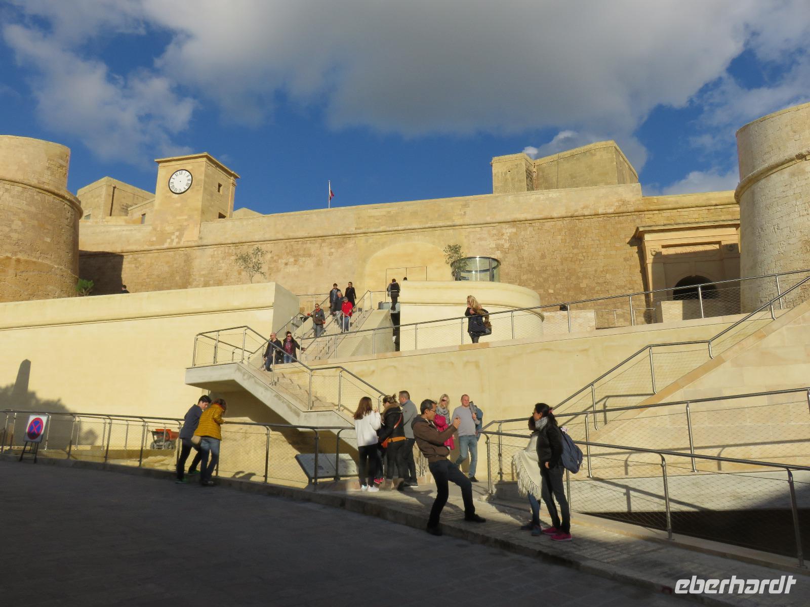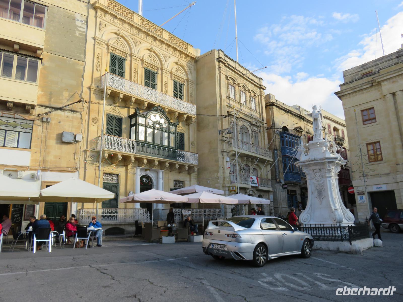 Nach etwas Zeit zu individuellen Besichtigungen spazierten wir vorbei am Denkmal für den Stadtgründer Jean de la Valette, am Sitz der Präsidentin Maltas, Marie Louise Coleiro Preca, zum Upper Barracca Garden, einer kleinen, grünen Oase fast mitten in der Stadt. Von hier eröffnete sich uns ein äußerst prächtiger Blick auf den Grand Harbour, den Großen Hafen, und The Three Cities: Birgu, Senglea und Cospicua mit ihren kleinen und größeren Hafenbecken. Unsere Schritte führten uns zurück zur St. Johns Co-Kathedrale, wo wir nun die Prachtfassade mit den zwei Türmen und der Uhr bestaunten. Nicht mehr weit und wir standen vor dem Großmeisterpalast, dem Sitz der Macht auf Malta. Einst residierten hier die Großmeister, später ab 1800 der britische Gouverneur und heute auch die maltesische Präsidentin. Leider hatte der Palast mit seinen Prunkräumen und -sälen heute zu Silvester geschlossen. Wir müssen wirklich nochmals wiederkommen! Hier in der Nähe des Palastplatzes befinden sich eine Reihe von Restaurants und Cafés und wir hatten uns nach den Besichtigungen eine Pause zur Stärkung im wahrsten Sinn der Worte verdient. Einige Gäste fanden Plätze im Traditionscafé Cordina, andere bevorzugten bei nun wolkenlosem Himmel die Tische im Freien.