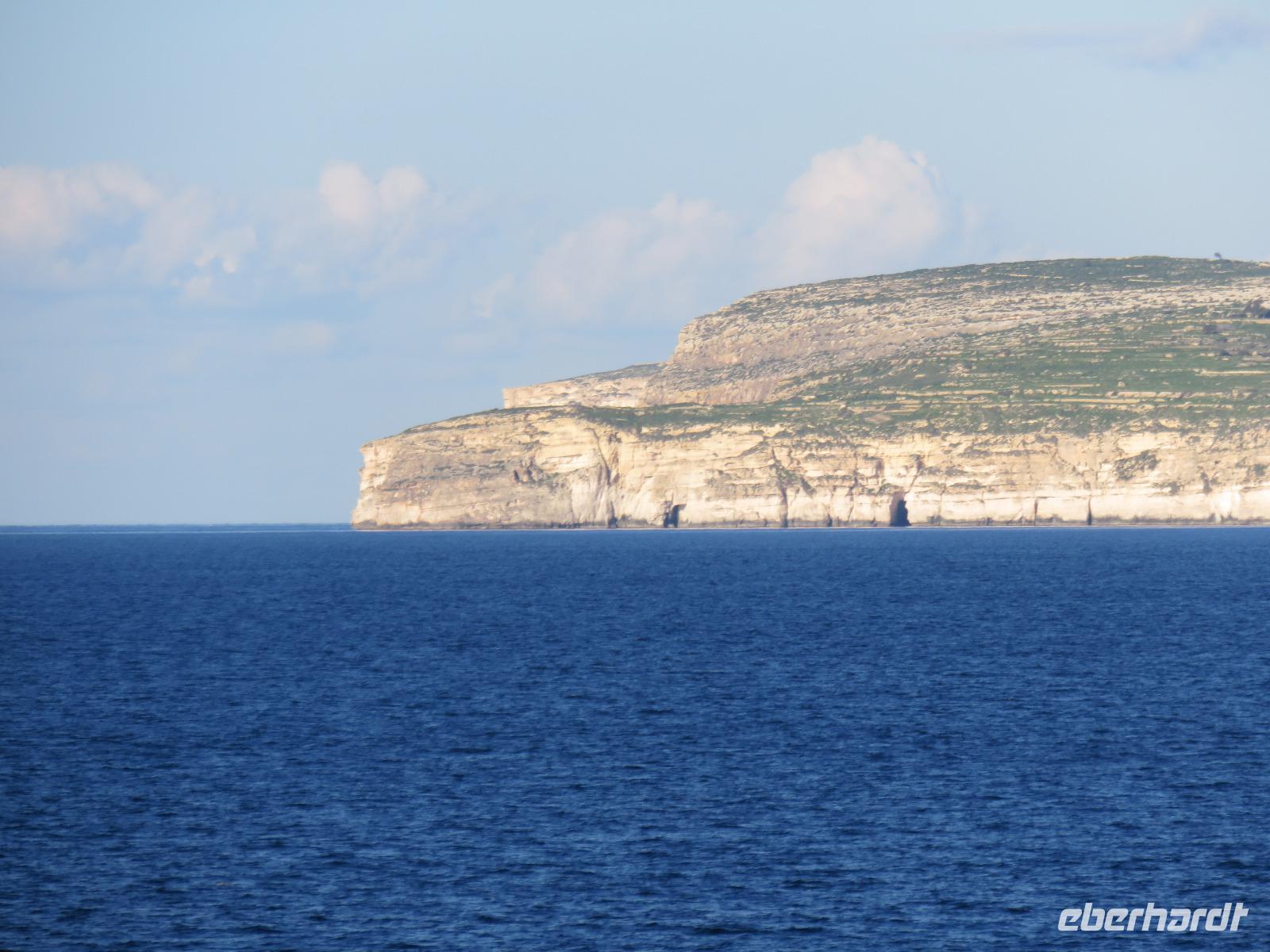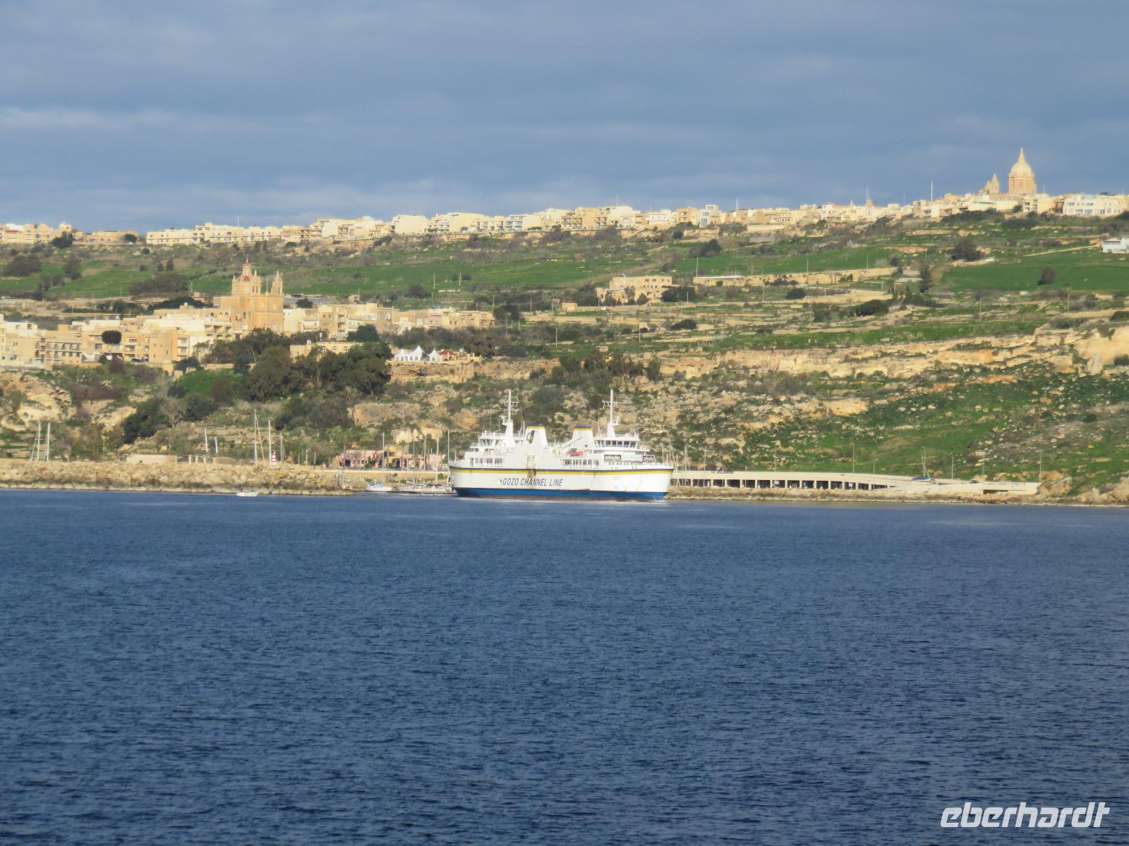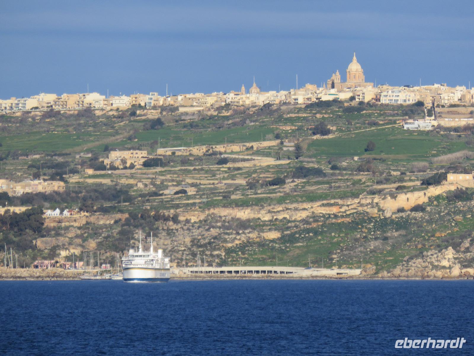 Ein ganzer Tag auf der Nachbarinsel lag vor uns. Wir starteten zeitig, um die Fähre 9 Uhr nach Gozo zu erreichen. Gut, das sich unser Hotel im nördlichen Urlauberzentrum befindet. Wir nahmen die Straße nach Norden, reisten vorbei an Wachtürmen, durchquerten leicht hügeliges Land, um den Fähranleger in Cirkewwa zu erreichen. Im morgendlichen Sonnenschein, wenn Engel verreisen, legten wir ab. Vorbei an der der kleinen Insel Comino, die nur von 4 Personen bewohnt wird und ein Hotel beherbergt, brachte uns die MS Malita hinüber zur kleinen Schwester Maltas. Hier stiegen wir in einen örtlichen Bus um. Alles strahlte eine ruhige Beschaulichkeit aus. Nicht umsonst wird Gozo auch als ruhiger Gegenpol zu Malta bezeichnet. Obwohl am Fährhafen viele Busse auf die Tagestouristen warteten, waren wir an unserem ersten Besichtigungspunkt für einige Zeit die einzige Gruppe. Während wir auf Malta ganz wenige Sandstrände gesehen hatten, blickten wir an der Calypso-Höhle auf den goldenen Strand der Ramla-Bucht. Auch sahen wir die in alten Zeiten zur Verteidigung errichtete Mauer. Diese sollte Schiffe der Angreifer zum Kentern bringen. Eine einfache und zweckmäßige Lösung. In der Nacht hatte es geregnet und so hatten wir in der klaren Luft beste Sicht in Richtung Osten und am Horizont sahen wir ein flaches Land mit einer gewaltigen Erhebung ... es könnte Sizilien sein. Von hier soll man die größte Insel im Mittelmeer sehen können. Wir nehmen es also an und erfreuten uns an dieser Weit- und Fernsicht. Gerlinde berichtete über die Legende um die Irrfahrt des Odysseus, der nach Schiffbruch genau hier anlandete und von der Nymphe Calypso gepflegt wurde. Seine Sehnsucht nach seiner Frau Penelope war es, die ihn nach sieben Jahren Richtung Heimat aufbrechen ließ.