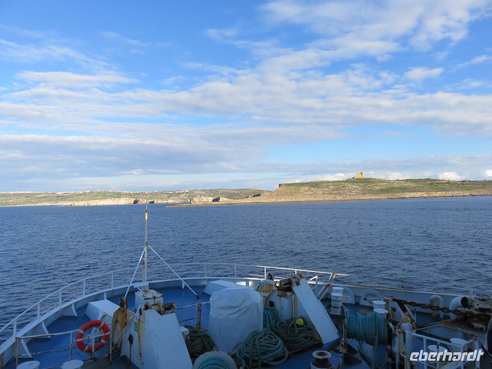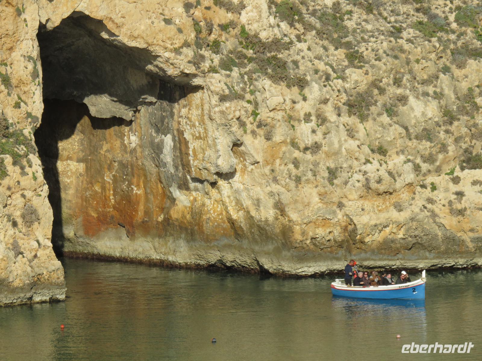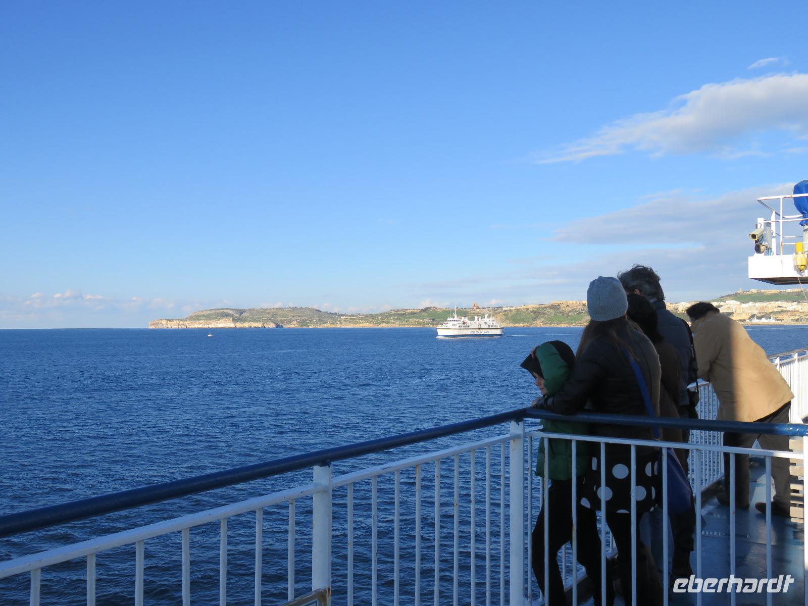 Ein ganzer Tag auf der Nachbarinsel lag vor uns. Wir starteten zeitig, um die Fähre 9 Uhr nach Gozo zu erreichen. Gut, das sich unser Hotel im nördlichen Urlauberzentrum befindet. Wir nahmen die Straße nach Norden, reisten vorbei an Wachtürmen, durchquerten leicht hügeliges Land, um den Fähranleger in Cirkewwa zu erreichen. Im morgendlichen Sonnenschein, wenn Engel verreisen, legten wir ab. Vorbei an der der kleinen Insel Comino, die nur von 4 Personen bewohnt wird und ein Hotel beherbergt, brachte uns die MS Malita hinüber zur kleinen Schwester Maltas. Hier stiegen wir in einen örtlichen Bus um. Alles strahlte eine ruhige Beschaulichkeit aus. Nicht umsonst wird Gozo auch als ruhiger Gegenpol zu Malta bezeichnet. Obwohl am Fährhafen viele Busse auf die Tagestouristen warteten, waren wir an unserem ersten Besichtigungspunkt für einige Zeit die einzige Gruppe. Während wir auf Malta ganz wenige Sandstrände gesehen hatten, blickten wir an der Calypso-Höhle auf den goldenen Strand der Ramla-Bucht. Auch sahen wir die in alten Zeiten zur Verteidigung errichtete Mauer. Diese sollte Schiffe der Angreifer zum Kentern bringen. Eine einfache und zweckmäßige Lösung. In der Nacht hatte es geregnet und so hatten wir in der klaren Luft beste Sicht in Richtung Osten und am Horizont sahen wir ein flaches Land mit einer gewaltigen Erhebung ... es könnte Sizilien sein. Von hier soll man die größte Insel im Mittelmeer sehen können. Wir nehmen es also an und erfreuten uns an dieser Weit- und Fernsicht. Gerlinde berichtete über die Legende um die Irrfahrt des Odysseus, der nach Schiffbruch genau hier anlandete und von der Nymphe Calypso gepflegt wurde. Seine Sehnsucht nach seiner Frau Penelope war es, die ihn nach sieben Jahren Richtung Heimat aufbrechen ließ.