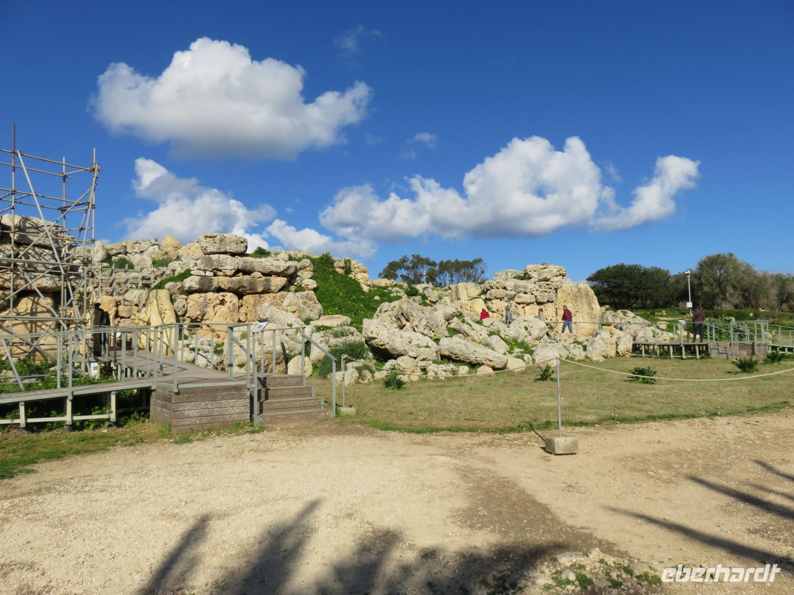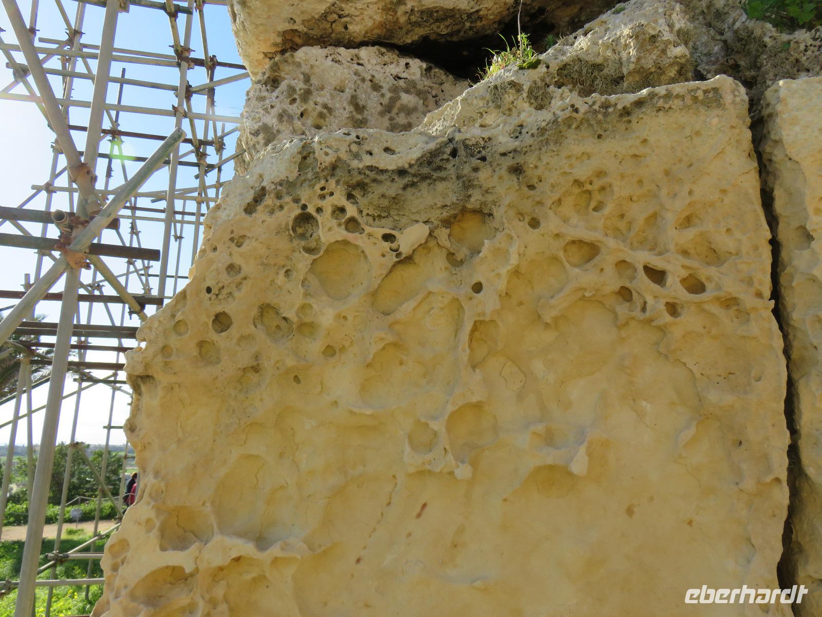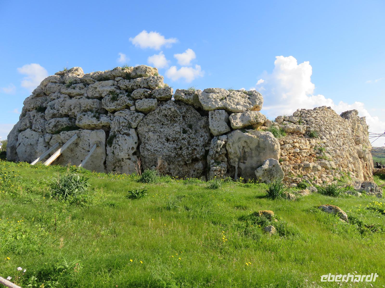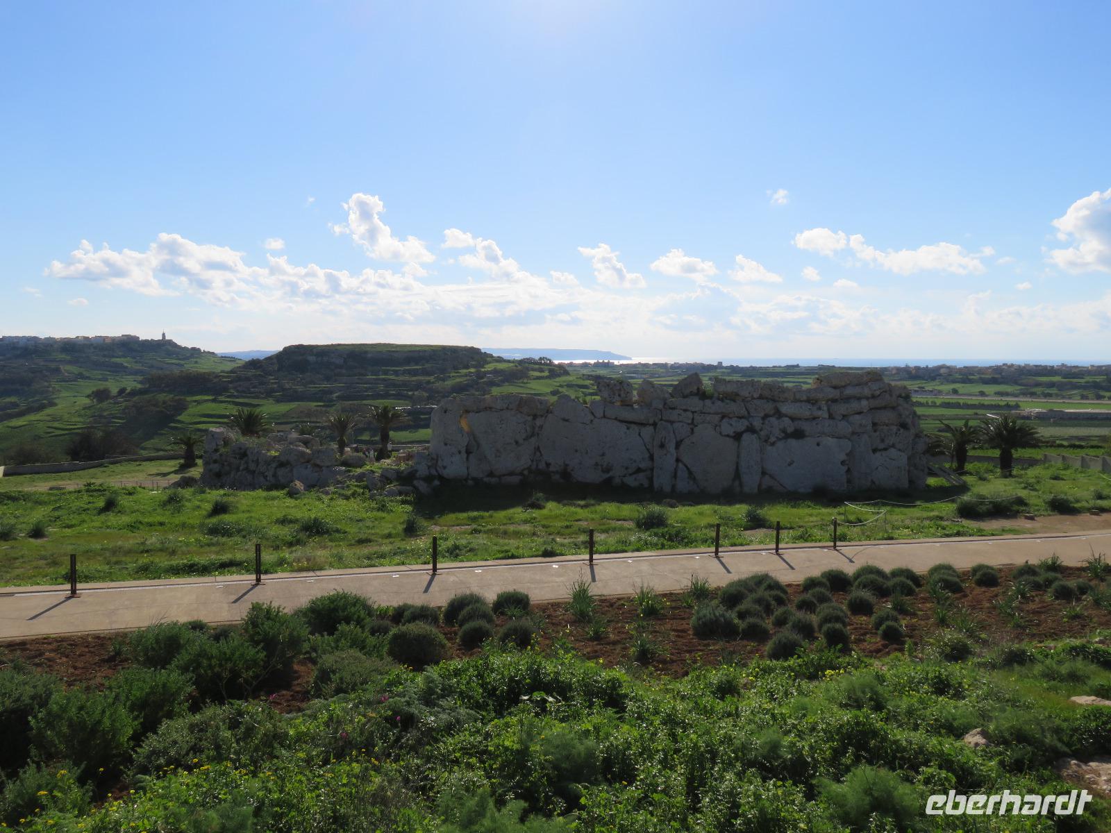 Malta, Comino und Gozo bilden eigentlich eine große Insel, seit der Eiszeit als der Wasserspiegel des Mittelmeers anstieg, ragen nur noch die Spitzen aus dem Wasser hervor und so bilden die Inseln heute den Archipel der Republik Malta. Die Erstbesiedlung soll vor ca. 5.200 Jahren von Sizilien aus erfolgt sein. Auf den Inseln entwickelte sich eine in Europa einzigartige steinzeitliche Kulturstufe mit Megalithkulturstätten. Bekannt sind heute auf Malta und Gozo rund 30 dieser Tempel. Wir wären nicht auf Malta gewesen, hätten wir nicht eine dieser Anlagen besichtigt. Und eine der schönsten und größten ist der Tempel von Ggantija, südöstlich von Xaghra, ein UNESCO-Weltkulturerbe. Zuerst besuchten wir das kleine Museum. Hier wurde Geschichte lebendig: Die Freilegung durch den britischen Inselkommandanten Otto Bayer, die Aquarelle des deutschen Malers H. von Brockdorff, der Erwerb durch das Maltesische Nationalmuseum 1933. Erst ab dort begann man mit der systematischen Erforschung. Zudem bestaunten wir alte Gefäße, Statuten - Fundstücke im Tempel. Mittels moderner Methoden hat man auch ein Abbild einer Bewohnerin erstellt. Die Legende besagt, dass eine Riesin mit ihrem Kind auf dem Arm in einer Nacht den Tempel errichtet haben soll. Tief beeindruckt lenkten wir unsere Schritte nun hinab zu den beiden Tempeln aus dem 4. Jahrhundert vor Christus. Einzigartig die Ausmaße, gewaltig die Steinblöcke ... der größte soll 5,70 Meter lang, 3,80 Meter breit und 57 Tonnen schwer sein ... kaum zu glauben. Die Mauern sollen bis zu 16 Metern hoch gewesen sein. Heute müssen sie teilweise mit Gerüsten abgestützt werden. Wir sahen die exakte Bauweise, im Inneren auch die filigrane Ausschmückung mit kunstvollen Verzierungen. Das alles mit einfachen Steinwerkzeugen! Mit Phantasie sind der Altar und die Feuerstelle zu erkennen. Es blieb etwas Zeit, auch den Nordtempel zu betrachten.