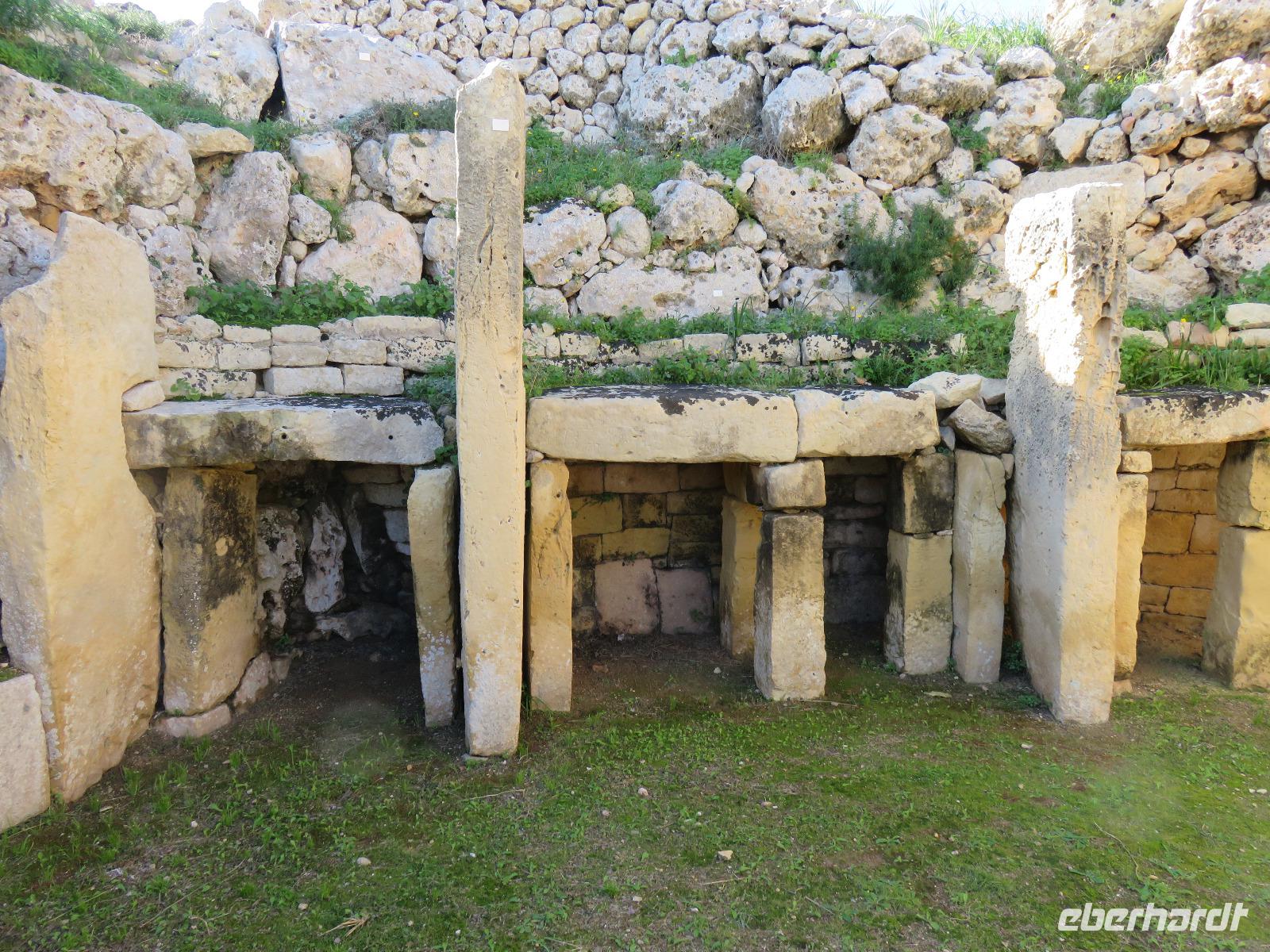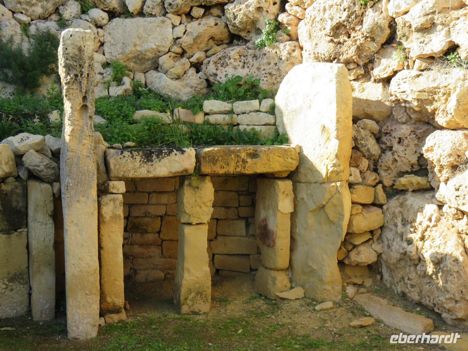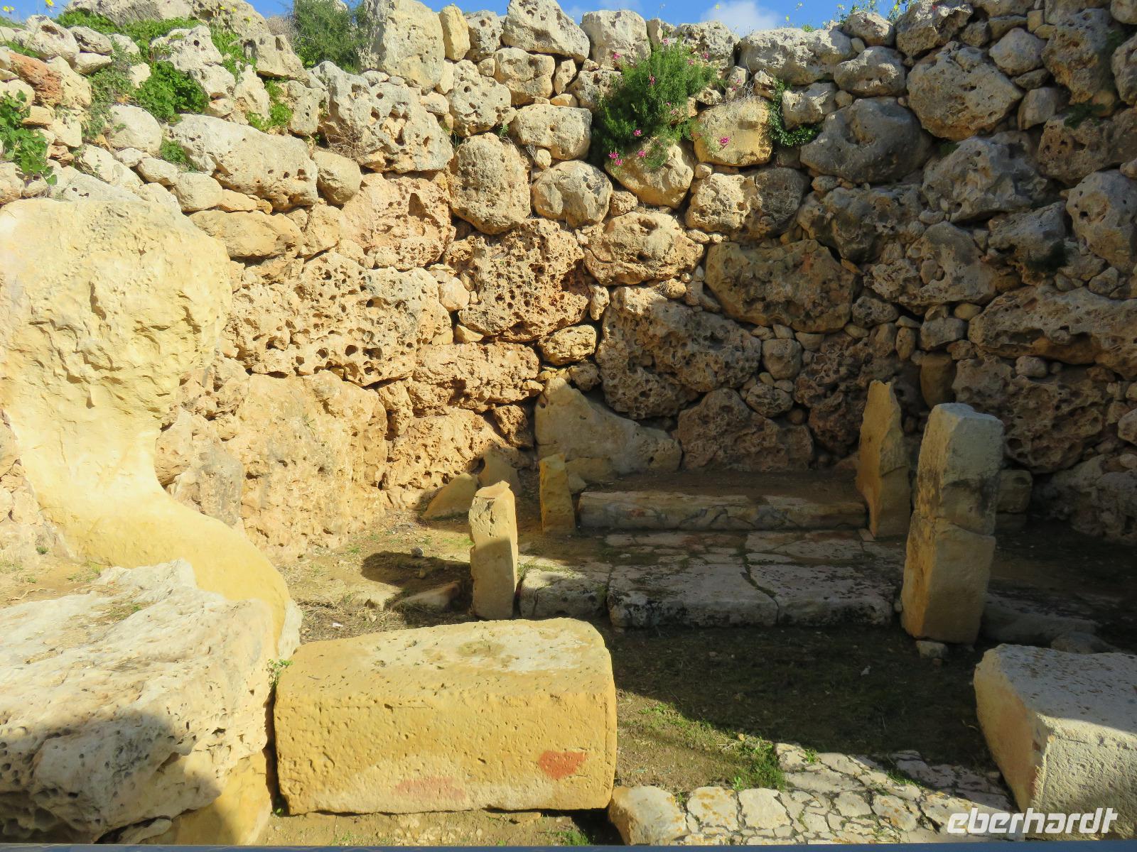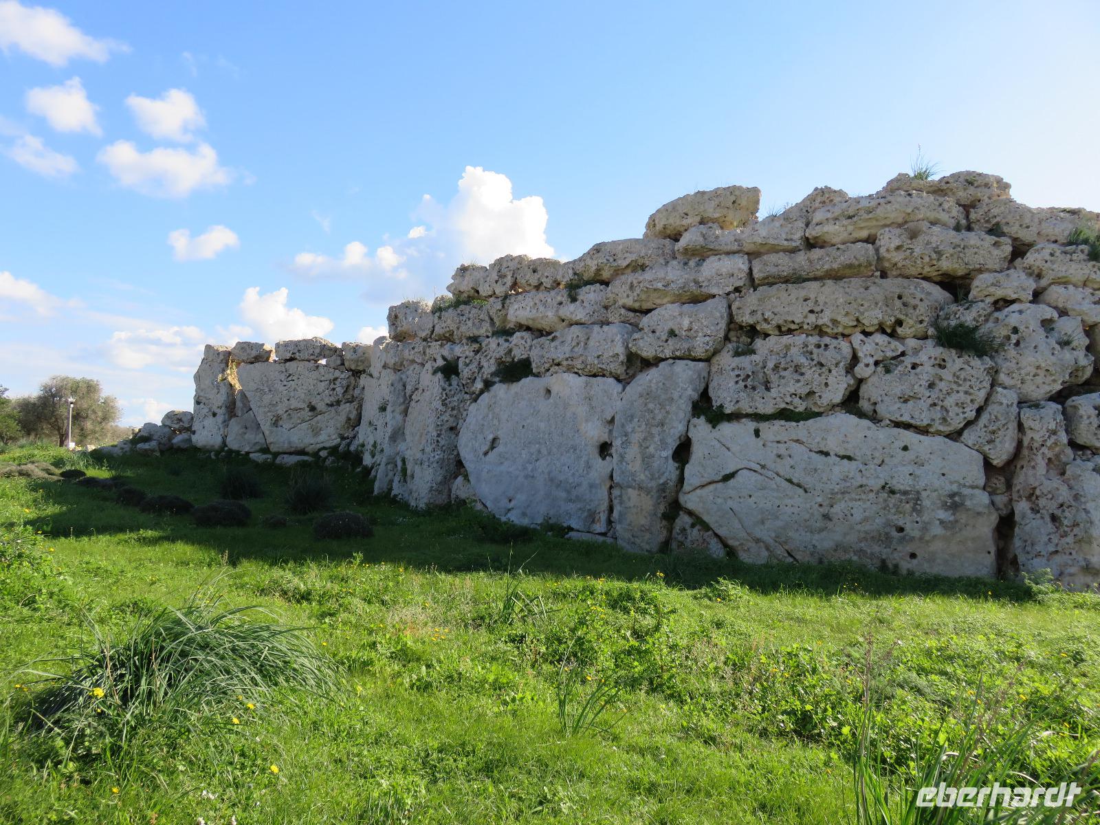 Malta, Comino und Gozo bilden eigentlich eine große Insel, seit der Eiszeit als der Wasserspiegel des Mittelmeers anstieg, ragen nur noch die Spitzen aus dem Wasser hervor und so bilden die Inseln heute den Archipel der Republik Malta. Die Erstbesiedlung soll vor ca. 5.200 Jahren von Sizilien aus erfolgt sein. Auf den Inseln entwickelte sich eine in Europa einzigartige steinzeitliche Kulturstufe mit Megalithkulturstätten. Bekannt sind heute auf Malta und Gozo rund 30 dieser Tempel. Wir wären nicht auf Malta gewesen, hätten wir nicht eine dieser Anlagen besichtigt. Und eine der schönsten und größten ist der Tempel von Ggantija, südöstlich von Xaghra, ein UNESCO-Weltkulturerbe. Zuerst besuchten wir das kleine Museum. Hier wurde Geschichte lebendig: Die Freilegung durch den britischen Inselkommandanten Otto Bayer, die Aquarelle des deutschen Malers H. von Brockdorff, der Erwerb durch das Maltesische Nationalmuseum 1933. Erst ab dort begann man mit der systematischen Erforschung. Zudem bestaunten wir alte Gefäße, Statuten - Fundstücke im Tempel. Mittels moderner Methoden hat man auch ein Abbild einer Bewohnerin erstellt. Die Legende besagt, dass eine Riesin mit ihrem Kind auf dem Arm in einer Nacht den Tempel errichtet haben soll. Tief beeindruckt lenkten wir unsere Schritte nun hinab zu den beiden Tempeln aus dem 4. Jahrhundert vor Christus. Einzigartig die Ausmaße, gewaltig die Steinblöcke ... der größte soll 5,70 Meter lang, 3,80 Meter breit und 57 Tonnen schwer sein ... kaum zu glauben. Die Mauern sollen bis zu 16 Metern hoch gewesen sein. Heute müssen sie teilweise mit Gerüsten abgestützt werden. Wir sahen die exakte Bauweise, im Inneren auch die filigrane Ausschmückung mit kunstvollen Verzierungen. Das alles mit einfachen Steinwerkzeugen! Mit Phantasie sind der Altar und die Feuerstelle zu erkennen. Es blieb etwas Zeit, auch den Nordtempel zu betrachten.