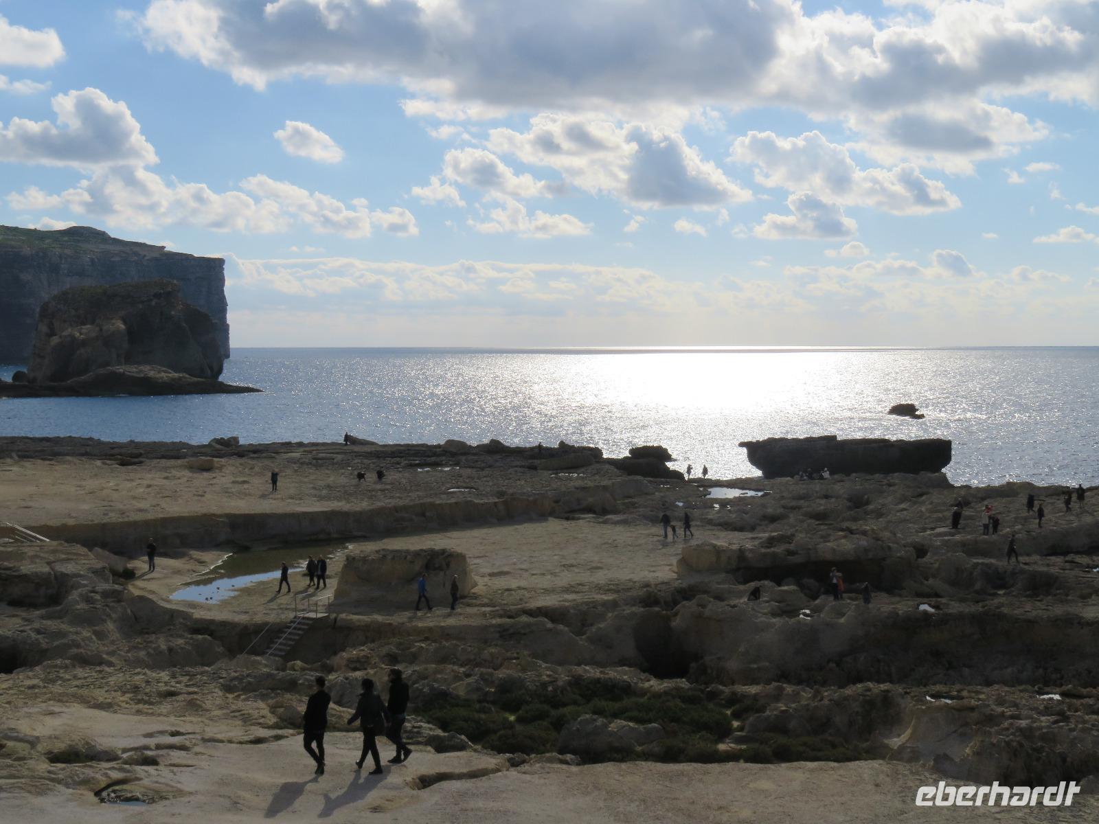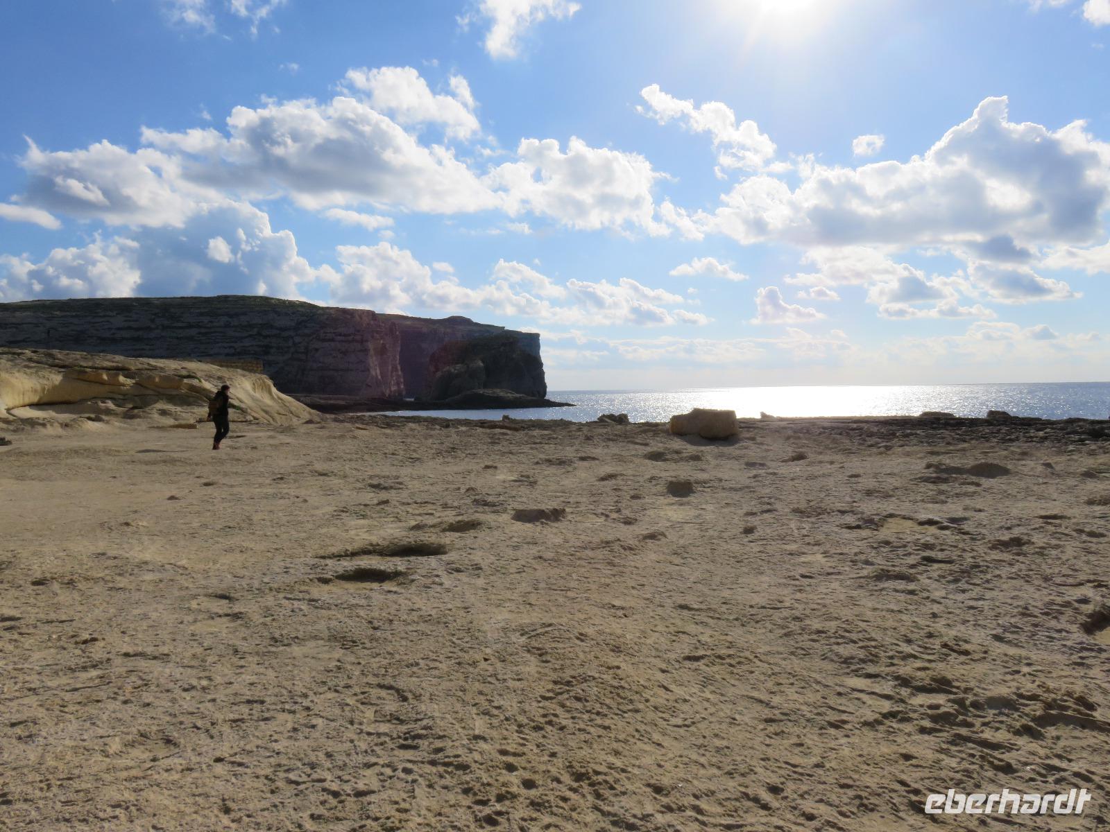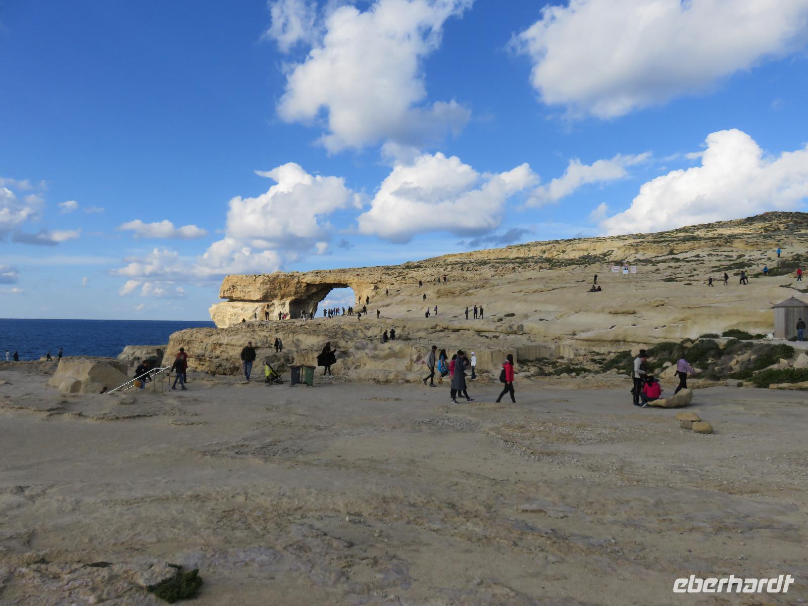 Wir wären nicht auf Gozo gewesen, wenn wir nicht das berühmte Azure Window besichtigt hätten. Also nahmen wir die Straße nach Westen und fuhren in großen Kehren zur Küste hinab, sahen in gewaltige Steinbrüche, wo der gelbe Kalkstein gebrochen wird ... Und dann erblickten wir den aus dem Wasser herausragenden Felsbogen, eine Laune der Natur, durch Wind und Wasser aus dem Kalkstein geformt. Bei strahlend blauem Himmel und ruhiger See ist auch eine Bootsfahrt durch die Grotte und den Felsbogen möglich. Wir spazierten so nah heran wie gestattet. Natürlich ist es verboten direkt dieses Wahrzeichen zu besteigen. Es soll und muss erhalten werden ... so erfreuten wir uns an diesem Anblick.