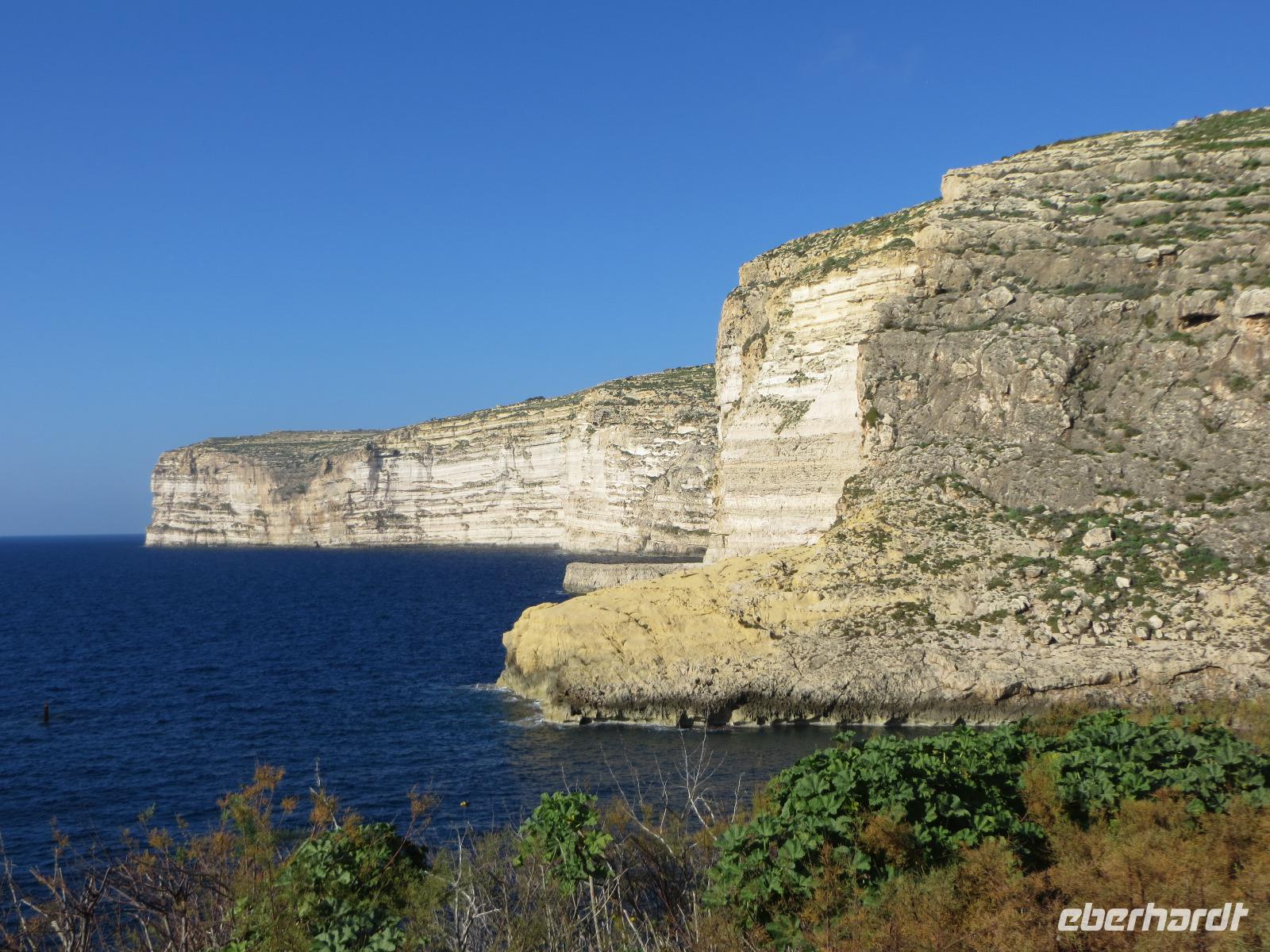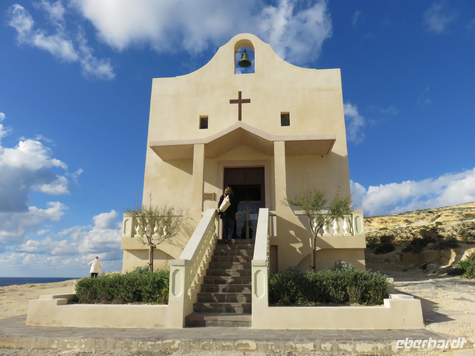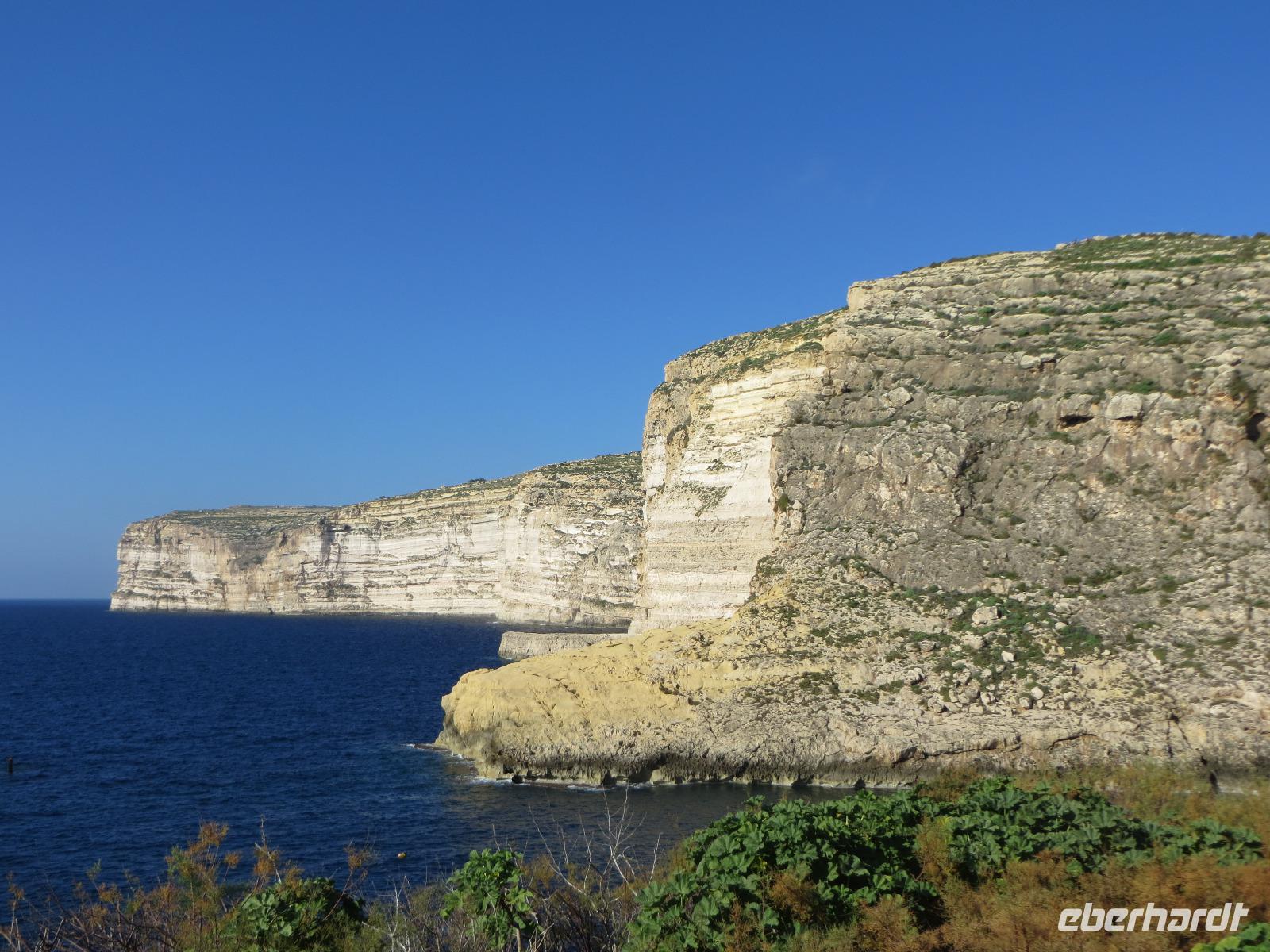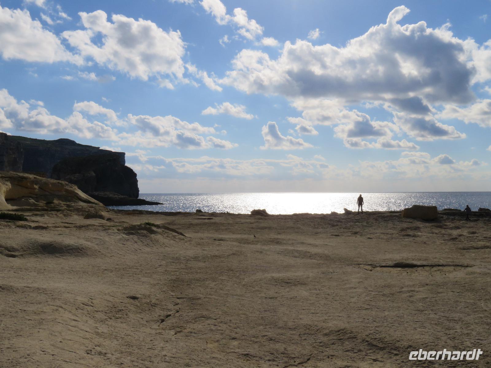 Wir wären nicht auf Gozo gewesen, wenn wir nicht das berühmte Azure Window besichtigt hätten. Also nahmen wir die Straße nach Westen und fuhren in großen Kehren zur Küste hinab, sahen in gewaltige Steinbrüche, wo der gelbe Kalkstein gebrochen wird ... Und dann erblickten wir den aus dem Wasser herausragenden Felsbogen, eine Laune der Natur, durch Wind und Wasser aus dem Kalkstein geformt. Bei strahlend blauem Himmel und ruhiger See ist auch eine Bootsfahrt durch die Grotte und den Felsbogen möglich. Wir spazierten so nah heran wie gestattet. Natürlich ist es verboten direkt dieses Wahrzeichen zu besteigen. Es soll und muss erhalten werden ... so erfreuten wir uns an diesem Anblick.