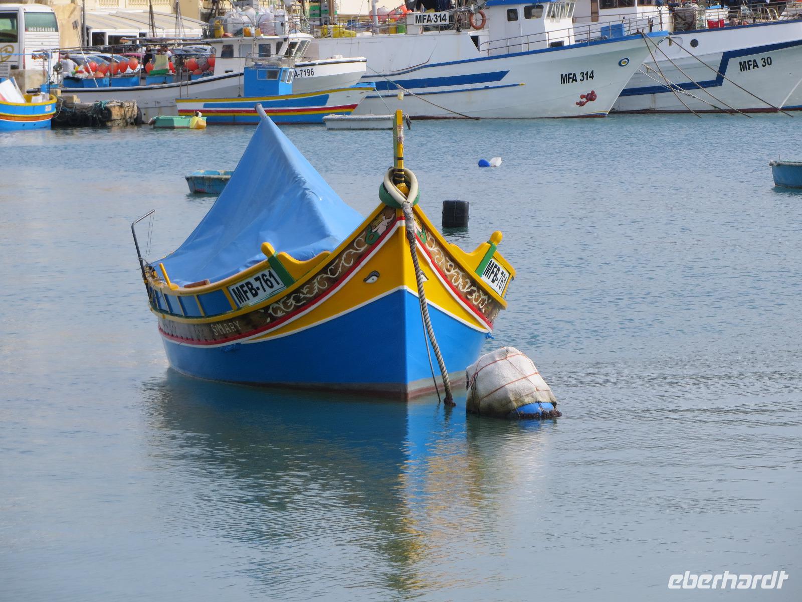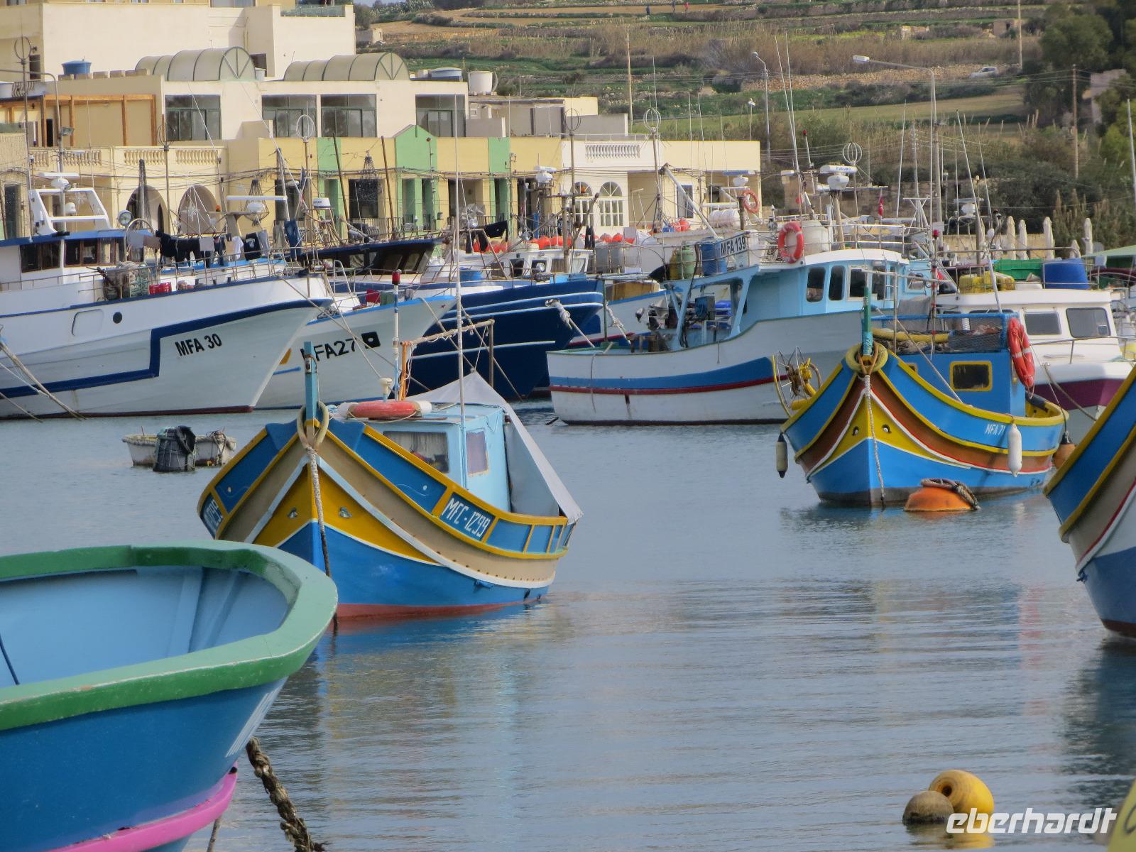 Mit dem Bus setzten wir unseren Ausflug nun in den Südosten Maltas fort. Unser Ziel ist Der Hafen des warmen Windes der kleine Ort Marsaxlokk, der sich bis heute Ursprünglichkeit bewahrt hat. Kleine maltesisches Häuschen, die Pfarrkirche Qur Lady of Pompei und der Hafen mit den bunten Fischerbooten, den Luzzi, prägen das Bild. Fast romantisch ist es, wären da nicht die gewaltigen Kraftwerks- und Hafenanlagen ... Wir hatten etwas Zeit zum Bummeln oder auch für einen Kaffee.