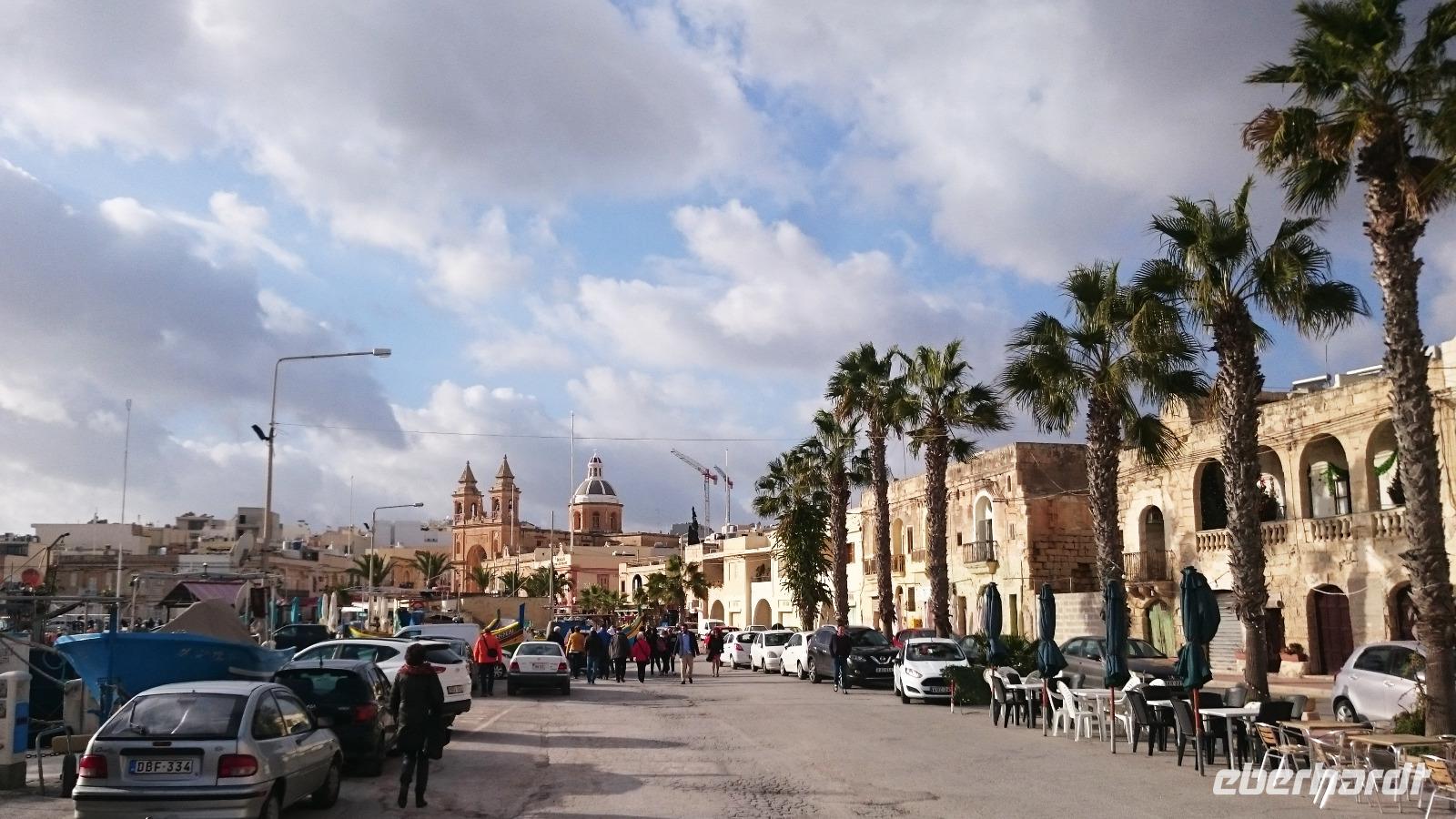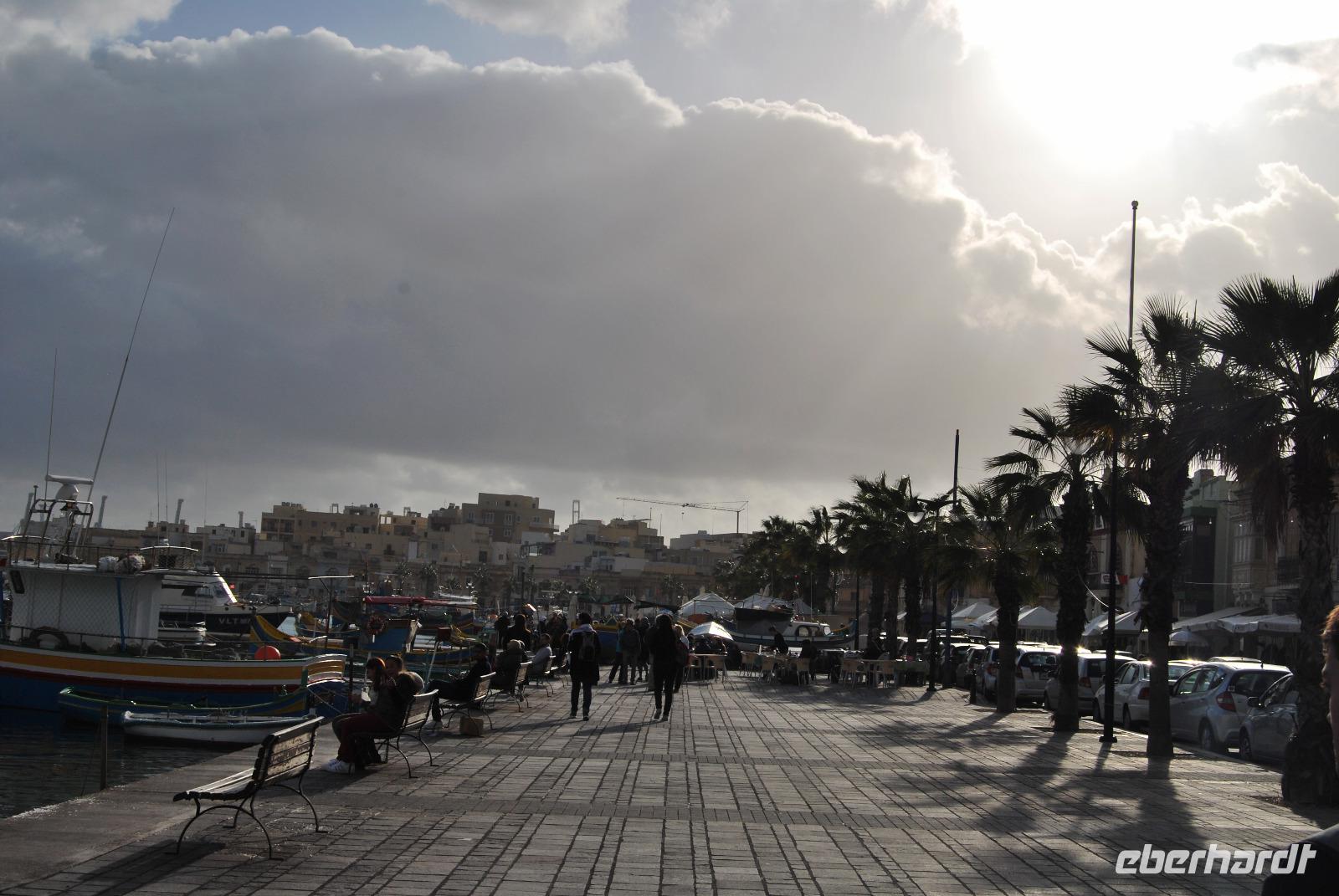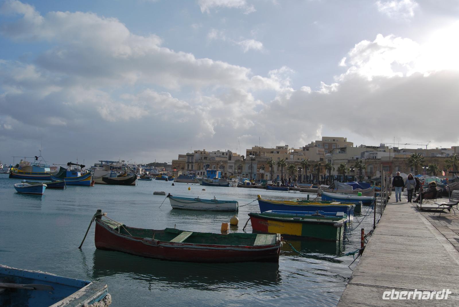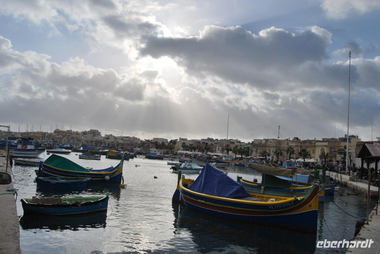 Mit dem Bus ging es nach Vittoriosa, die Vorstadt der Festung St. Angelo. Am Meeresgrund vor der Festung soll sich auch die Geschichte der Stadt befinden: zahlreiche Galeeren, Kanonen und Knochen - Überreste vergangener kriegerischer Auseinandersetzungen. Von der St. Lawrence's Kirche aus erkundeten wir die schmalen Wege. Später fuhren wir in den Osten der Insel Malta, in das Fischerdorf Marsaxlokk. Kleinere Restaurants reihen sich hier an der Hafenpromenade. Hunderte bunte Fischerboote schipperten auf dem Wasser, doch gearbeitet hat heute keiner an diesem Feiertag. Nur die Restaurants hatten geöffnet und ein paar Händler die Souvenirs verkauften. Der ideale Zeitpunkt für eine Fischsuppe - denn nun war es doch schon wieder recht frisch geworden.