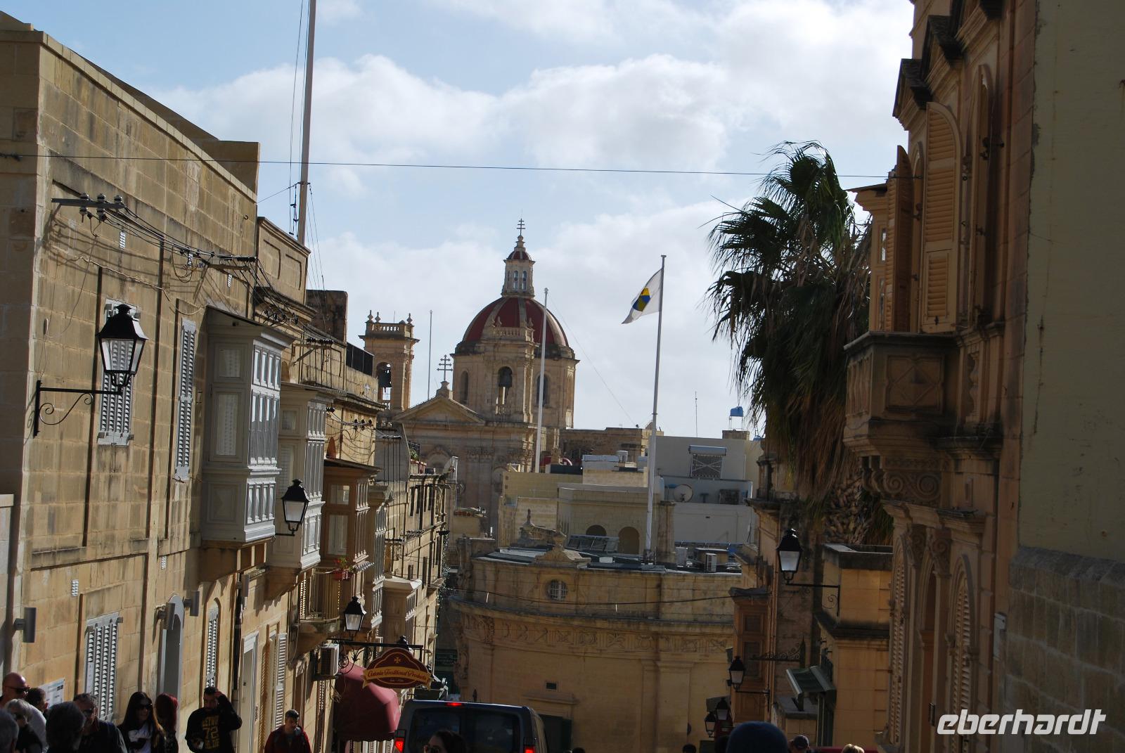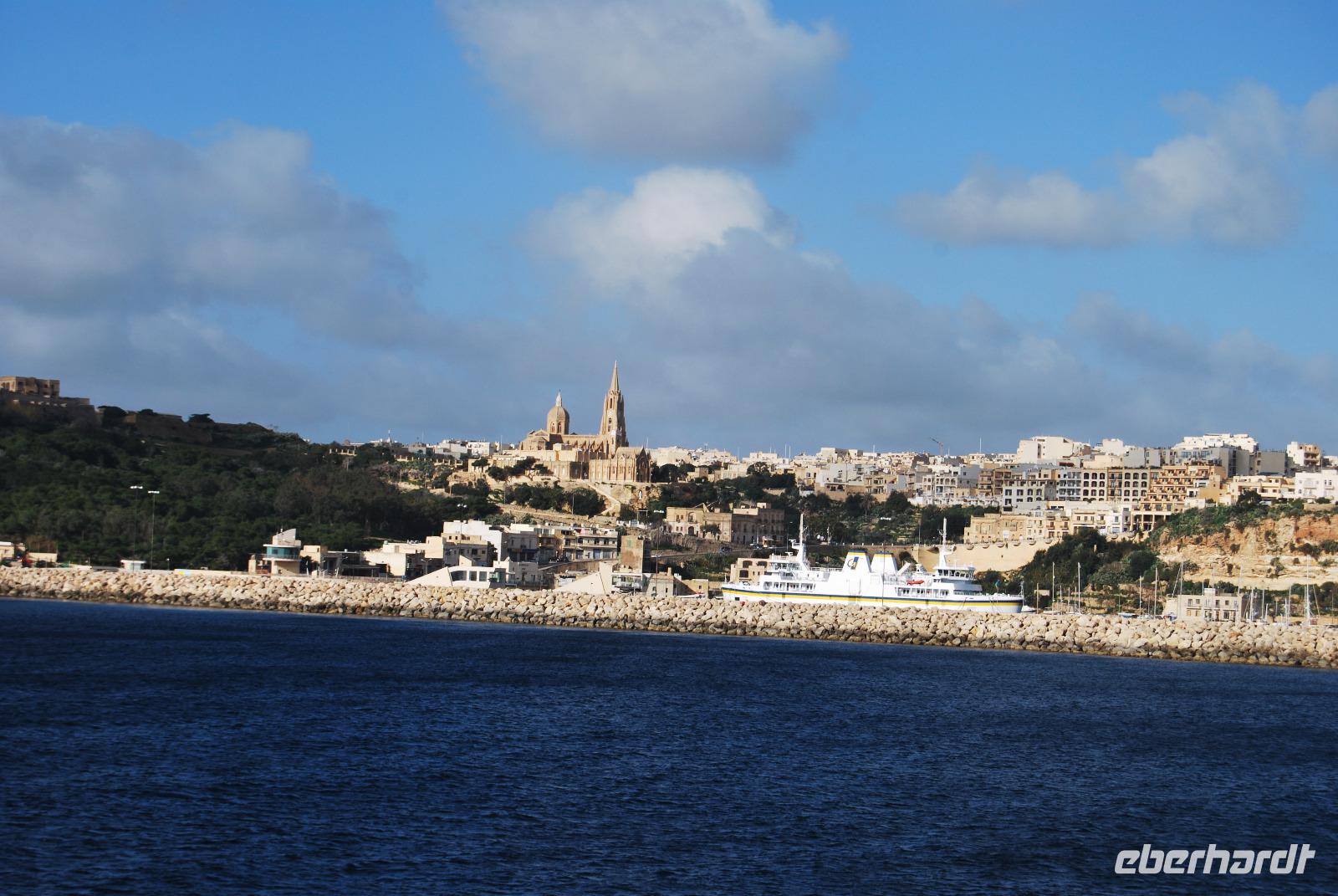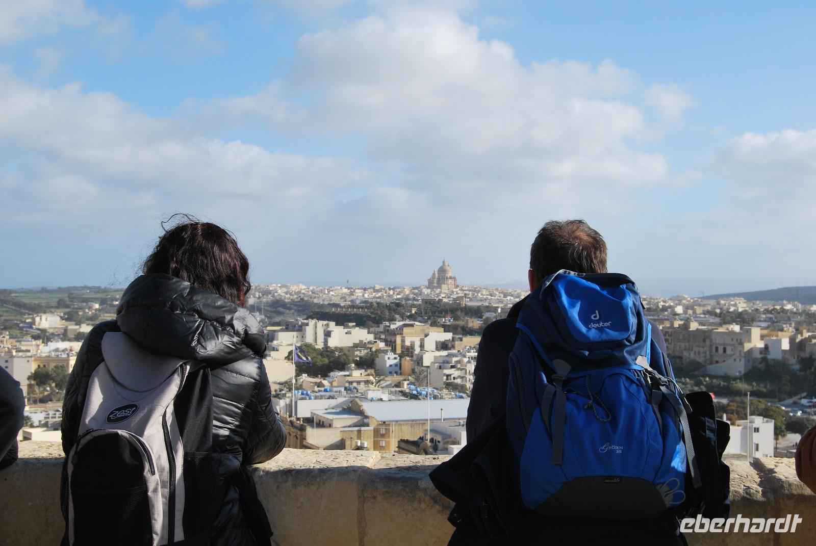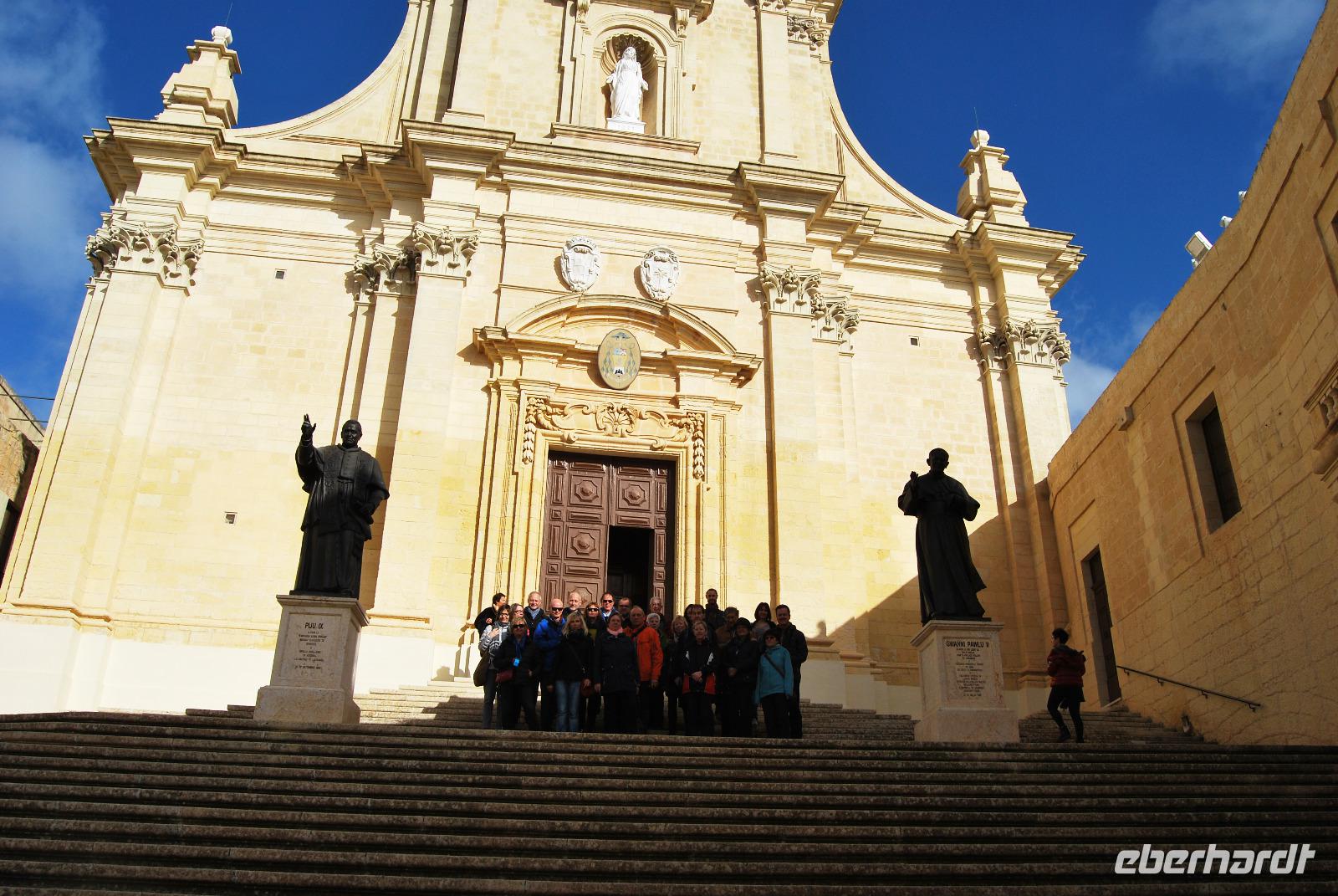 Am Morgen, nach dem Frühstück, fuhren wir nach Mellieha. Im Norden der Insel Malta wollten wir mit der Fähre zur Schwesterinsel Gozo übersetzen. Nach kurzer Wartezeit und zügiger Überfahrt legten wir in Mgarr auf Gozo an und gingen an Land. Bei der Einfahrt in den Hafen kann man zahlreiche Kirchen auf der Insel entdecken. Es sind hier die einzigen großen Gebäude und überragen die kleinen Städtchen. Aus der Ferne ein schöner Anblick, der in diesem Fall wörtlich, überragenden Glaubenszentren. Mit dem Bus geht es weiter über die Insel. Unseren ersten Fotostopp legten wir in Xlendi ein und fuhren dann zum einstigen „blauen Fenster" nach Dwejra. Steile Klippen, herrlicher Sonnenschein, wilde Brandung und ein geniales Panorama offenbarte sich uns an dieser Stelle. In diesem Ort, an einer kleinen Bucht, dem Il-Qawra, boten sich ein paar bunte Bootshäuser als Motiv für ein Gruppenfoto. Bei der Fahrt über die Insel sahen wir immer wieder zahlreich Kirchen, wie zum Beispiel die Basilika Ta' Pinu, die eindrucksvoll, inmitten ein paar Feldern steht. In dem Örtchen Marsalfron machten wir unsere Mittagspause. Im Restaurant Il-Kartell konnten wir direkt an der Bucht speisen. Am Nachmittag besuchen wir noch das städtische Zentrum der Insel - Victoria. In Victoria stiegen wir an der Pjazza St. Wistin aus und spazierten durch die Gassen bis zur barocken St. George's Basilika aus dem 17. Jahrhundert. Von dort ging es einen steilen Berg hinauf zur Zitadelle von Gozo, in deren Inneren man die Mariä-Himmelfahrt-Kathedrale und den Bischofsplatz des Bistums Gozo findet. Zum einen ist die gesamte Zitadelle schön anzusehen, was auch daran liegt, dass das Bauwerk aus dem 13. Jahrhundert vor wenigen Jahren restauriert wurde, zum anderen hat man von dort oben aber auch einen guten Blick über ganz Victoria und Gozo.