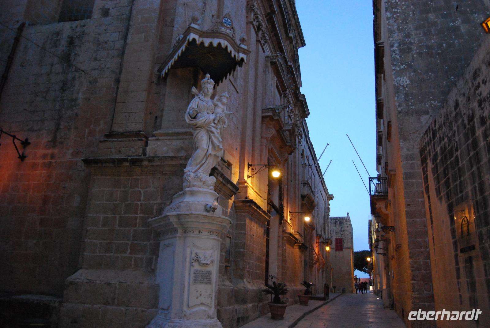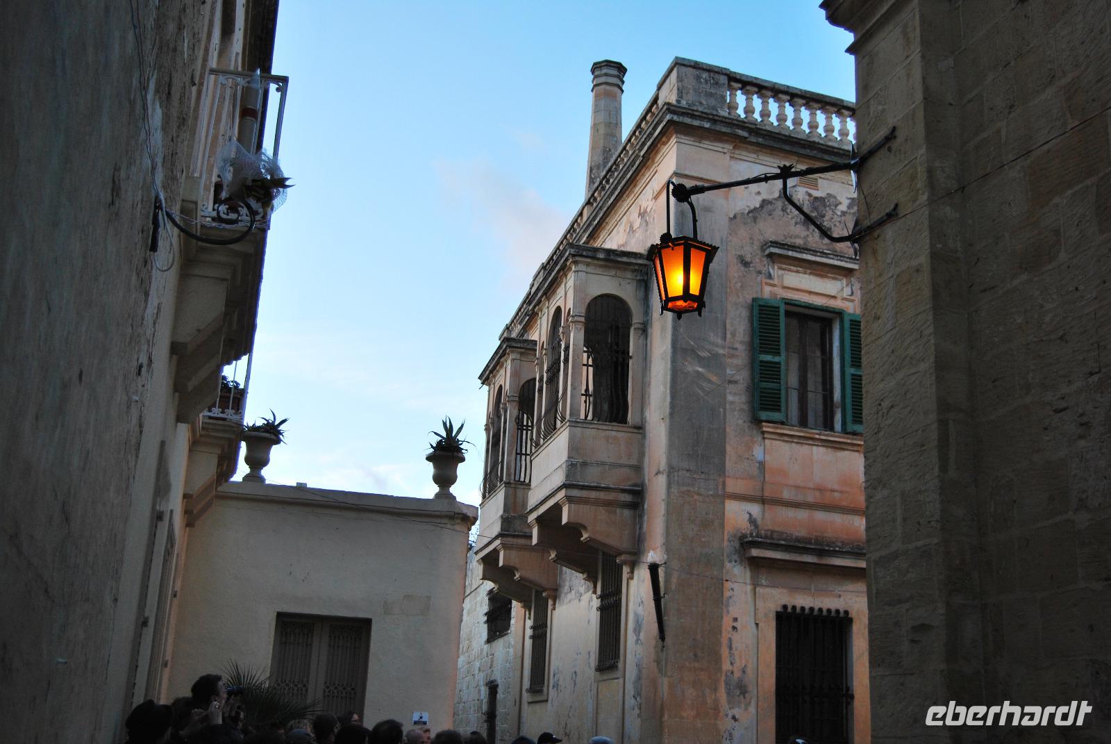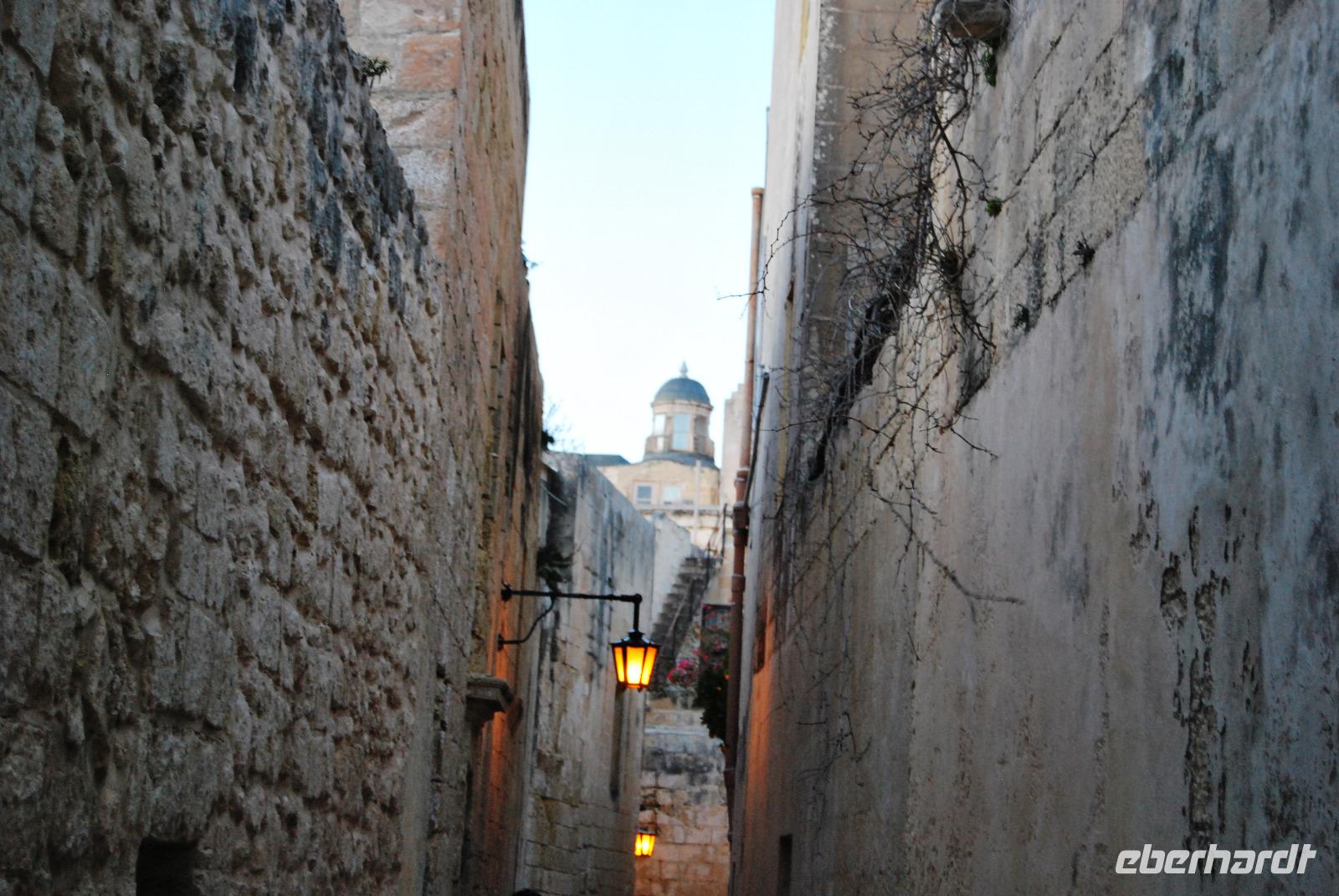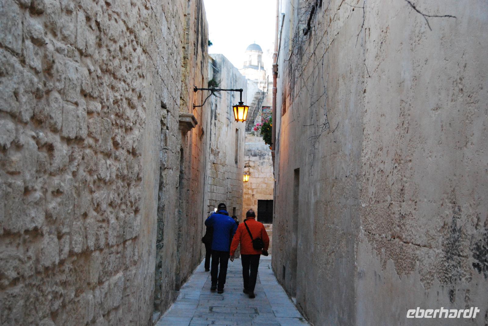 Noch nicht genug der Besichtigungen - die letzte Station: Mdina. Die von Mauern umgebene Stadt, was der Name übersetzt bedeutet, hat ihren Ursprung schon in der Bronzezeit. Die Phönizier bauten sie als Festung aus, hinzu kamen weitere Erweiterungen durch die Römer, Araber, Normannen und der Johanniter in den folgenden Epochen. Die schmalen, urigen Gassen begeistern uns. Es herrscht wirklich ein gemütliches Ambiente in den sehr schmalen Gassen der Ritter-Stadt. Die Dunkelheit bricht langsam über uns herein. Die Gassen sind mit alten Laternen, mit rot-gelbem Licht, beleuchtet. Der Mond scheint über uns, als wir die engen Gänge verlassen.