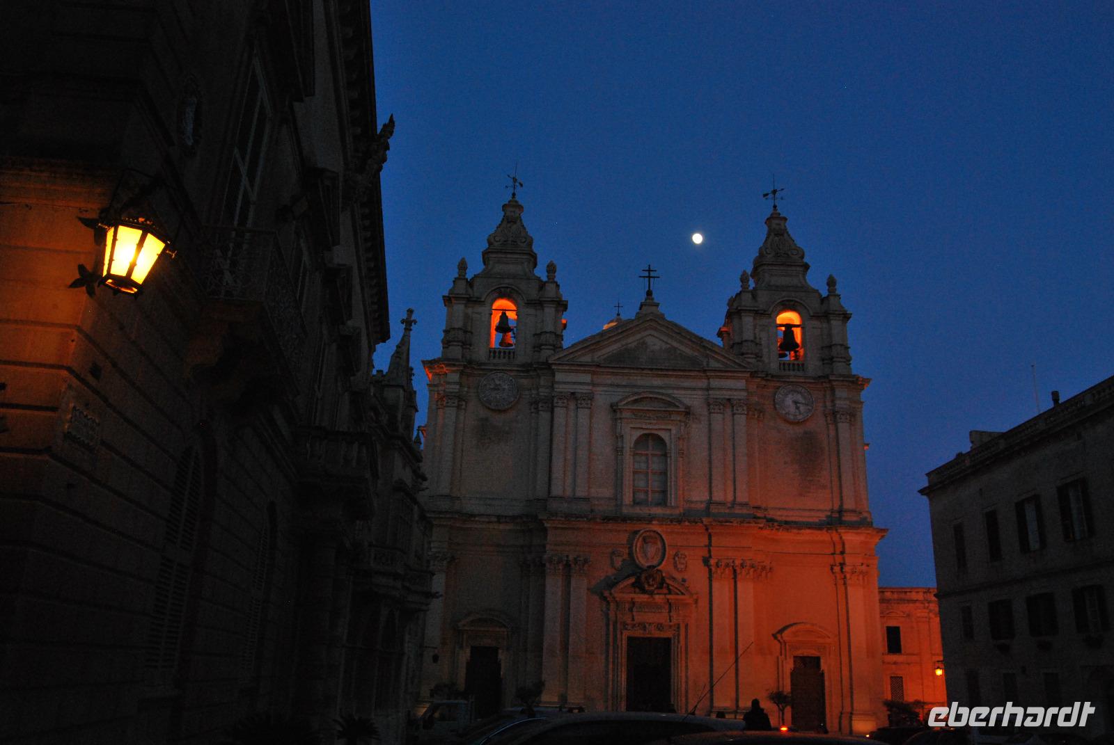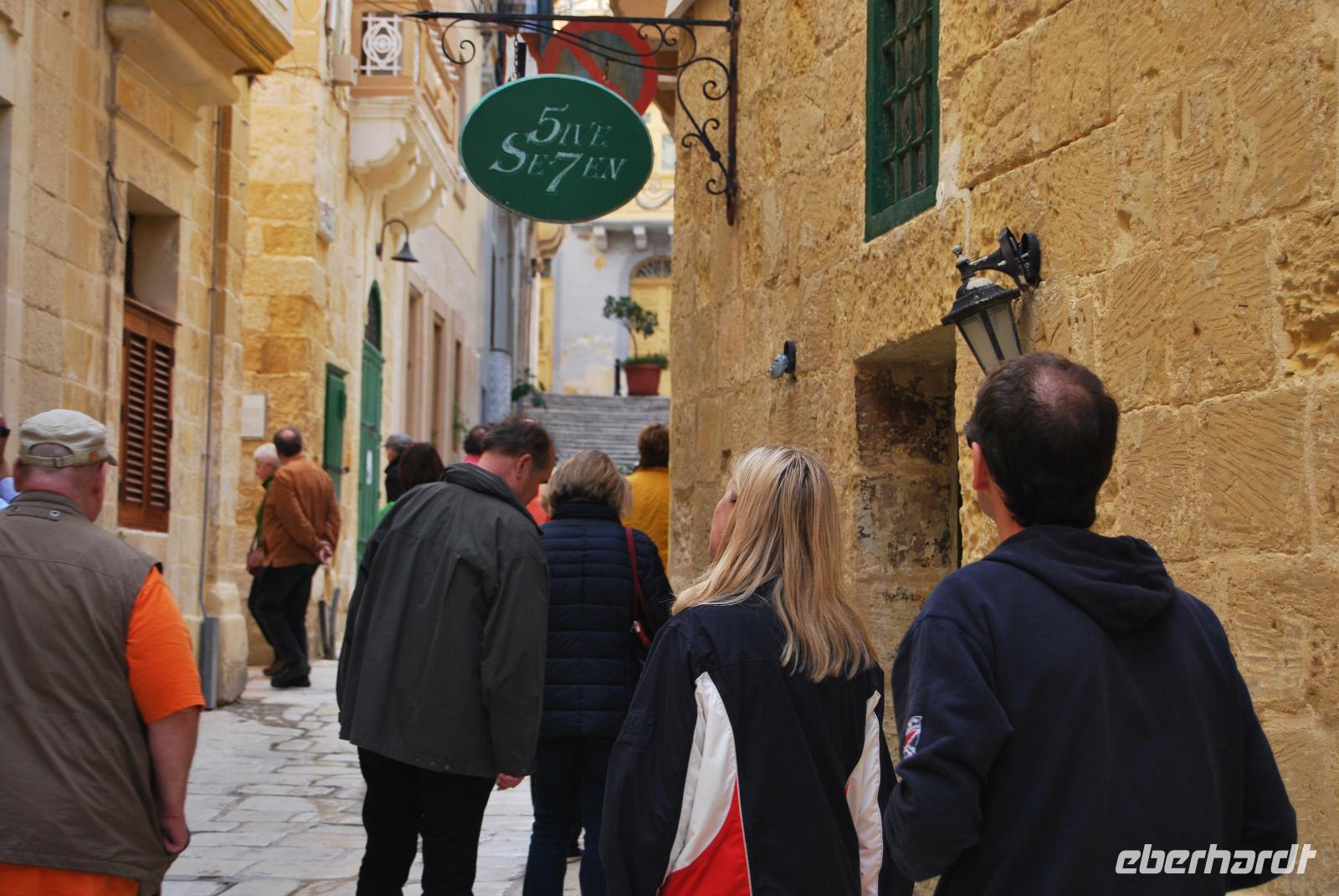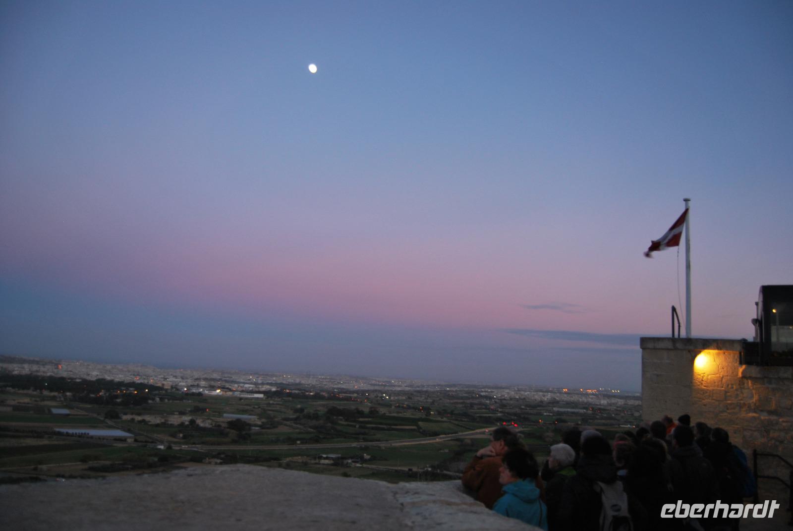 Noch nicht genug der Besichtigungen - die letzte Station: Mdina. Die von Mauern umgebene Stadt, was der Name übersetzt bedeutet, hat ihren Ursprung schon in der Bronzezeit. Die Phönizier bauten sie als Festung aus, hinzu kamen weitere Erweiterungen durch die Römer, Araber, Normannen und der Johanniter in den folgenden Epochen. Die schmalen, urigen Gassen begeistern uns. Es herrscht wirklich ein gemütliches Ambiente in den sehr schmalen Gassen der Ritter-Stadt. Die Dunkelheit bricht langsam über uns herein. Die Gassen sind mit alten Laternen, mit rot-gelbem Licht, beleuchtet. Der Mond scheint über uns, als wir die engen Gänge verlassen.