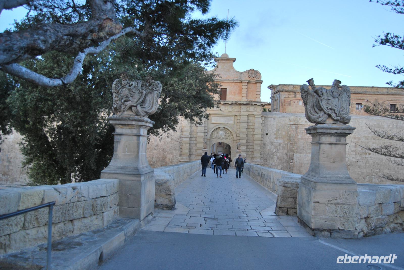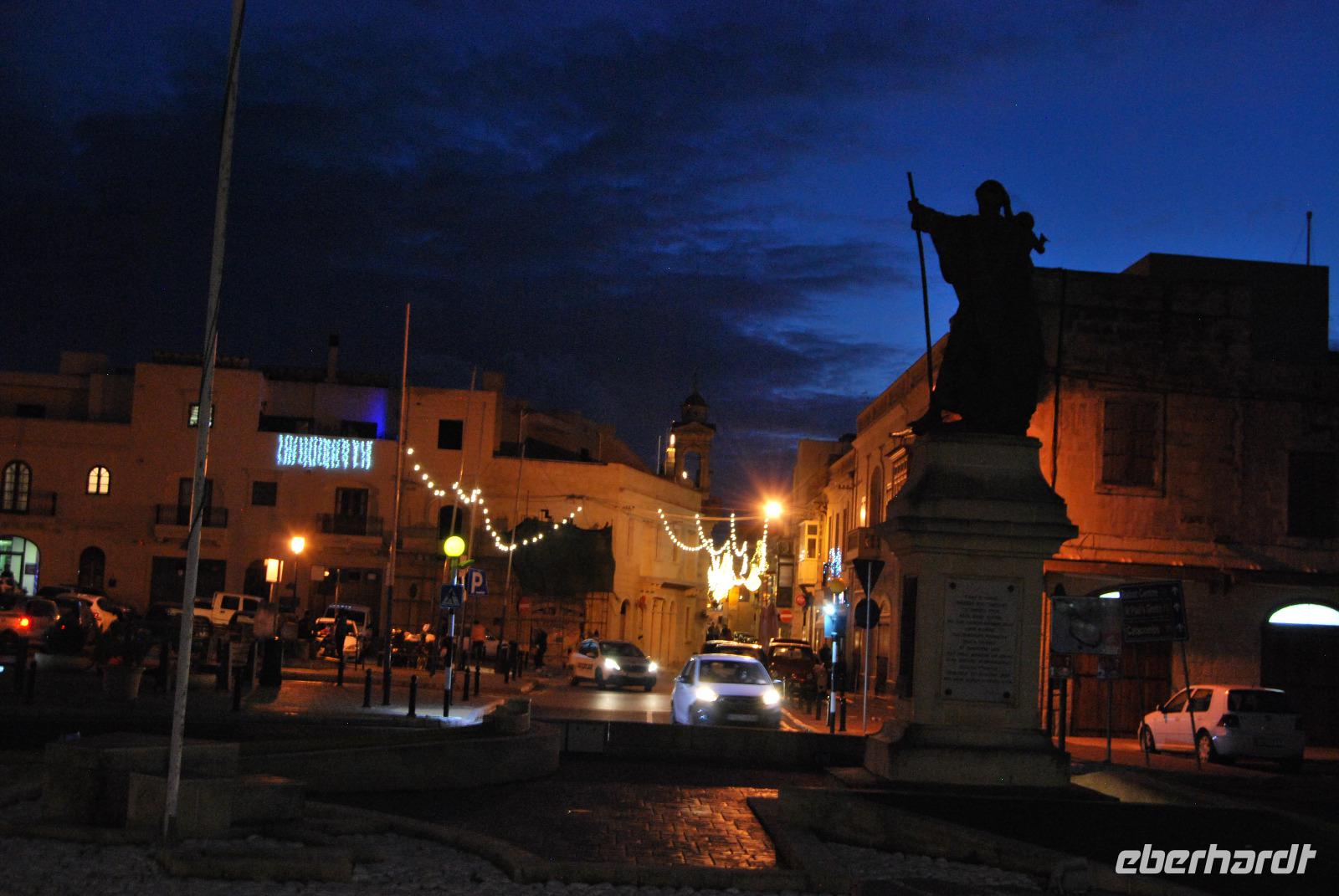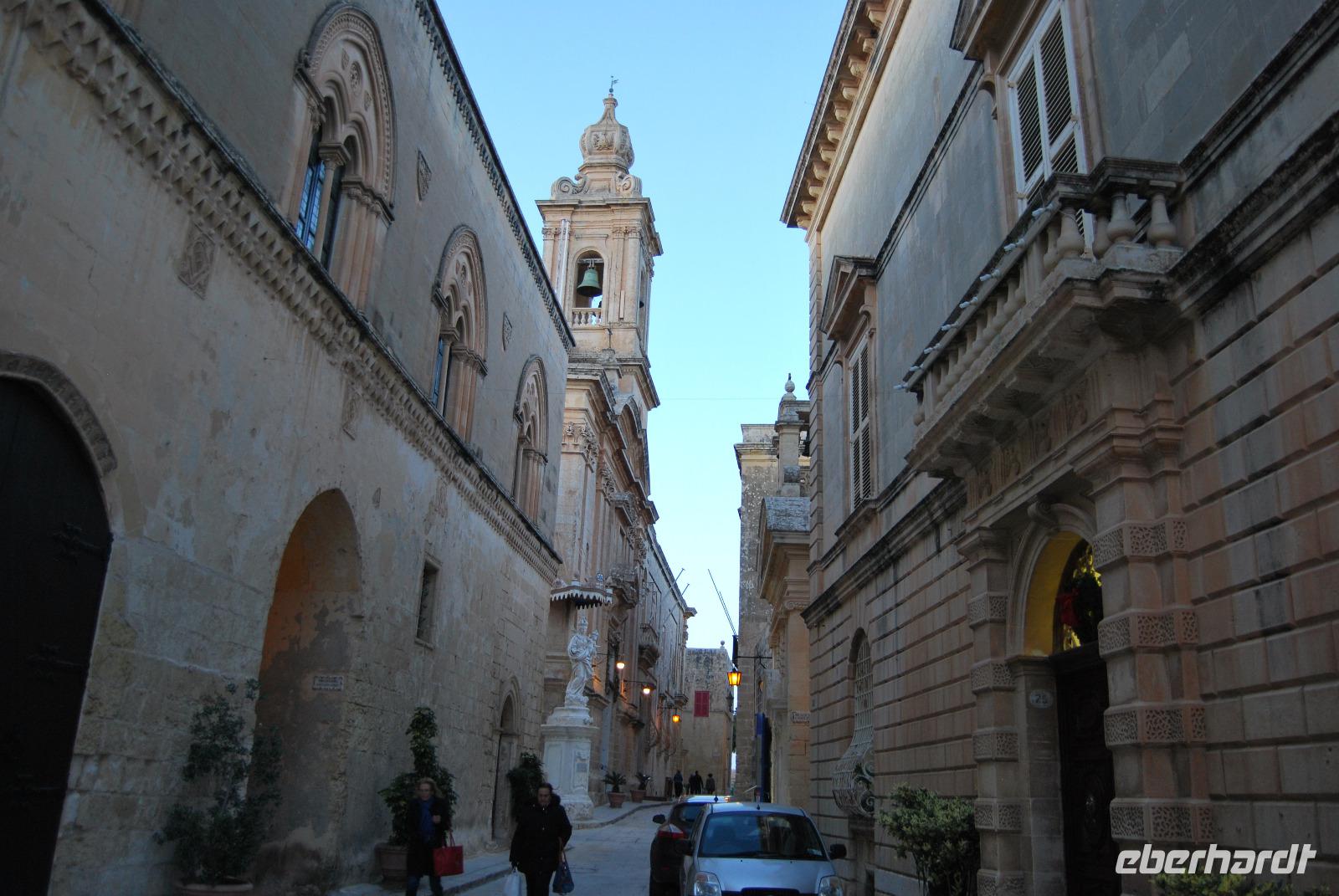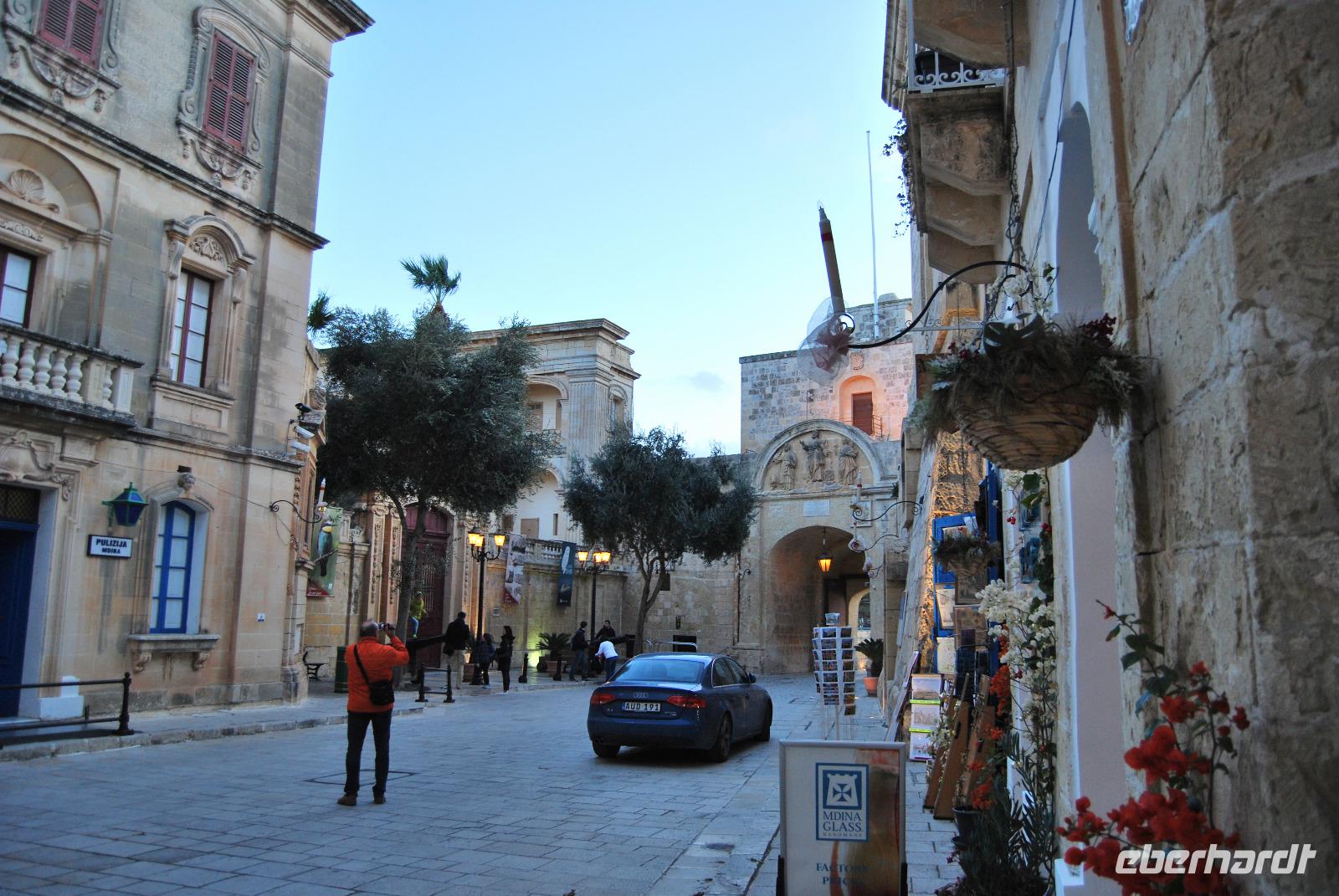 Noch nicht genug der Besichtigungen - die letzte Station: Mdina. Die von Mauern umgebene Stadt, was der Name übersetzt bedeutet, hat ihren Ursprung schon in der Bronzezeit. Die Phönizier bauten sie als Festung aus, hinzu kamen weitere Erweiterungen durch die Römer, Araber, Normannen und der Johanniter in den folgenden Epochen. Die schmalen, urigen Gassen begeistern uns. Es herrscht wirklich ein gemütliches Ambiente in den sehr schmalen Gassen der Ritter-Stadt. Die Dunkelheit bricht langsam über uns herein. Die Gassen sind mit alten Laternen, mit rot-gelbem Licht, beleuchtet. Der Mond scheint über uns, als wir die engen Gänge verlassen.