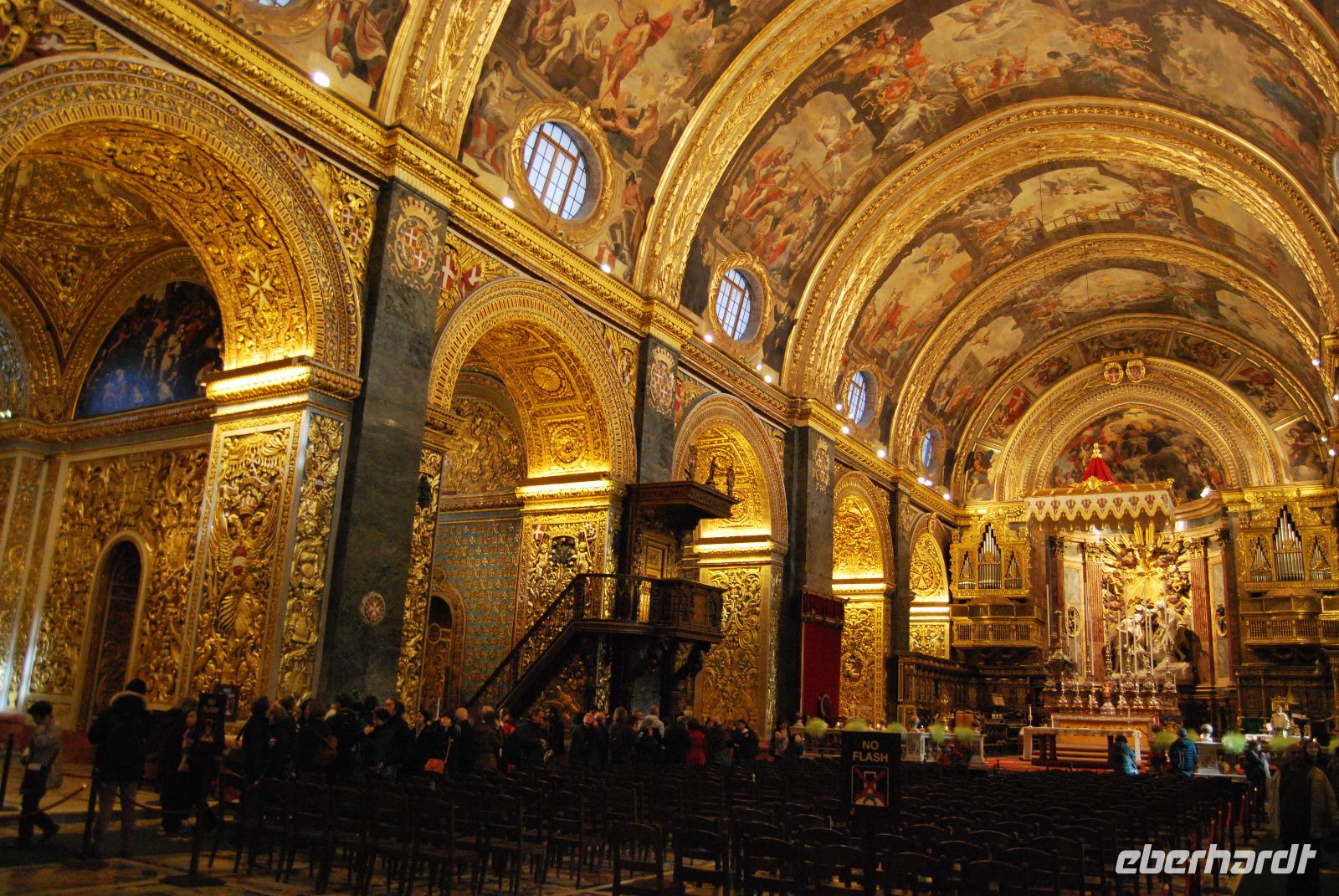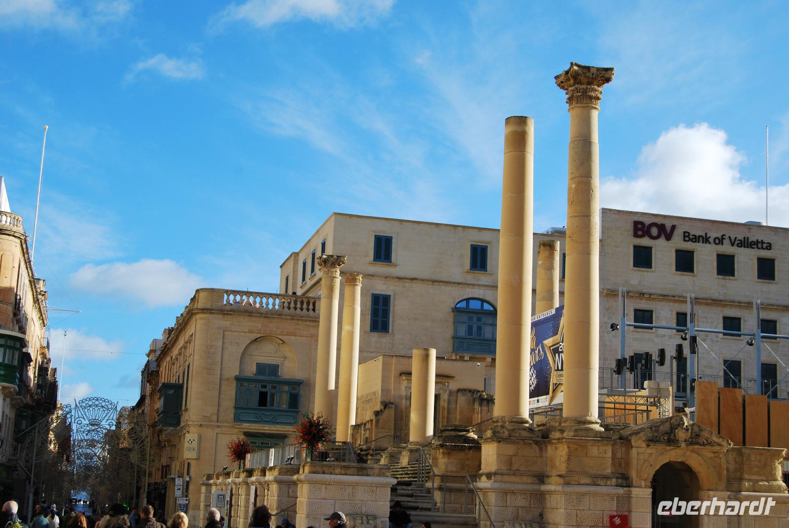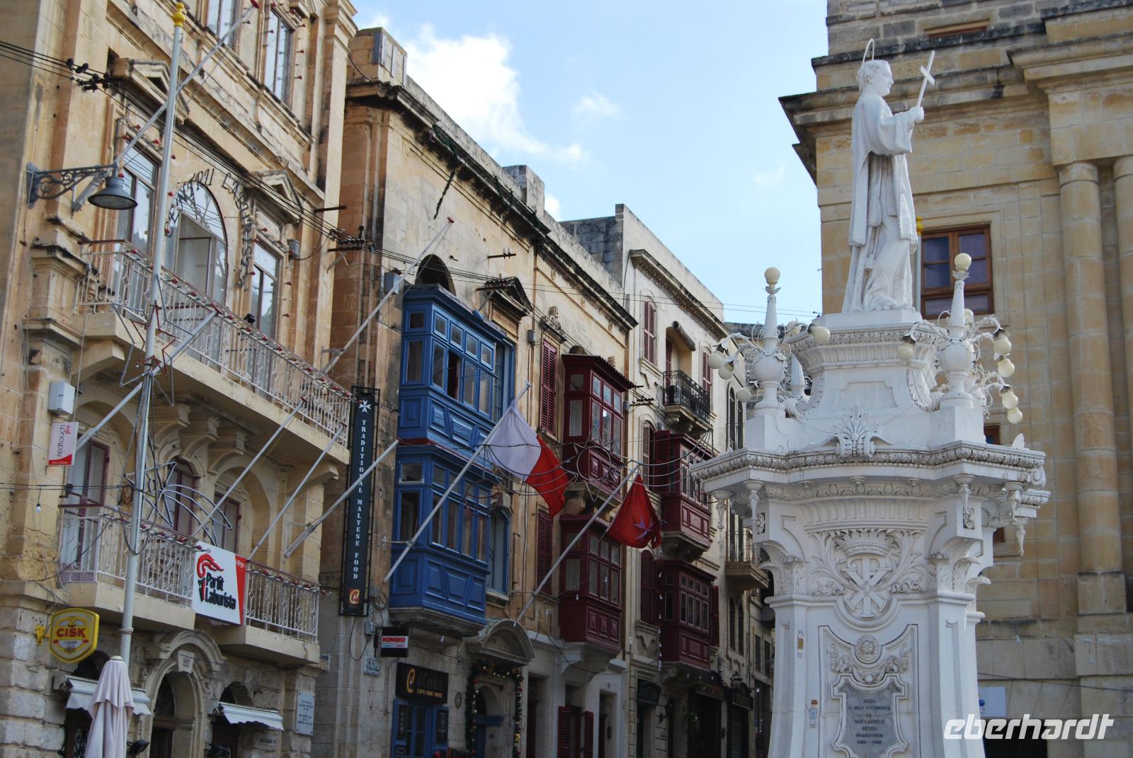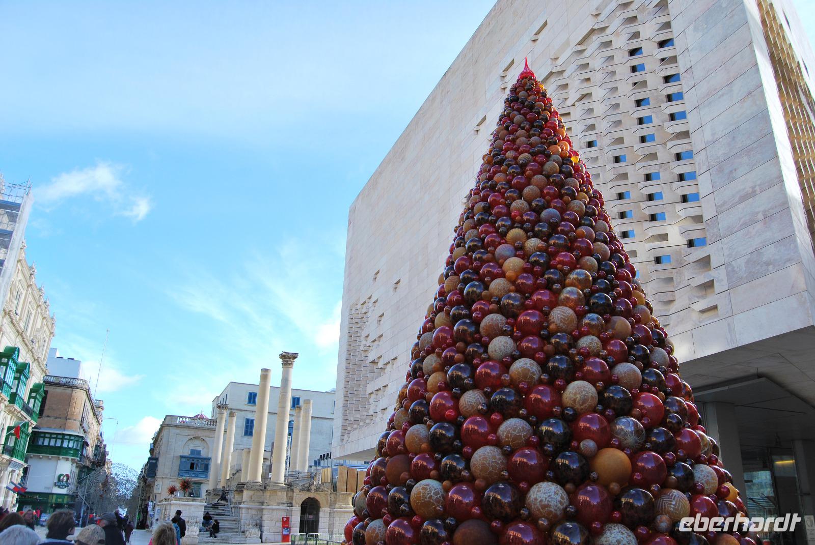 Nach einem ausgiebigen Frühstücks-Buffet mit Sonnenschein und Blick über die Bucht und Manoel Island begannen wir unsere Stadtrundfahrt. Mit Rita, unserer örtlichen Reiseleiterin, fuhren wir Richtung Valletta. Vor den Toren der Altstadt, an der Kirche St. Publius und dem alten Kornspeicher Pjazza San Publju, stiegen wir aus. Ein Foto an der Unabhängigkeitsstatue, die als Denkmal des 21.09.1964 steht, schlenderten wir am Tritonenbrunnen vorbei, der direkt vor den massiven Stadttoren steht. Beim Betreten von Valletta fällt gleich noch der Weihnachtsschmuck auf. Eine Straße mit vielen Lichtern und Bögen geschmückt. Auch eine kleine Attraktion: Der knapp sieben Meter hohe Weihnachtsbaum aus über 2.000 handgefertigten Glaskugeln. Wir umrundeten das Königliche Opernhaus, gingen bis zur katholischen Kirche St. Catherine von Italien und kamen zum St John's Square, wo wir die berühmte St. John's Co-Cathedral erblickten. Von außen wahrlich schlicht - doch beim Betreten des Gotteshauses macht man große Augen. Goldene Verzierungen und Ornamente soweit man gucken kann. Anstatt Seitenschiffen findet man in dieser Kirche zahlreiche Kapellen, die je einer Fraktion aus dem einstigen Malteser-Ordnen zugeordnet sind. So spiegelt auch das Emblem des Ordens, das Malteserkreuz, mit jedem Zacken eine Fraktion der Mittelalterlichen EU wieder. Auf dem Boden zahlreiche Intarsien-Marmor-Gräber, wo eines kunstvoller und bemerkenswerter ist als das andere. Ganz besonders faszinierend fand ich die Deckenbemalung. Ein meisterlicher Pinselstrich, wo die einzelnen Figuren tatsächlich aus dem Gemälde herauszuragen scheinen, hervorgerufen durch geniale Illusionen von Schatten und Lichtern, die teilweise aus dem eigentlichen Bilderrahmen ragen. Und wo wir gerade bei Malerei sind: eine berühmte Reliquie, die sich in der Kirche befindet, ist das Gemälde von Caravaggio - Die Enthauptung Johannes des Täufers von 1608. Nach dieser eindrucksvollen Malteser-Kathedrale wollten wir eigentlich den Großmeister Palast besichtigen, doch leider kam uns die Regierung zuvor und sperrte das Gebäude kurzfristig. Wir entschlossen uns spontan zu einer Café-Pause gegenüber der Nationalbibliothek von Malta und besuchten anschließend das archäologische Museum, wo uns Rita schon mal auf den Hagar Qim einstimmte. Artefakte, Kunst, Schmuck und Skulpturen aus dem Jahre 4.000 - 2.500 vor Christus konnten wir dort besichtigen. Dann ging es zum großen Hafen von Valletta. Über den Barrakka-Garten, wo wir eine herrliche Sicht über den Hafen und die drei alten Städte hatten - Vittoriosa, Senglea und Cospicua, kamen wir zur Waterfront Valletta. Gut eine Stunde ging die Hafenrundfahrt, in der wir so ziemlich jeden „Finger" der natürlichen Hafenanlage besuchten. Das war schon mal ein kleiner Vorgeschmack auf übermorgen, wo wir noch einmal Vittoriosa besuchten.
