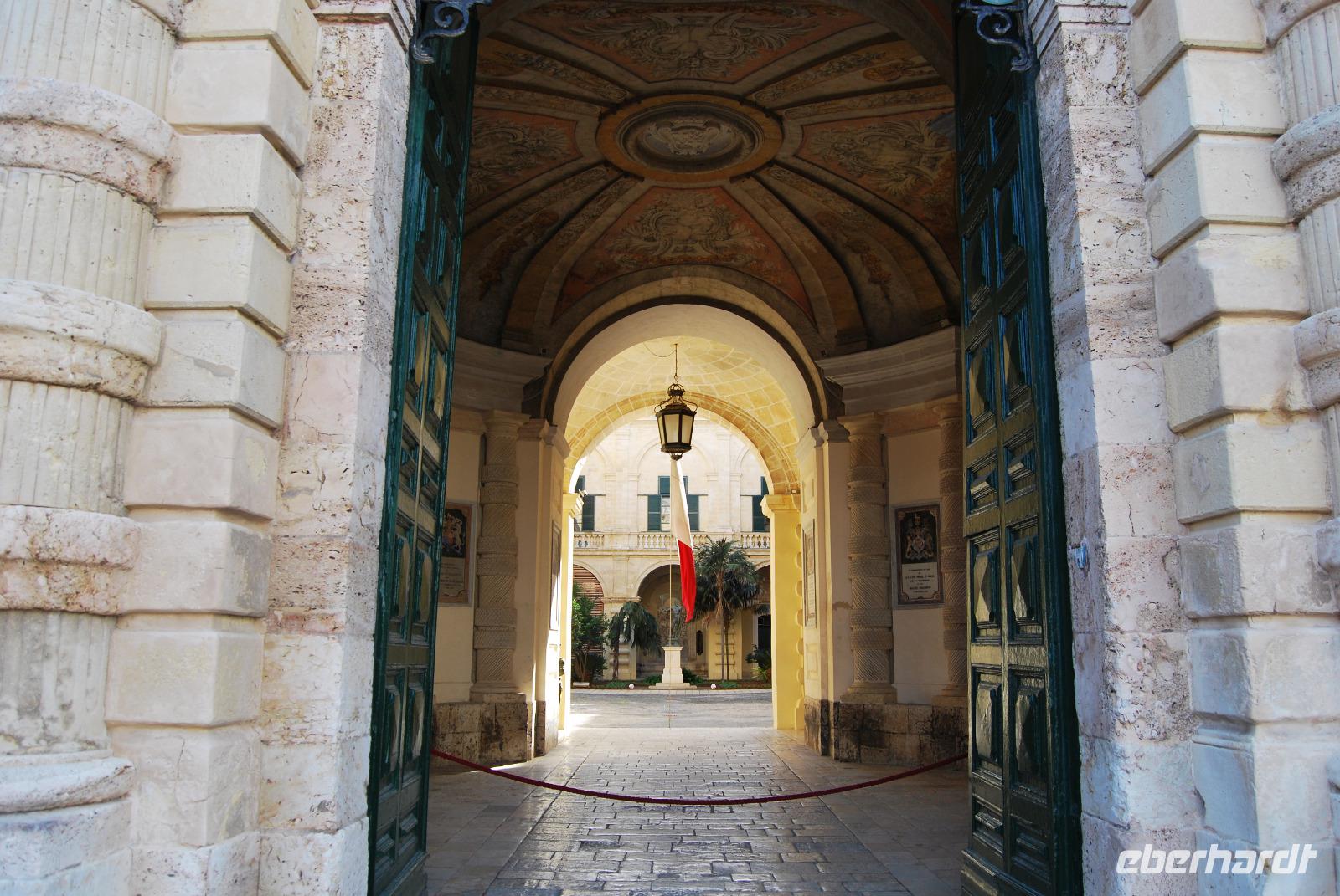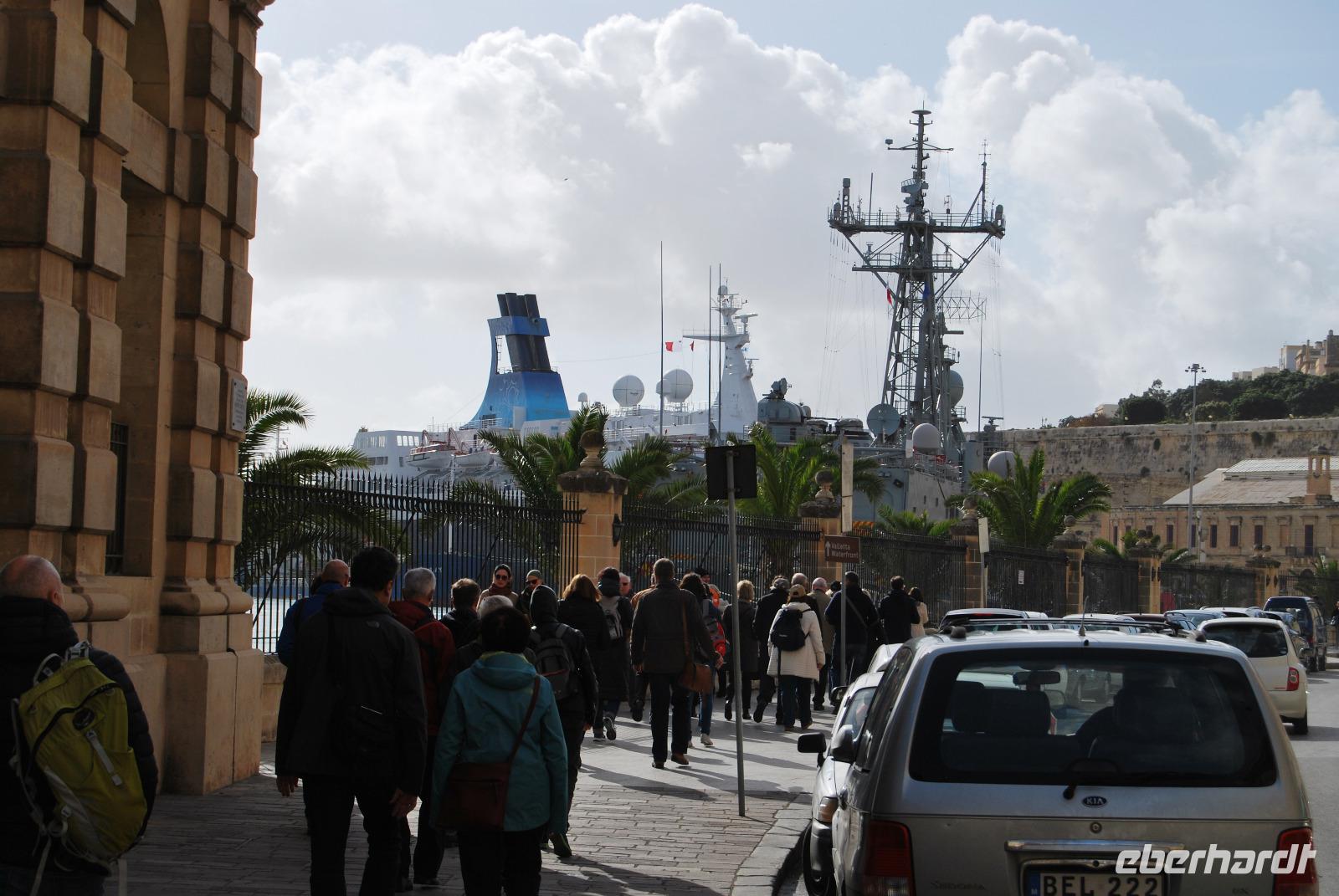 Nachdem wir wieder an der Waterfront Valletta anlegten, genossen wir ein wenig Freizeit und ein äußerst schmackhaftes Mittagessen in der wärmenden Sonne. Die Valletta Waterfront ist übrigens ein alter Lagerhaus-Komplex aus dem 18. Jahrhundert, ein Sandsteingebäude deren bunte Türen ein farbenfrohes Bild schaffen - jede Farbe hatte damals eine Bedeutung; beispielsweise Gelb für Getreide oder Rot für Fleisch.