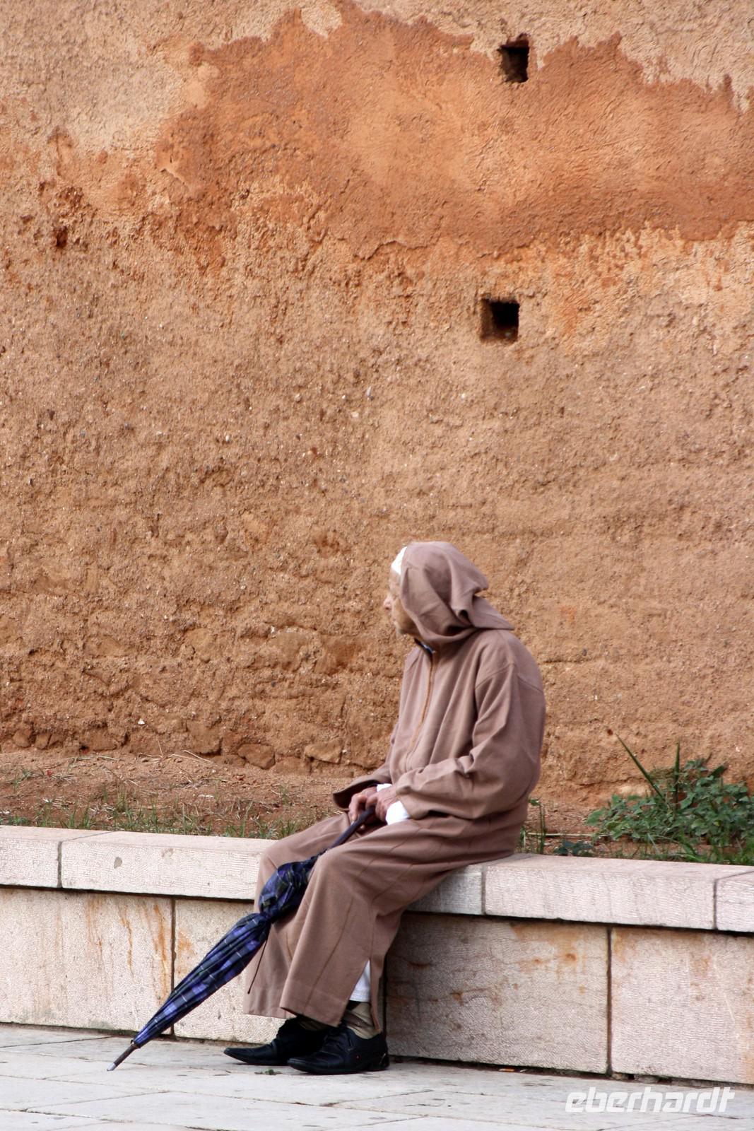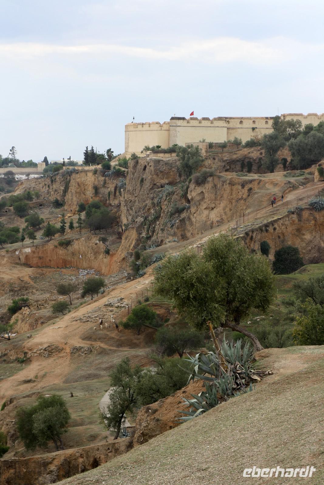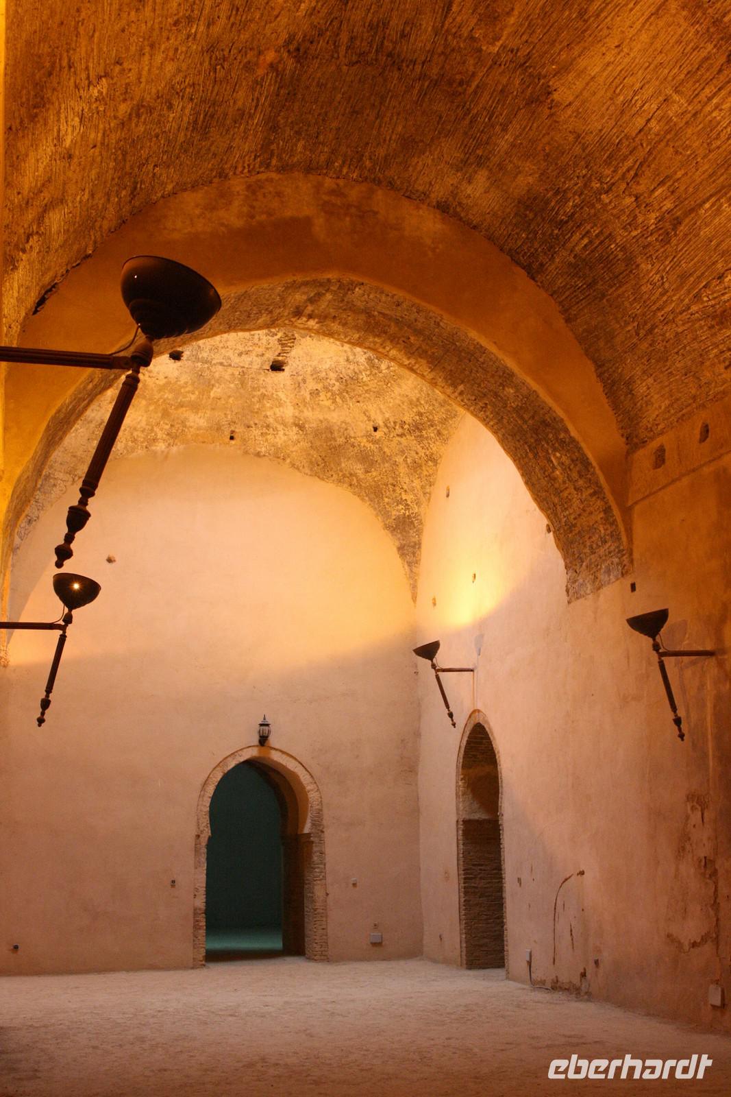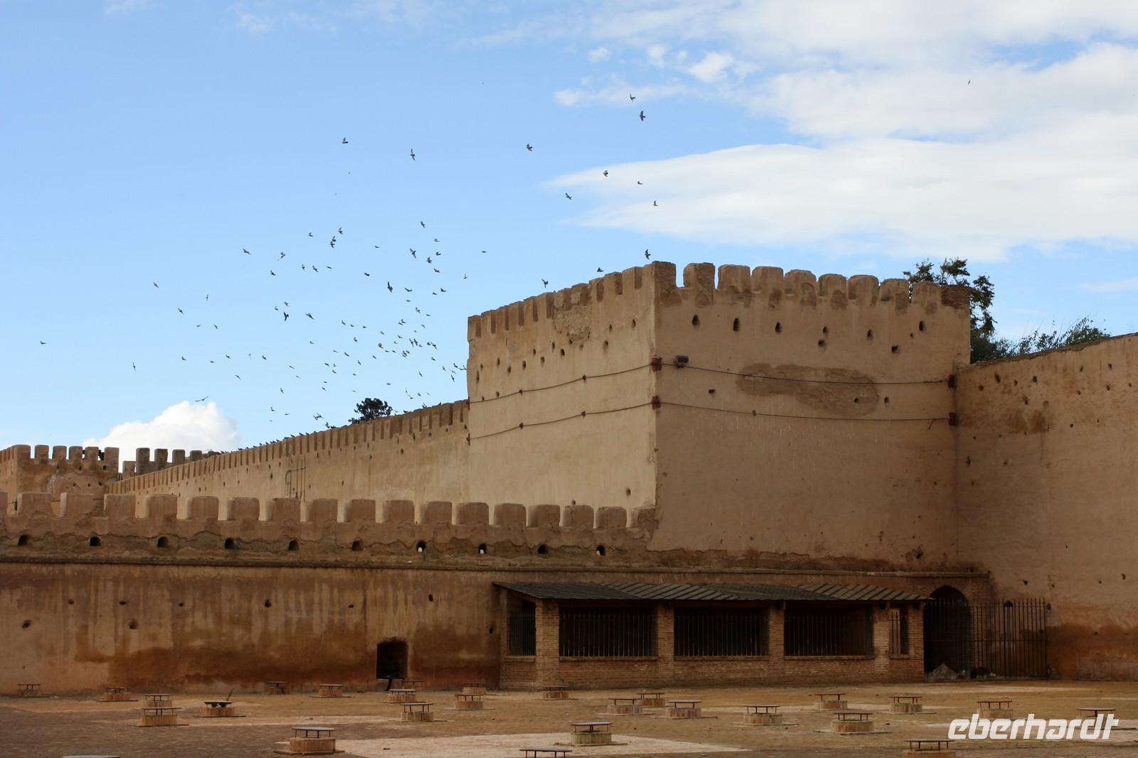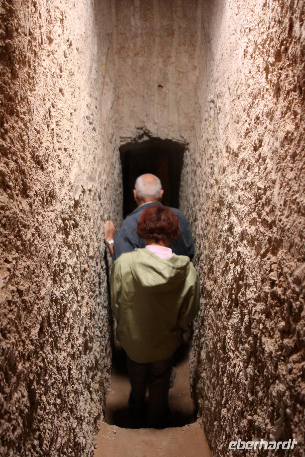 Zur Mittagszeit kehrten wir in einem Restaurant ein und es gab für alle den ersten Minztee der Reise - lecker! Der Gruß aus der Küche und unsere größeren und kleineren Gerichte schmeckten fantastisch. Es ging weiter nach Meknès. Wir fuhren zum königlichen Getreidespeicher mit gewaltigen Außenmauern und den Pferdeställen des Moulay Ismail. Etwas unheimlich war einem schon in den Gemäuern. Nach einer kleinen Stadtrundfahrt durch Meknès stoppten wir an einem großen Platz und dem Stadttor, anschließend besichtigten wir das ehemalige Gefängnis, was sich unterirdisch befand. Es war dunkel, nur kleine Löcher nach oben und kleine Lampen spendeten Licht. Während der Erzählungen von Mohammed, wie die Gefangenen hier lebten, versetzten wir uns in die Lage der Menschen, die hier jahrelang arbeiteten und lebten - unvorstellbar.