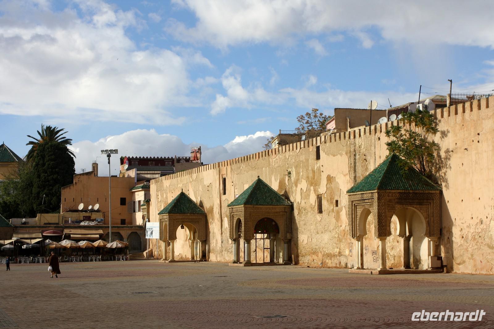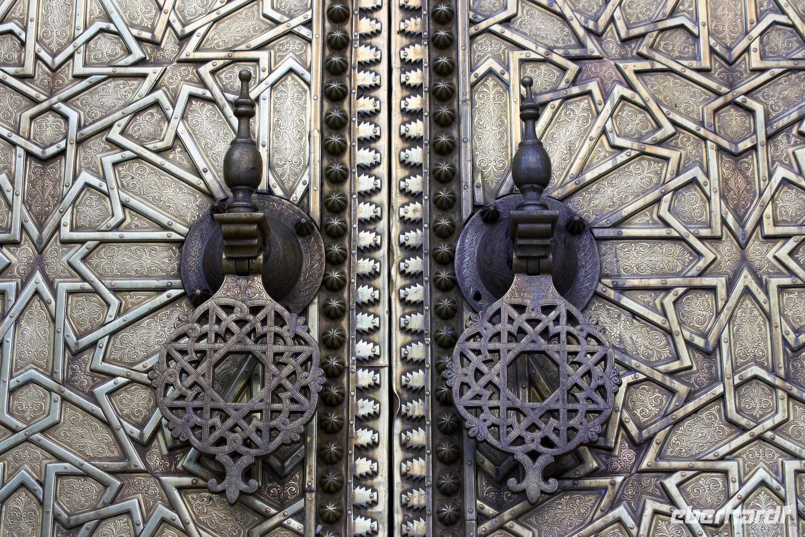 Unser abschließender Besichtigungspunkt des Tages war der Königspalast in Fès. In der drittgrößten Stadt Marokkos wurde dieser im 17. Jahrhundert erbaut. Er wird auch „Dar El Makhzen" genannt und ist nicht zugänglich für die Öffentlichkeit. Der König wohnt noch heute hier, wenn er in Fès weilt. Am beeindruckendsten waren die riesigen Tore, die von berühmten Metallziselierern des Landes angefertigt wurden.