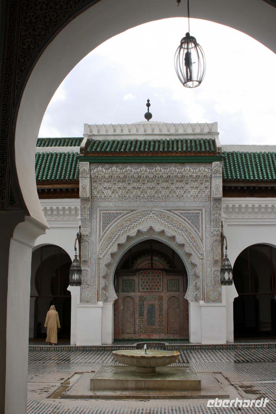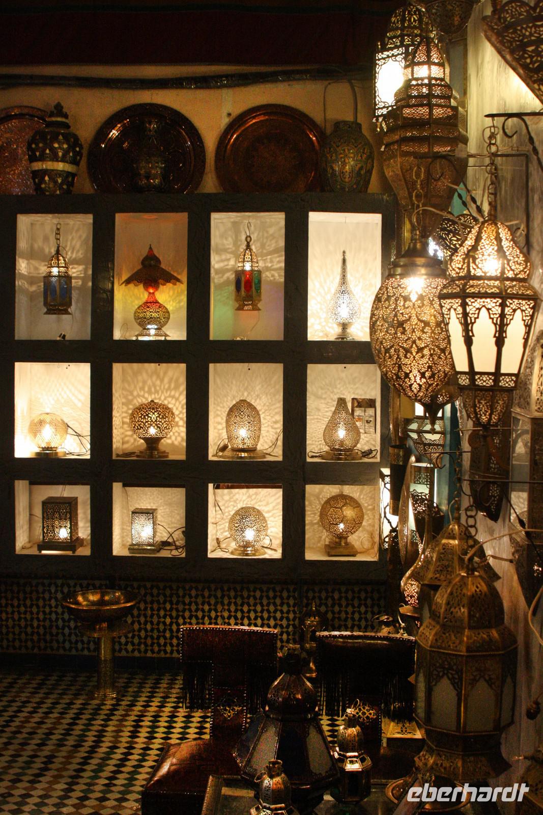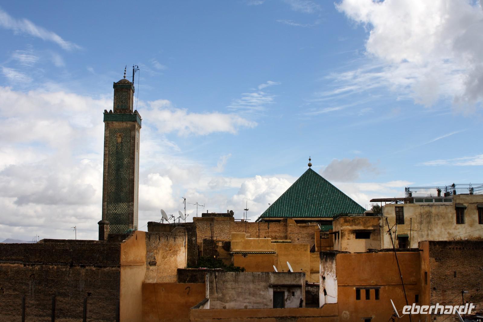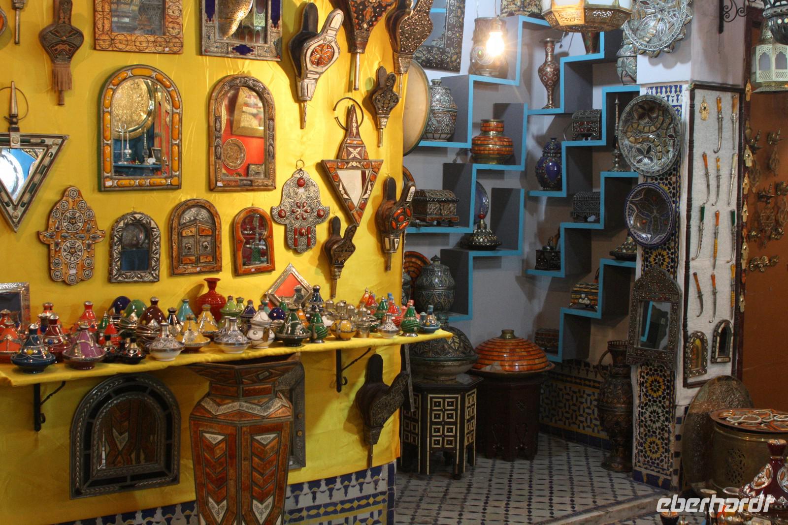 Am nächsten Tag besichtigten wir die Medina von Fès, die Altstadt. Autos sind hier unmöglich. Wir spazierten durch die engen Gassen und Reiseleiter Mohammed erklärte uns Kulinarisches und das besondere Handwerk. Einem Ziseliermeister für Messing, der auch am Königspalast Tore verziert hatte, statteten wir einen Besuch ab - Teller, Kannen, Spiegel und Lampen soweit das Auge reichte. Wir besichtigten außerdem den Innenhof der Medersa Bou Inania, erhaschten einen Blick in die Kairaouine-Moschee und das Zaouia Moulay Idriss, ein Mausoleum, wo Nicht-Muslime keinen Zutritt haben.