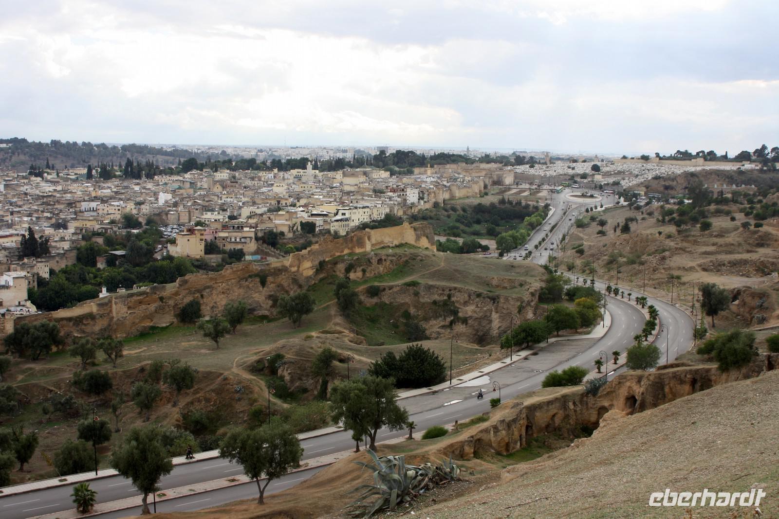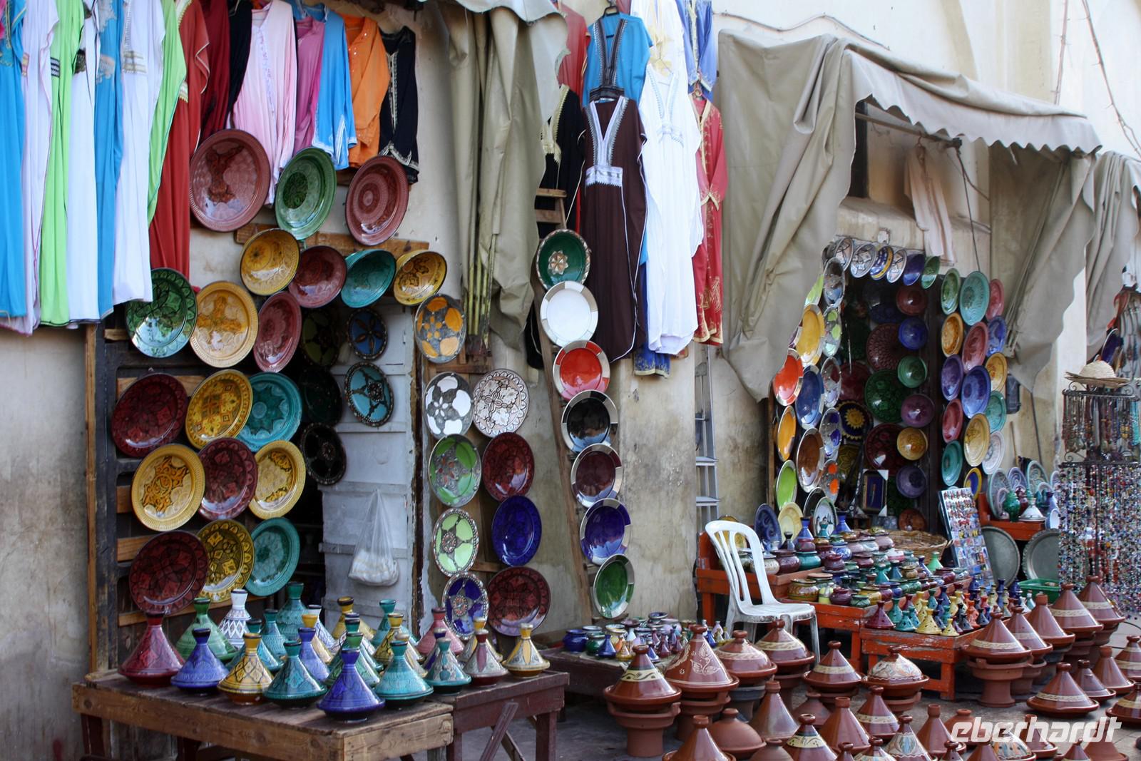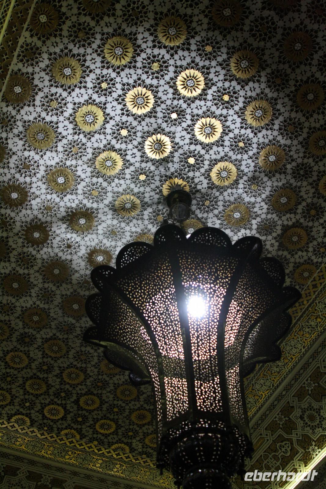 Am nächsten Tag besichtigten wir die Medina von Fès, die Altstadt. Autos sind hier unmöglich. Wir spazierten durch die engen Gassen und Reiseleiter Mohammed erklärte uns Kulinarisches und das besondere Handwerk. Einem Ziseliermeister für Messing, der auch am Königspalast Tore verziert hatte, statteten wir einen Besuch ab - Teller, Kannen, Spiegel und Lampen soweit das Auge reichte. Wir besichtigten außerdem den Innenhof der Medersa Bou Inania, erhaschten einen Blick in die Kairaouine-Moschee und das Zaouia Moulay Idriss, ein Mausoleum, wo Nicht-Muslime keinen Zutritt haben.
