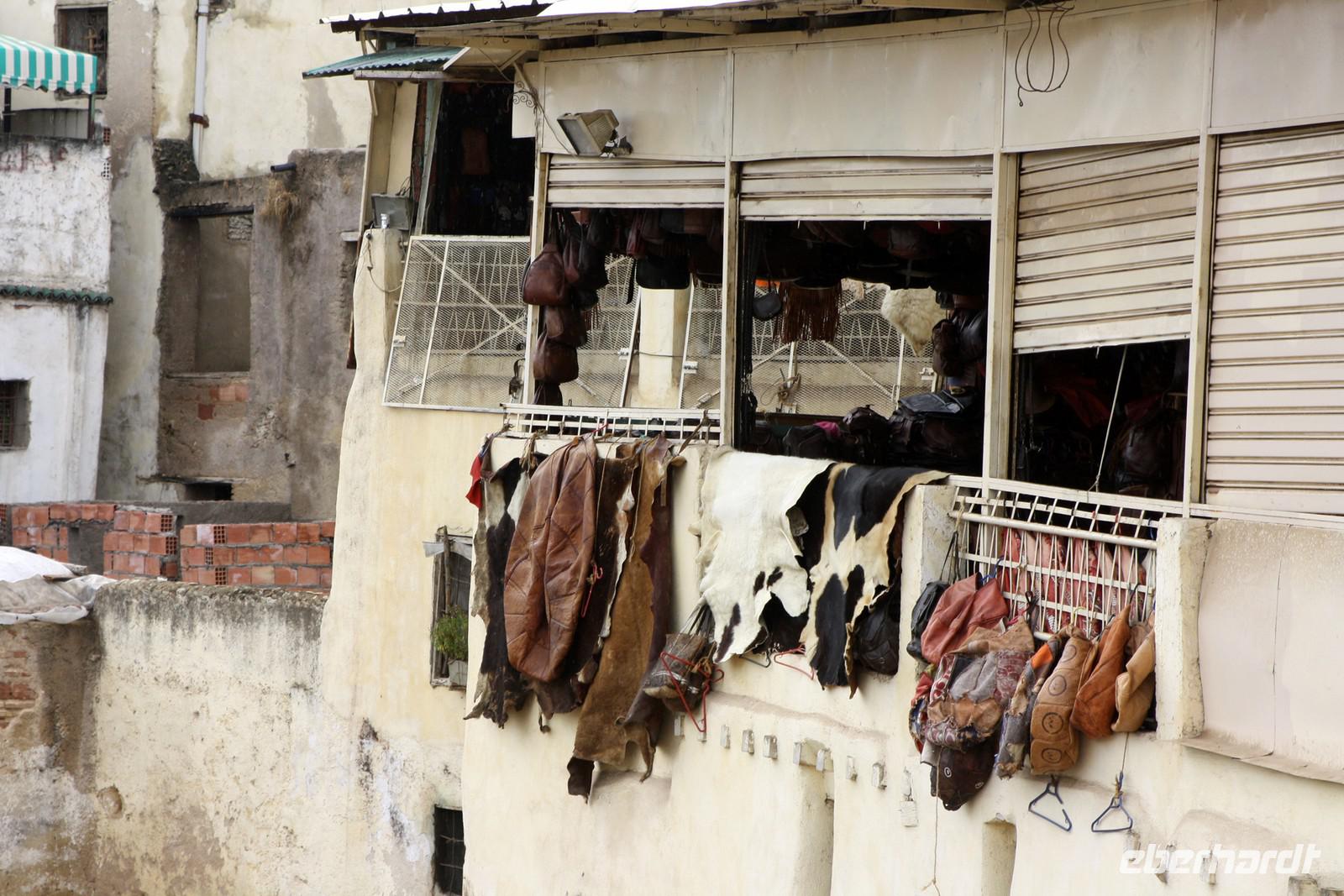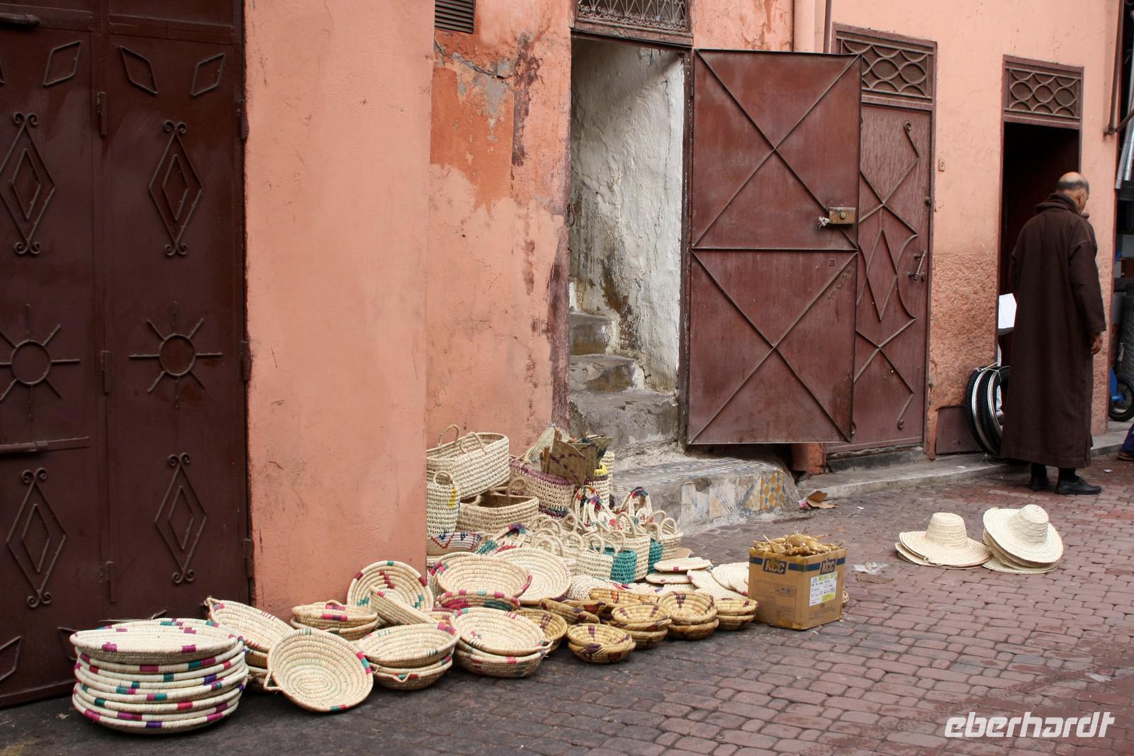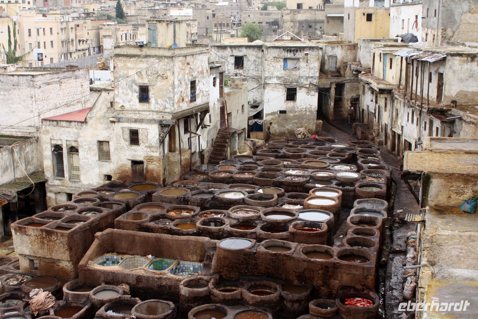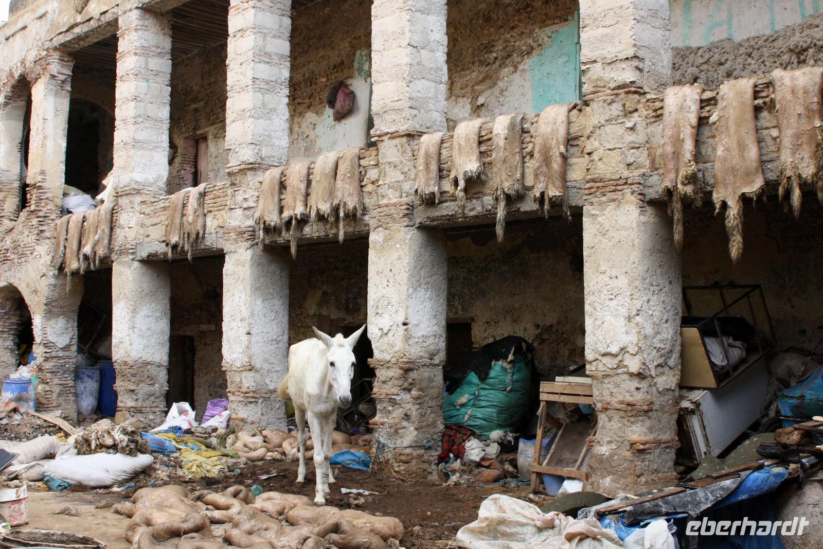 Uns begegneten auch noch zwei Esel, die als Müllabfuhr mit Säcken auf dem Rücken fungierten. Abschließend besuchten wir das Gerberviertel, wo es dank des Regens nicht so stark roch, wie es viele erzählten. Wir blickten auf die Gerberbottiche mit den einzelnen Schritten (Salz, Taubenkot, Waschung, Farbe).
