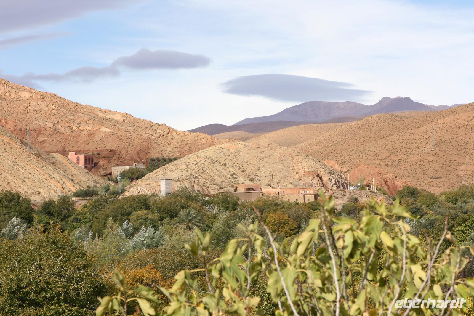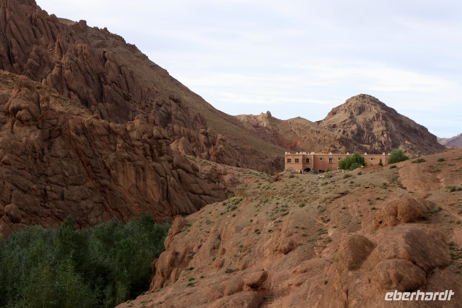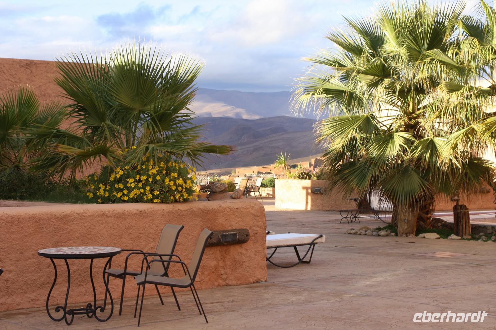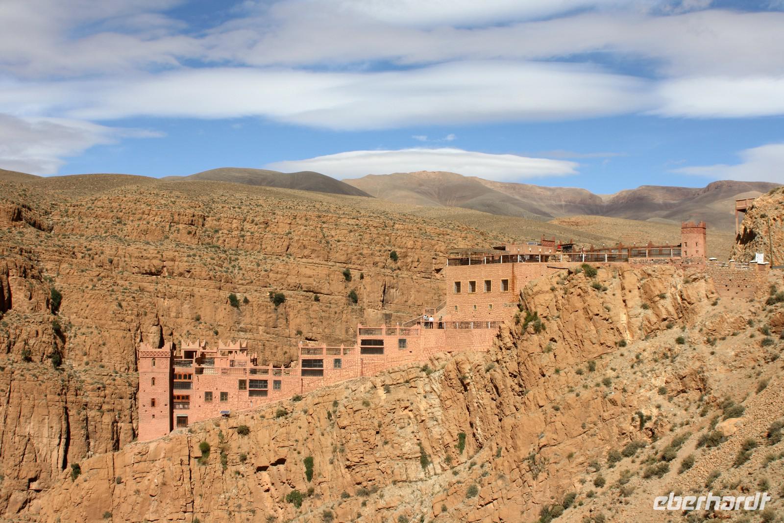 Wir hatten einen Bus-Stopp später eine fantastische Aussicht auf das Tondratal und fuhren weiter zur Tondraschlucht, wo wir auch zu Mittag aßen. Später erreichten wir das schönste Hotel der Reise, „Xaluca Dades" - tolle Begrüßung durch eine Folkloregruppe, Tee und Gebäck, supernette Mitarbeiter, superschöne Anlage im afrikanischen Stil mit Pool und traumhafte Zimmer! Auch der Ausblick auf die Stadt Boumalne du Dades war sensationell. Auch das Buffet beim Abendessen war sehr abwechslungsreich und lecker.