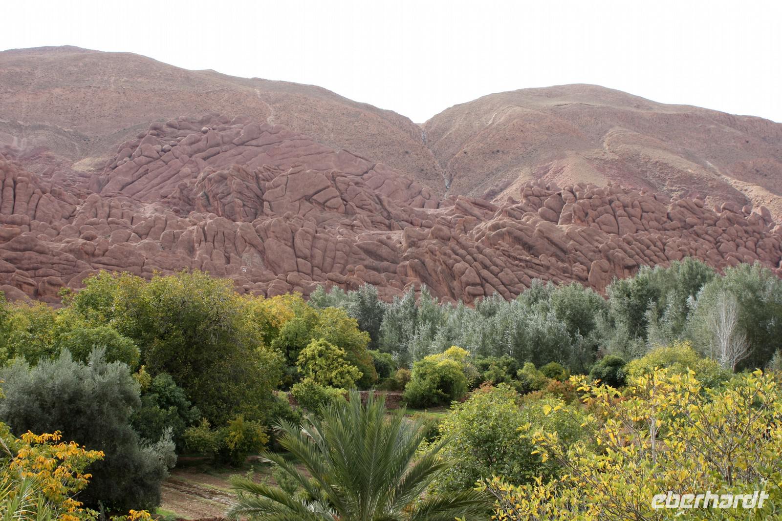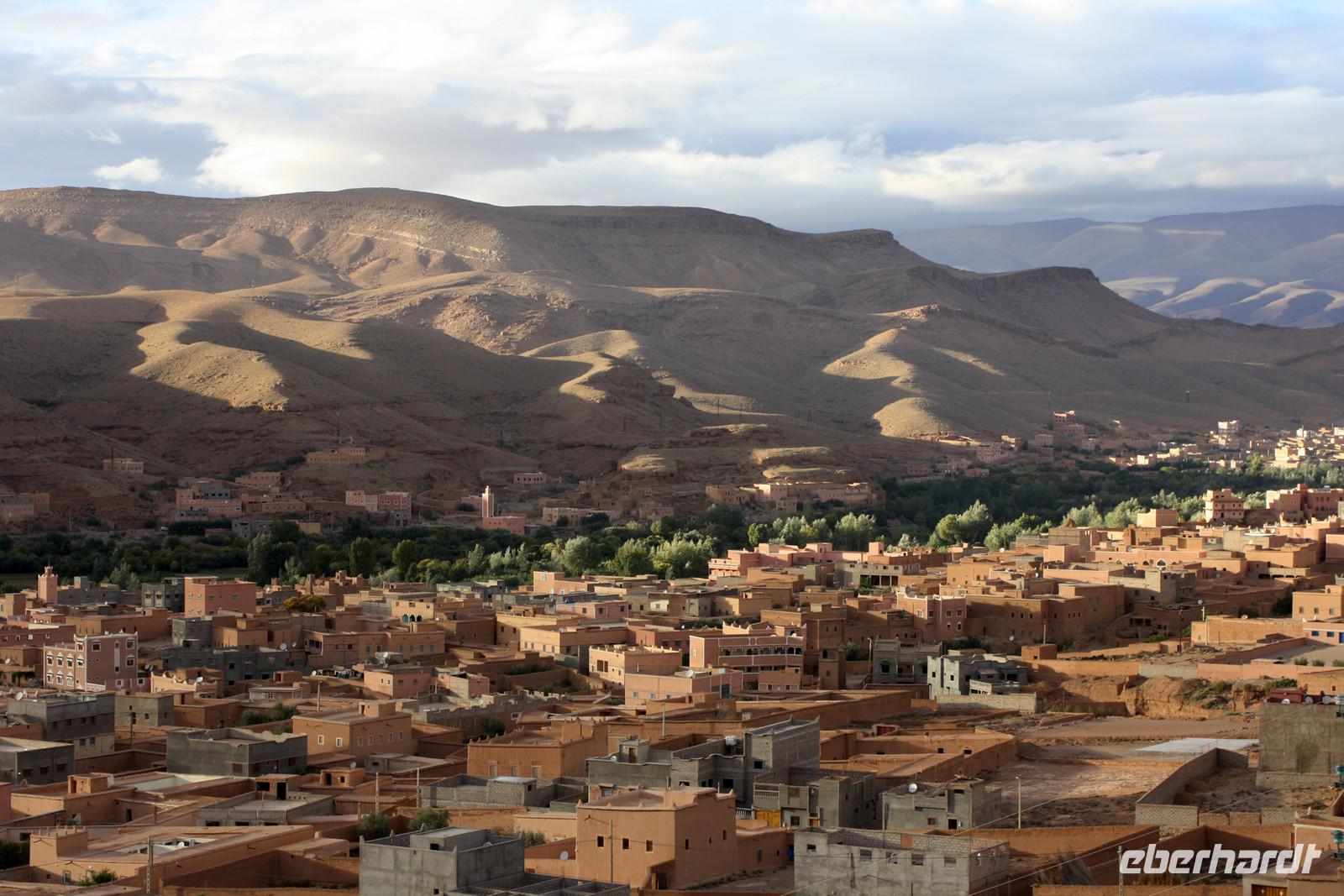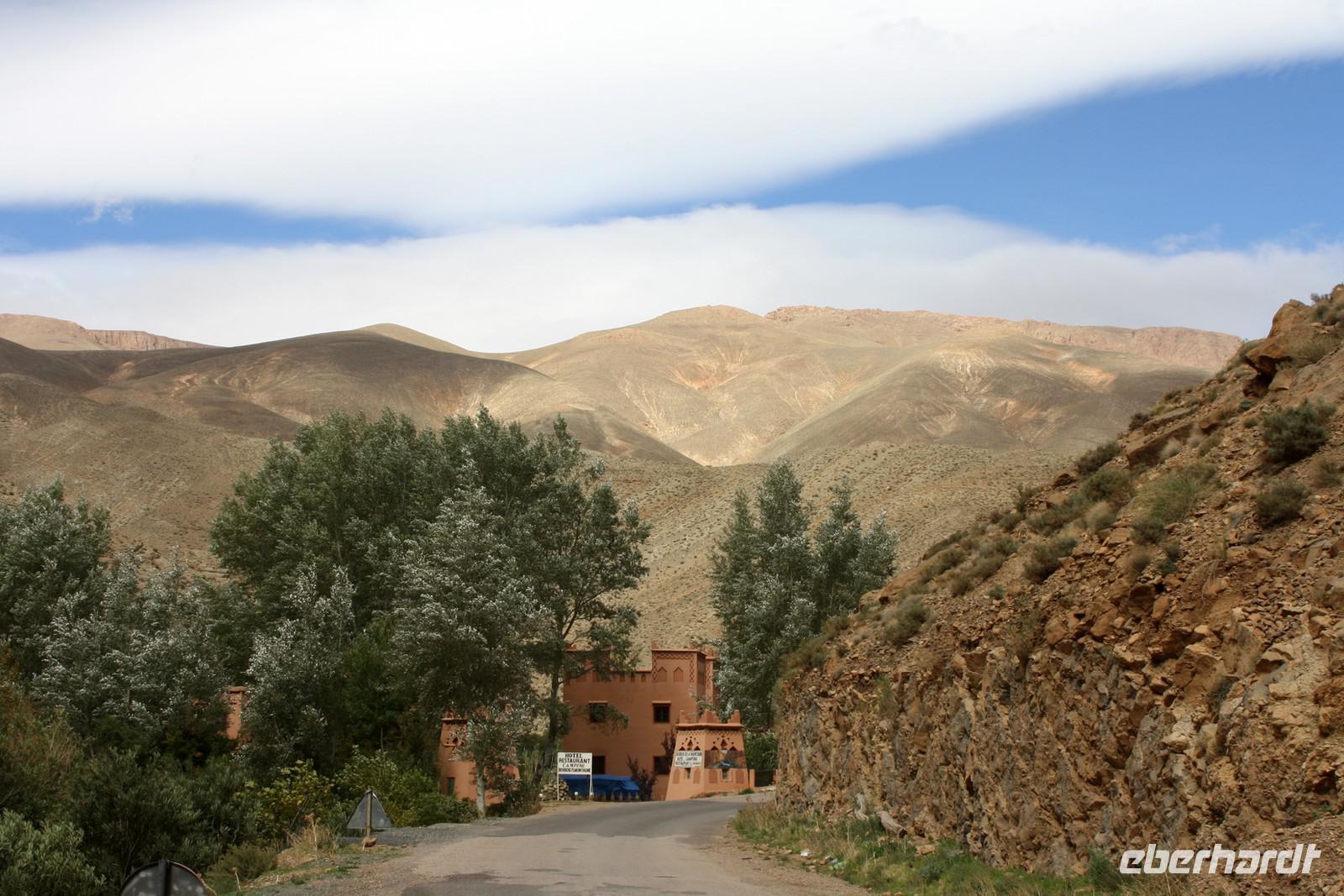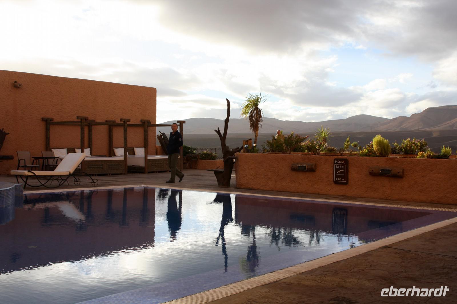 Wir hatten einen Bus-Stopp später eine fantastische Aussicht auf das Tondratal und fuhren weiter zur Tondraschlucht, wo wir auch zu Mittag aßen. Später erreichten wir das schönste Hotel der Reise, „Xaluca Dades" - tolle Begrüßung durch eine Folkloregruppe, Tee und Gebäck, supernette Mitarbeiter, superschöne Anlage im afrikanischen Stil mit Pool und traumhafte Zimmer! Auch der Ausblick auf die Stadt Boumalne du Dades war sensationell. Auch das Buffet beim Abendessen war sehr abwechslungsreich und lecker.