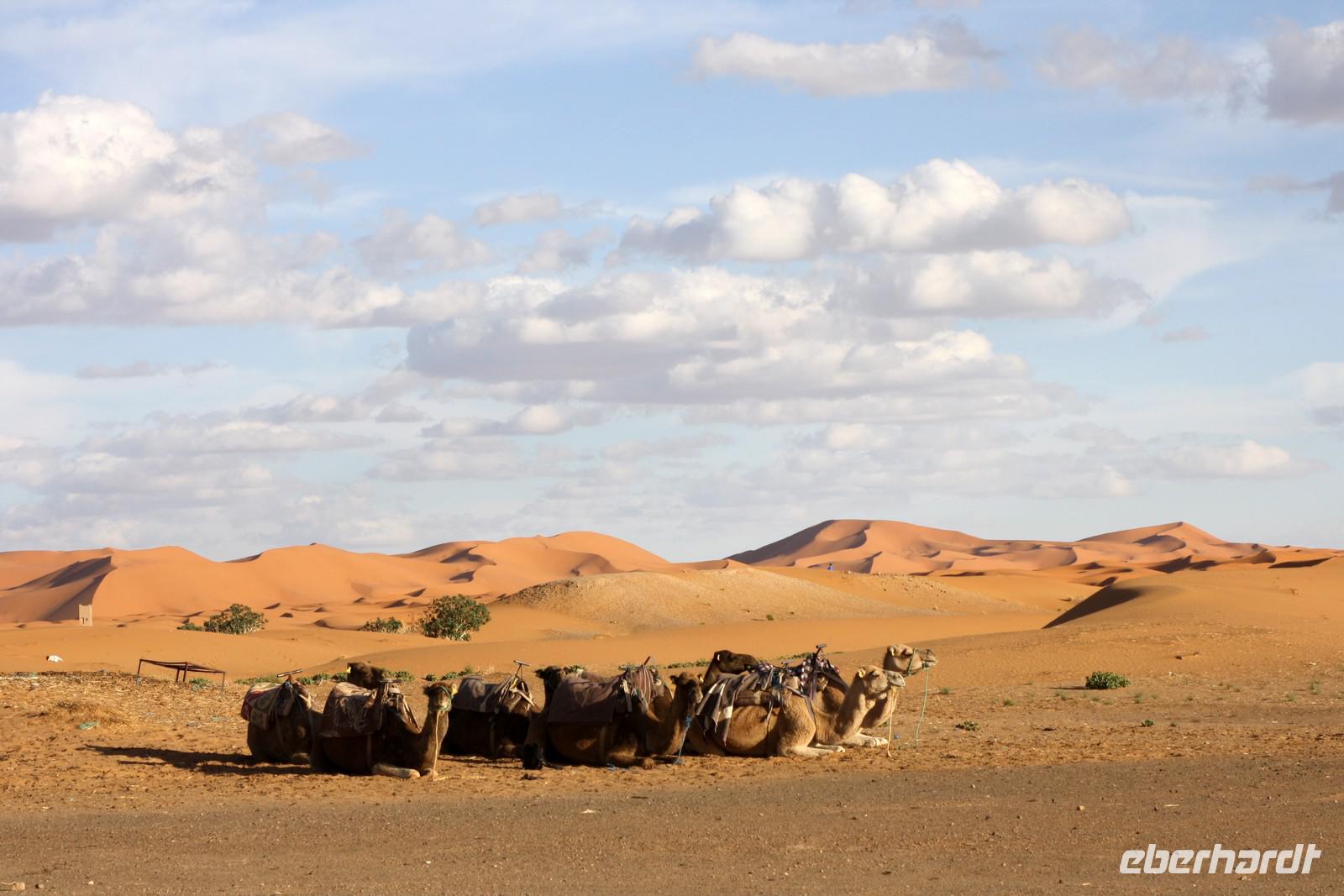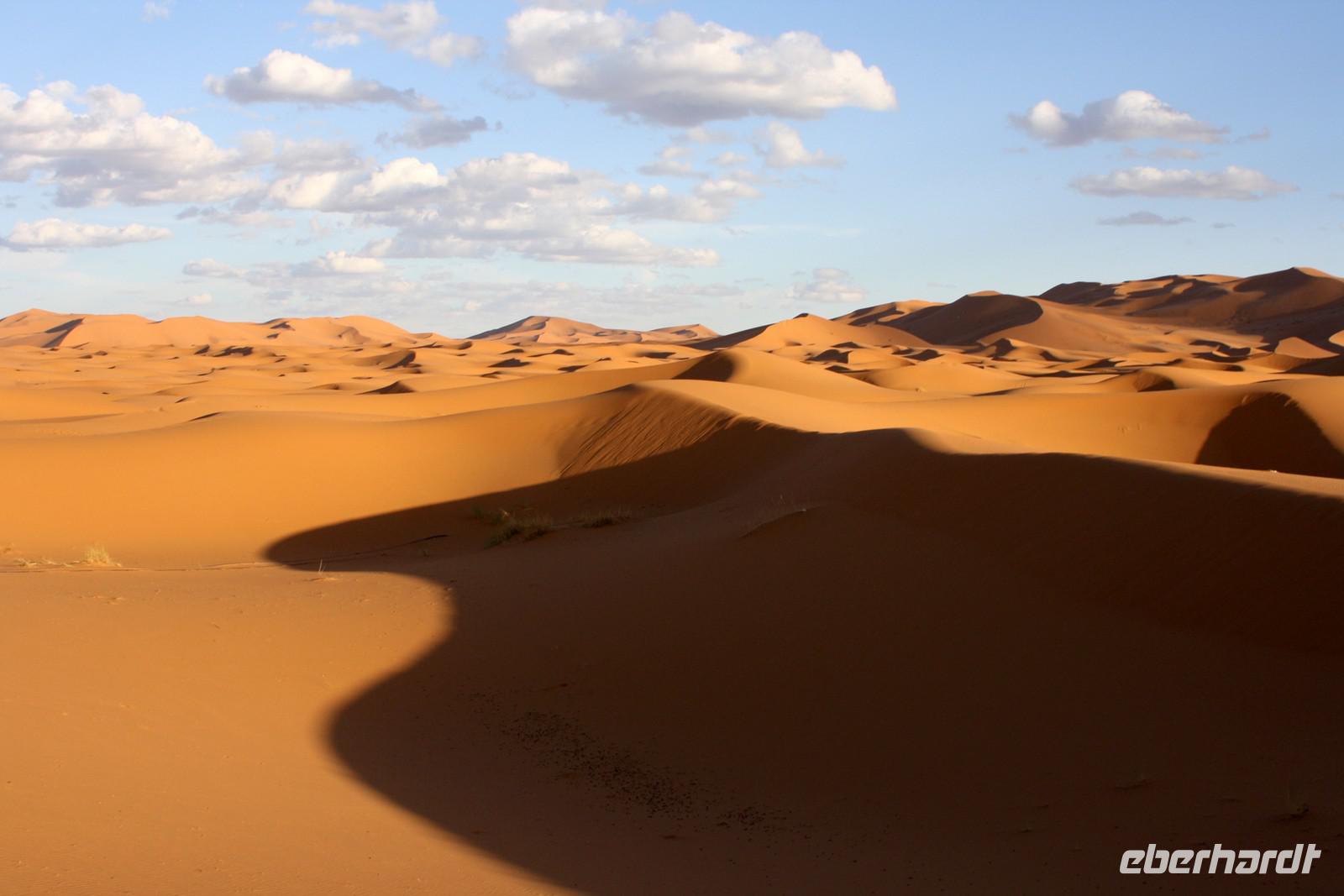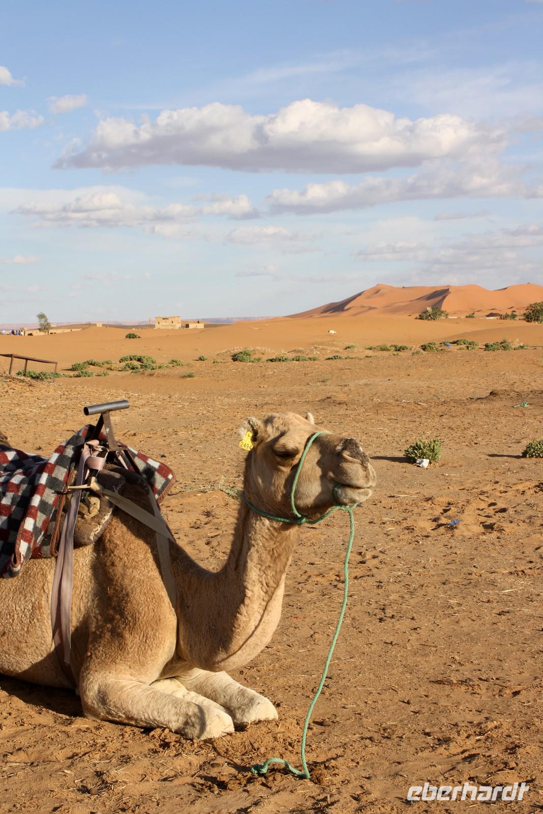 Auf der Busfahrt nach Erfoud sahen wir doch tatsächlich Berberaffen am Straßenrand! Unser nächster Stopp war in 2.178 Metern Höhe am Pass Col du Zad. Wir durchquerten den Mittleren Atlas und fuhren durch beeindruckende weite Landschaften. Unsere Mittagspause verbrachten wir im Sonnenschein und an der frischen Luft mit einem Picknick aus belegtem Fladenbrot, Obst, Joghurt und Tee. In Erfoud angekommen stiegen wir in drei Jeeps um und fuhren etliche Kilometer durch die Geröllwüste der Sahara. Bei einer Nomadenfamilie, die ihre Zelte in der Wüste aufschlugen, tranken wir Tee und durften uns ansehen, wie sie leben. Es ging weiter zu den Sanddünen, wo schon Dromedare auf uns warteten. Unsere Karawane zog in Richtung Sonnenuntergang auf der Düne. Das war ein beeindruckendes Erlebnis.