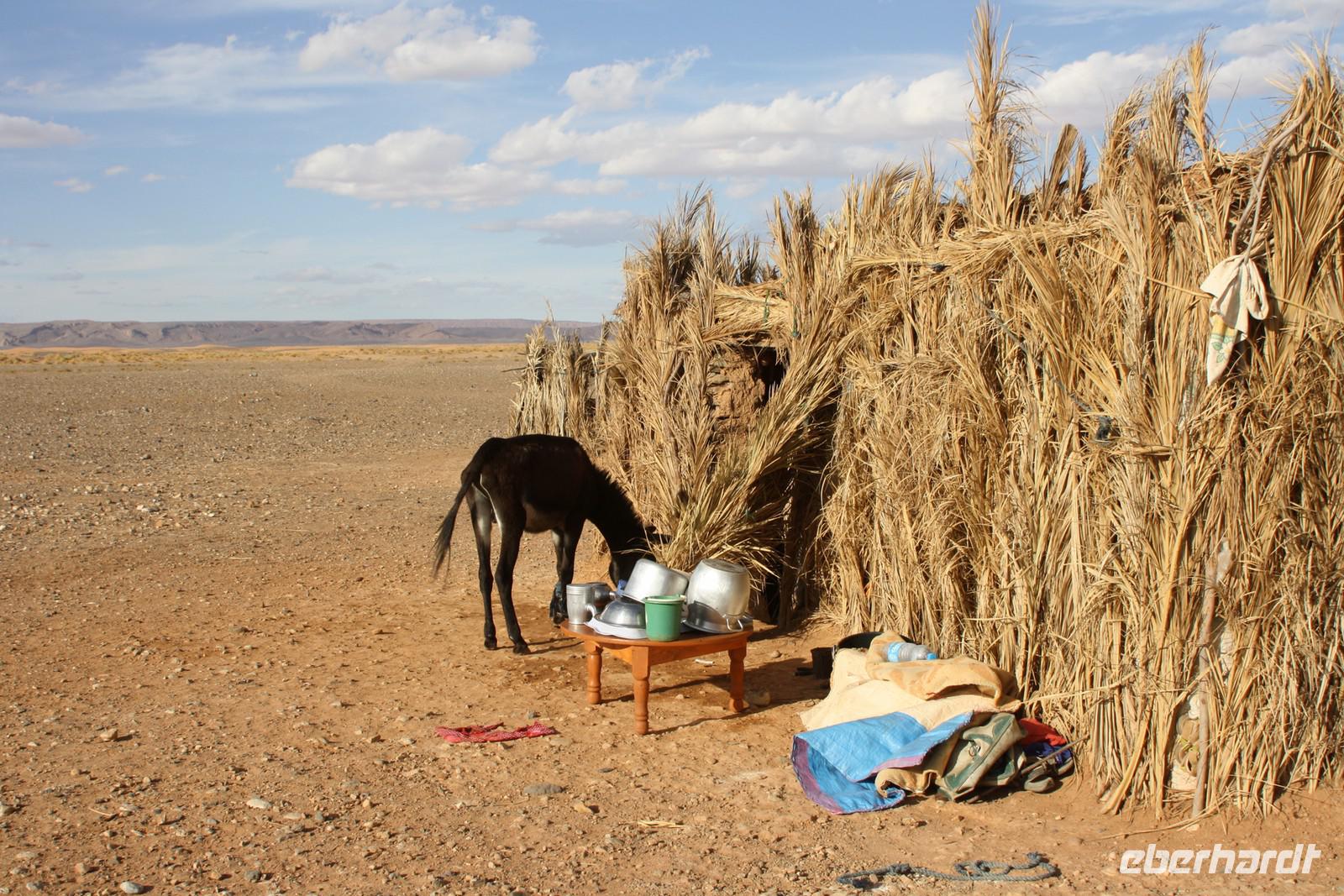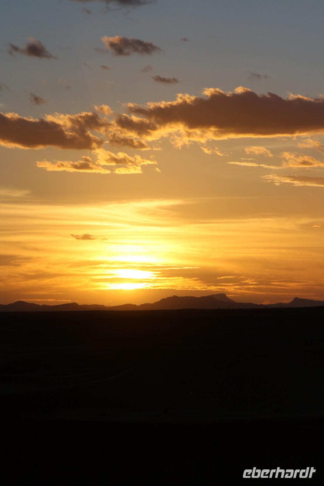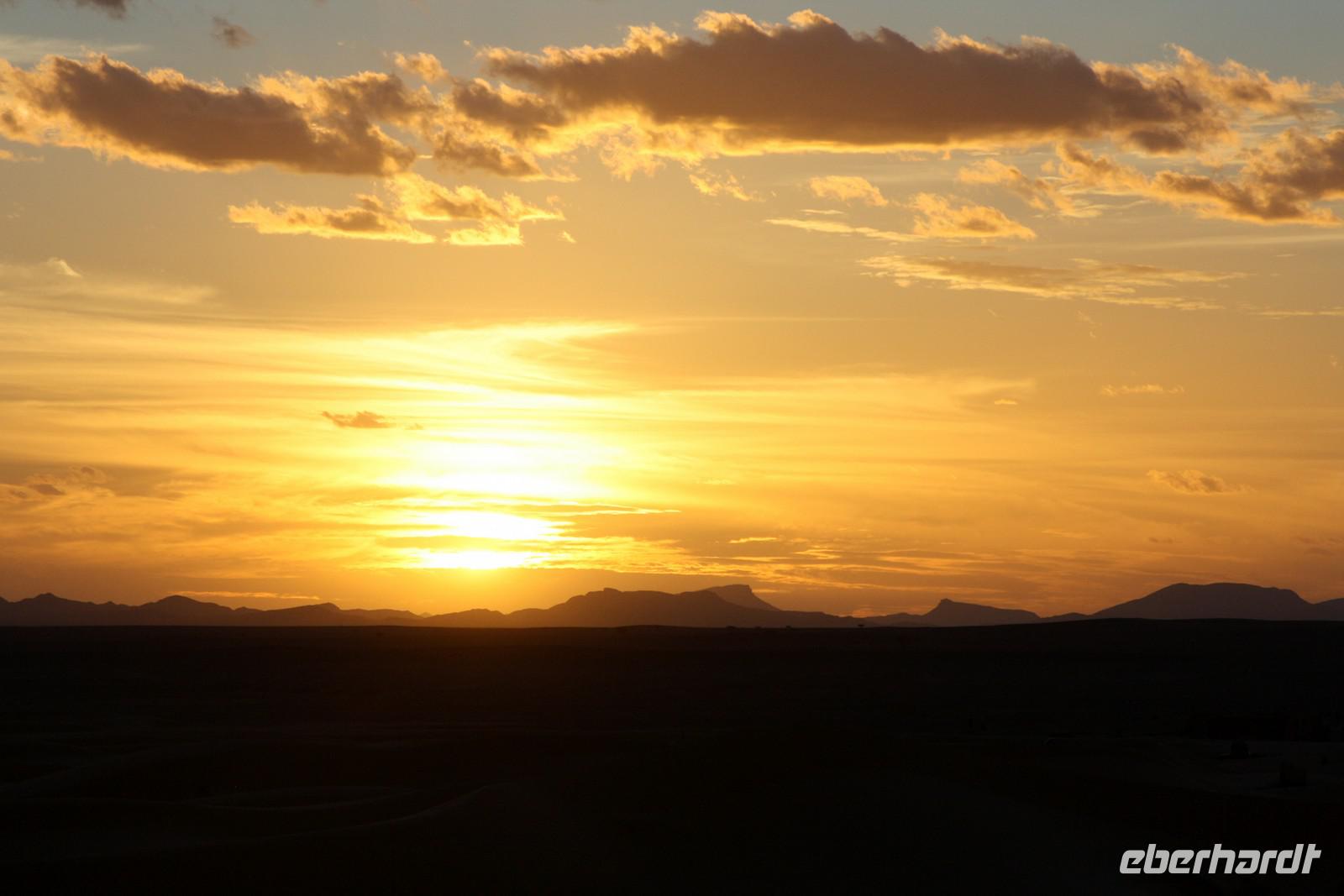 Auf der Busfahrt nach Erfoud sahen wir doch tatsächlich Berberaffen am Straßenrand! Unser nächster Stopp war in 2.178 Metern Höhe am Pass Col du Zad. Wir durchquerten den Mittleren Atlas und fuhren durch beeindruckende weite Landschaften. Unsere Mittagspause verbrachten wir im Sonnenschein und an der frischen Luft mit einem Picknick aus belegtem Fladenbrot, Obst, Joghurt und Tee. In Erfoud angekommen stiegen wir in drei Jeeps um und fuhren etliche Kilometer durch die Geröllwüste der Sahara. Bei einer Nomadenfamilie, die ihre Zelte in der Wüste aufschlugen, tranken wir Tee und durften uns ansehen, wie sie leben. Es ging weiter zu den Sanddünen, wo schon Dromedare auf uns warteten. Unsere Karawane zog in Richtung Sonnenuntergang auf der Düne. Das war ein beeindruckendes Erlebnis.