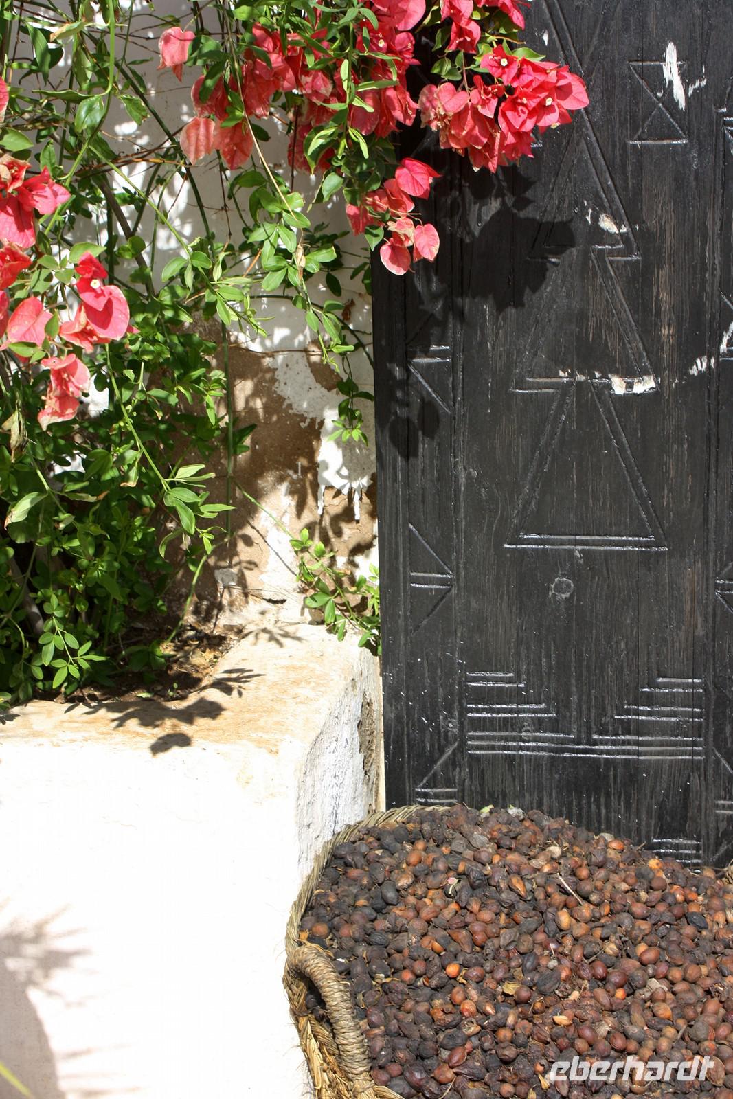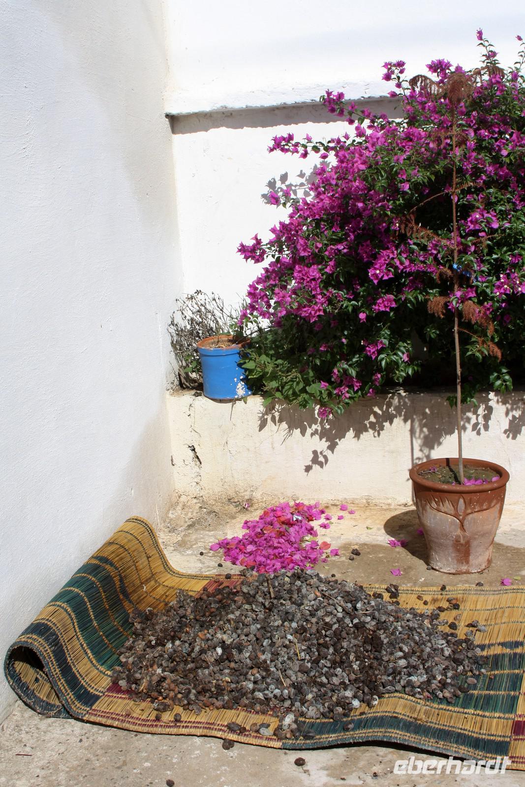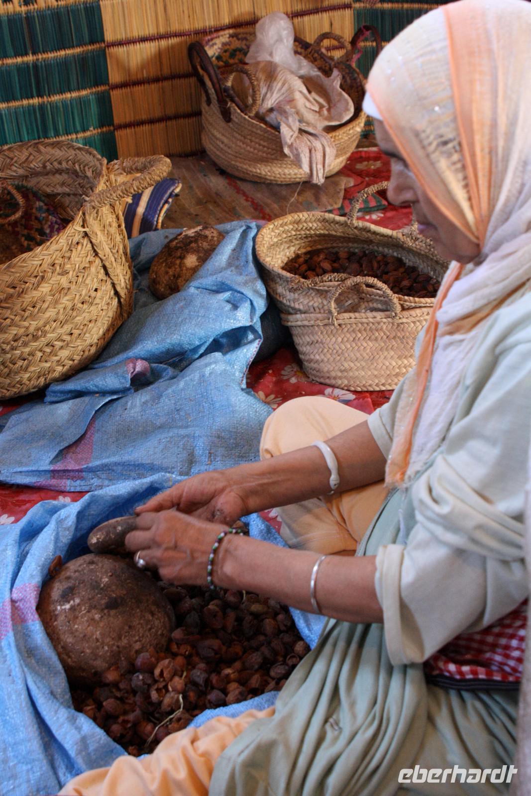 Wir waren nun auf dem Weg nach Essaouira und stoppten zwischendurch bei einer Frauenkooperative, die alles aus Argan-Früchten herstellt. Mohammed erklärte die einzelnen Schritte und wir probierten vier verschiedene Dinge mit Brot, die aus Arganöl, Arganblüten oder Orangenblüten hergestellt wurden: reines Öl, „Berbernutella" und zwei Honigsorten, die sehr lecker waren. Der Arganbaum hat eine weit ausladende Krone und darf nicht durch Schütteln und Pflücken geerntet werden, die reifen Früchte werden vom Boden aufgelesen.
