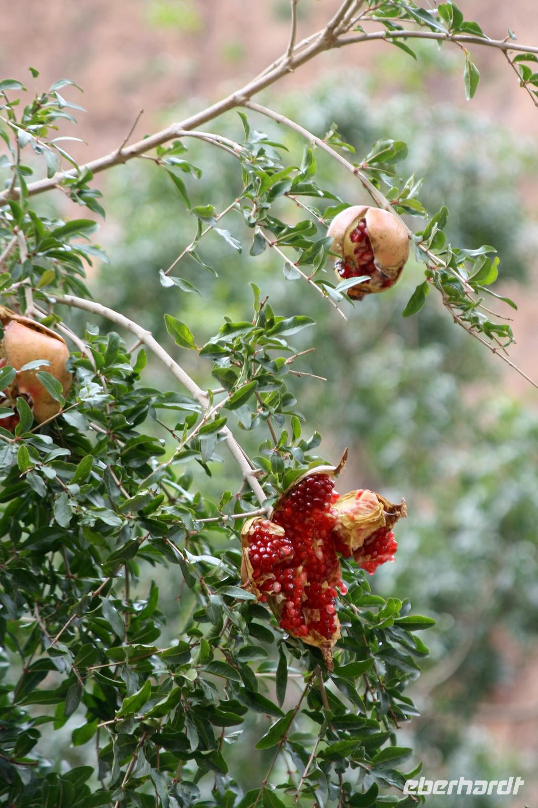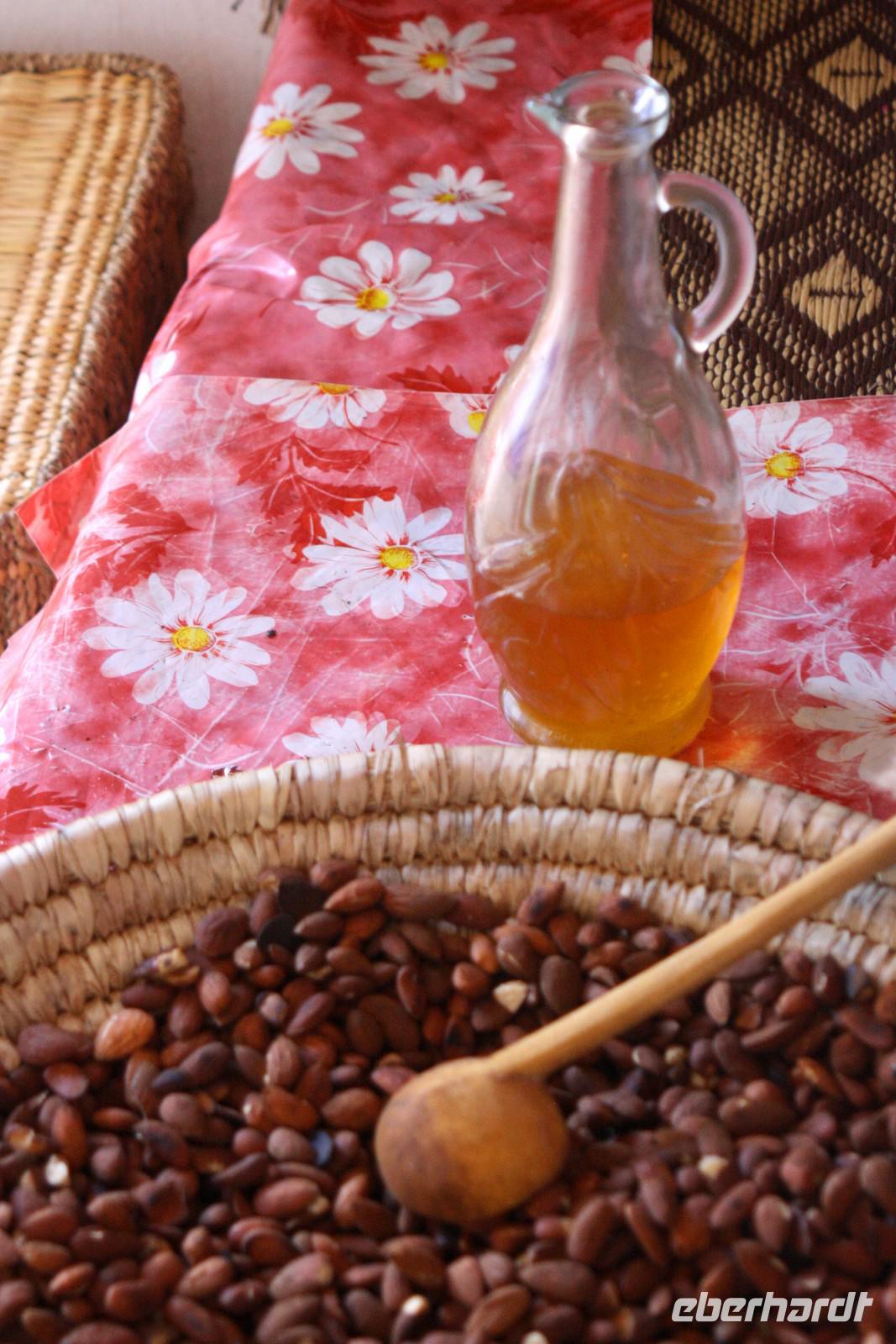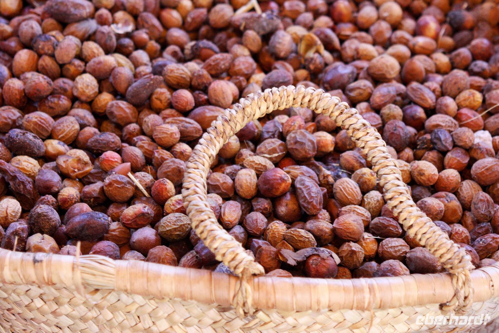 Wir waren nun auf dem Weg nach Essaouira und stoppten zwischendurch bei einer Frauenkooperative, die alles aus Argan-Früchten herstellt. Mohammed erklärte die einzelnen Schritte und wir probierten vier verschiedene Dinge mit Brot, die aus Arganöl, Arganblüten oder Orangenblüten hergestellt wurden: reines Öl, „Berbernutella" und zwei Honigsorten, die sehr lecker waren. Der Arganbaum hat eine weit ausladende Krone und darf nicht durch Schütteln und Pflücken geerntet werden, die reifen Früchte werden vom Boden aufgelesen.