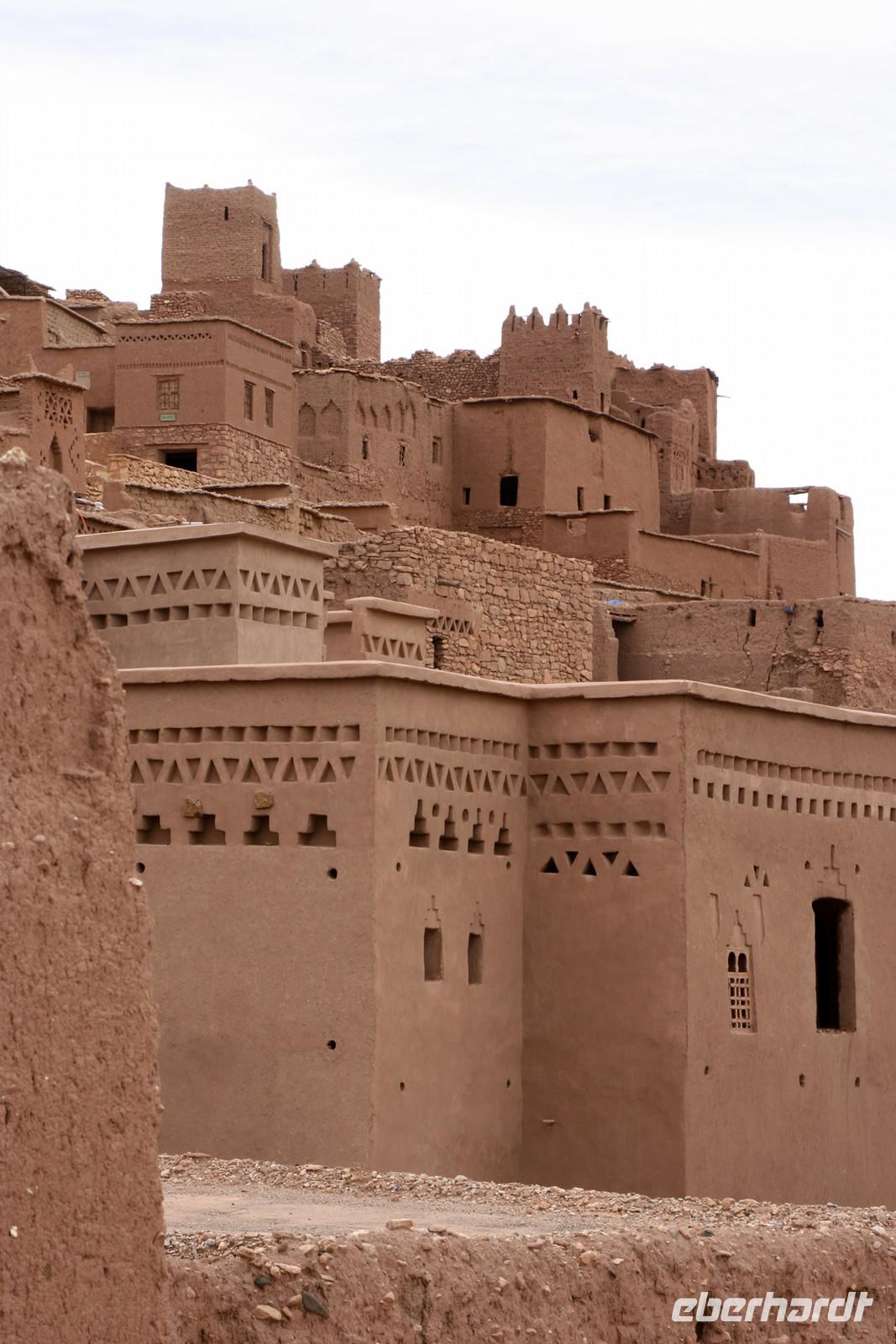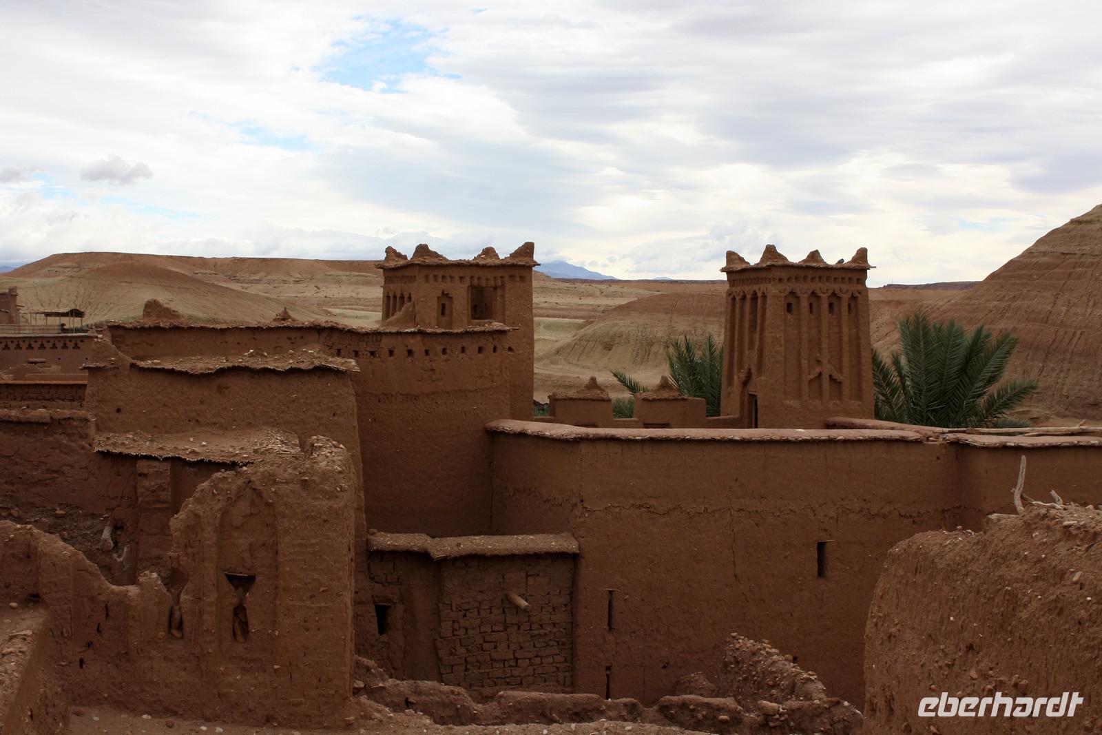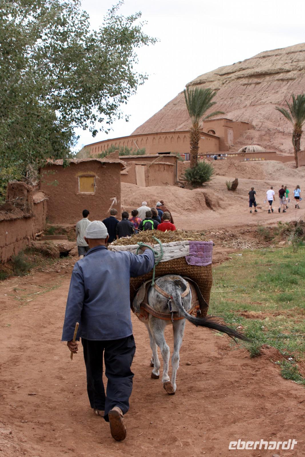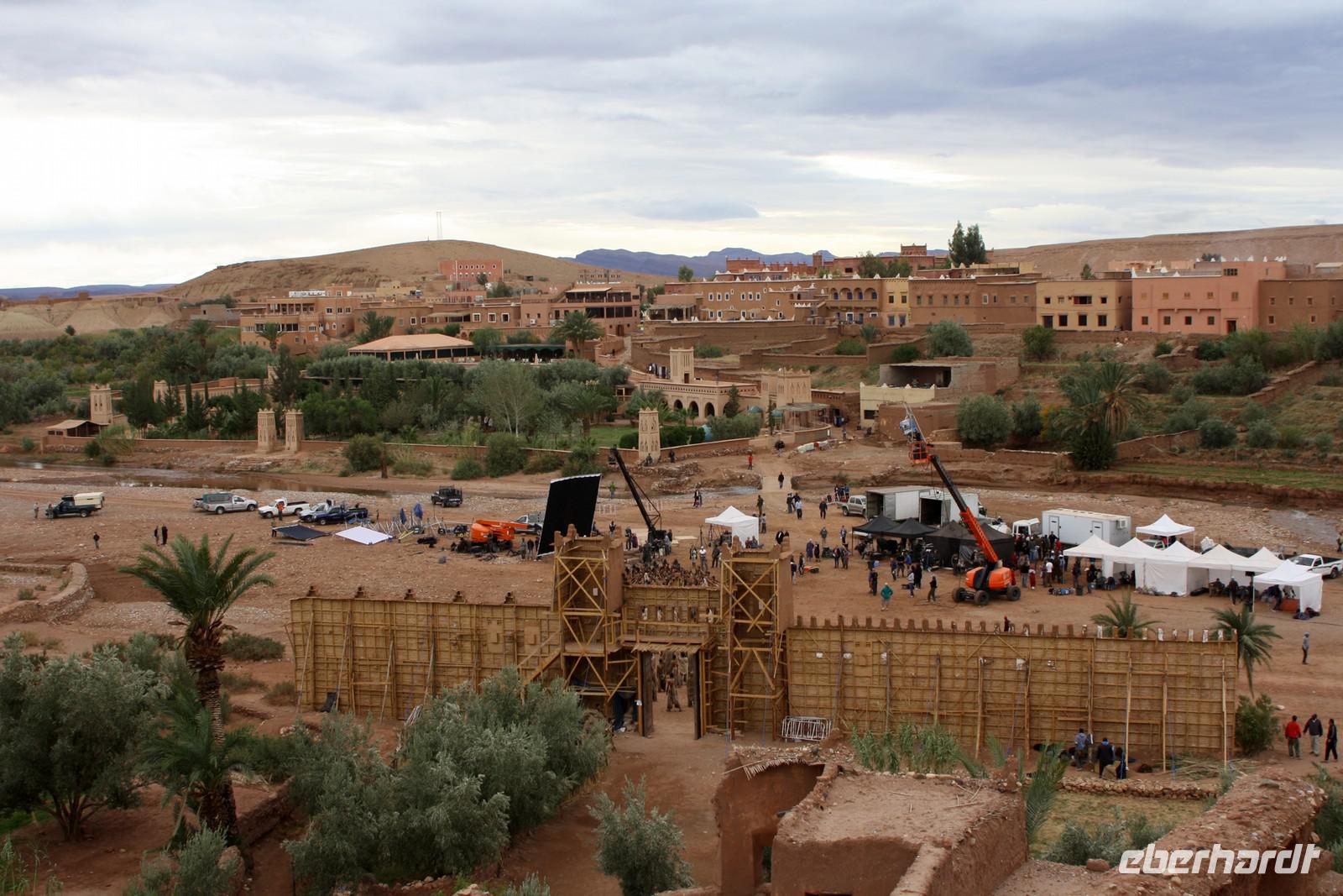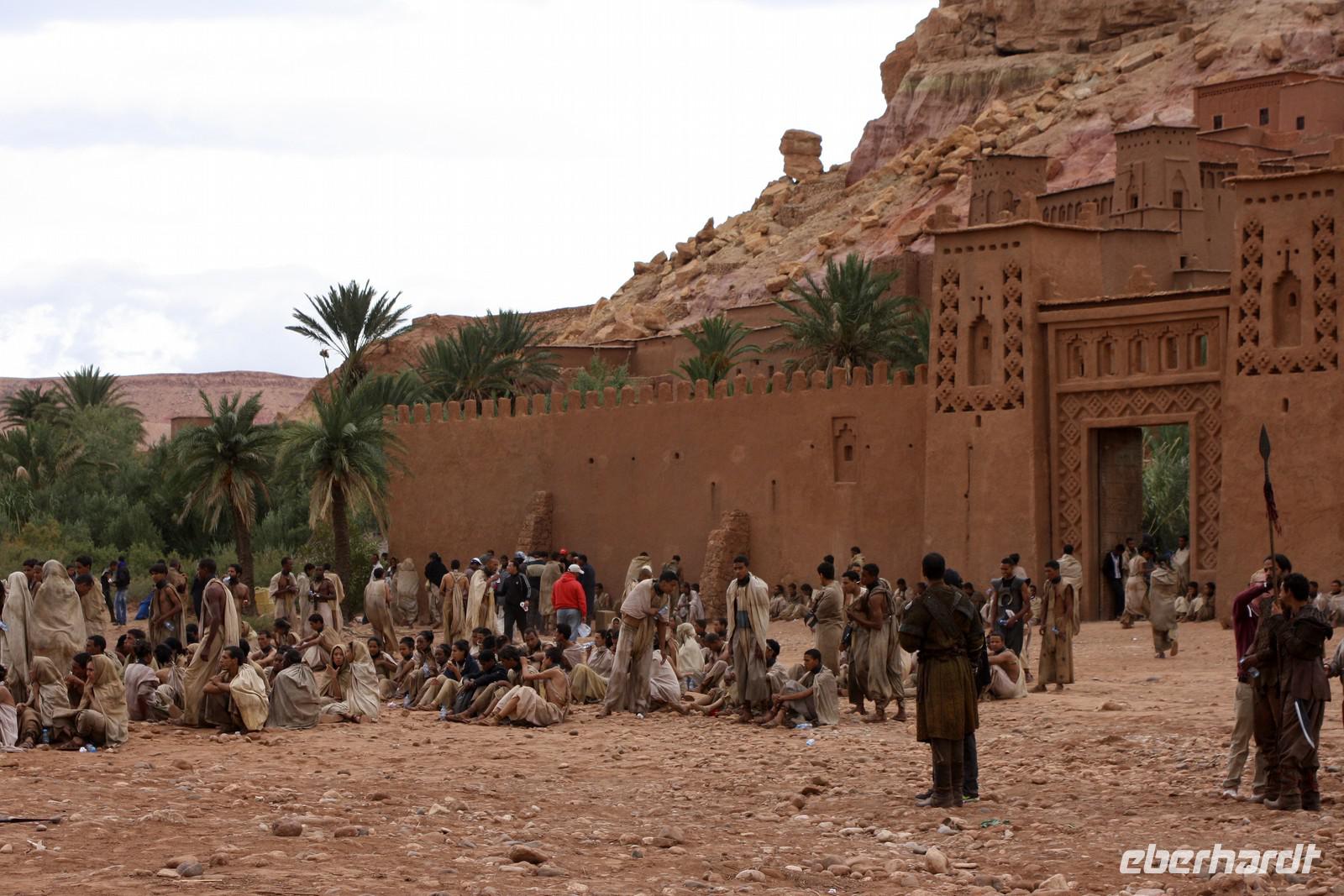 Auf dem Weg nach Marrakesch stand ein Besuch des Ksars „Ait Ben Haddou" auf dem Programm. Mohammed erzählte bereits im Bus viel darüber und dass er dort einmal mit einer anderen Reisegruppe einen Filmdreh beobachten durfte. Als wir ankamen, wurde auch gerade gedreht mit sehr vielen Statisten: die US-Filmserie „Game of Thrones", 3. Staffel. Wir konnten etliche Blicke auf das Geschehen erhaschen. Ein riesiges Filmteam war überall zu Gange. In dem alten Dorf bestiegen wir einige der verschachtelten Wohnburgen und durften die Räumlichkeiten einer Familie besichtigen. Durch schmale Treppen ging nach oben, dort hatte man einen weiten Blick auf das Gelände.
