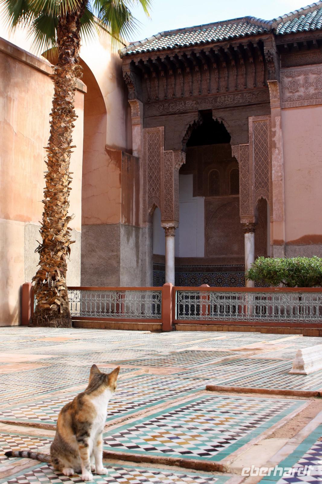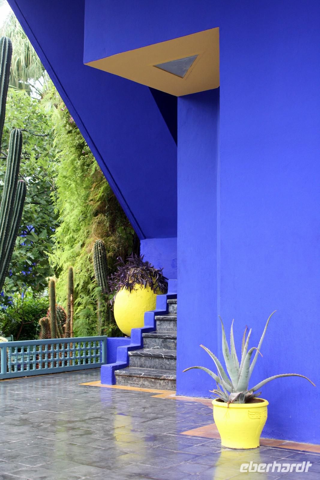 Anschließend ging es weiter durch das Atlasgebirge, es war ein beschwerlicher Weg über die Serpentinen. Wir stoppten bei dem Pass „Col du Tichka" in 2.260 Metern Höhe. Ankunft in Marrakesch - wir fuhren direkt zum Jardin Majorelle. Dieser Botanische Garten wurde 1923 vom französischen Maler Jacques Majorelle angelegt. Später kaufte Yves Saint Laurent das Anwesen und seine Asche wurde nach seinem Tod 2008 dort auch verstreut.