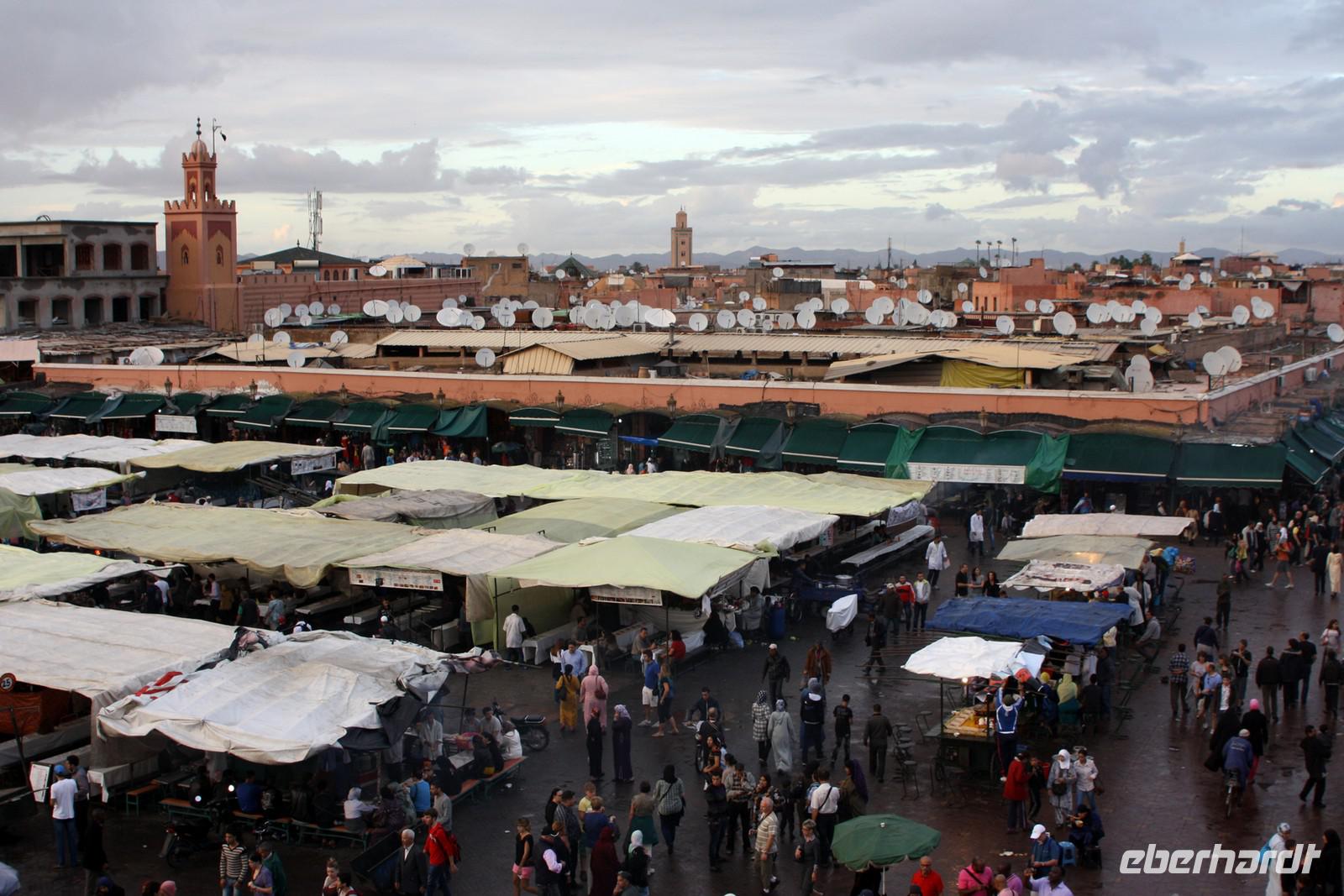 Mohammed zeigte uns, wie die Schals gefärbt werden und verschiedene Handgewerke. Wieder zurück auf dem „Platz der Gaukler" stiegen wir ein paar Treppen hinauf zu einem Café, von dem man einen super Ausblick auf den Platz hatte. Das war eine tolle Atmosphäre im Abendlicht!