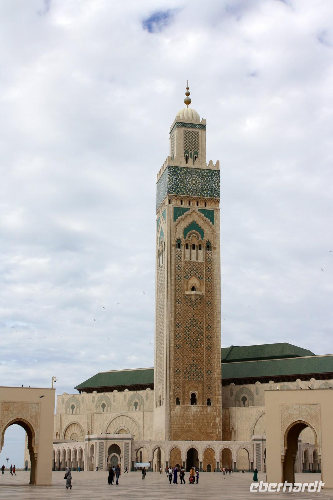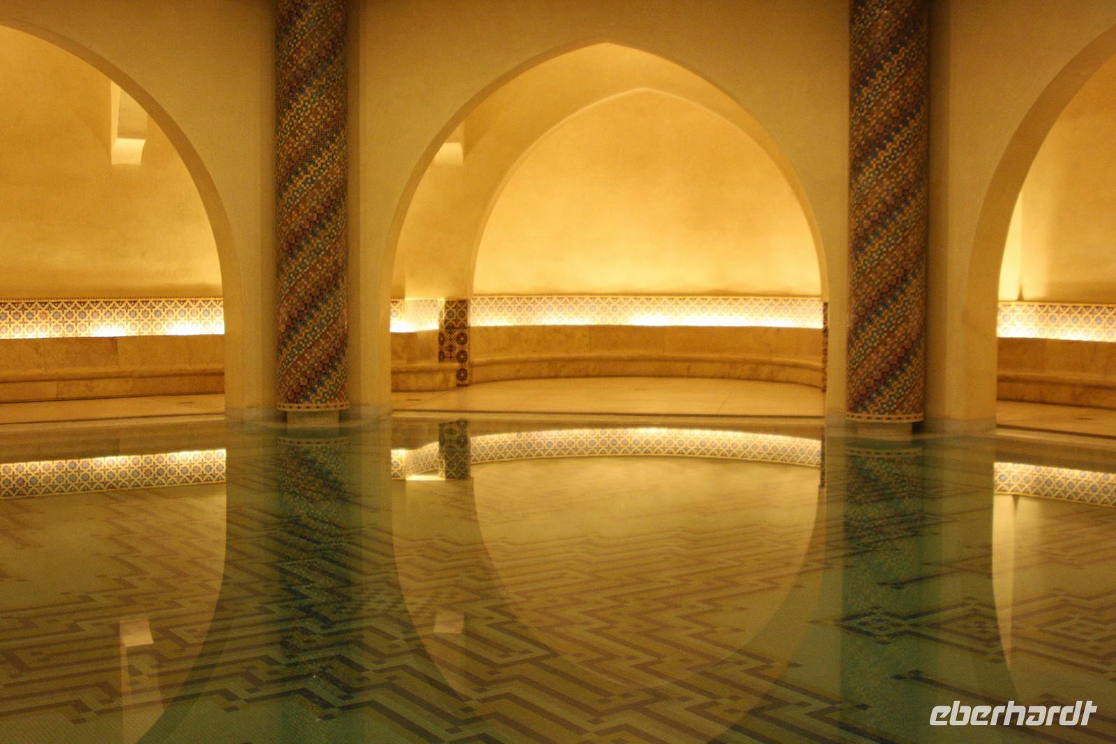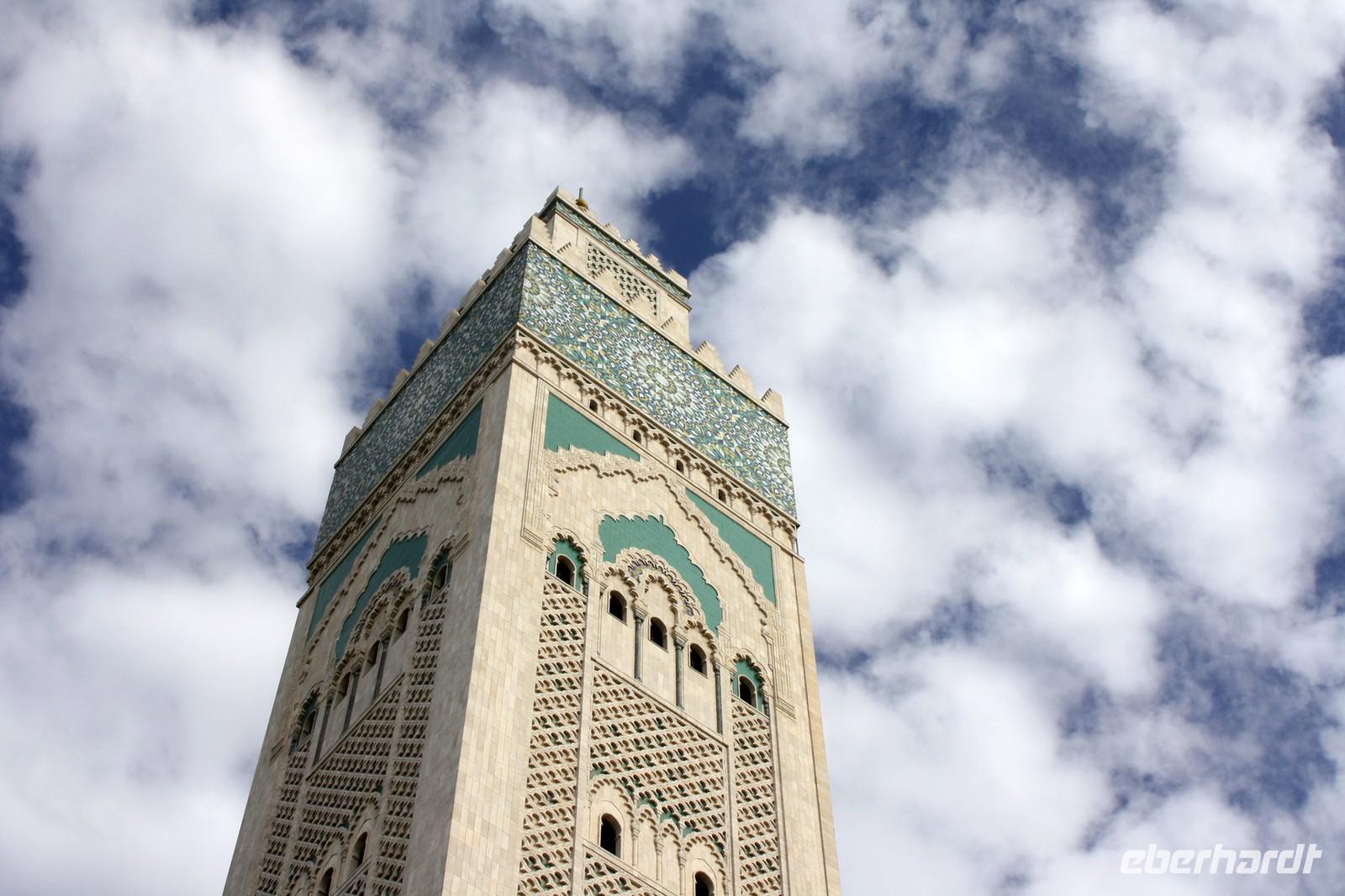 In der Moschee Hassan II. war 14.00 Uhr für uns Einlass und Mohammed machte mit uns eine ausführliche Runde in dem riesigen Bauwerk. Die Moschee ist teilweise auf Wasser gebaut und war in sechs Jahren fertig gestellt worden. Offiziell war das Gotteshaus ein Geschenk des Volkes an seinen König, aber wir erfuhren, dass von jedem Bürger des Landes eine Spende erzwungen wurde, dadurch war der Bau in die Kritik geraten. In einer der größten Moscheen der Welt finden bis zu 25.000 Personen Platz und ihr Minarett ist mit 210 Metern Höhe das höchste der Welt. Wir besichtigten auch den größten und schwersten Kronleuchter des Gebäudes (2,5 Tonnen) und den großen Hamam in den unteren Etagen.