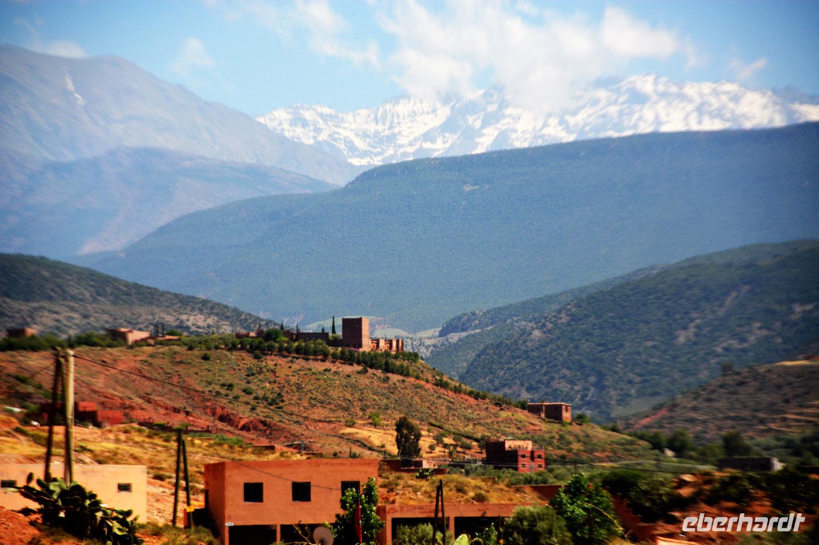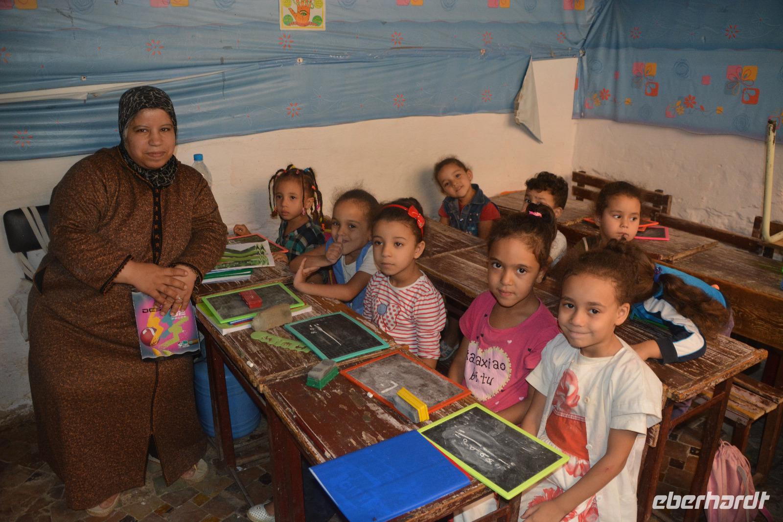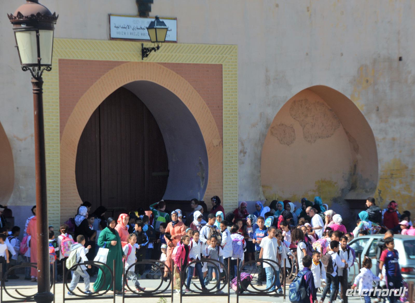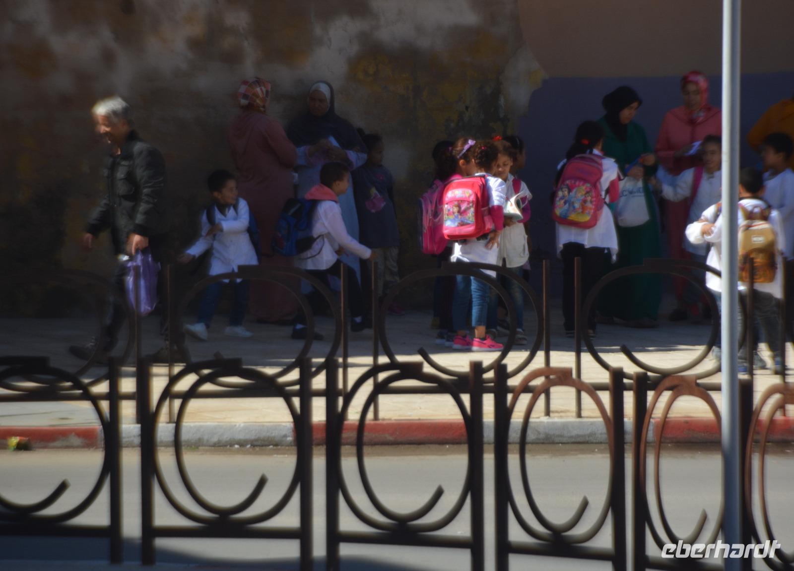 An einer kleinen Koranschule machen wir Stopp und begrüßen die Kleinen, die hier die ersten Buchstaben lernen. Arabisch ist eine komplizierte Sprache und Schrift und schon frühzeitig müssen die Kinder dafür lernen. Nur dann kann man den Koran in Originalfassung überhaupt lesen. Dazu muss man Hocharabisch studieren und nicht nur den marokkanischen Dialekt. Die Marokkaner lernen teilweise bis zu 4 Sprachen bis sie die Schule verlassen: Tifinagh, die Sprache der der Berber, marokkanisches Arabisch und Hocharabisch, Französisch oder Spanisch und Englisch. Wir werden sogar teilweise auf Deutsch angesprochen, nun auch als fliegender Händler sollte man die Kunden in ihrer Landessprache anreden....!Das hebt den Umsatz!