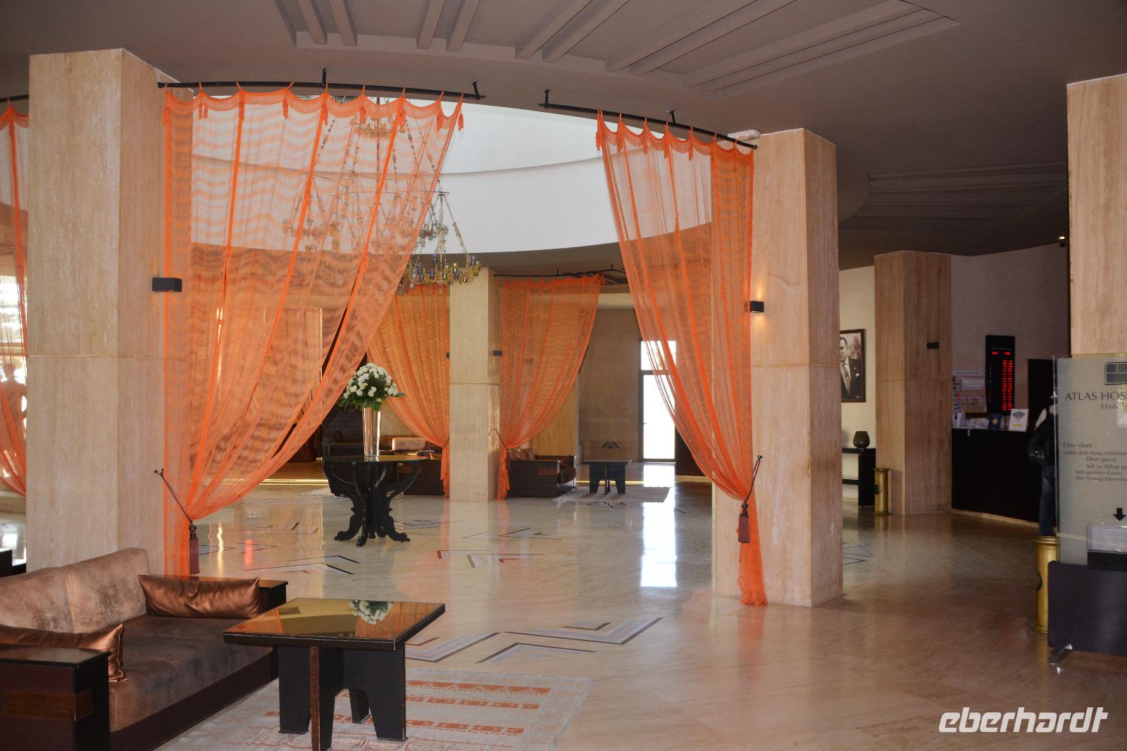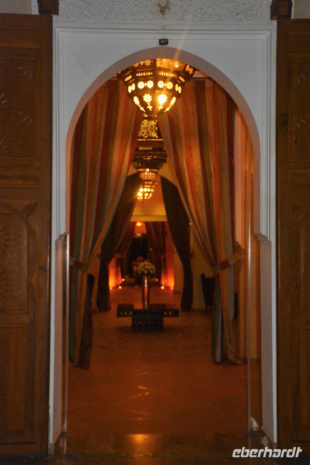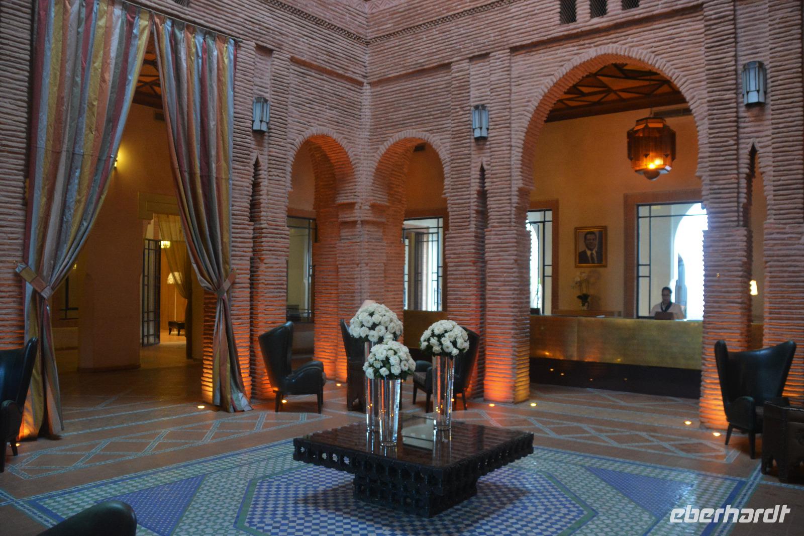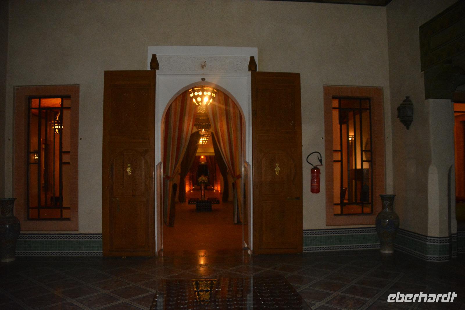 Da die Teilnehmer aus verschiedenen Regionen Deutschlands kommen treffen wir uns das erste Mal am Flughafen von Frankfurt. Obwohl das Wetter auch in Deutschland vielversprechend ist, freuen wir uns doch auf noch etwas wärmere afrikanische Temperaturen während unserer Rundreise durch Marokko. Nach einem kurzen Kennenlernen am Frankfurter Flughafen starten wir pünktlich mit Lufthansa in Richtung Marrakesch. Eine Flugreise des marokkanischen Königs sorgt dafür, dass wir 2 Stunden später als geplant in Marrakesch landen und wir durch die verschiedenen daraus resultierenden Flugverzögerungen sehr viel später als geplant im Hotel ankommen. Trotzdem bekommen wir den Flair unseres Hotels mit und lassen uns ein reichhaltiges Abendessen schmecken.