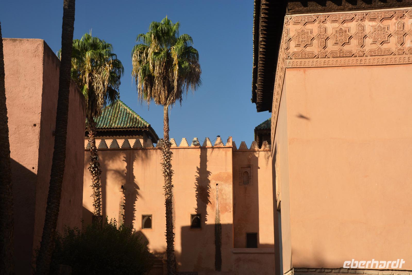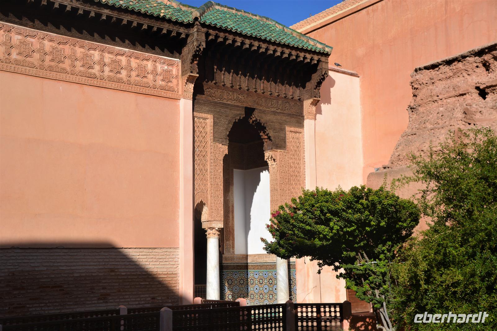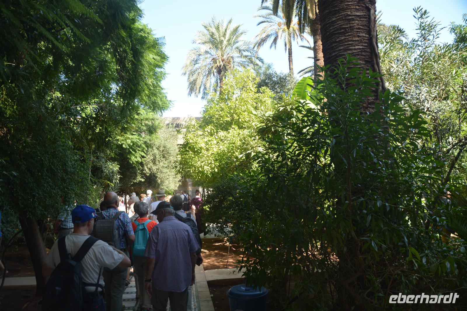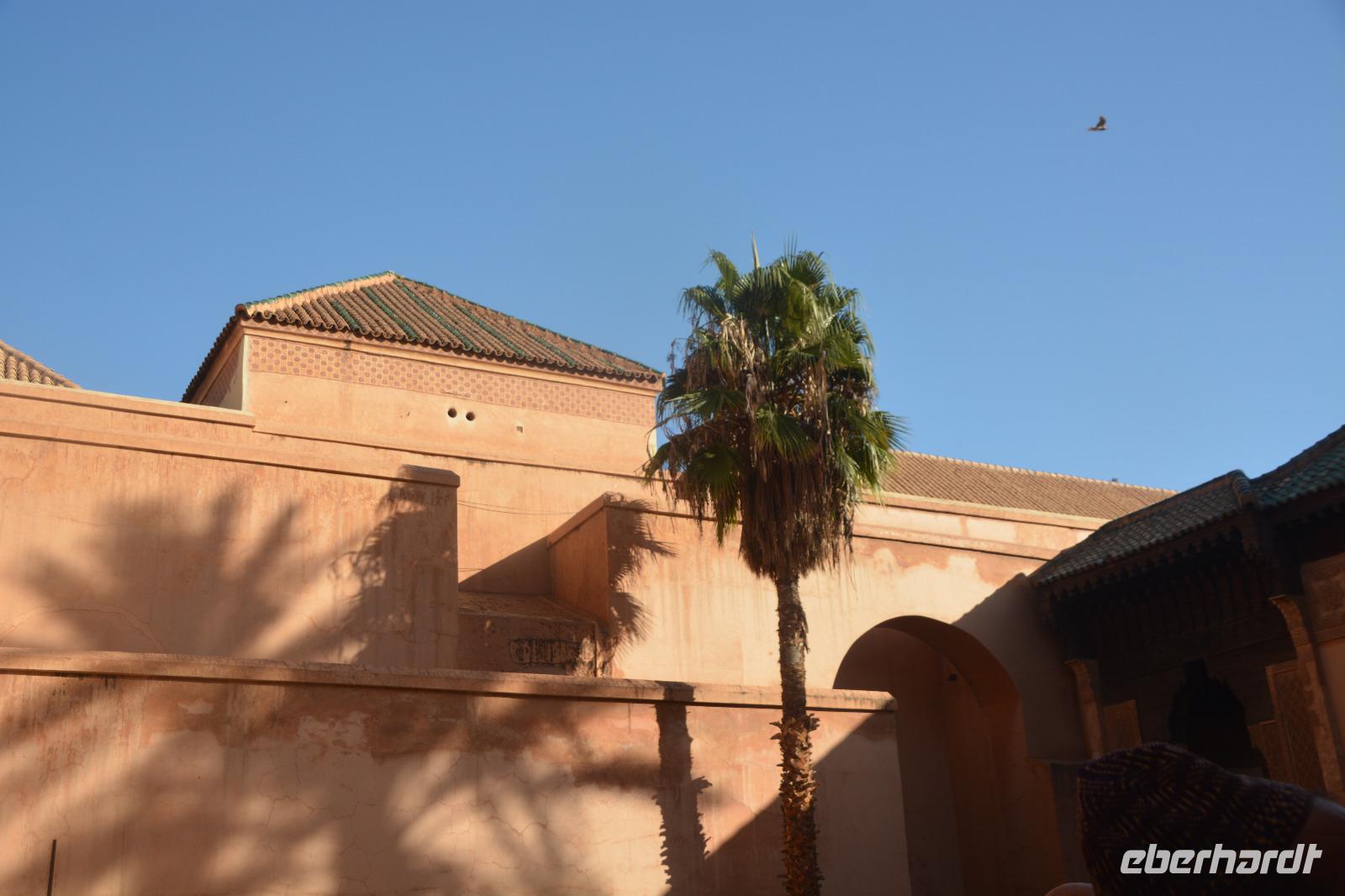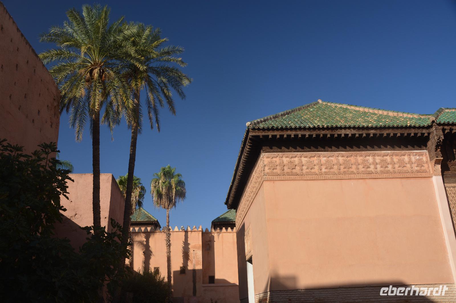 Nach einem sehr üppigen Frühstück fahren wir mit unserem Bus in Richtung Medina und bekommen erst einmal einen kleinen Eindruck von den sie umgebenden Stadtteilen, die sog. "Ville Nouvelles", der Neustadt und dem Stadtviertel Guèliz, wo sich das moderne Leben abspielt. Auch am Morgen ist der Verkehr schon beachtlich und wir bewundern unseren Fahrer wie er den Verkehr souverän meistert. Unser erster Haltepunkt sind die Saadiergräber, welche erst im 19.Jahrhundert von den Franzosen durch Luftaufnahmen entdeckt wurden. Wir versuchen, zu Fuß über die Straße zu gelangen, was uns auch gelingt. Bei dem besonderen Fahrstil der Marokkaner kommt es auf Unerschrockenheit und Flexibilität im Straßenverkehr an. Wir bewundern die handwerklich kunstvoll angelegten Gräber die einerseits schlicht sind aber auch die Wichtigkeit der einst lebenden Saaditen-Herrscher ausdrücken. Wir erfahren etwas über die Totenruhe im Islam und den Respekt der ihnen von den Überlebenden gezollt wird. Weiter geht es am Vormittag zu einem der schönsten Paläste in Marrakesch, dem "Palais de la Bahia" aus dem 19.Jahrhundert. Diese zusätzliche Besichtigung wird von der Firma Eberhardt spendiert, hatten wir doch durch den "Königsvorfall" am Vortag eine sehr späte Anreise.