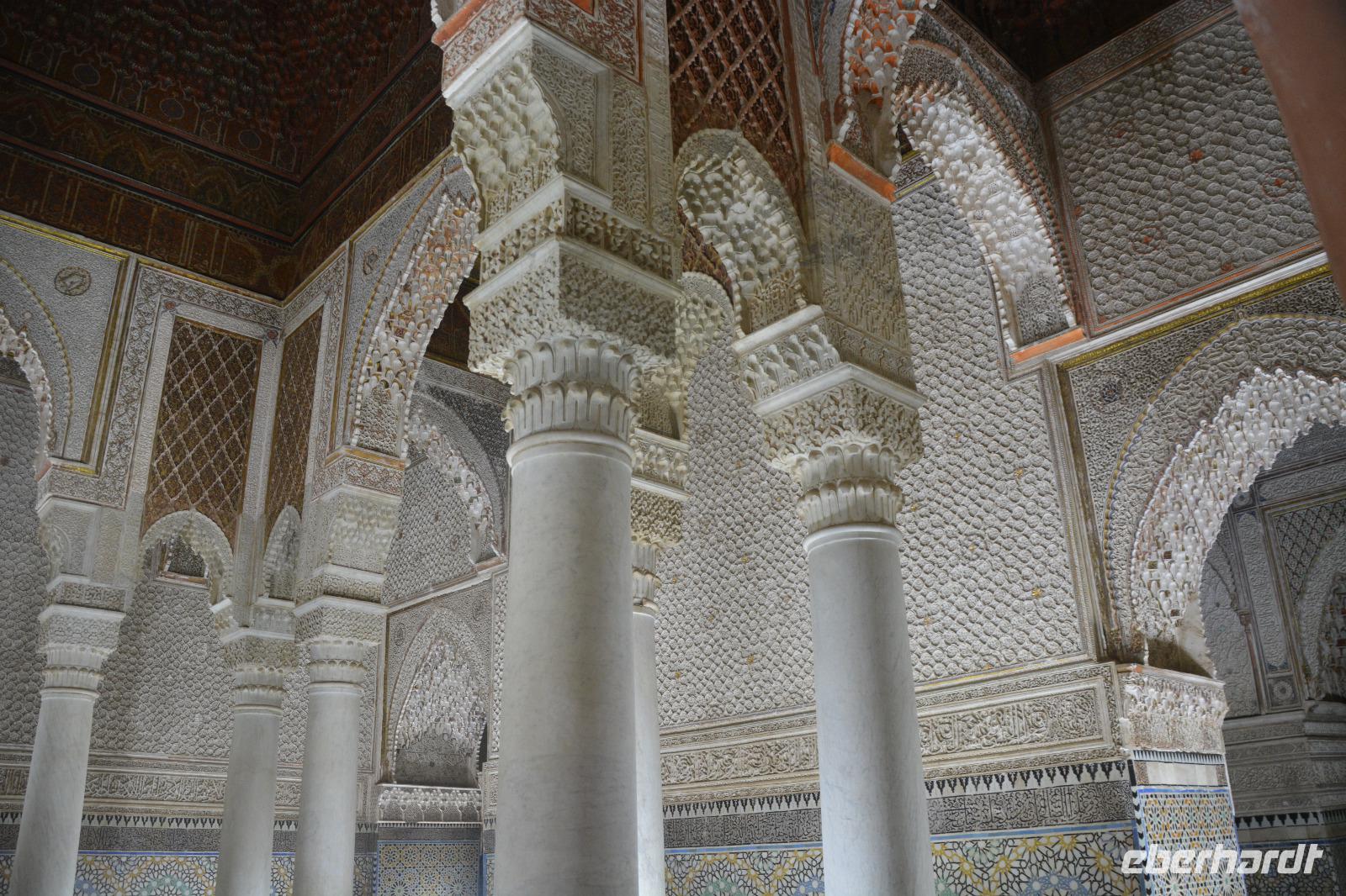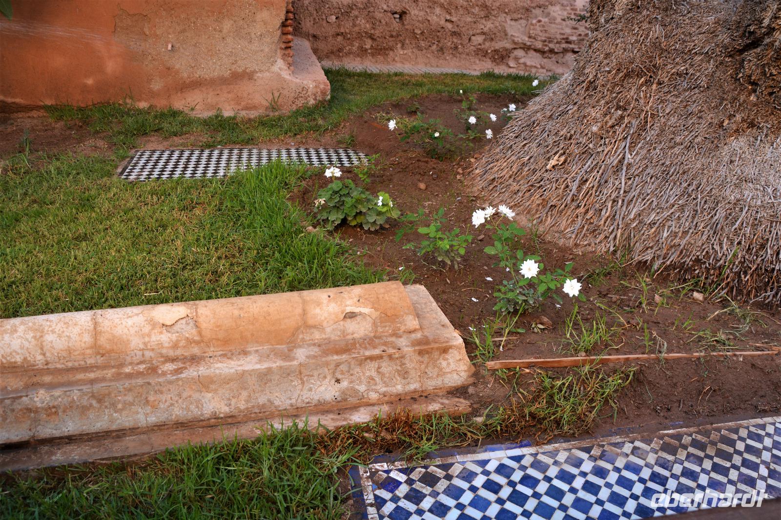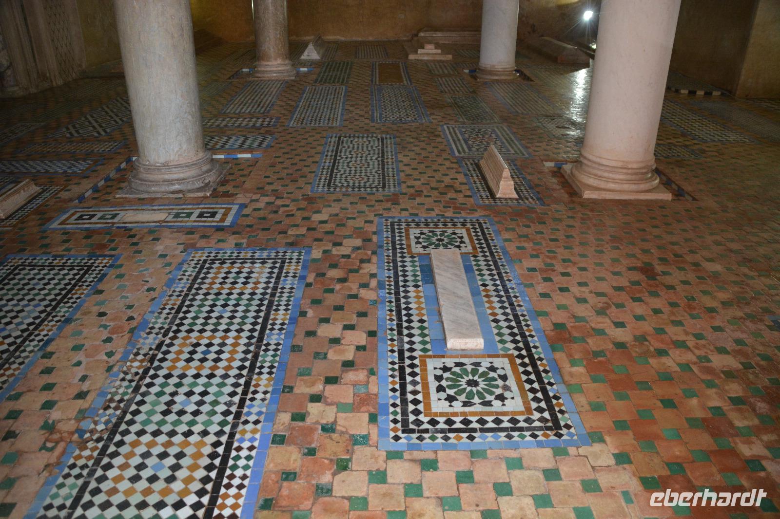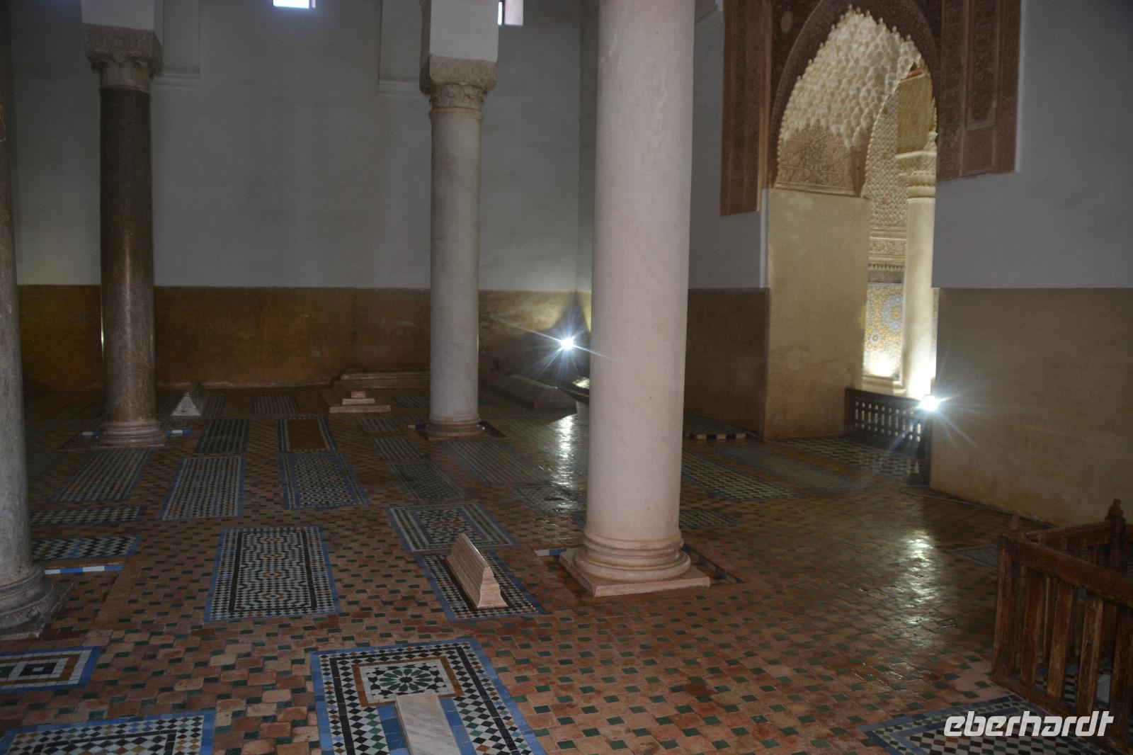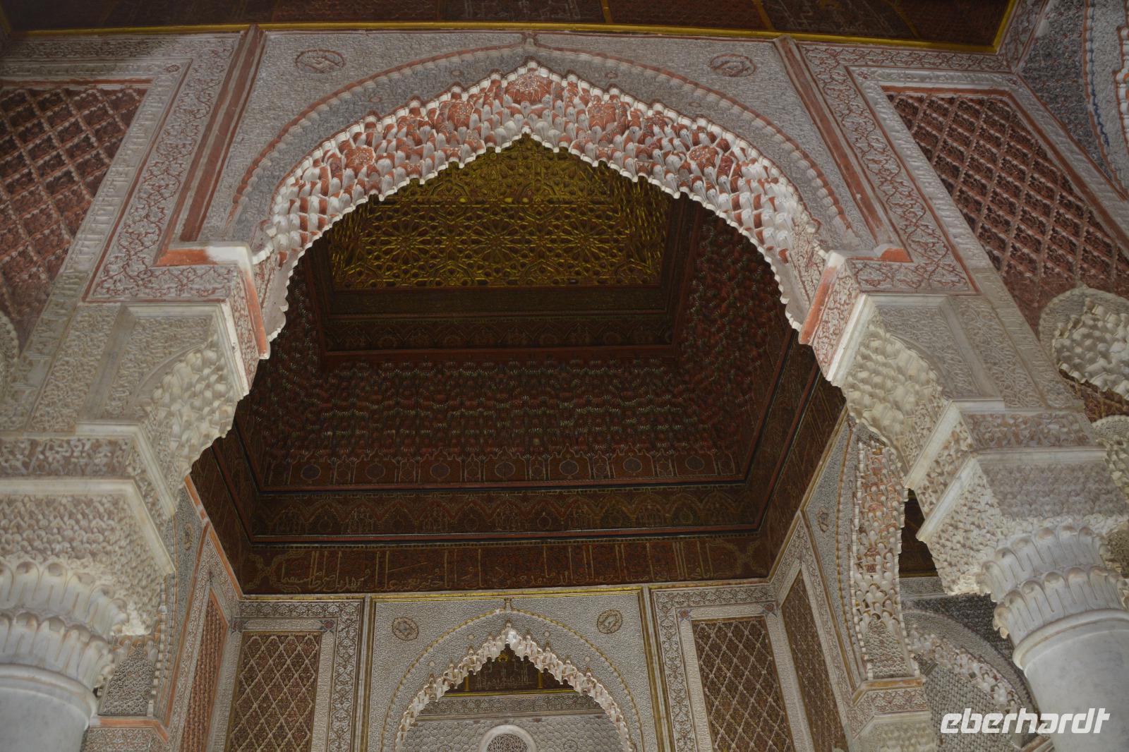 Nach einem sehr üppigen Frühstück fahren wir mit unserem Bus in Richtung Medina und bekommen erst einmal einen kleinen Eindruck von den sie umgebenden Stadtteilen, die sog. "Ville Nouvelles", der Neustadt und dem Stadtviertel Guèliz, wo sich das moderne Leben abspielt. Auch am Morgen ist der Verkehr schon beachtlich und wir bewundern unseren Fahrer wie er den Verkehr souverän meistert. Unser erster Haltepunkt sind die Saadiergräber, welche erst im 19.Jahrhundert von den Franzosen durch Luftaufnahmen entdeckt wurden. Wir versuchen, zu Fuß über die Straße zu gelangen, was uns auch gelingt. Bei dem besonderen Fahrstil der Marokkaner kommt es auf Unerschrockenheit und Flexibilität im Straßenverkehr an. Wir bewundern die handwerklich kunstvoll angelegten Gräber die einerseits schlicht sind aber auch die Wichtigkeit der einst lebenden Saaditen-Herrscher ausdrücken. Wir erfahren etwas über die Totenruhe im Islam und den Respekt der ihnen von den Überlebenden gezollt wird. Weiter geht es am Vormittag zu einem der schönsten Paläste in Marrakesch, dem "Palais de la Bahia" aus dem 19.Jahrhundert. Diese zusätzliche Besichtigung wird von der Firma Eberhardt spendiert, hatten wir doch durch den "Königsvorfall" am Vortag eine sehr späte Anreise.
