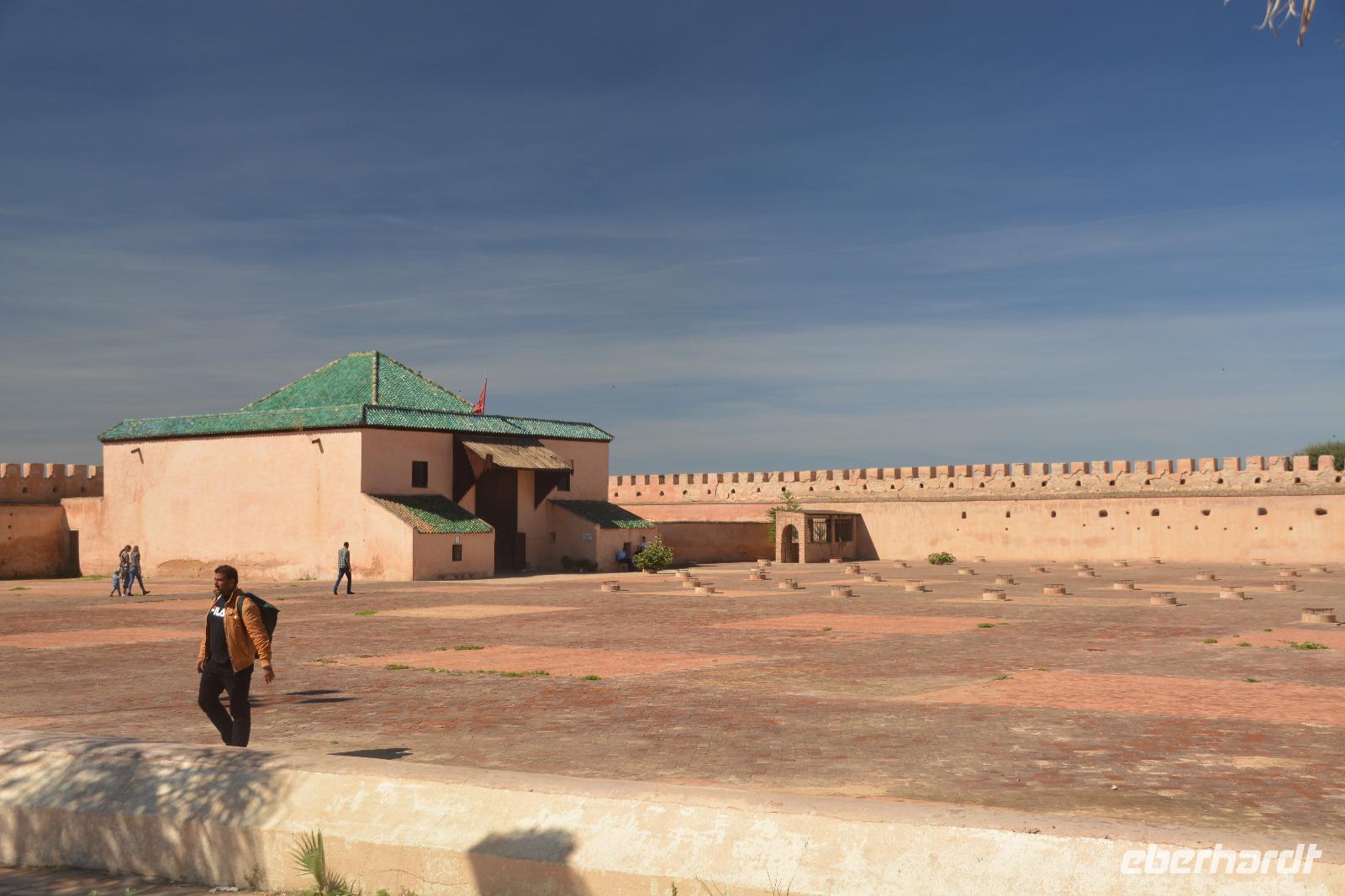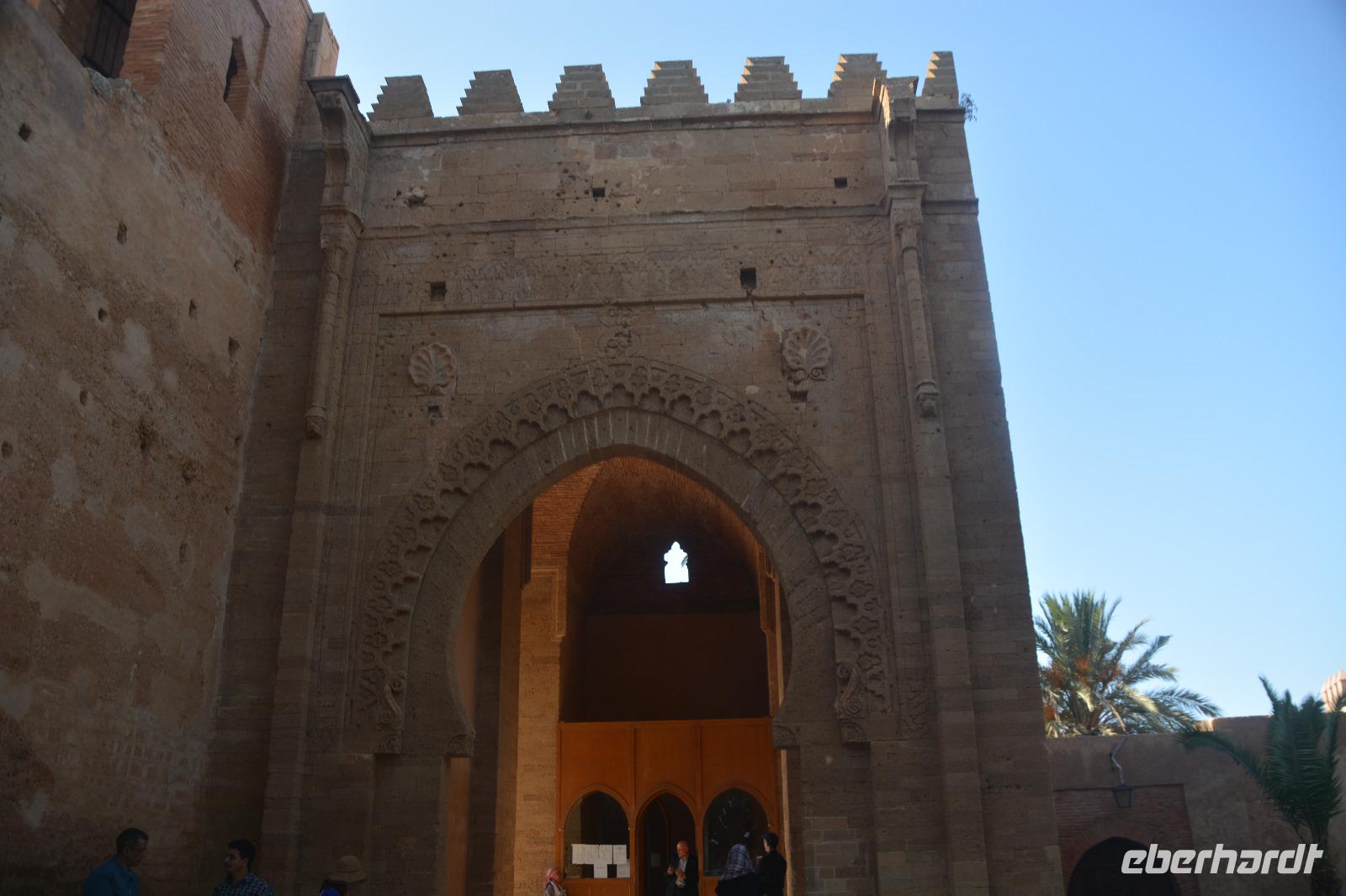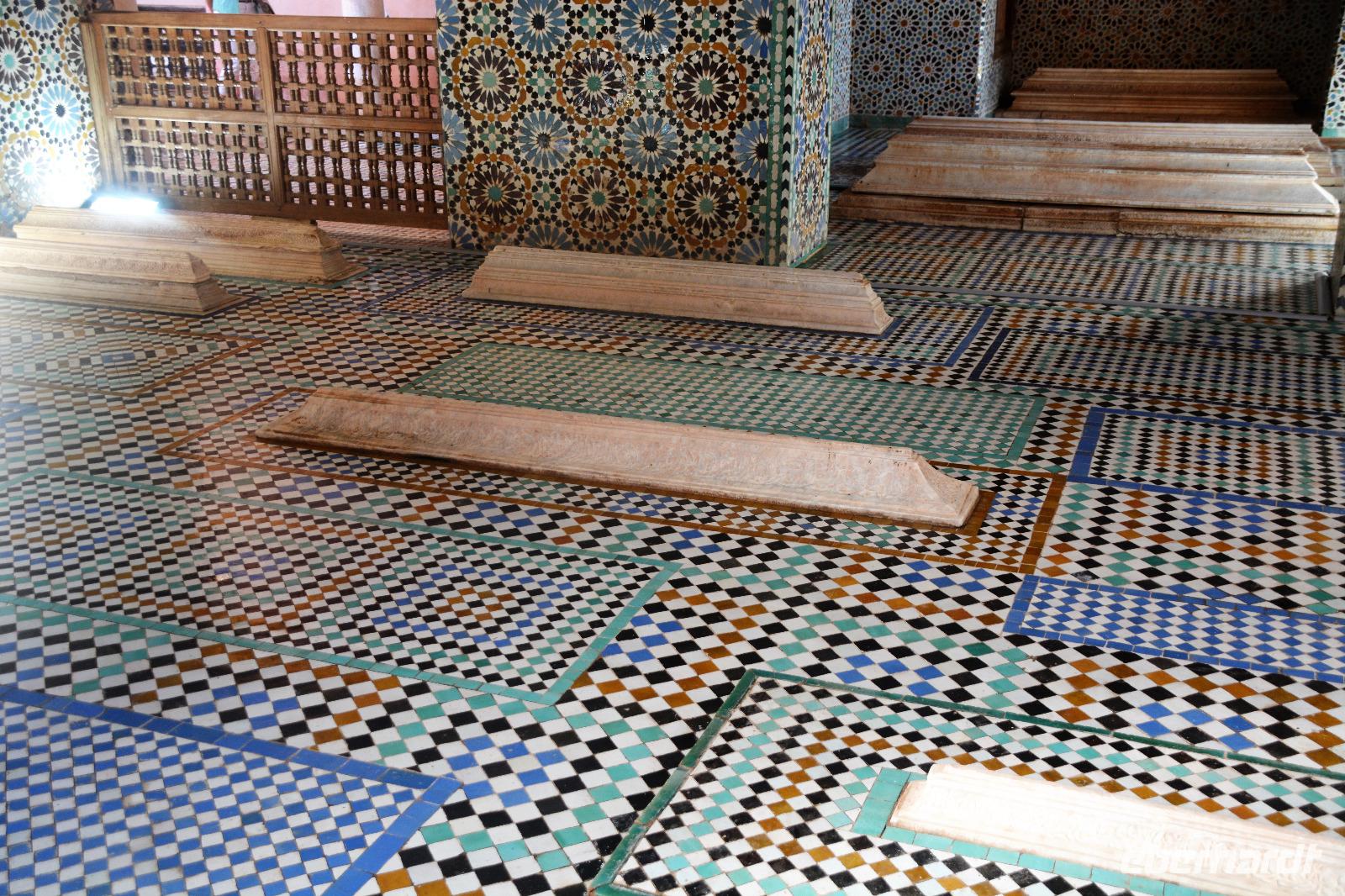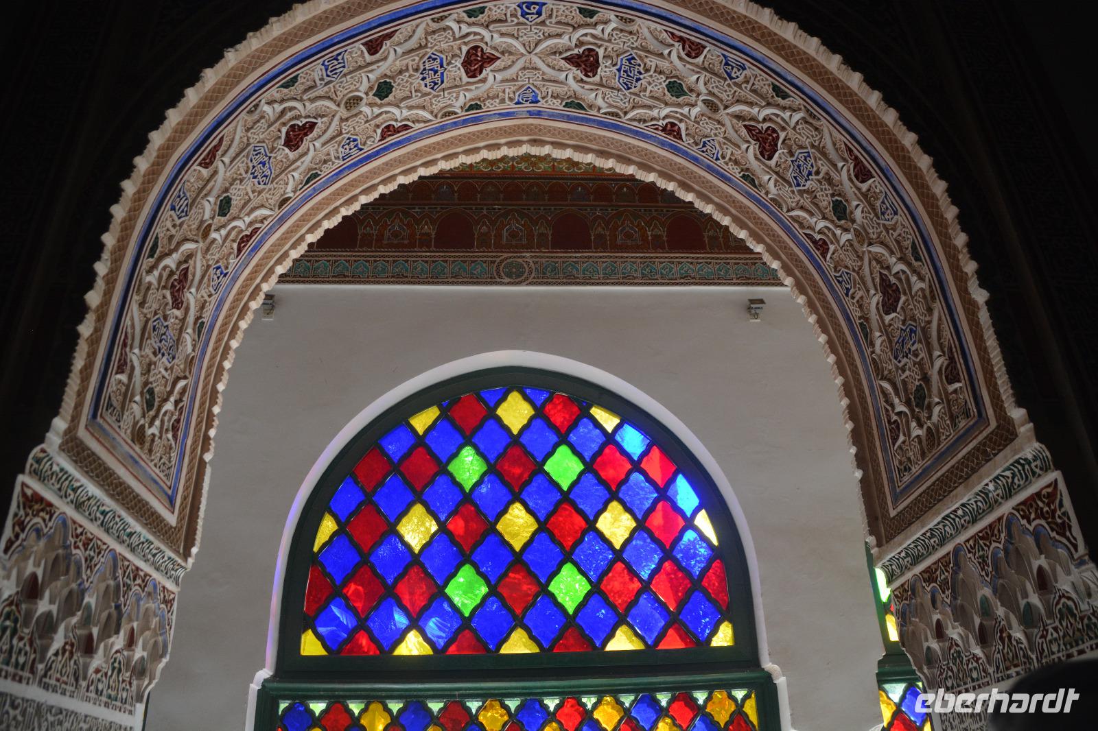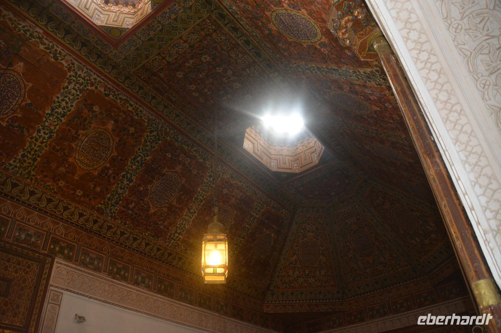 Nach einem sehr üppigen Frühstück fahren wir mit unserem Bus in Richtung Medina und bekommen erst einmal einen kleinen Eindruck von den sie umgebenden Stadtteilen, die sog. "Ville Nouvelles", der Neustadt und dem Stadtviertel Guèliz, wo sich das moderne Leben abspielt. Auch am Morgen ist der Verkehr schon beachtlich und wir bewundern unseren Fahrer wie er den Verkehr souverän meistert. Unser erster Haltepunkt sind die Saadiergräber, welche erst im 19.Jahrhundert von den Franzosen durch Luftaufnahmen entdeckt wurden. Wir versuchen, zu Fuß über die Straße zu gelangen, was uns auch gelingt. Bei dem besonderen Fahrstil der Marokkaner kommt es auf Unerschrockenheit und Flexibilität im Straßenverkehr an. Wir bewundern die handwerklich kunstvoll angelegten Gräber die einerseits schlicht sind aber auch die Wichtigkeit der einst lebenden Saaditen-Herrscher ausdrücken. Wir erfahren etwas über die Totenruhe im Islam und den Respekt der ihnen von den Überlebenden gezollt wird. Weiter geht es am Vormittag zu einem der schönsten Paläste in Marrakesch, dem "Palais de la Bahia" aus dem 19.Jahrhundert. Diese zusätzliche Besichtigung wird von der Firma Eberhardt spendiert, hatten wir doch durch den "Königsvorfall" am Vortag eine sehr späte Anreise.