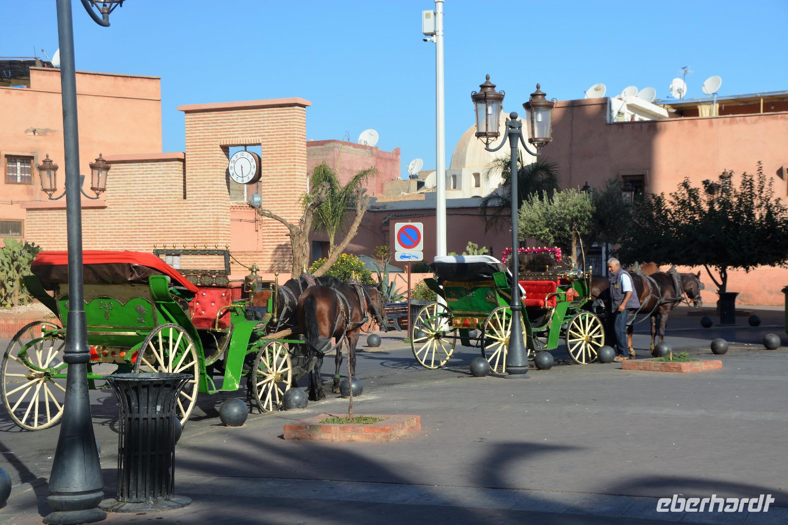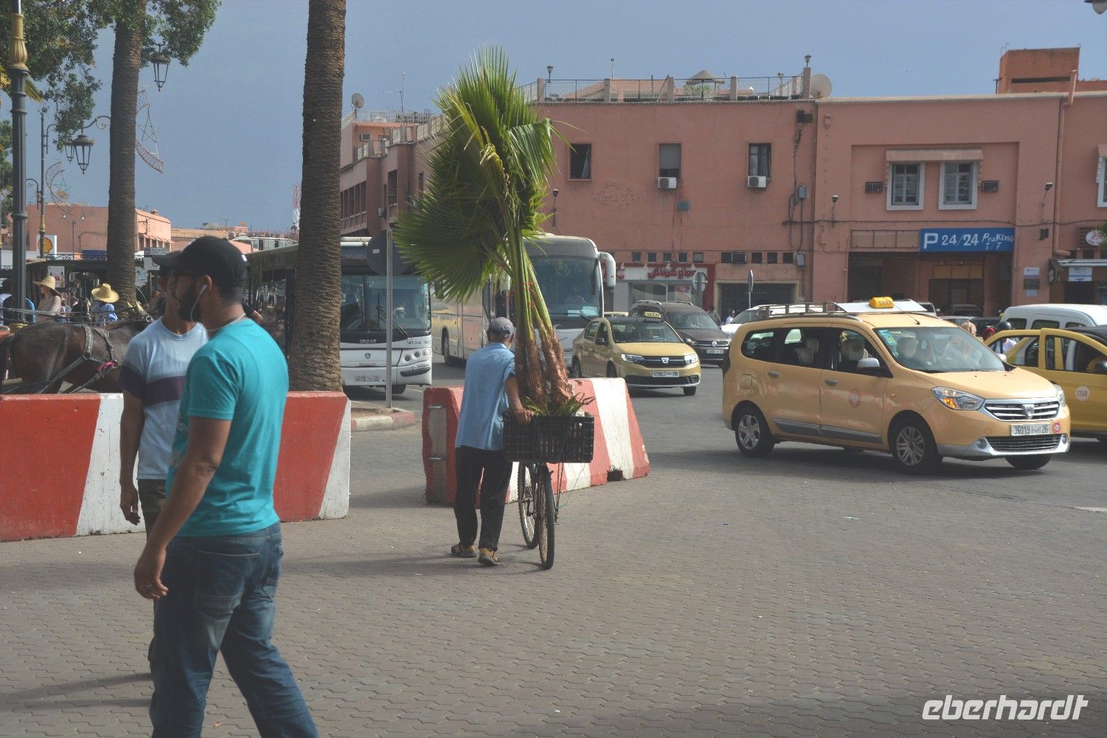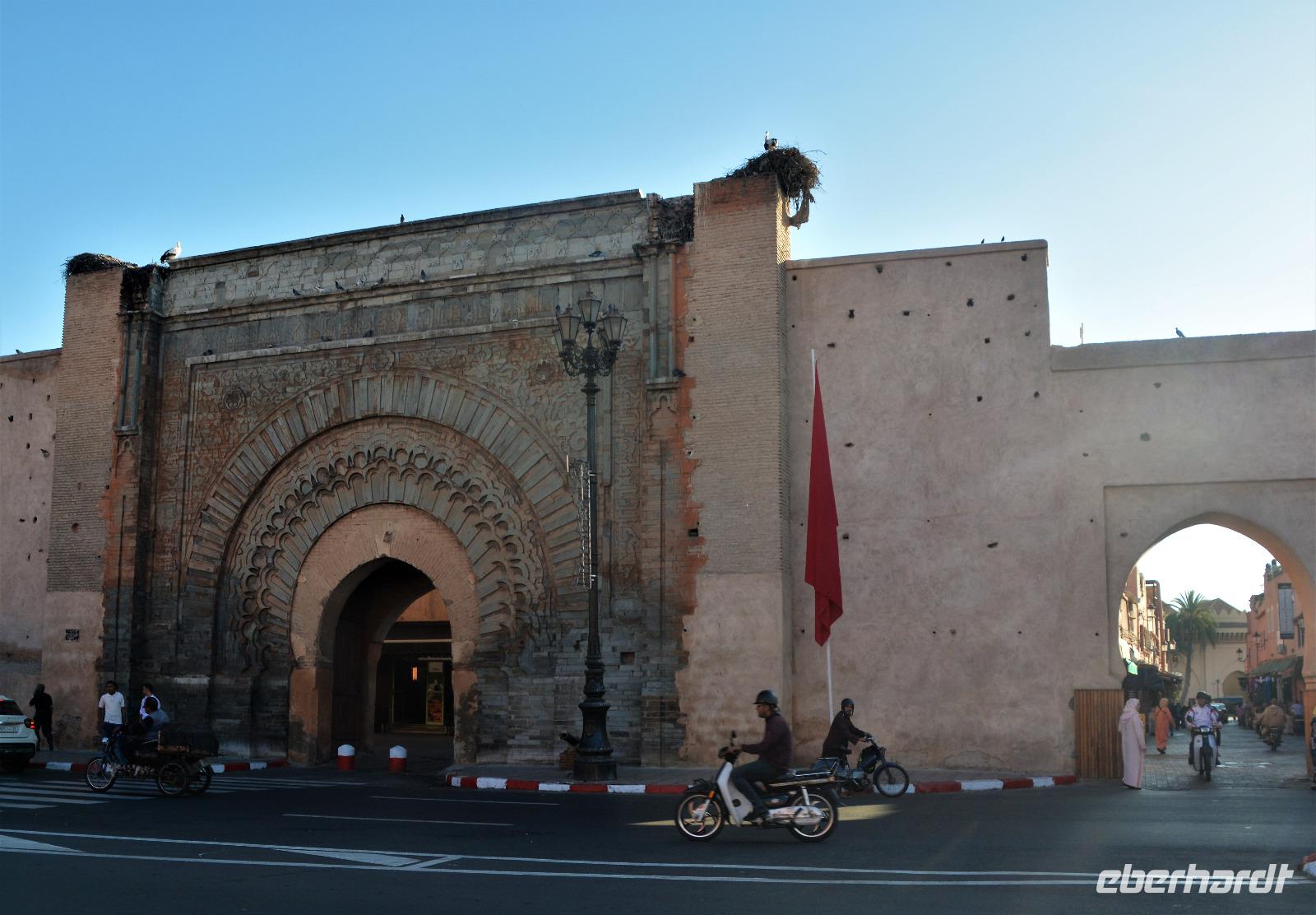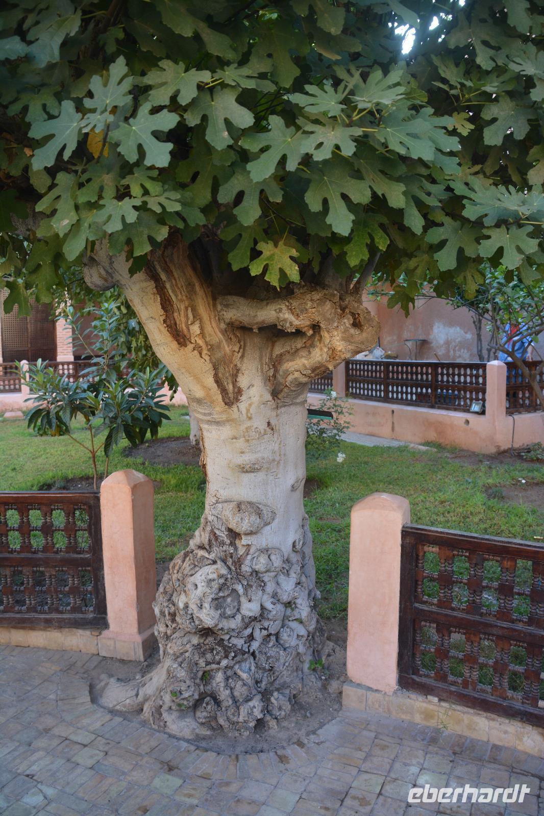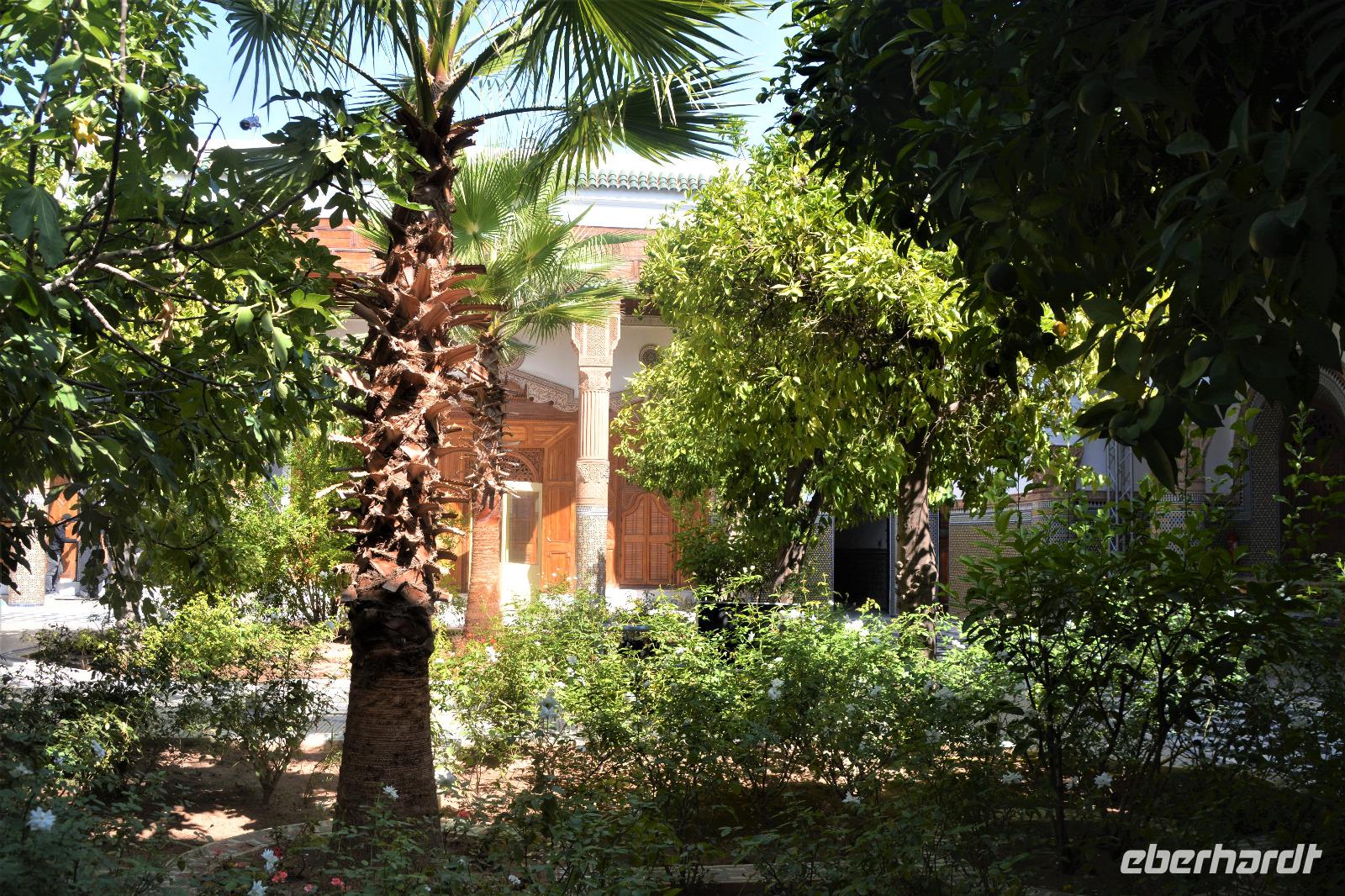 Nach einem sehr üppigen Frühstück fahren wir mit unserem Bus in Richtung Medina und bekommen erst einmal einen kleinen Eindruck von den sie umgebenden Stadtteilen, die sog. "Ville Nouvelles", der Neustadt und dem Stadtviertel Guèliz, wo sich das moderne Leben abspielt. Auch am Morgen ist der Verkehr schon beachtlich und wir bewundern unseren Fahrer wie er den Verkehr souverän meistert. Unser erster Haltepunkt sind die Saadiergräber, welche erst im 19.Jahrhundert von den Franzosen durch Luftaufnahmen entdeckt wurden. Wir versuchen, zu Fuß über die Straße zu gelangen, was uns auch gelingt. Bei dem besonderen Fahrstil der Marokkaner kommt es auf Unerschrockenheit und Flexibilität im Straßenverkehr an. Wir bewundern die handwerklich kunstvoll angelegten Gräber die einerseits schlicht sind aber auch die Wichtigkeit der einst lebenden Saaditen-Herrscher ausdrücken. Wir erfahren etwas über die Totenruhe im Islam und den Respekt der ihnen von den Überlebenden gezollt wird. Weiter geht es am Vormittag zu einem der schönsten Paläste in Marrakesch, dem "Palais de la Bahia" aus dem 19.Jahrhundert. Diese zusätzliche Besichtigung wird von der Firma Eberhardt spendiert, hatten wir doch durch den "Königsvorfall" am Vortag eine sehr späte Anreise.