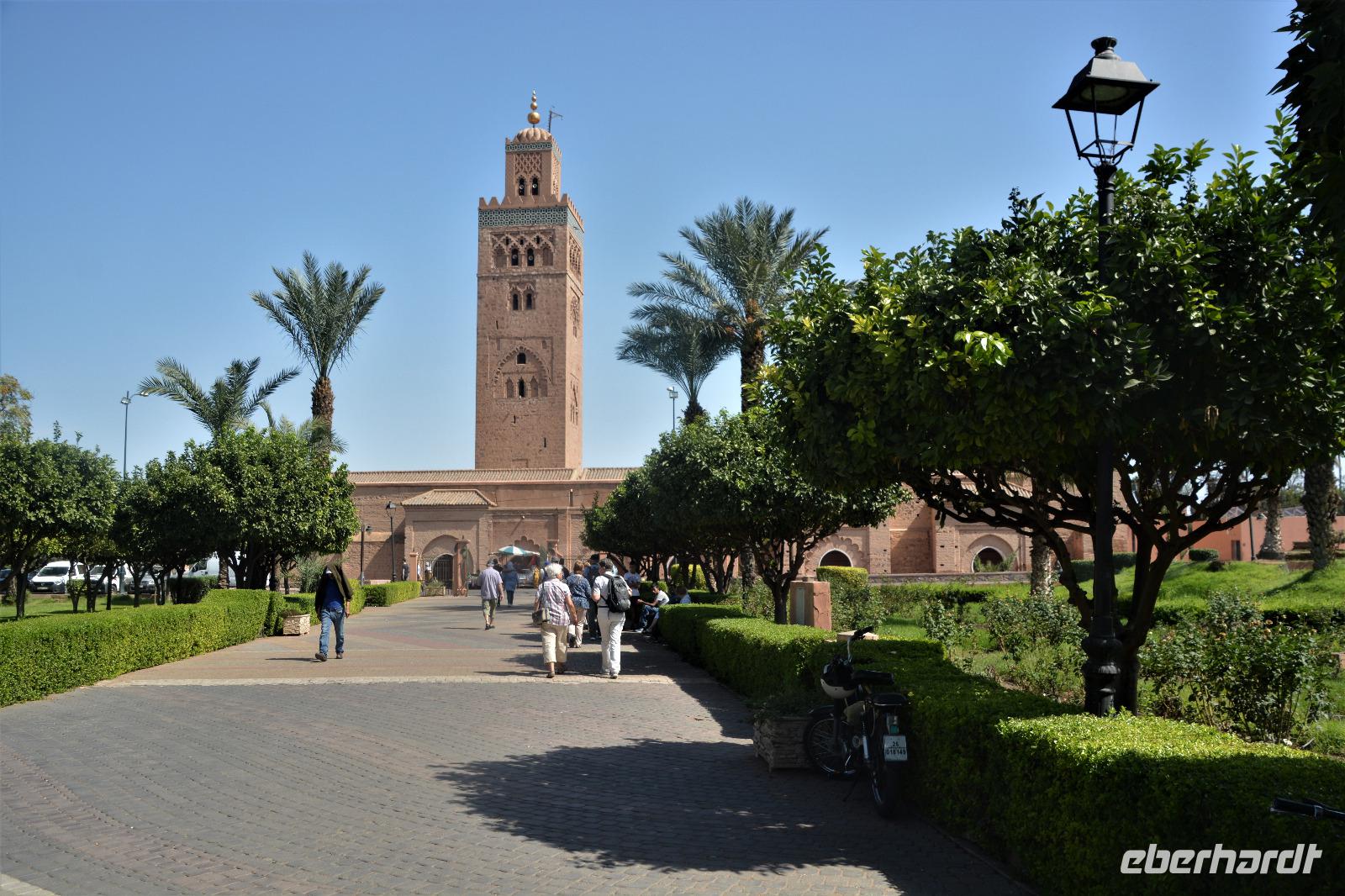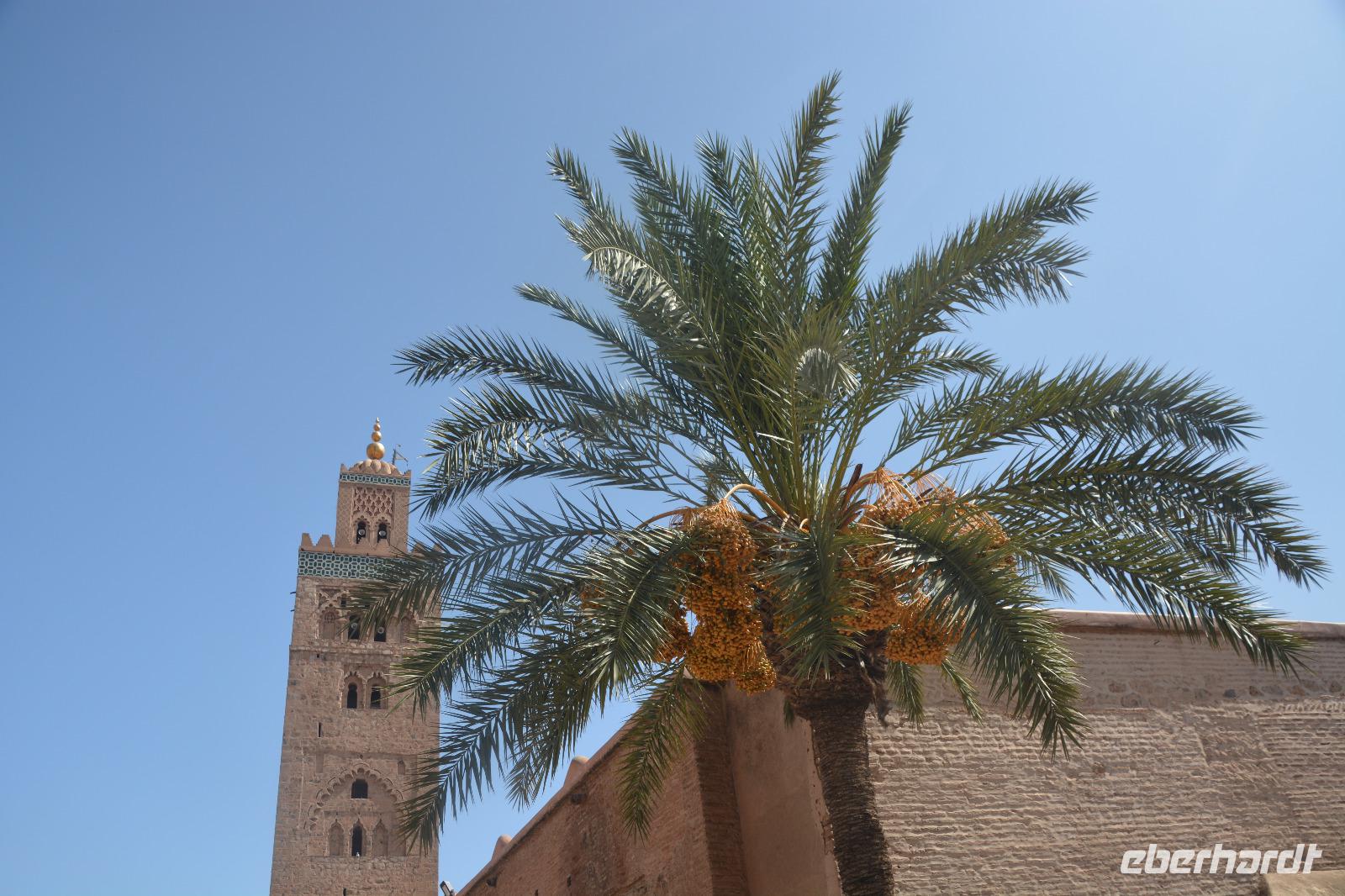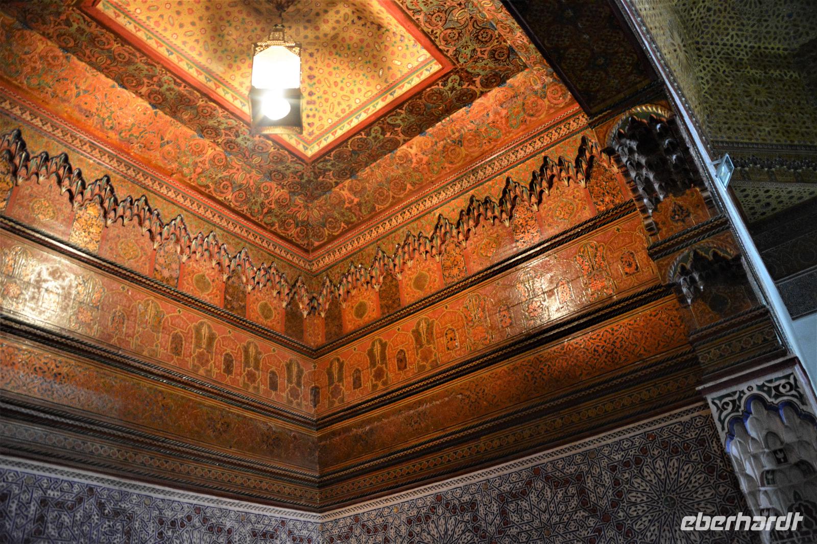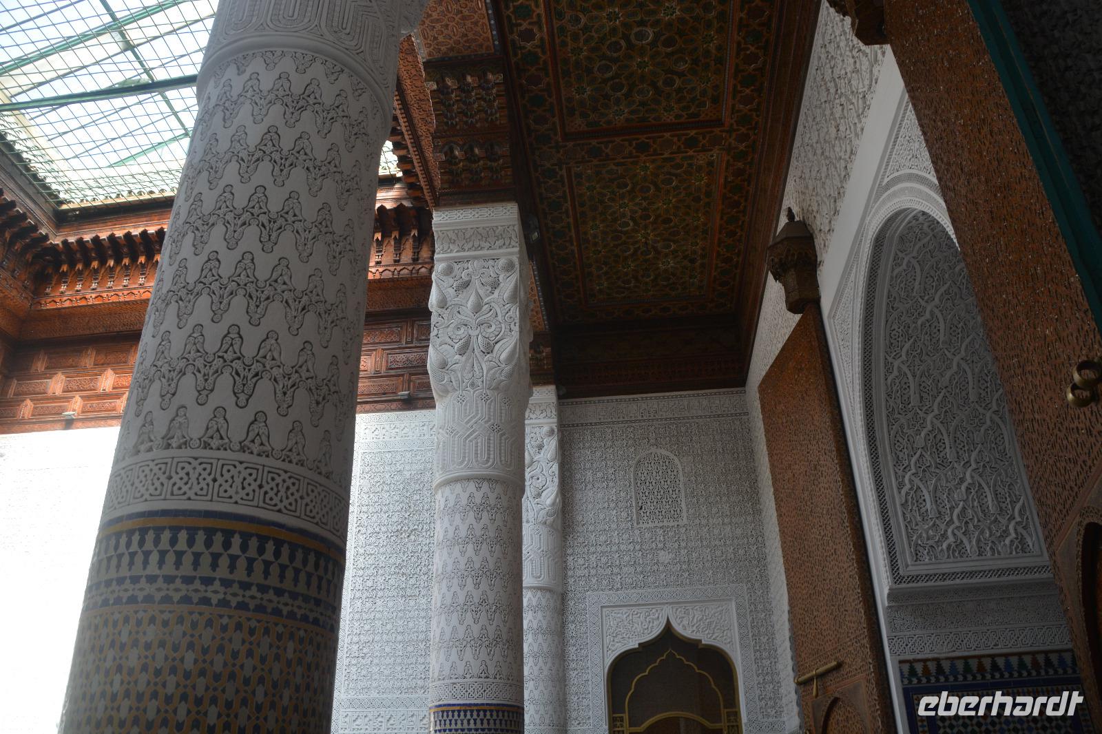 Durch einen langen mehrfach geknickten, geheimnisvollen Flur gelangen wir in einen Garten von dem mehrere Zimmer abgehen. Die Bewohner(innen) dieser Zimmer hatten einen wunderschönen Ausblick auf grüne Pflanzen und einen Brunnen in der Mitte. Alles das war der richtige Aufenthaltsort in einer Stadt, die für ihr trockenes heißes Klima bekannt ist. Durch die nach innen ausgerichteten Räume gelingt es, in traditionellen Häusern ohne Klimaanlage, die Kühle in den Räumen auch bei extrem hohen Temperaturen zu bewahren. Die wunderschönen "zellige" Dekorationen, die kunstvolle Stukkatur und die bemahlten Holzdecken lassen uns die Exotik des alten Marokko erahnen. Ein schöner Raum reiht sich an den anderen. Nicht nur wir finden den Palast sehr schön und wir sind froh, daß wir nach diesem Besuch ein wenig in einem kleinen Kaffee entspannen können. Wenn das "Palais de la Bahia" schon schön war, so erfährt die Ausstattung eine Steigerung in dem Palast "Dar el Bacha", erbaut vom Pascha "El Glaoui". Wir erfahren etwas über die Mächtigkeit dieses Mannes und seine Bedeutung für Marokko im 20.Jahrhundert. Dieser Palast, welcher demnächst mal wieder als Filmkulisse gemietet ist, diente schon zahlreichen Filmteams als Drehort. Mit der "Koutoubia-Moschee" tauchen wir ein in die Zeit der Almohaden, eine Dynastie welche im 12.Jahrhundert den Grundstein für die Moschee legte und auch den marokkanischen nationalen Baustil formte. Alle Moscheen in Marokko haben heute ein viereckiges Minarett in bestimmten Proportionen.