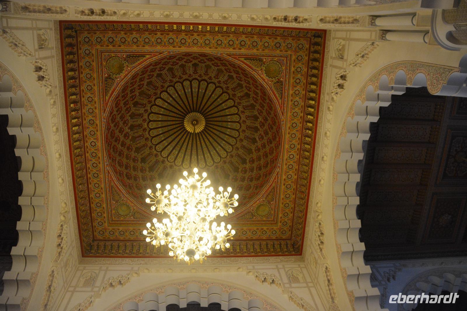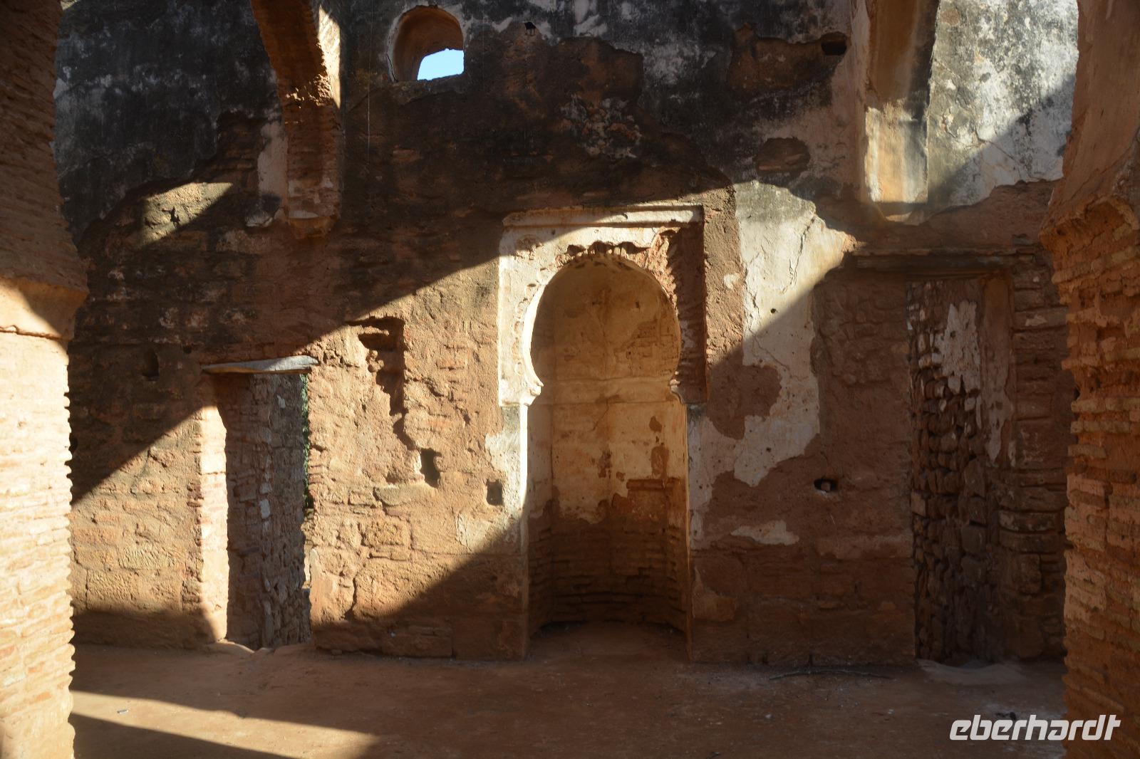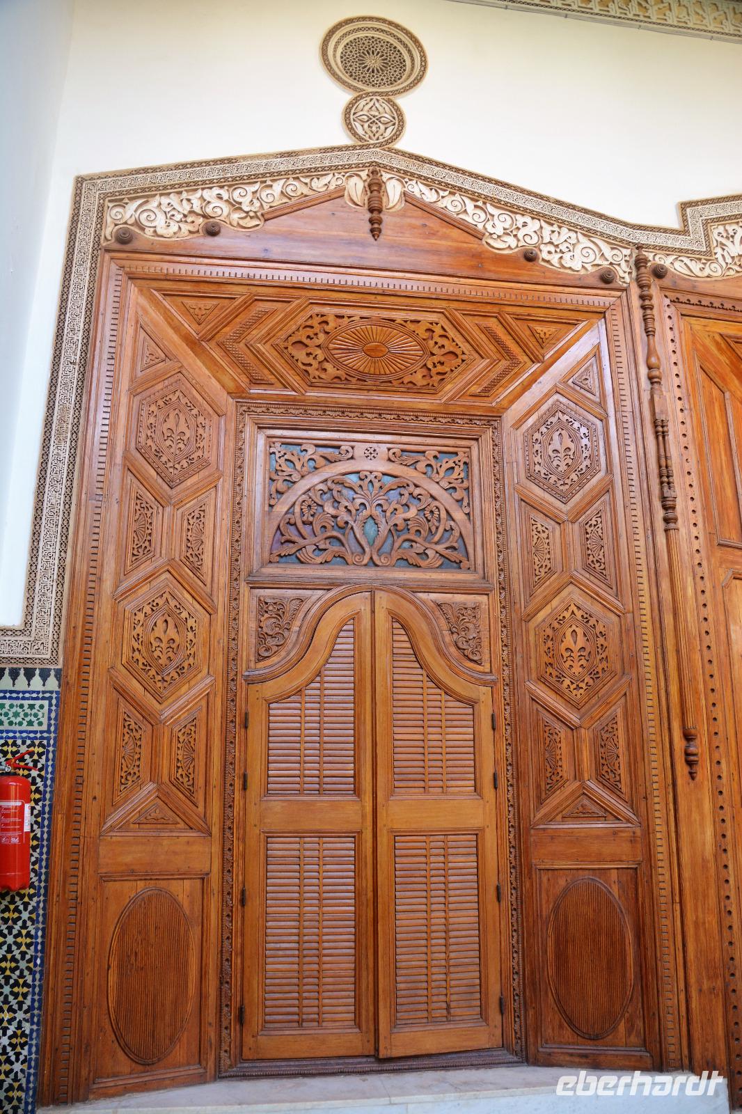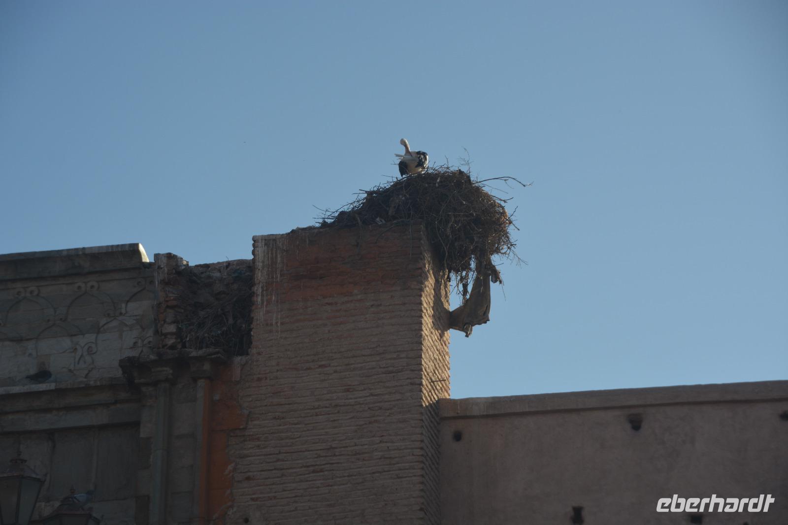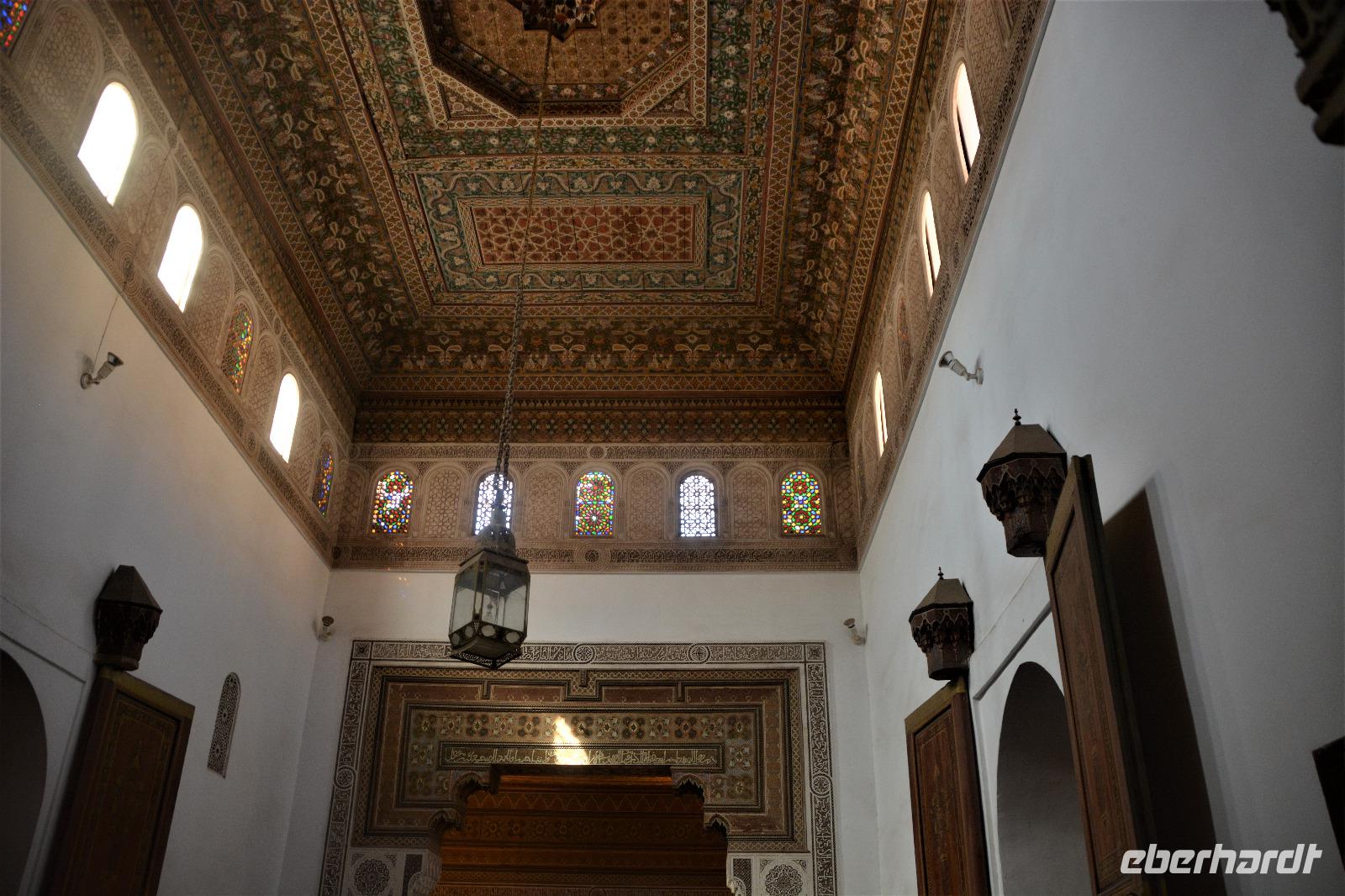 Durch einen langen mehrfach geknickten, geheimnisvollen Flur gelangen wir in einen Garten von dem mehrere Zimmer abgehen. Die Bewohner(innen) dieser Zimmer hatten einen wunderschönen Ausblick auf grüne Pflanzen und einen Brunnen in der Mitte. Alles das war der richtige Aufenthaltsort in einer Stadt, die für ihr trockenes heißes Klima bekannt ist. Durch die nach innen ausgerichteten Räume gelingt es, in traditionellen Häusern ohne Klimaanlage, die Kühle in den Räumen auch bei extrem hohen Temperaturen zu bewahren. Die wunderschönen "zellige" Dekorationen, die kunstvolle Stukkatur und die bemahlten Holzdecken lassen uns die Exotik des alten Marokko erahnen. Ein schöner Raum reiht sich an den anderen. Nicht nur wir finden den Palast sehr schön und wir sind froh, daß wir nach diesem Besuch ein wenig in einem kleinen Kaffee entspannen können. Wenn das "Palais de la Bahia" schon schön war, so erfährt die Ausstattung eine Steigerung in dem Palast "Dar el Bacha", erbaut vom Pascha "El Glaoui". Wir erfahren etwas über die Mächtigkeit dieses Mannes und seine Bedeutung für Marokko im 20.Jahrhundert. Dieser Palast, welcher demnächst mal wieder als Filmkulisse gemietet ist, diente schon zahlreichen Filmteams als Drehort. Mit der "Koutoubia-Moschee" tauchen wir ein in die Zeit der Almohaden, eine Dynastie welche im 12.Jahrhundert den Grundstein für die Moschee legte und auch den marokkanischen nationalen Baustil formte. Alle Moscheen in Marokko haben heute ein viereckiges Minarett in bestimmten Proportionen.