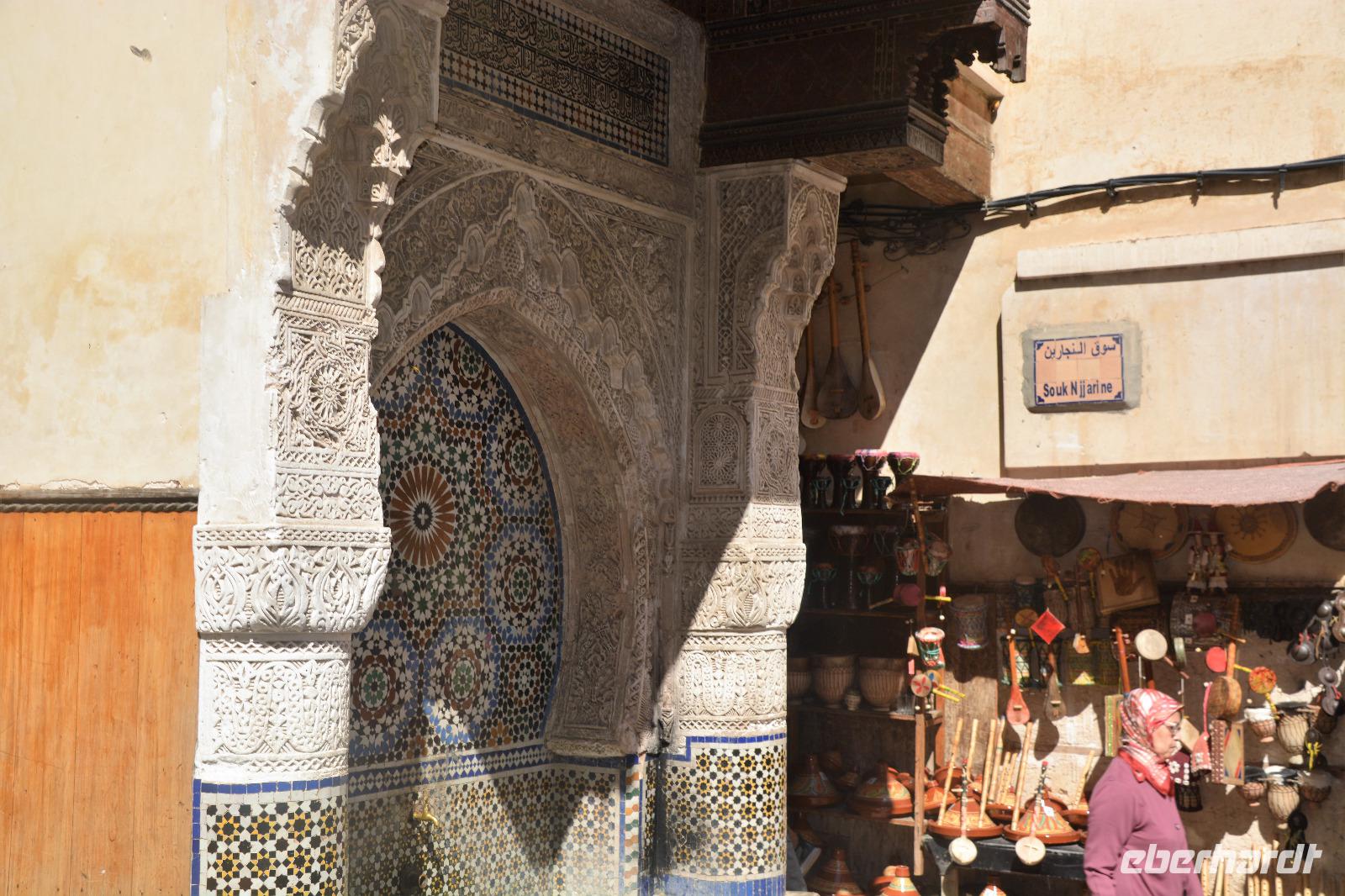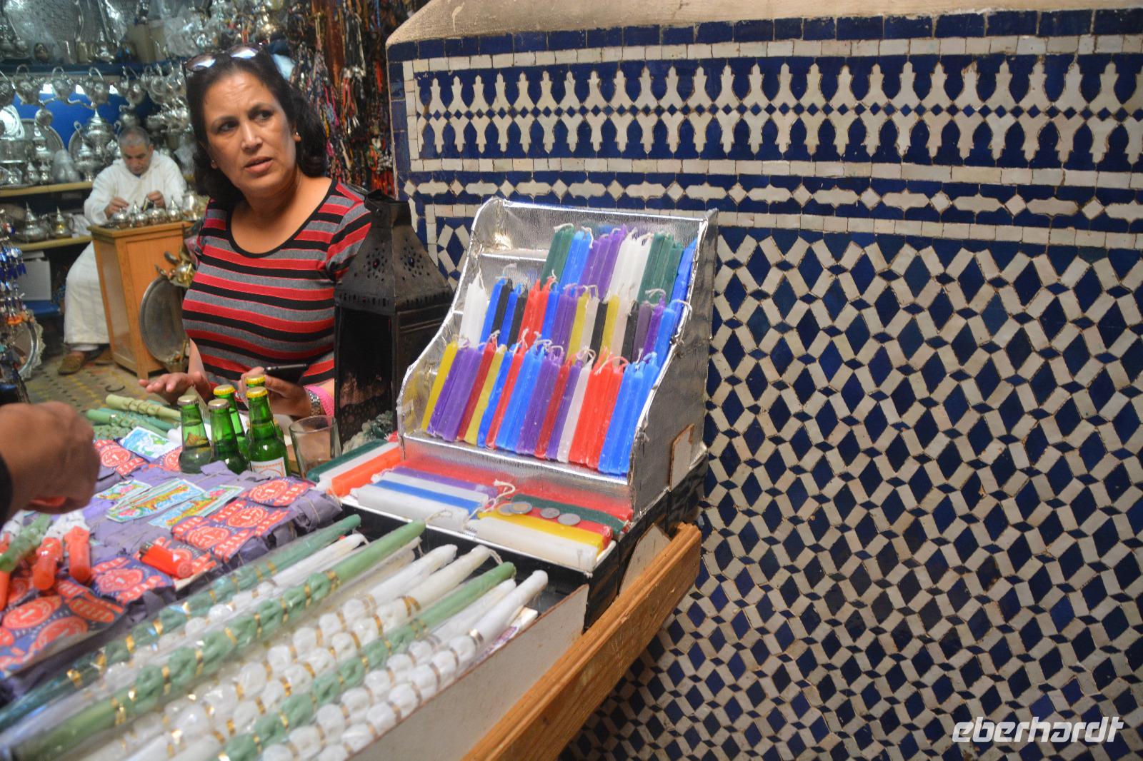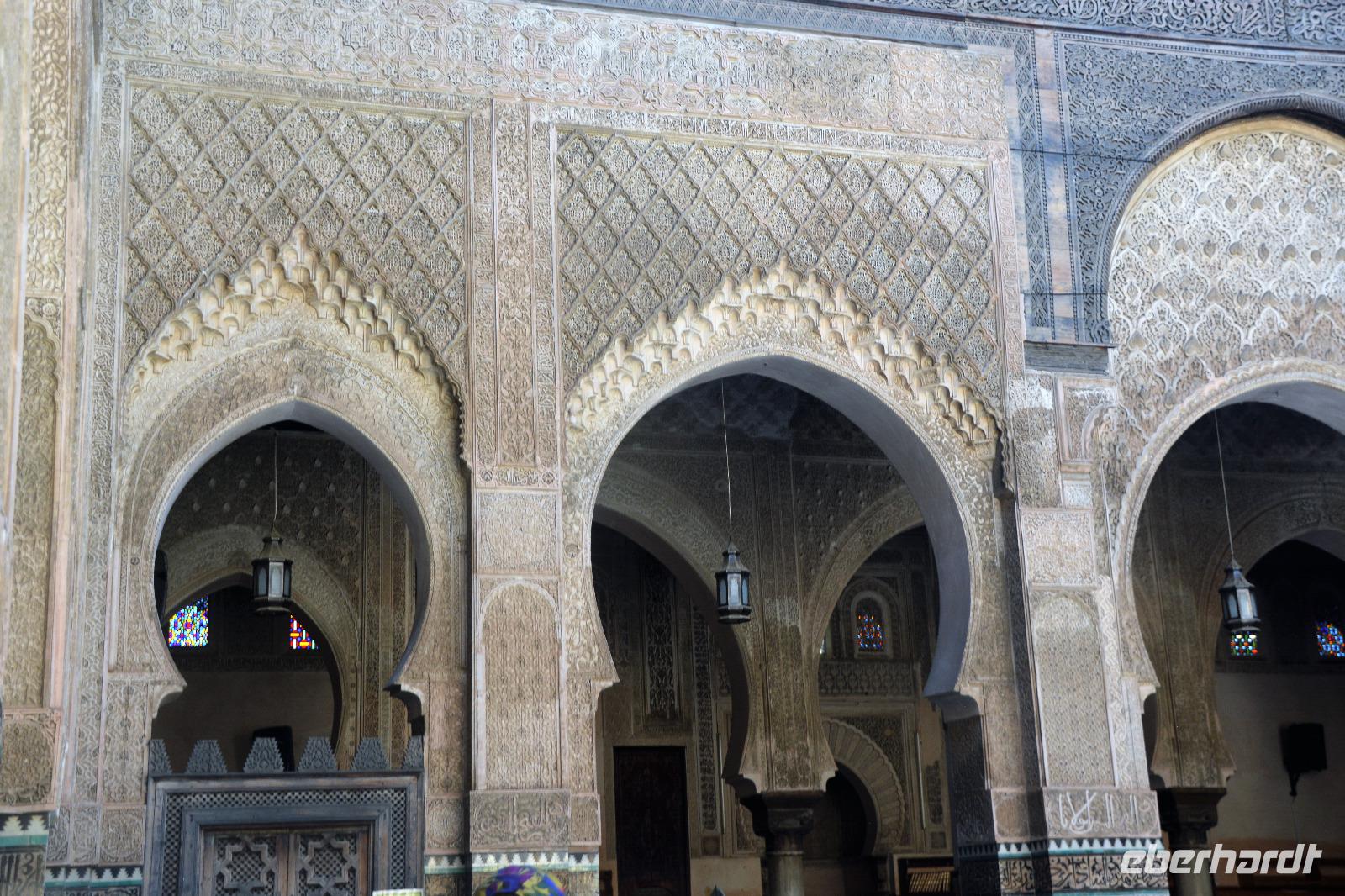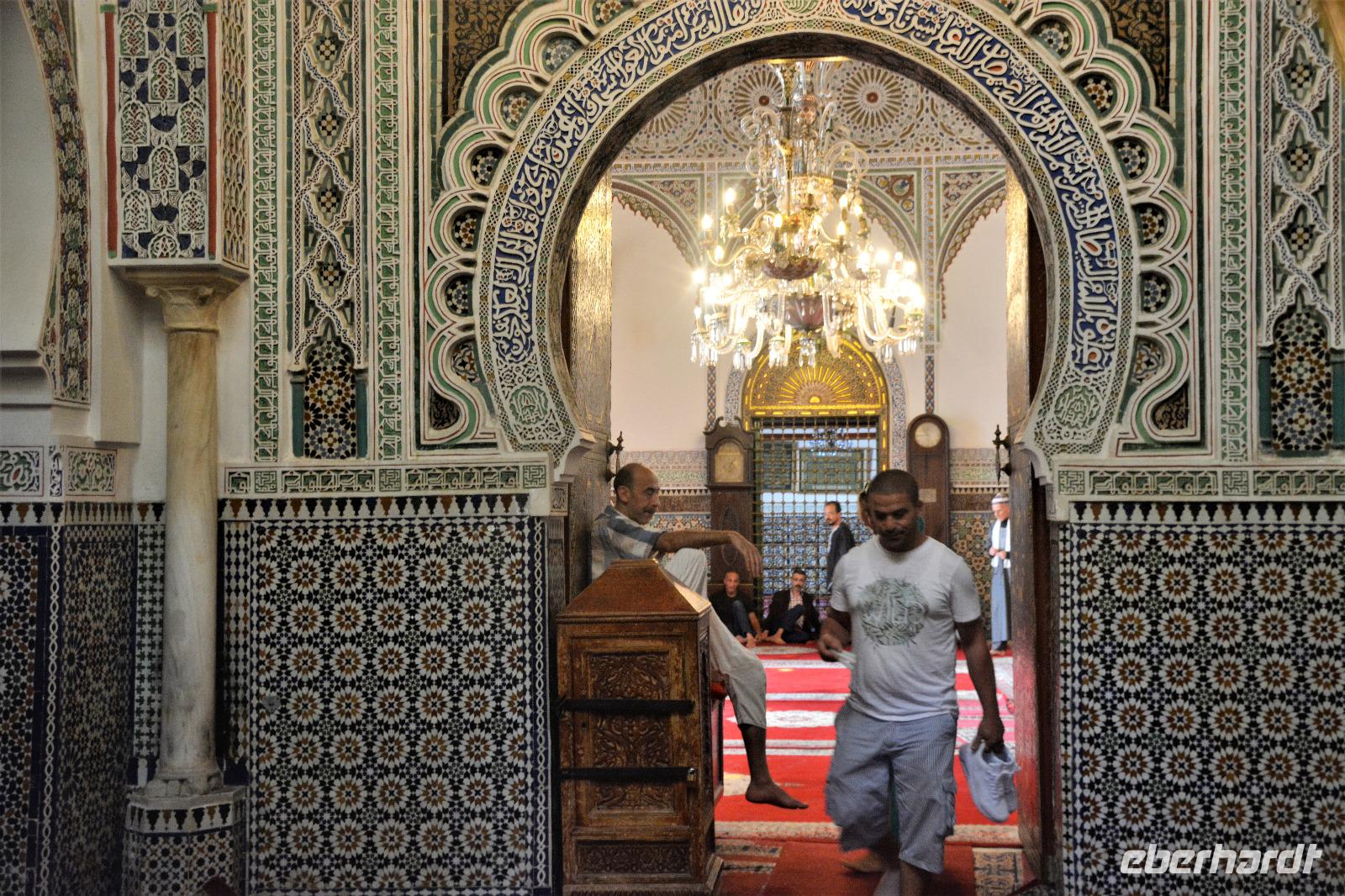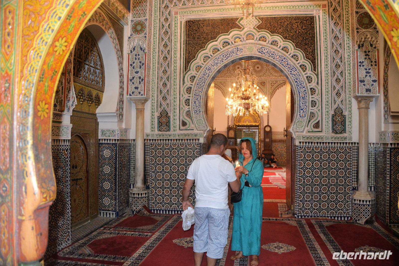 Am "Bab Boujeloud", eines der Eingangstore zur Medina, verlassen wir unseren Bus. Ab hier geht es zu Fuß weiter. Wir gehen leicht bergab und gelangen zuerst zu einer der berühmtesten Koranschulen von Fes, der "Medersa Bou Inania". Schön sind die Holzdecken, die zellige-Wände und die Stuckarbeiten. Diese 3 Dinge sind die wichtigsten Gestaltungselemente der marokkanischen Baukunst. Hier in dieser Koranschule kamen in früheren Zeiten Studenten, um den Koran zu studieren und haben hier gleichzeitig gewohnt. Im heiligen Bezirk können wir einen Blick in den Hof des Grabes von "Idris II". und der "Qarawiyine Moschee", der wichtigsten Moschee von Fes werfen. Am Eingang werden Kerzen und andere Devotionalien verkauft.