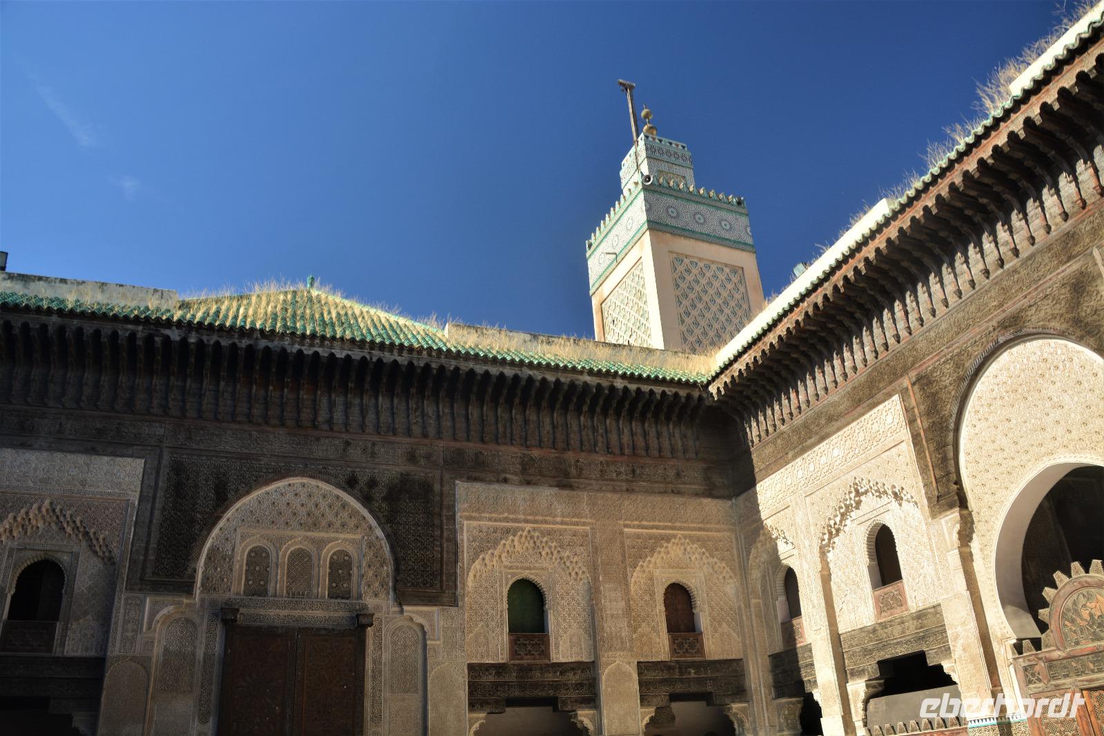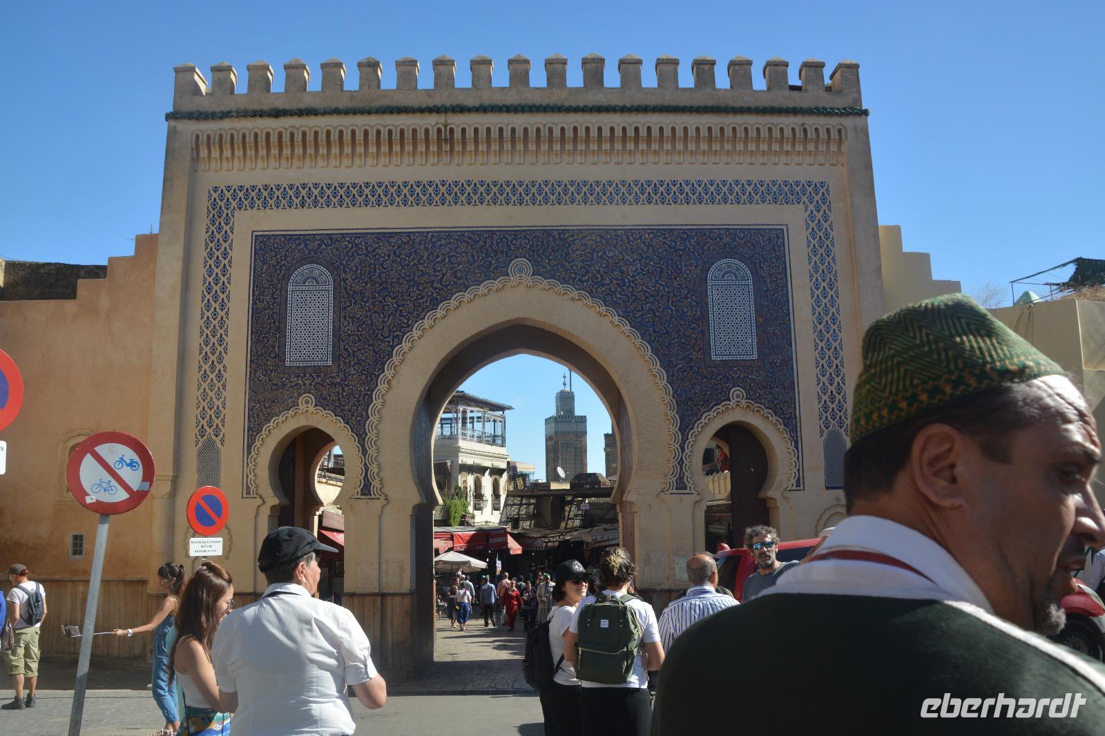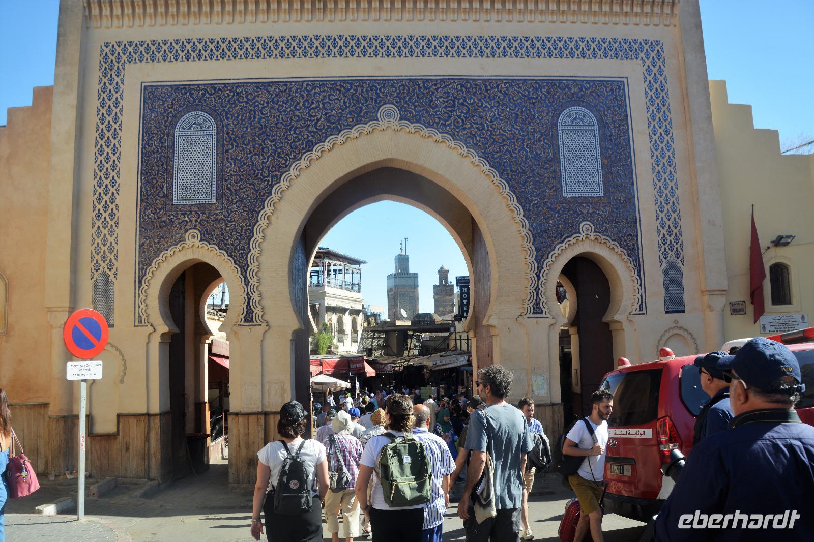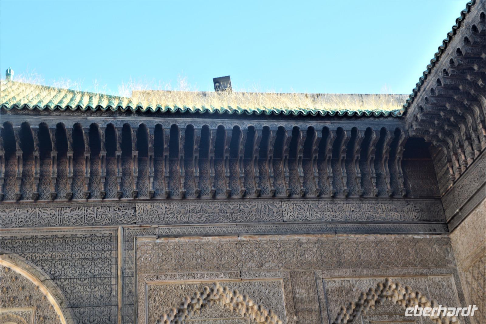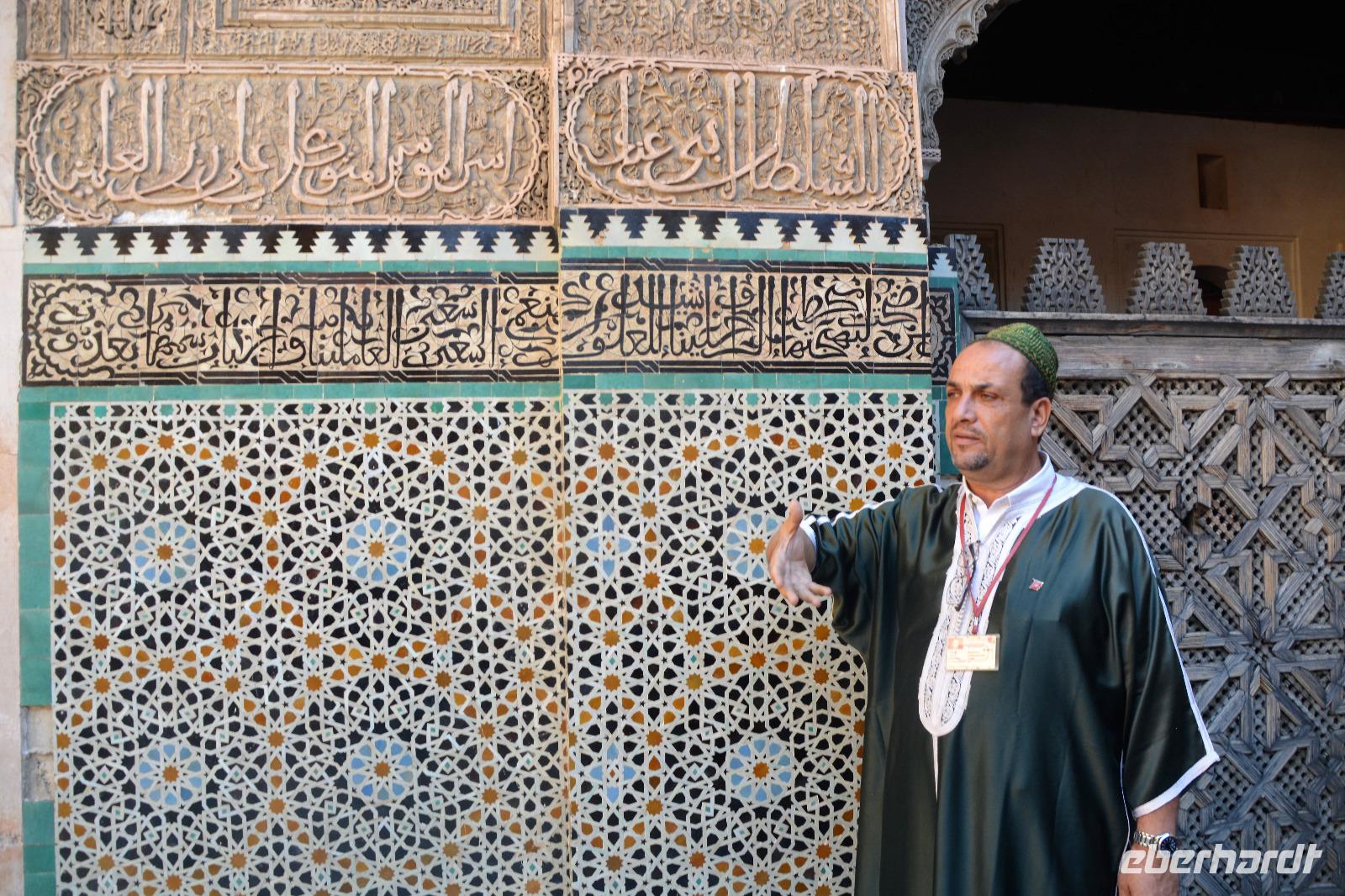 Am "Bab Boujeloud", eines der Eingangstore zur Medina, verlassen wir unseren Bus. Ab hier geht es zu Fuß weiter. Wir gehen leicht bergab und gelangen zuerst zu einer der berühmtesten Koranschulen von Fes, der "Medersa Bou Inania". Schön sind die Holzdecken, die zellige-Wände und die Stuckarbeiten. Diese 3 Dinge sind die wichtigsten Gestaltungselemente der marokkanischen Baukunst. Hier in dieser Koranschule kamen in früheren Zeiten Studenten, um den Koran zu studieren und haben hier gleichzeitig gewohnt. Im heiligen Bezirk können wir einen Blick in den Hof des Grabes von "Idris II". und der "Qarawiyine Moschee", der wichtigsten Moschee von Fes werfen. Am Eingang werden Kerzen und andere Devotionalien verkauft.