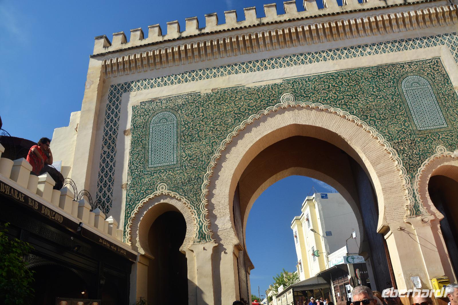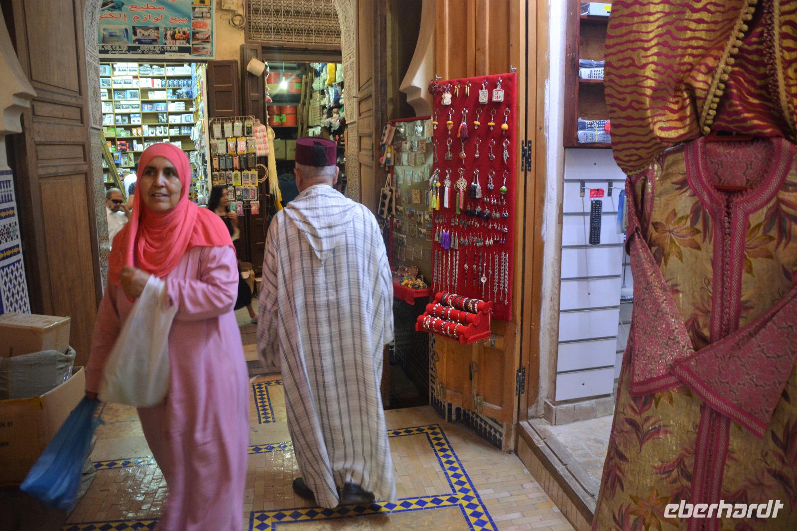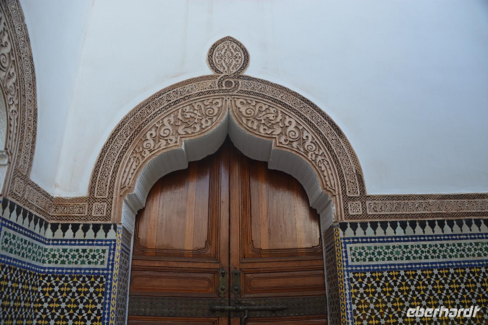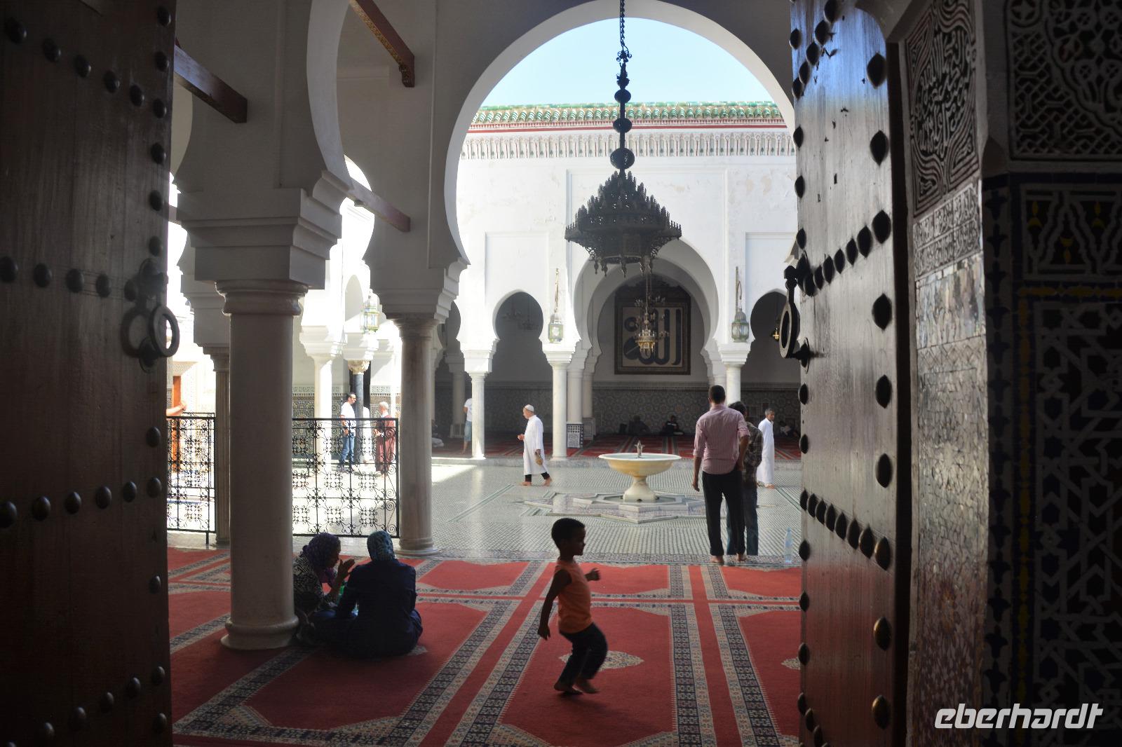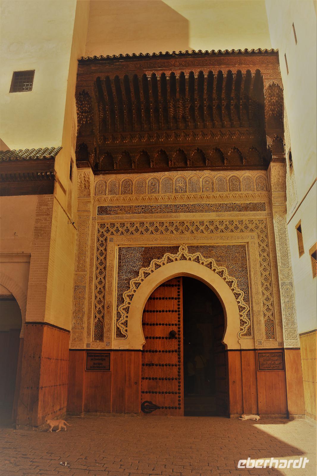 Am "Bab Boujeloud", eines der Eingangstore zur Medina, verlassen wir unseren Bus. Ab hier geht es zu Fuß weiter. Wir gehen leicht bergab und gelangen zuerst zu einer der berühmtesten Koranschulen von Fes, der "Medersa Bou Inania". Schön sind die Holzdecken, die zellige-Wände und die Stuckarbeiten. Diese 3 Dinge sind die wichtigsten Gestaltungselemente der marokkanischen Baukunst. Hier in dieser Koranschule kamen in früheren Zeiten Studenten, um den Koran zu studieren und haben hier gleichzeitig gewohnt. Im heiligen Bezirk können wir einen Blick in den Hof des Grabes von "Idris II". und der "Qarawiyine Moschee", der wichtigsten Moschee von Fes werfen. Am Eingang werden Kerzen und andere Devotionalien verkauft.