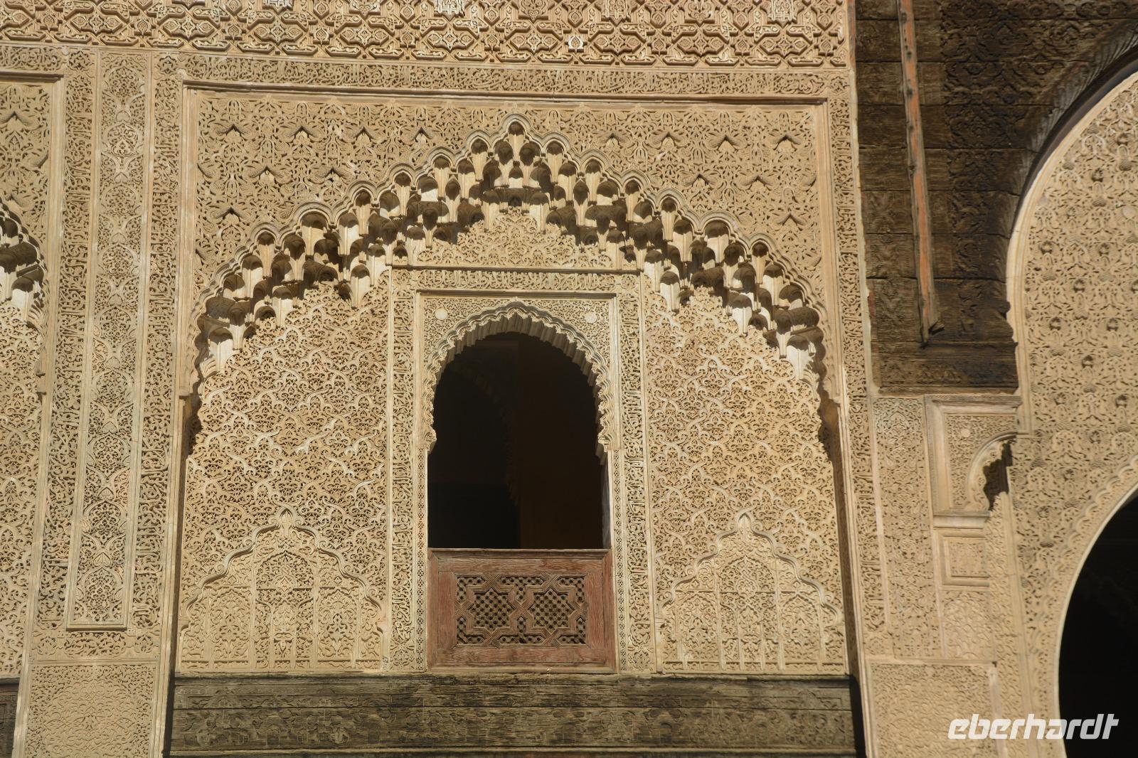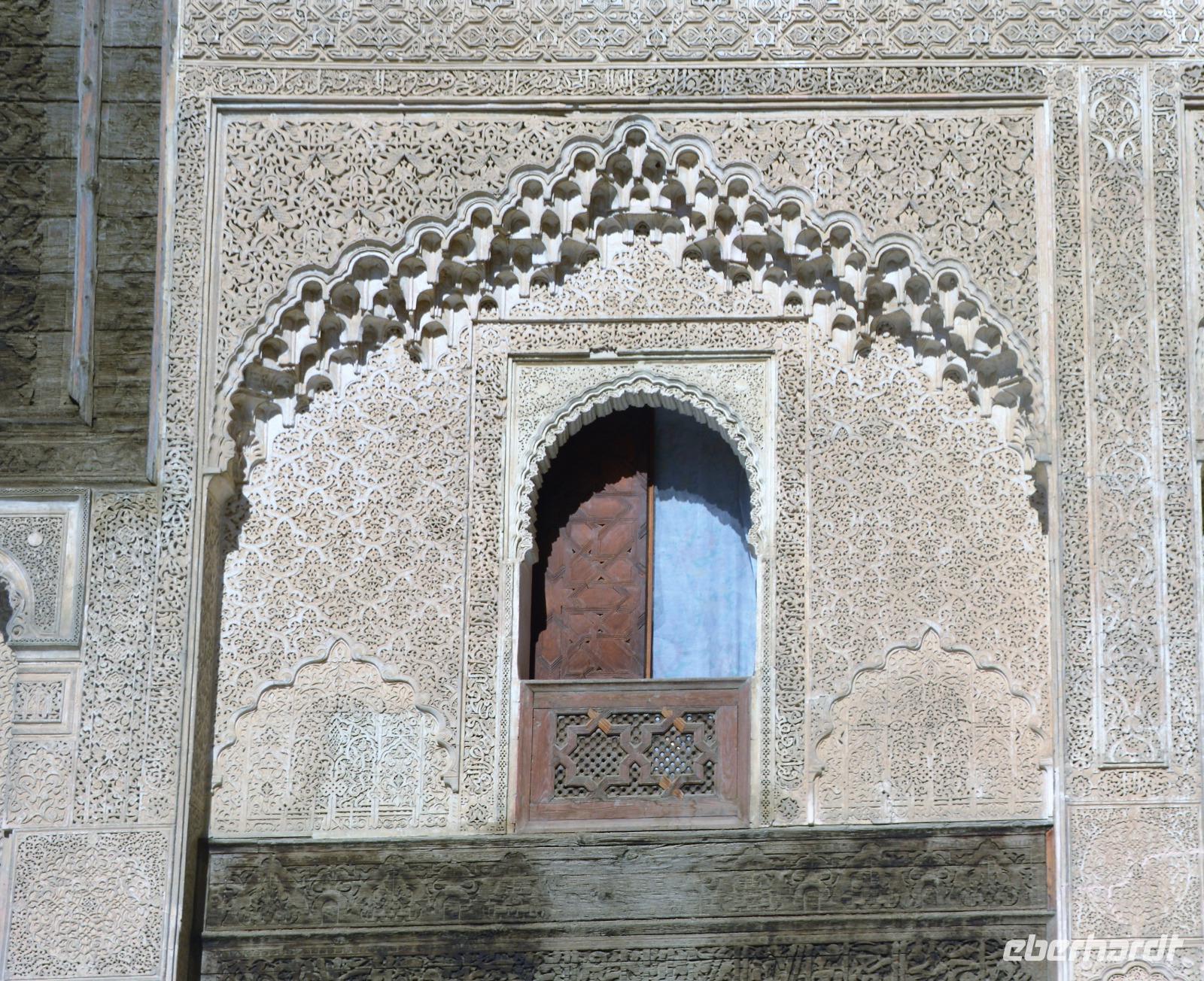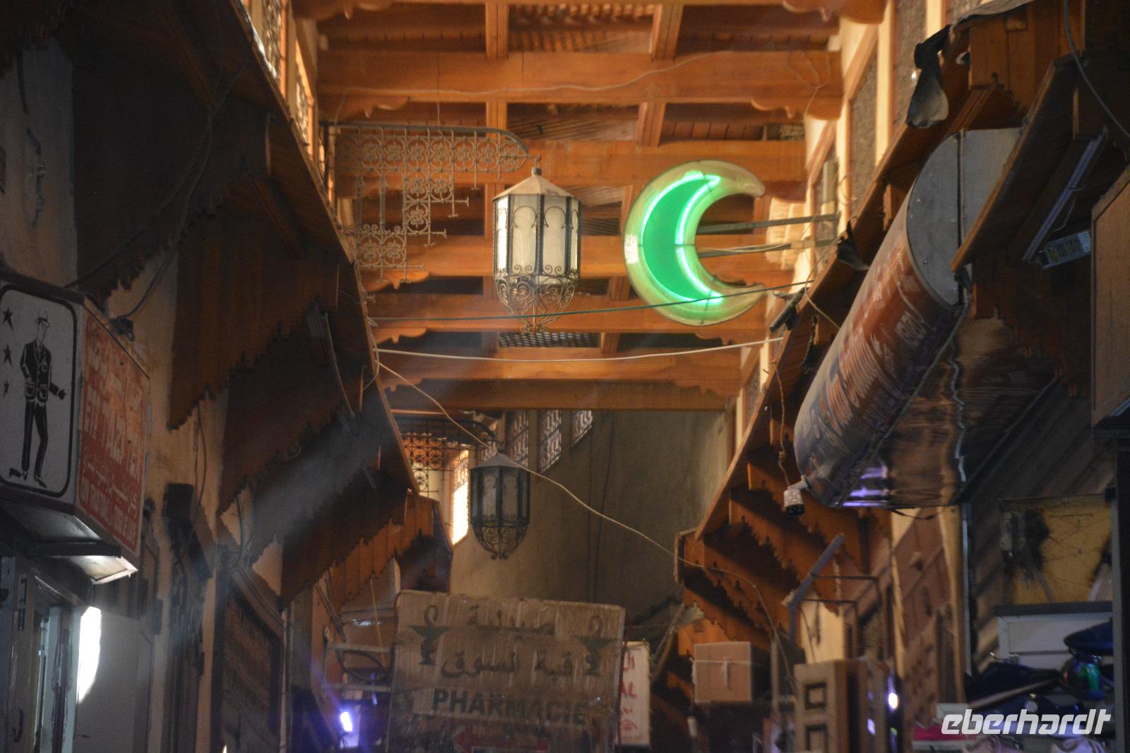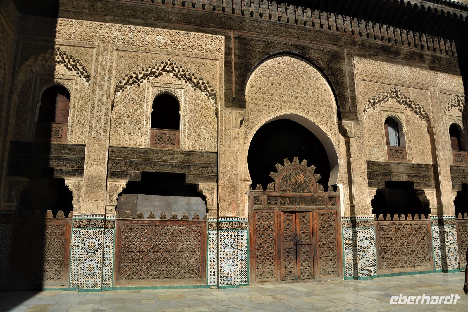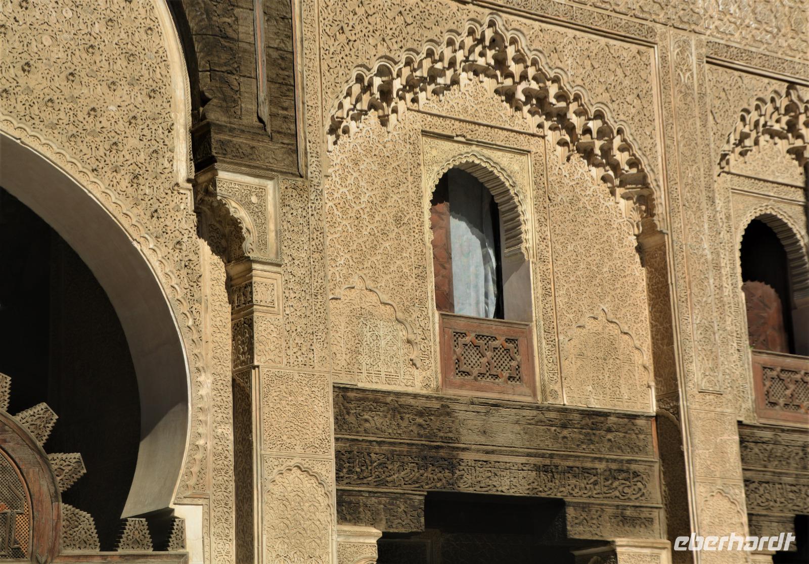 Am "Bab Boujeloud", eines der Eingangstore zur Medina, verlassen wir unseren Bus. Ab hier geht es zu Fuß weiter. Wir gehen leicht bergab und gelangen zuerst zu einer der berühmtesten Koranschulen von Fes, der "Medersa Bou Inania". Schön sind die Holzdecken, die zellige-Wände und die Stuckarbeiten. Diese 3 Dinge sind die wichtigsten Gestaltungselemente der marokkanischen Baukunst. Hier in dieser Koranschule kamen in früheren Zeiten Studenten, um den Koran zu studieren und haben hier gleichzeitig gewohnt. Im heiligen Bezirk können wir einen Blick in den Hof des Grabes von "Idris II". und der "Qarawiyine Moschee", der wichtigsten Moschee von Fes werfen. Am Eingang werden Kerzen und andere Devotionalien verkauft.