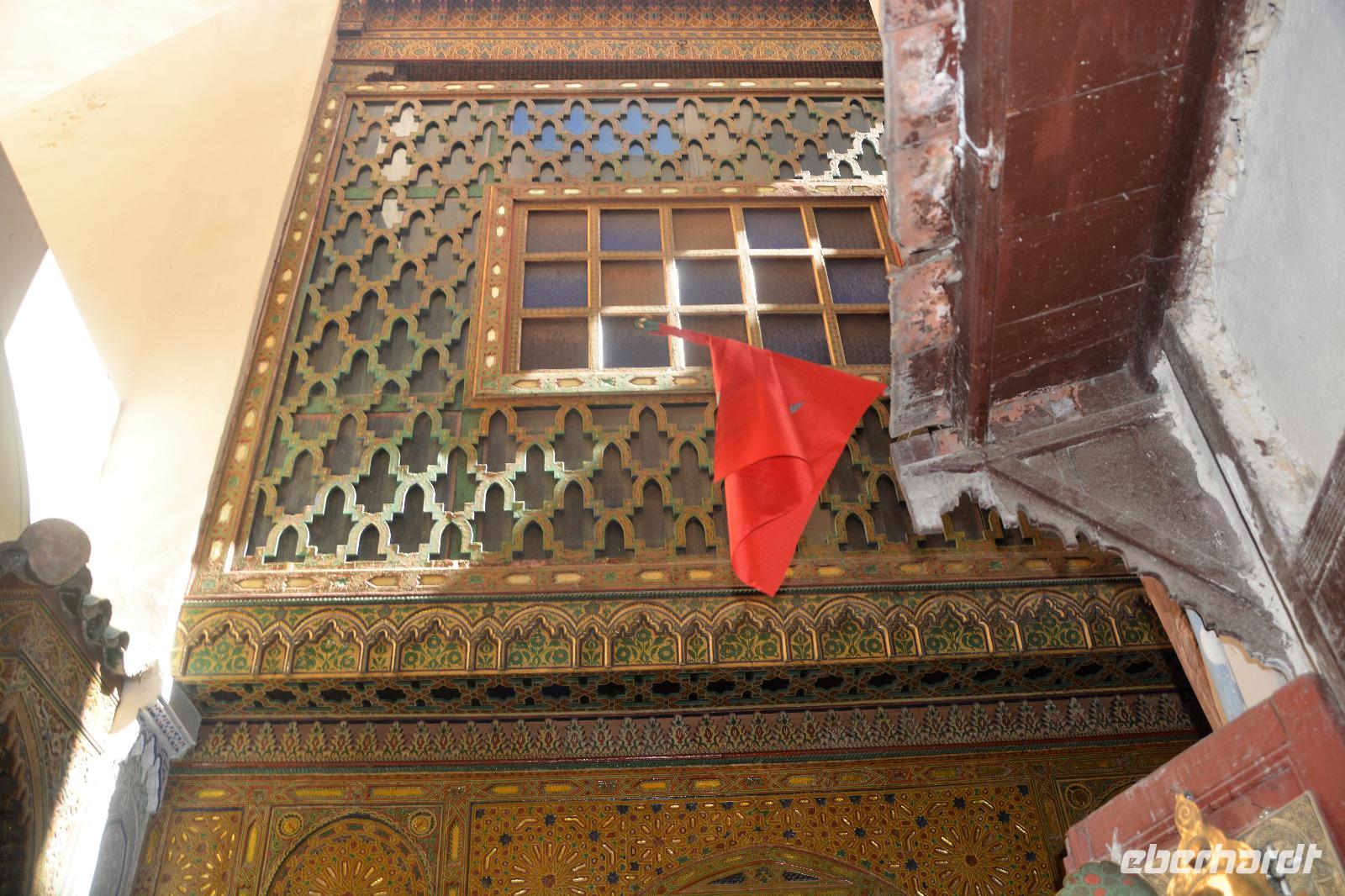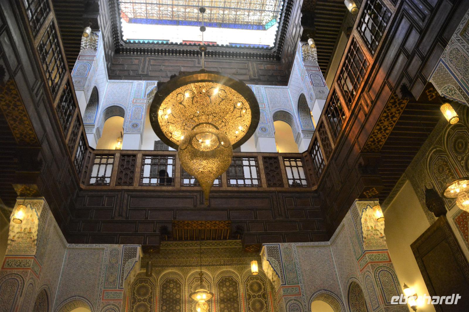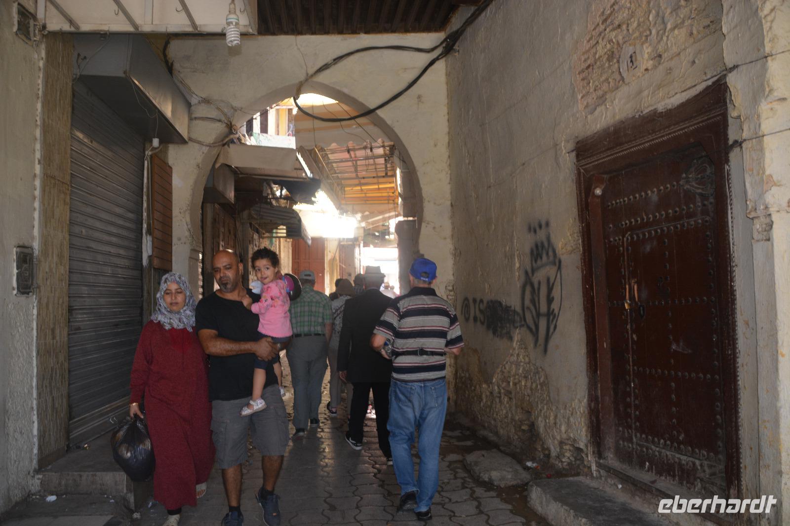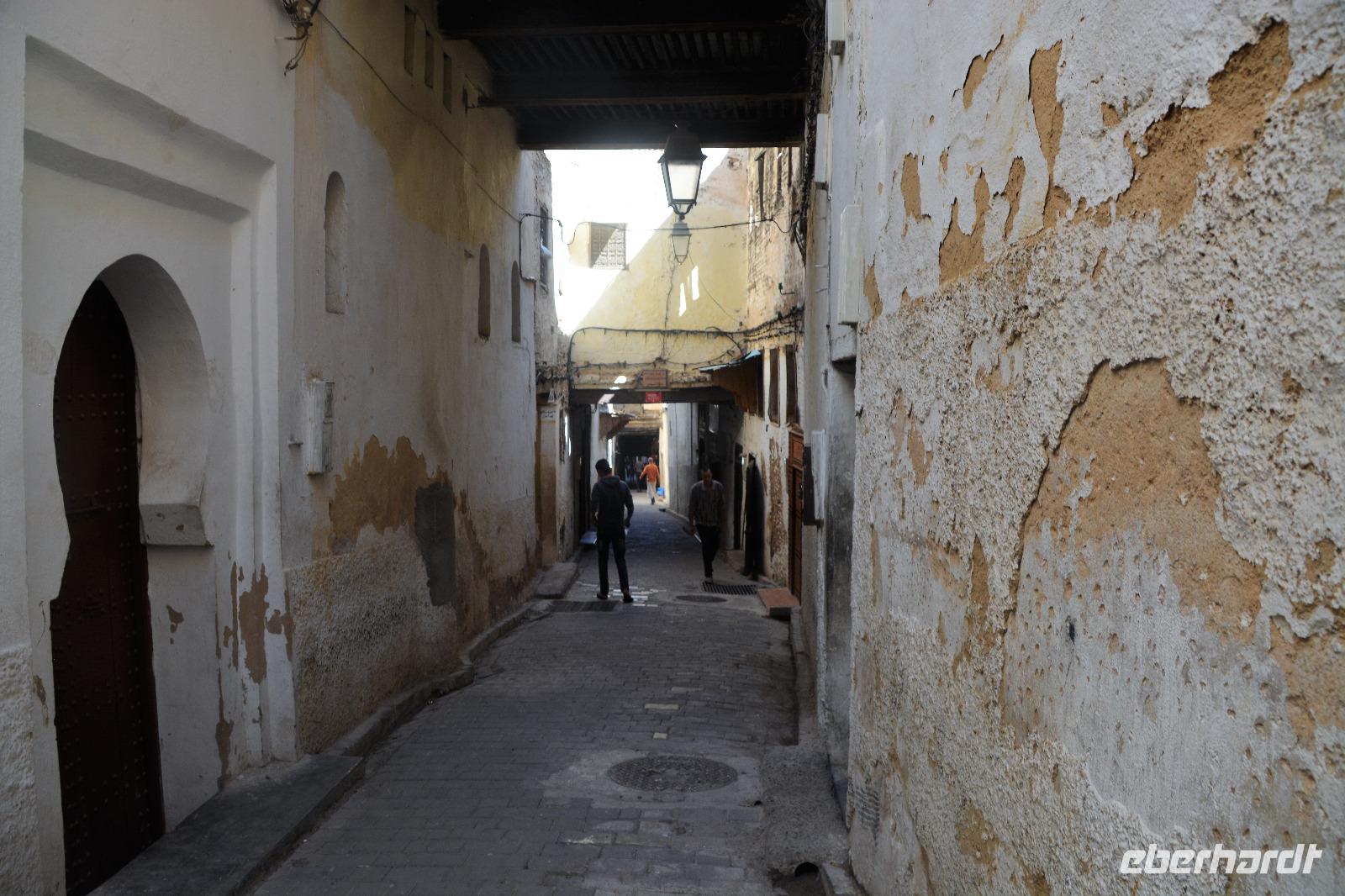 Am "Bab Boujeloud", eines der Eingangstore zur Medina, verlassen wir unseren Bus. Ab hier geht es zu Fuß weiter. Wir gehen leicht bergab und gelangen zuerst zu einer der berühmtesten Koranschulen von Fes, der "Medersa Bou Inania". Schön sind die Holzdecken, die zellige-Wände und die Stuckarbeiten. Diese 3 Dinge sind die wichtigsten Gestaltungselemente der marokkanischen Baukunst. Hier in dieser Koranschule kamen in früheren Zeiten Studenten, um den Koran zu studieren und haben hier gleichzeitig gewohnt. Im heiligen Bezirk können wir einen Blick in den Hof des Grabes von "Idris II". und der "Qarawiyine Moschee", der wichtigsten Moschee von Fes werfen. Am Eingang werden Kerzen und andere Devotionalien verkauft.